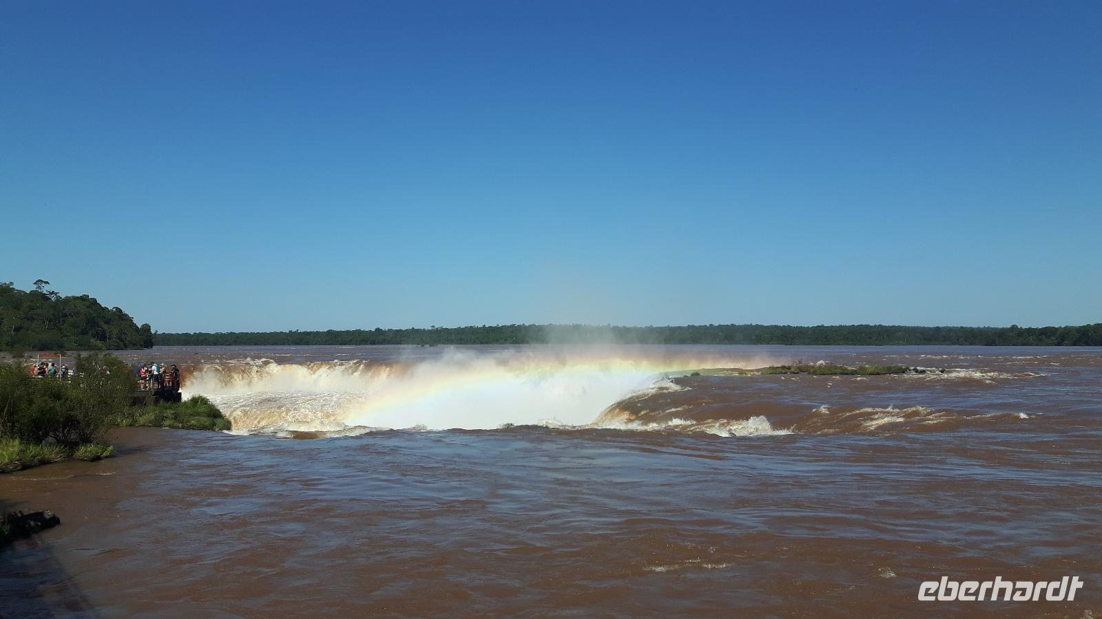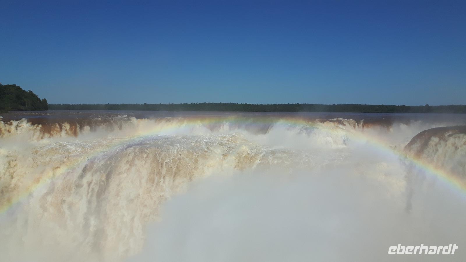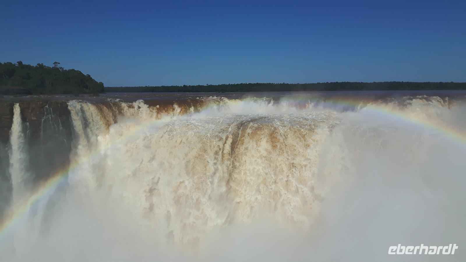 Das nächste Abenteuer ließ nicht lange auf sich warten...! Aber der Reihe nach... Am Vormittag fuhren wir erst einmal zum Regionalflughafen von Buenos Aires - viele Straßen der Stadt waren allerdings derart verstopft mit Fahrzeugen, dass ich sogar für einen Moment dachte, wir würden unseren Flieger nach Iguazú niemals erreichen! Die Aufregung war glücklicherweise umsonst, denn alles verlief dennoch reibungslos... Unser erster inner-argentinischer Flug stand an - weitere fünf Flüge innerhalb des Landes sollten die nächsten Tage folgen! Ich hatte im vorab so einiges gehört - Verspätungen, Streiks usw. und somit war auch ich etwas aufgeregt, aber es fügte sich alles zusammen und die Fluggesellschaft Aerolineas Argentinas wird mir im Nachhinein in sehr angenehmer Erinnerung bleiben! Mit leichter Verspätung kamen wir in Iguazú an und in der Empfangshalle des wahrhaft sehr übersichtlichen Flughafens (mit nur 2 Gates!) entdeckten wir sofort unsere temperamentvolle örtliche Reiseleiterin Sara. Im Bus lagen dann Lunch-Pakete inkl. Wasser bereit, so dass wir keine Zeit verloren und uns sofort zum Iguazú-Nationalpark auf argentinischer Seite aufmachen konnten. Am Eingang des Parks angekommen, unternahmen wir eine kurze Fahrt mit einer Schmalspurbahn, um schließlich weiter entlang von bequemen vergitterten Laufstegen die verschieden Perspektiven dieses großartigen Wasserfalls zu erleben!