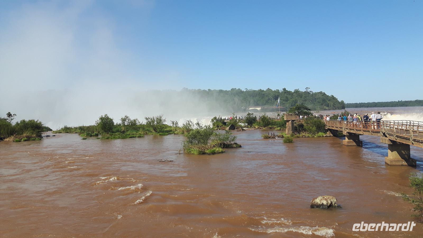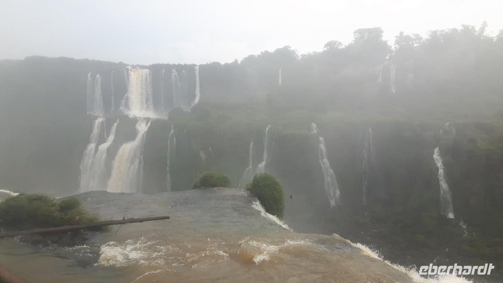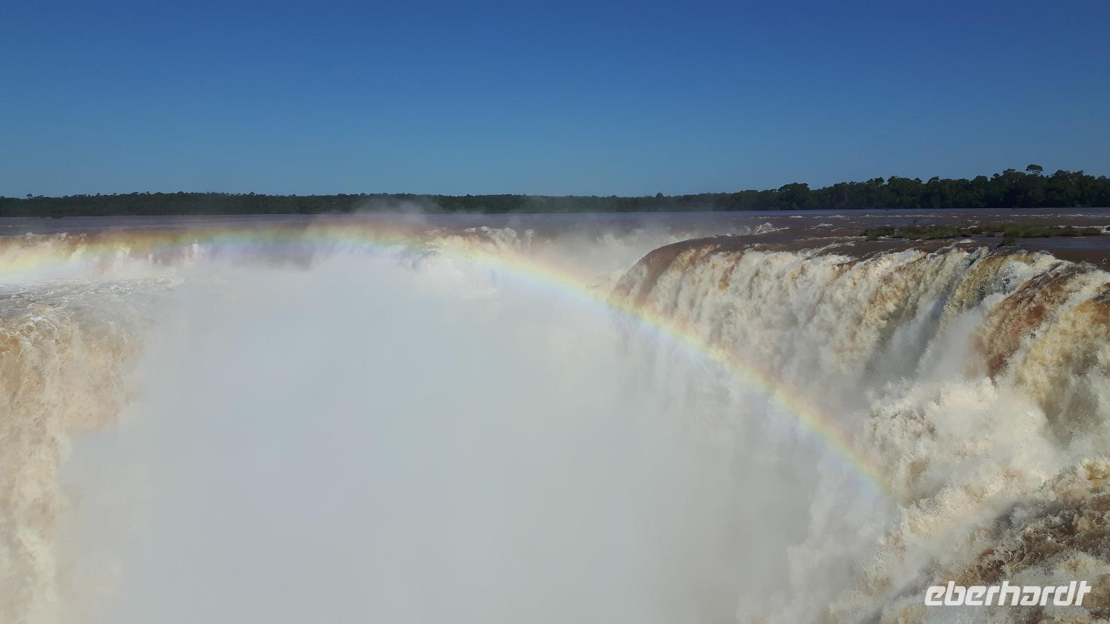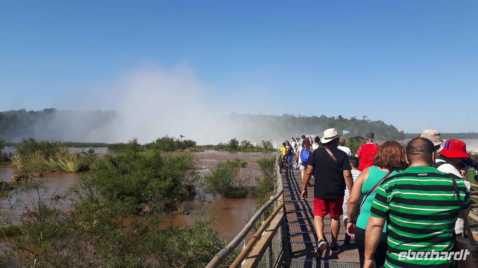 Das nächste Abenteuer ließ nicht lange auf sich warten...! Aber der Reihe nach... Am Vormittag fuhren wir erst einmal zum Regionalflughafen von Buenos Aires - viele Straßen der Stadt waren allerdings derart verstopft mit Fahrzeugen, dass ich sogar für einen Moment dachte, wir würden unseren Flieger nach Iguazú niemals erreichen! Die Aufregung war glücklicherweise umsonst, denn alles verlief dennoch reibungslos... Unser erster inner-argentinischer Flug stand an - weitere fünf Flüge innerhalb des Landes sollten die nächsten Tage folgen! Ich hatte im vorab so einiges gehört - Verspätungen, Streiks usw. und somit war auch ich etwas aufgeregt, aber es fügte sich alles zusammen und die Fluggesellschaft Aerolineas Argentinas wird mir im Nachhinein in sehr angenehmer Erinnerung bleiben! Mit leichter Verspätung kamen wir in Iguazú an und in der Empfangshalle des wahrhaft sehr übersichtlichen Flughafens (mit nur 2 Gates!) entdeckten wir sofort unsere temperamentvolle örtliche Reiseleiterin Sara. Im Bus lagen dann Lunch-Pakete inkl. Wasser bereit, so dass wir keine Zeit verloren und uns sofort zum Iguazú-Nationalpark auf argentinischer Seite aufmachen konnten. Am Eingang des Parks angekommen, unternahmen wir eine kurze Fahrt mit einer Schmalspurbahn, um schließlich weiter entlang von bequemen vergitterten Laufstegen die verschieden Perspektiven dieses großartigen Wasserfalls zu erleben!