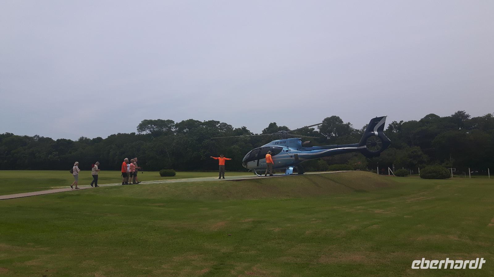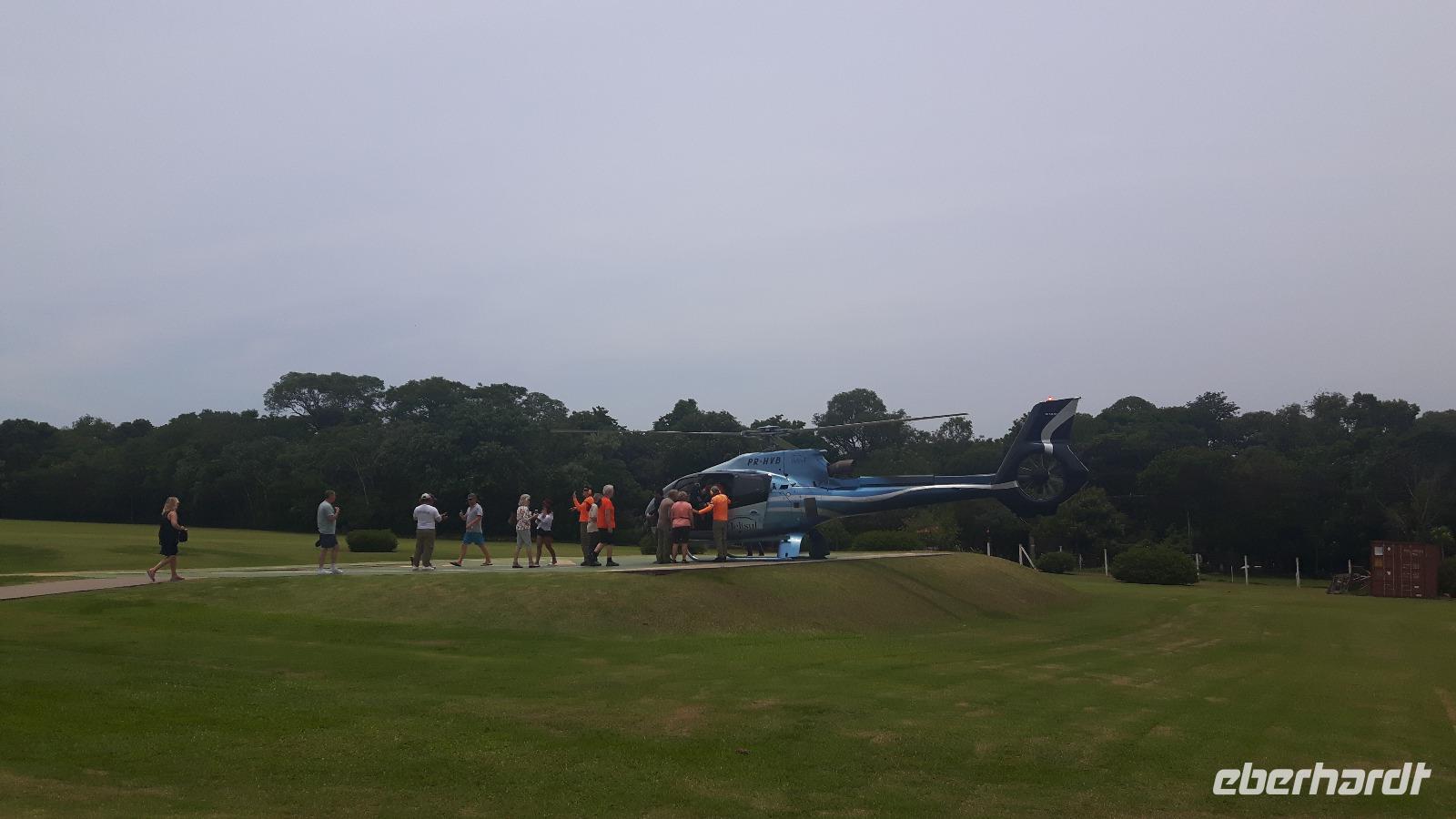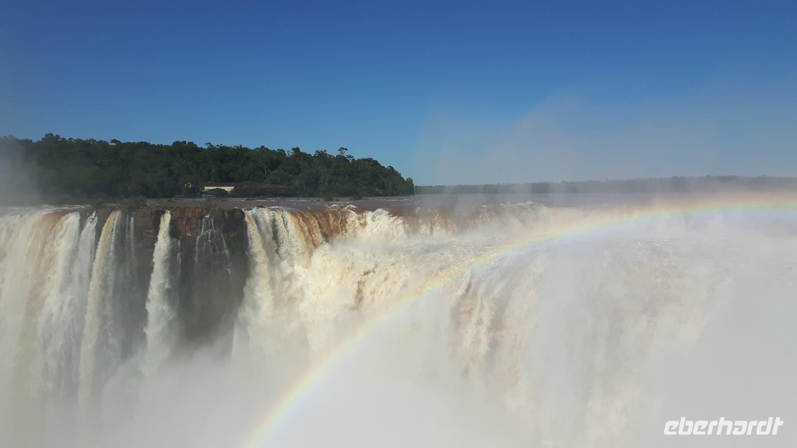Nach einem guten Frühstück im Hotel wurden wir am Morgen von Sara abgeholt und zunächst fuhren wir zum Itaipú-Kraftwerk. Das weltweit größte Wasserkraftwerk ist übrigens ein Gemeinschaftsprojekt zwischen Brasilien und Paraguay und liegt direkt an deren Grenze. Der Fluss Paraná wird hier zwecks Energiegewinnung durch einen gigantischen Staudamm aufgestaut. Wir unternahmen eine Rundfahrt mit einem kraftwerkseigenen Sightseeing Doppeldecker-Bus, der diverse Stopps an verschiedenen interessanten Punkten einlegte und wo wir die Möglichkeiten zum Fotografieren nutzen konnten. Besonders erlebnisreich war die Fahrt über die kilometerlange Staumauer - einfach beeindruckend! Die zweite Tageshälfte stand ganz im Zeichen des brasilianischen Teils des Nationalparks der Iguazú-Wasserfälle. Bevor wir jedoch dieses Natur-Spektakel bestaunten, stoppten wir am Helikopter-Flugplatz kurz vor dem Eingang zum Iguazú-Nationalpark, denn ein kleiner Teil unserer Gruppe nahm das Angebot für einen kurzen Helikopter-Flug über die Iguazú-Wasserfälle wahr. Mit dem Bus gelangten wir anschließend bis zum berühmten „Belmond Hotel das Cataratas", von wo aus es einen Weg weiter über zahlreiche Stufen hinunter zu den Iguazú-Wasserfällen ging. Als wir unten ankamen, waren wir sehr nah an den Wasserfällen dran und wer Regenbekleidung dabei hatte, war in jedem Fall auf der sicheren Seite! Es war schlichtweg beeindruckend, zumal das Wetter bis dato mitspielte. Am Nachmittag sollte es nämlich dann anders kommen, denn es regnete sehr heftig - glücklicherweise saßen wir zu dieser Zeit zum Mittagessen im Buffet-Restaurant des Nationalparks. Der Starkregen hielt bis in die Abendstunden an, so dass uns ein Bad im Hotel-Pool leider versagt blieb! Zumindest aber schmeckten die Cocktails an der Hotelbar, denn mindestens einen Caipirinha, den berühmtesten Cocktail Brasiliens, wollten wir probieren. Dass es bei manchen der ein oder andere mehr wurde, ist aufgrund des guten Geschmacks nicht verwunderlich - na dann „Prost"!