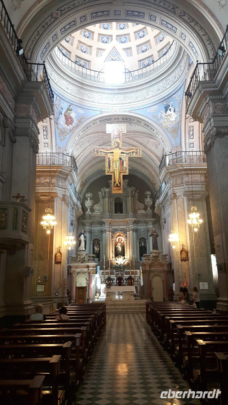 Bereits am Morgen mussten wir uns von Brasilien verabschieden! An der Grenze legten wir noch einen kurzen Fotostopp am sog. „Dreiländer-Eck" (Brasilien/Argentinien/Paraguay) ein, bevor wir am argentinischen Flughafen Iguazú ankamen. Hier verabschiedeten wir uns von der quirligen Reiseleiterin Sara und checkten für unseren Flug nach Salta ein. Auch dieser knapp 2-stündige Flug verlief problemlos und somit erreichten wir gut gelaunt Salta. Am Ausgang wurden wir von der uns bereits von Anfang an sympathischen Reiseleiterin Ingrid freundlich begrüßt und mit dem Bus erreichten wir schließlich das zentral gelegene Hotel „Amerian Salta". Nachdem wir uns etwas frisch gemacht hatten, ging es auf Entdeckungstour durch die im Nordwesten Argentiniens gelegene Stadt, welche sich den kolonialen Charakter seiner Bauten erhalten hat. Erster Anlaufpunkt der Stadt war für uns die Plaza 9 de Julio, wo wir uns zunächst etwas mit dem Archäologischen Museum der Hochanden vertraut machten, welches immerhin durch die Ausstellung dreier Inka-Kindsmumien weithin bekannt ist. Rund um den Hauptplatz konzentrieren sich auch die meisten historischen Bauwerke der Stadt, unter ihnen auch die beeindruckende Kathedrale. Auch der benachbarten Kirche von San Francisco, einer der schönsten Kirchen im Norden Argentiniens, statteten wir einen Besuch ab. Dieser längere Besuch war zwar etwas unfreiwillig, denn leider war unser eigentlicher Bus defekt und somit mussten wir hier etwas Wartezeit in Kauf nehmen, ehe Ersatz vor Ort war. Zu guter Letzt chauffierte man uns mit „Stopp an einer Tankstelle" auf den San Bernardo-Hügel, einem Aussichtspunkt mit Blick über die Stadt. Hier endete unser heutiges Besichtigungsprogramm und wir hatten somit ausreichend Zeit, um uns auf den morgigen Tag vorzubereiten... Bereits heute gab es entsprechende Hinweise, zum Beispiel ausreichend Wasser mitzunehmen (mindestens ca. 1,5 - 2l)!!! Etwas Gebäck ist ebenso hilfreich und es können auch Coca-Blätter organisiert werden, die man sich in den Mund schiebt und die dann zur Vorbeugung der Höhenkrankheit genommen werden!