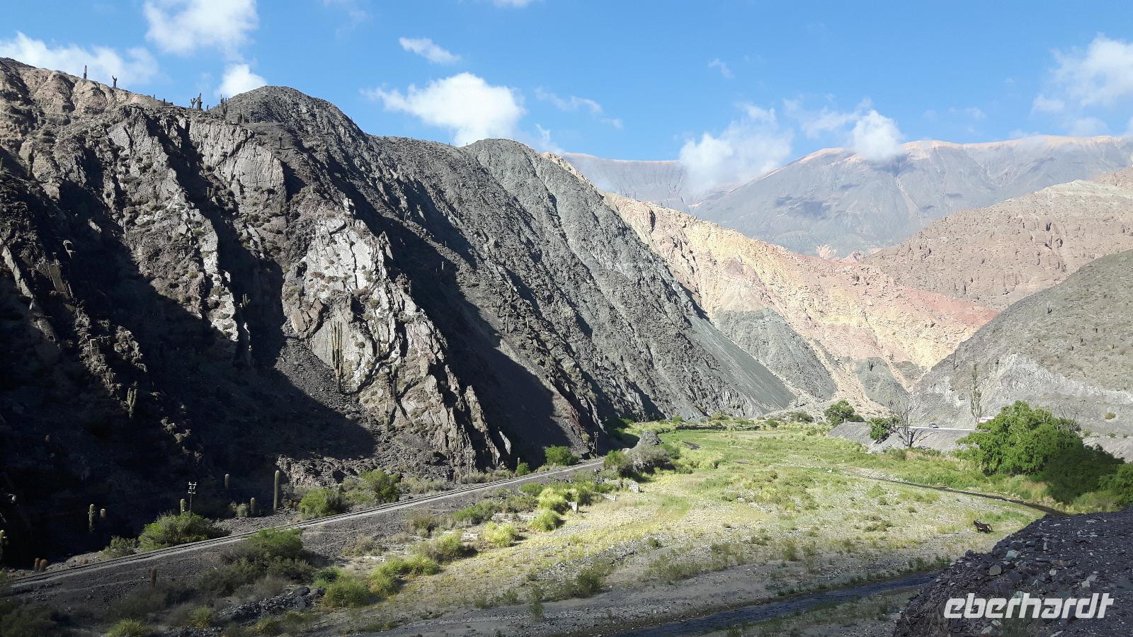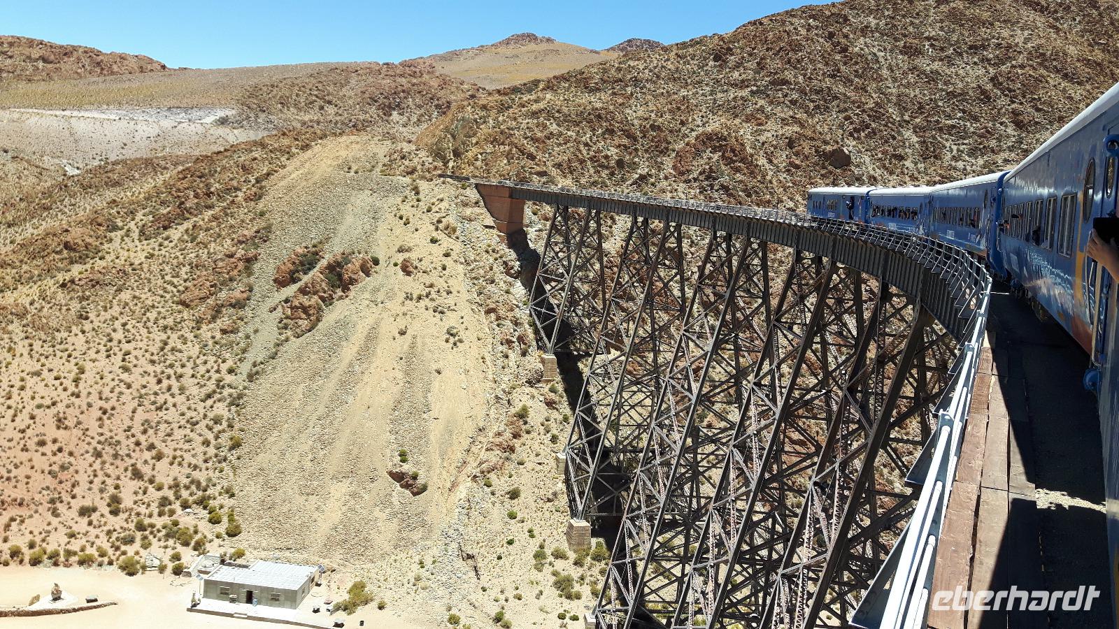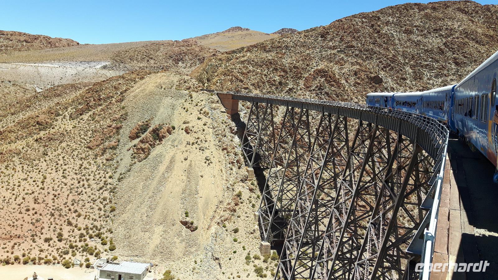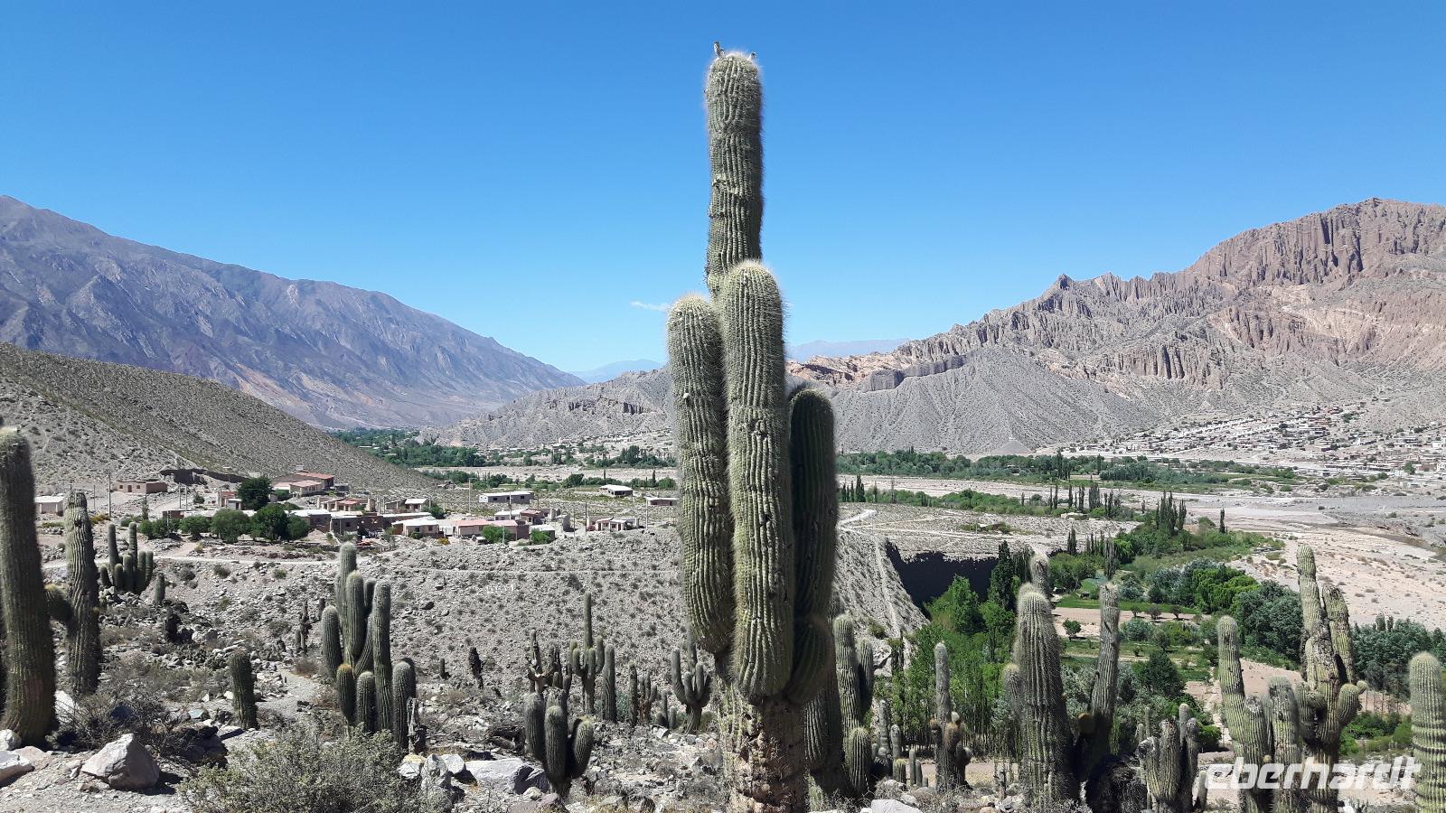 Dem heutigen Tag sahen wir mit großen Erwartungen entgegen - schließlich wollten wir „hoch hinaus" - die berühmte Anden-Gebirgskette erwartete uns! Wir folgten von Salta aus der Strecke des berühmten Zuges zu den Wolken zunächst parallel der Schienen entlang der Straße, da der Zug momentan nur auf einem kleinen Teilstück verkehrt. Trotzdem gewannen wir schnell an Höhe, fuhren vorbei an dichtem Grün und weiter durch atemberaubende Schluchten mit Kakteen. Wir sahen Viadukte und Brücken bzw. stoppten im kleinen Ort Santa Rosa de Tastil. Ingrid zeigte uns auch, wie man Coca-Blätter gegen die Höhenkrankheit verwendet. Gegen Mittag erreichten wir schließlich die ruhige Bergstadt San Antonio de los Cobres, wo sich der Ausgangspunkt für unsere Zugfahrt im „Trén a las nubes" befand. Dies ist eine der letzten Zugfahrten in Argentinien, nachdem das Land einst sehr gut mit Eisenbahnverbindungen versorgt war. Der Startpunkt ist aktuell in San Antonio de los Cobres auf 3.774 m ü.d.M. Von dort aus fährt man dann zum berühmten Polvorilla-Viadukt und wieder zurück. Der „Zug in die Wolken" heißt übrigens so, weil aufgrund der erreichten Höhe oftmals die Wolken unterhalb des Zuges zu sehen sind - wir sahen übrigens heute nicht eine einzige Wolke! Höhepunkt war zweifelsfrei die Überfahrt über das Polvorilla-Viadukt auf 4.220 m ü.d.M. - mit passender musikalischer Umrahmung war das ein „Gänsehaut pur-Gefühl"! Hier oben legten wir auch einen kleinen Aufenthalt ein und begegneten Anden-Bewohnern, die ihre selbst gefertigten Waren zum Verkauf anboten. Besonders emotional war die Begegnung mit kleinen Kindern, die sich über Kleinigkeiten, wie Bleistifte und Papier freuten. In San Antonio de los Cobres zurück, wurden wir von unserer Reiseleiterin Ingrid und dem stets umsichtigen Busfahrer David erwartet und von nun an fuhren wir mit unserem Bus etwa einhundert Kilometer extreme Schotterpiste quer durch die Puna-Hochebene weiter bis zu den berühmten Salzseen „Salinas Grandes", welche in einem Hochtal auf etwa 3.450 m ü.d.M. liegen. Auf einer Fläche von ca. 820 Quadratkilometern erstrecken sich die Salinas Grandes - zum Vergleich: die Fläche von Hamburg beträgt ca. 755 Quadratkilometer. Es handelt sich also um ein extrem großes Gebiet! Die Salzschicht ist etwa 30 cm dick und ohne Sonnenbrille kann man die Augen kaum öffnen, so stark sind die Reflektion und die Helligkeit! Besonders beeindruckend fand ich, dass mitten durch den Salzsee, der ja nichts als steinhartes Salz ist, eine Straße verläuft, auf welcher sogar schwere Lkw´s fahren. Von den Salinas Grandes ging es entlang der Ruta 52, der nördlichsten geteerten Andenpassstraße Südamerikas, über den knapp 4.200 Meter hohen Pass Cuesta de Lipán nach Purmamarca. Die Aussicht war atemberaubend und die Abfahrt trägt zurecht den Namen „Safari in die Wolken", denn die Wolken lagen nun unterhalb der Straße und boten spektakuläre Fotomotive. Die Abfahrt ging hinab ins malerische Dorf Purmamarca, wo wir unser Domizil für die nächsten drei Nächte im Hotel „Terrazas de la Posta Hosteria" bezogen. Purmamarca ist ein kleines, idyllisches Städtchen auf etwa 2.200 Metern Höhe, das seinen Platz zwischen dem Berg der sieben Farben und den angrenzenden Kordilleren gefunden hat. Ein gemeinsames Abendessen rundete diesen langen, aber auch sehr eindrucksvollen Tag ab.