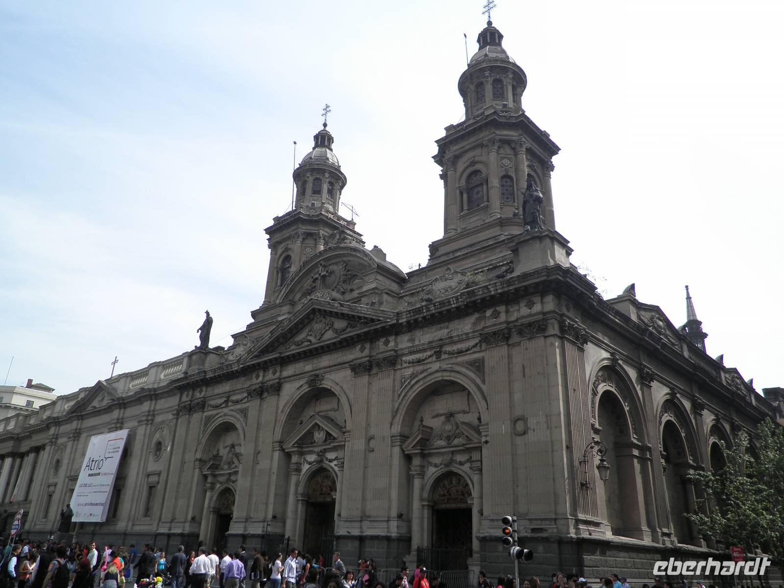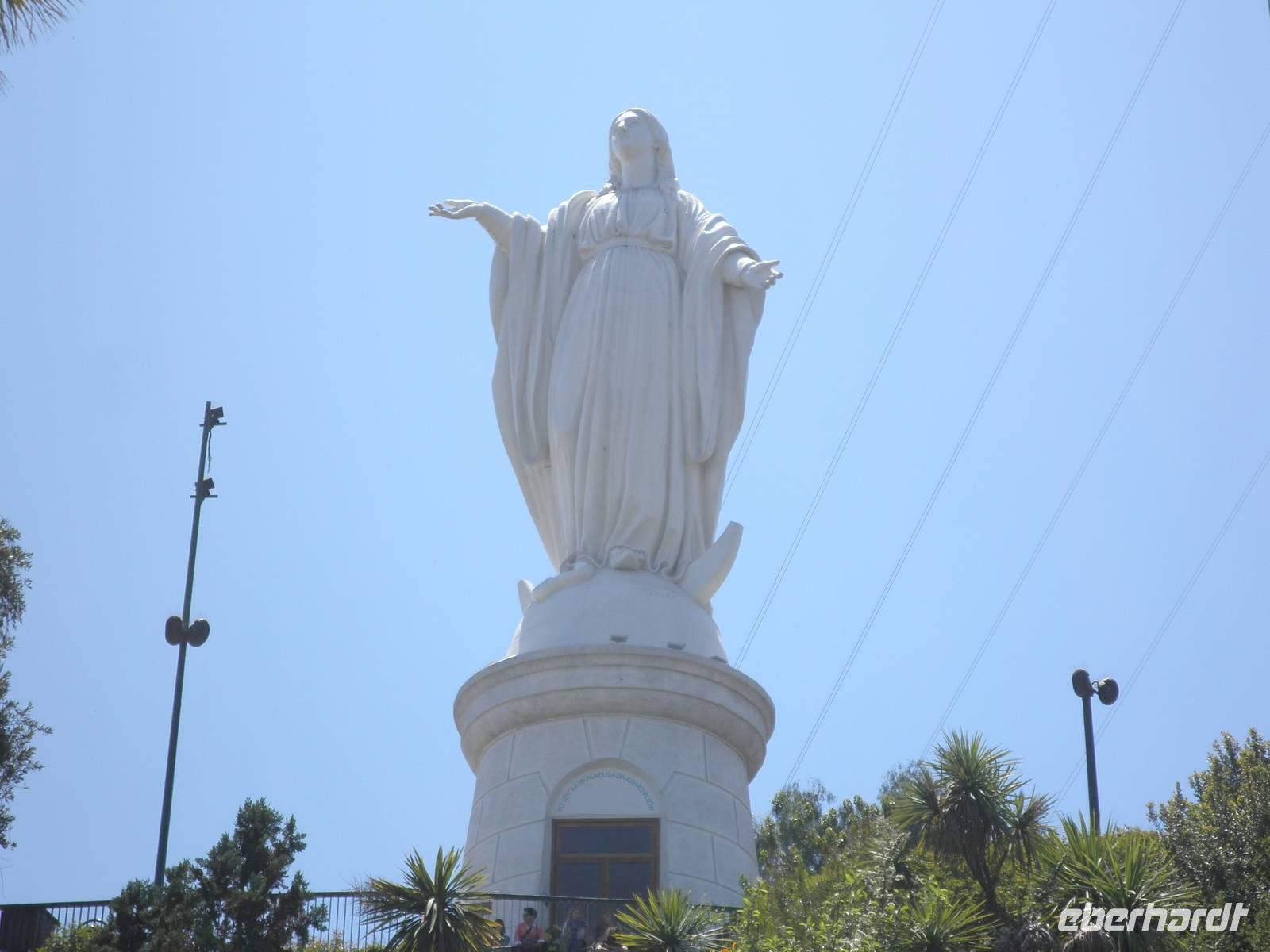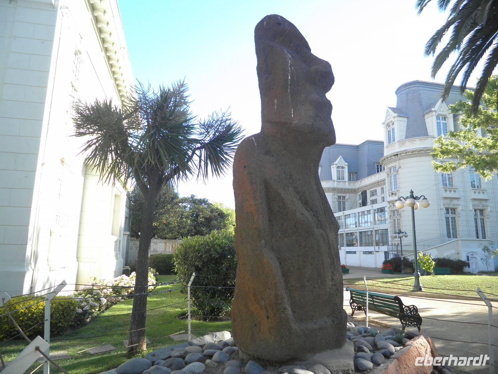 Am Morgen gegen 9:30 Uhr landeten wir auf dem Flughafen von Santiago de Chile. Nach der Passkontrolle und einer weiteren Kontrolle, dass wir keine pflanzlichen oder tierischen Produkte in Chile einführen, trafen wir am Ausgang unsere Reiseleiterin Solange, die uns mit einem „Eberhardt"-Schild schon erwartete. Sie begleitete uns zum Bus, mit dem wir zunächst zu unserem Hotel im Stadtzentrum „Las Galerias" fuhren. Empfangen wurden wir von zwei Nachbildungen der Moai-Statuen, die auf der Osterinsel stehen, und die rechts und links an der Eingangstür des Hotels Wache hielten. Im Hotel hatten wir Gelegenheit, uns ein wenig frisch zu machen und unser Gepäck zu hinterlassen, bis wir einchecken konnten. Danach begaben wir uns zusammen mit unserer Reiseleiterin Solange auf eine Entdeckungstour durch Santiago. Wir sahen die Plaza Italia, spazierten am Haus von Pablo Neruda vorbei und durchs Künstlerviertel, dass eine ganze Reihe uriger Kneipen und Galerien beherbergt. Einige erstanden ein wichtiges Reiseutensil: einen Sonnenhut an einem der zahlreichen Stände und Kioske in der Stadt. Danach ging es hinauf auf einen Berg innerhalb der Stadt: Cerro San Cristobal, aber nicht zu Fuß oder mit dem Bus, nein, wir nahmen ganz traditionell ein Funicular, das ist eine Standseilbahn, die uns bequem und recht schnell die sehr große Steigung hinauf auf den Berg brachte. Oben angelangt, bestaunten wir eine herrlich angelegte Grünanlage mit Palmen und anderen Pflanzen, über denen die weiße Statue der Jungfrau Maria thront. Wir nutzten die Zeit zu einem kleinen Spaziergang auf dem Hügel, fotografierten und freuten uns an dem herrlichen Wetter, das uns mit Sonnenschein und angenehmer Wärme erfreute. Auf dem Weg hinunter in die Stadt hielt unser Bus noch einmal an einem Aussichtspunkt und wir überblickten das neue und moderne Santiago: Sanhatten, ein Bereich der Stadt mit vielen Hochhäusern. Zurück in der Stadt brachte uns der Bus schließlich zum Mercado Central, die Markthalle im Zentrum, dort wurden wir schon erwartet in einem Restaurant, das uns allerlei verschiedene Sorten fangfrischen Fisch servierte. Wir genossen diese Mahlzeit, ein älterer Chilene erfreute uns mit traditionellen Liedern, begleitet mit seiner Gitarre. Wir probierten unseren ersten Pisco Sour, das ist ein traditioneller Cocktail in Chile, der zur Begrüßung von Gästen angeboten wird. Nach dem Essen machten wir noch einen kleinen Spaziergang durch die Stadt, besuchten die alte Börse, sahen den Hauptplatz Plaza de Armas, standen vor der Moneda und dem Denkmal für Salvador Alliende direkt davor. Nach einer letzten kurzen Besichtigung der Kirche des heiligen Franziskus erreichten wir erschöpft unser Hotel. Wir nahmen unser Gepäck und begaben uns auf unsere Zimmer. Danach trafen wir uns schon bald wieder in der Bar des Hotels, dort erhielten wir einen Begrüßungscocktail, wieder einen Pisco Sour, dieses Mal war er schon ein bisschen stärker. So endete ein anstrengender Tag. Wir schliefen sicher alle recht gut während unserer ersten Nacht in Chile nach der langen Anreise.