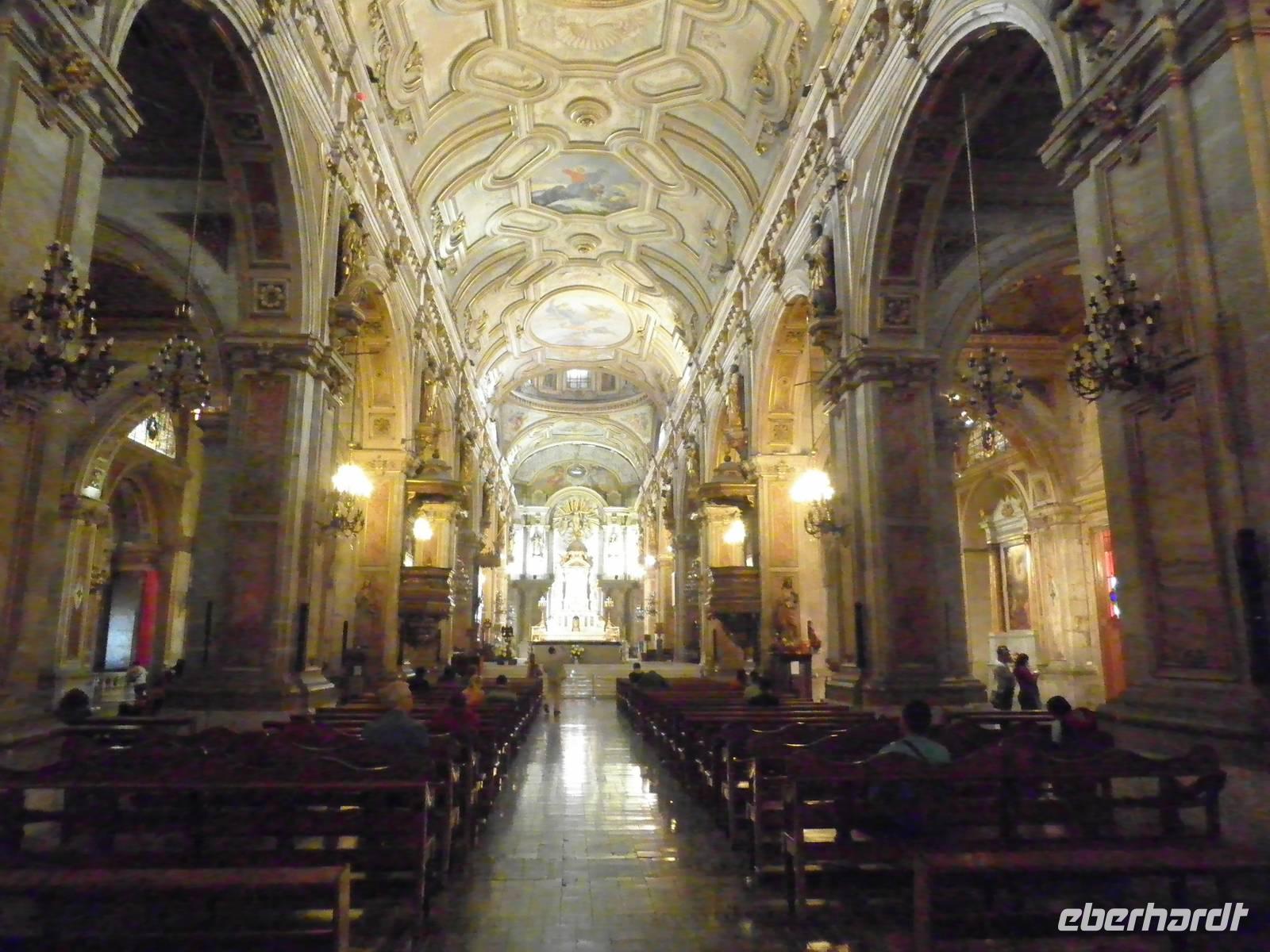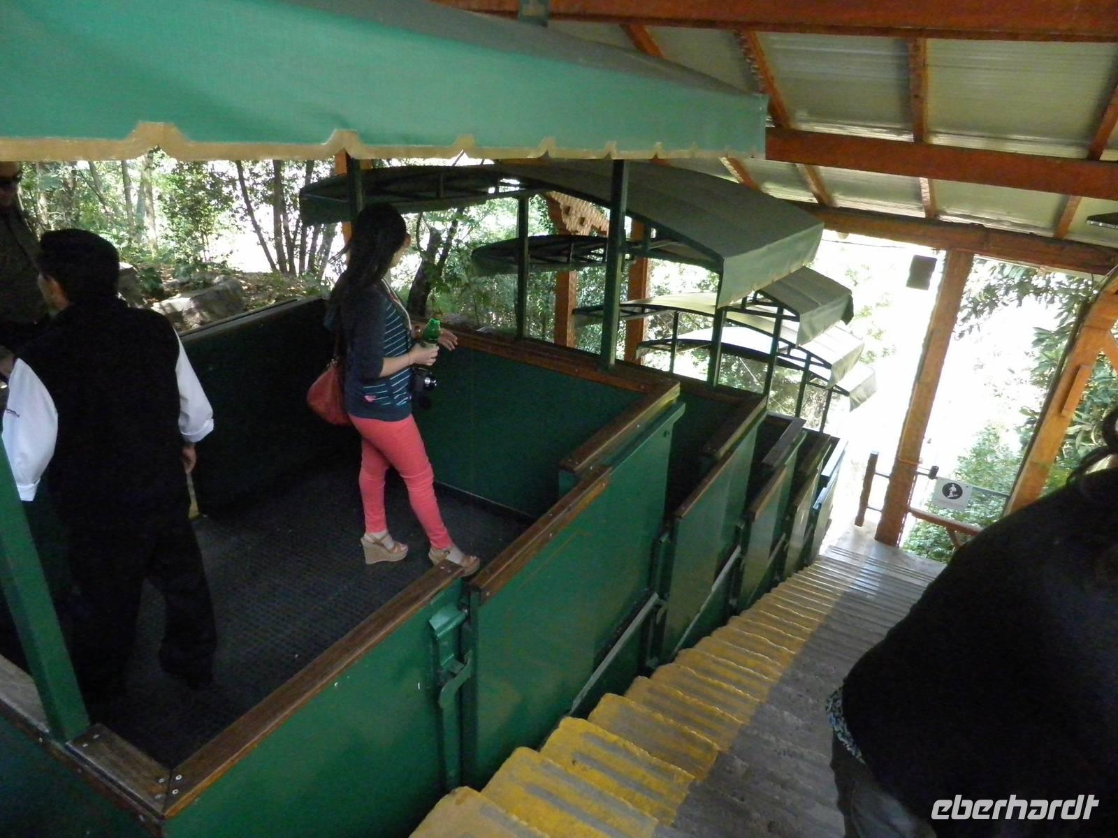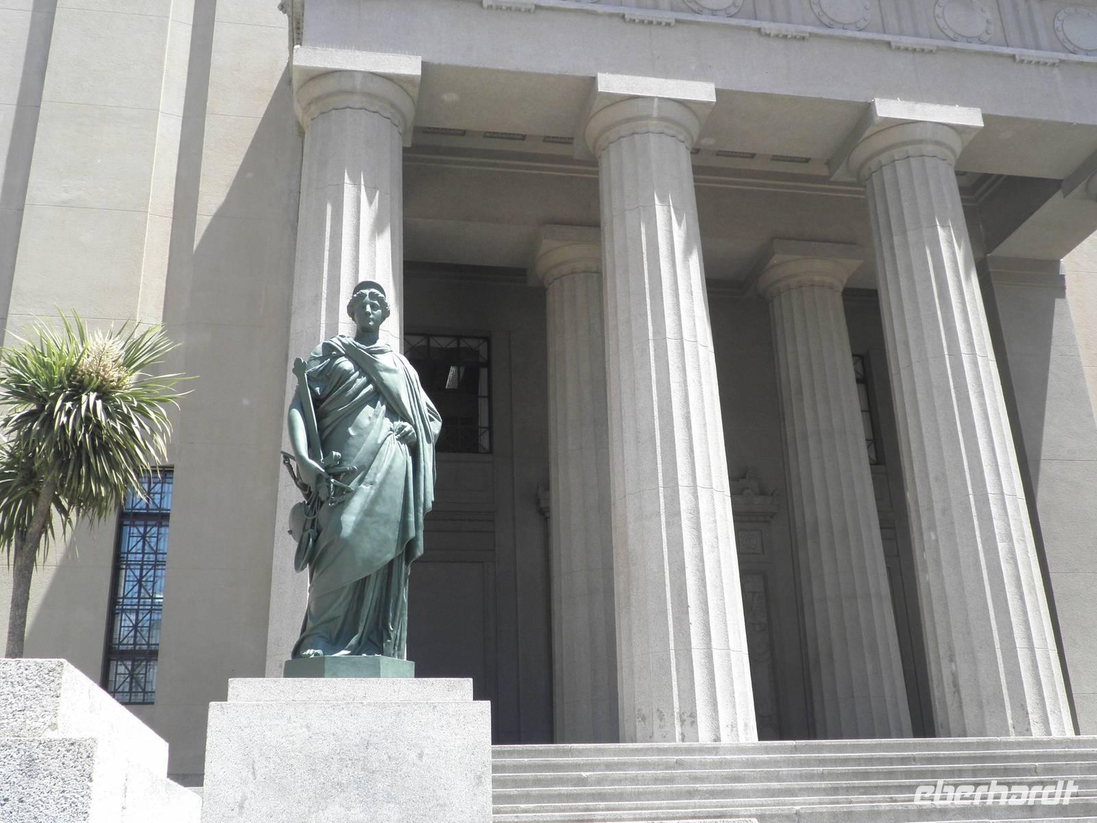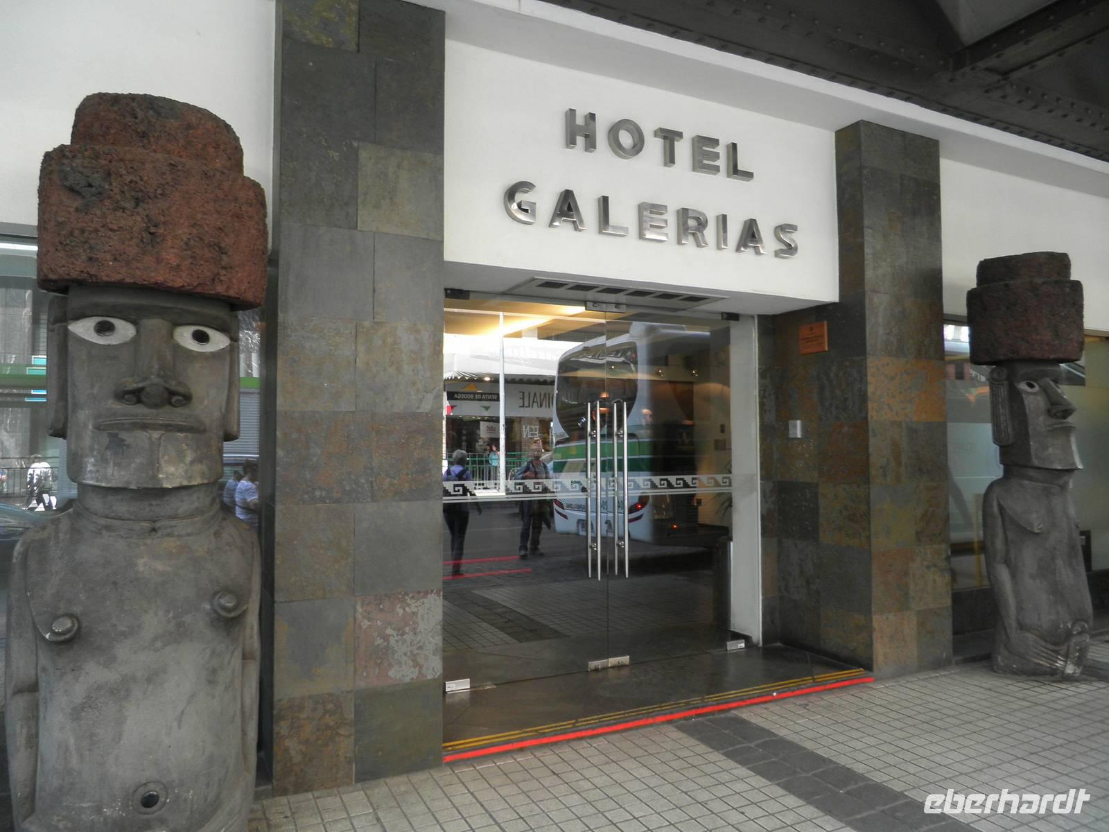 Am Morgen gegen 9:30 Uhr landeten wir auf dem Flughafen von Santiago de Chile. Nach der Passkontrolle und einer weiteren Kontrolle, dass wir keine pflanzlichen oder tierischen Produkte in Chile einführen, trafen wir am Ausgang unsere Reiseleiterin Solange, die uns mit einem „Eberhardt"-Schild schon erwartete. Sie begleitete uns zum Bus, mit dem wir zunächst zu unserem Hotel im Stadtzentrum „Las Galerias" fuhren. Empfangen wurden wir von zwei Nachbildungen der Moai-Statuen, die auf der Osterinsel stehen, und die rechts und links an der Eingangstür des Hotels Wache hielten. Im Hotel hatten wir Gelegenheit, uns ein wenig frisch zu machen und unser Gepäck zu hinterlassen, bis wir einchecken konnten. Danach begaben wir uns zusammen mit unserer Reiseleiterin Solange auf eine Entdeckungstour durch Santiago. Wir sahen die Plaza Italia, spazierten am Haus von Pablo Neruda vorbei und durchs Künstlerviertel, dass eine ganze Reihe uriger Kneipen und Galerien beherbergt. Einige erstanden ein wichtiges Reiseutensil: einen Sonnenhut an einem der zahlreichen Stände und Kioske in der Stadt. Danach ging es hinauf auf einen Berg innerhalb der Stadt: Cerro San Cristobal, aber nicht zu Fuß oder mit dem Bus, nein, wir nahmen ganz traditionell ein Funicular, das ist eine Standseilbahn, die uns bequem und recht schnell die sehr große Steigung hinauf auf den Berg brachte. Oben angelangt, bestaunten wir eine herrlich angelegte Grünanlage mit Palmen und anderen Pflanzen, über denen die weiße Statue der Jungfrau Maria thront. Wir nutzten die Zeit zu einem kleinen Spaziergang auf dem Hügel, fotografierten und freuten uns an dem herrlichen Wetter, das uns mit Sonnenschein und angenehmer Wärme erfreute. Auf dem Weg hinunter in die Stadt hielt unser Bus noch einmal an einem Aussichtspunkt und wir überblickten das neue und moderne Santiago: Sanhatten, ein Bereich der Stadt mit vielen Hochhäusern. Zurück in der Stadt brachte uns der Bus schließlich zum Mercado Central, die Markthalle im Zentrum, dort wurden wir schon erwartet in einem Restaurant, das uns allerlei verschiedene Sorten fangfrischen Fisch servierte. Wir genossen diese Mahlzeit, ein älterer Chilene erfreute uns mit traditionellen Liedern, begleitet mit seiner Gitarre. Wir probierten unseren ersten Pisco Sour, das ist ein traditioneller Cocktail in Chile, der zur Begrüßung von Gästen angeboten wird. Nach dem Essen machten wir noch einen kleinen Spaziergang durch die Stadt, besuchten die alte Börse, sahen den Hauptplatz Plaza de Armas, standen vor der Moneda und dem Denkmal für Salvador Alliende direkt davor. Nach einer letzten kurzen Besichtigung der Kirche des heiligen Franziskus erreichten wir erschöpft unser Hotel. Wir nahmen unser Gepäck und begaben uns auf unsere Zimmer. Danach trafen wir uns schon bald wieder in der Bar des Hotels, dort erhielten wir einen Begrüßungscocktail, wieder einen Pisco Sour, dieses Mal war er schon ein bisschen stärker. So endete ein anstrengender Tag. Wir schliefen sicher alle recht gut während unserer ersten Nacht in Chile nach der langen Anreise.