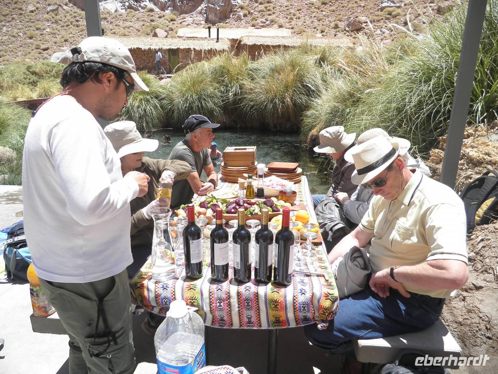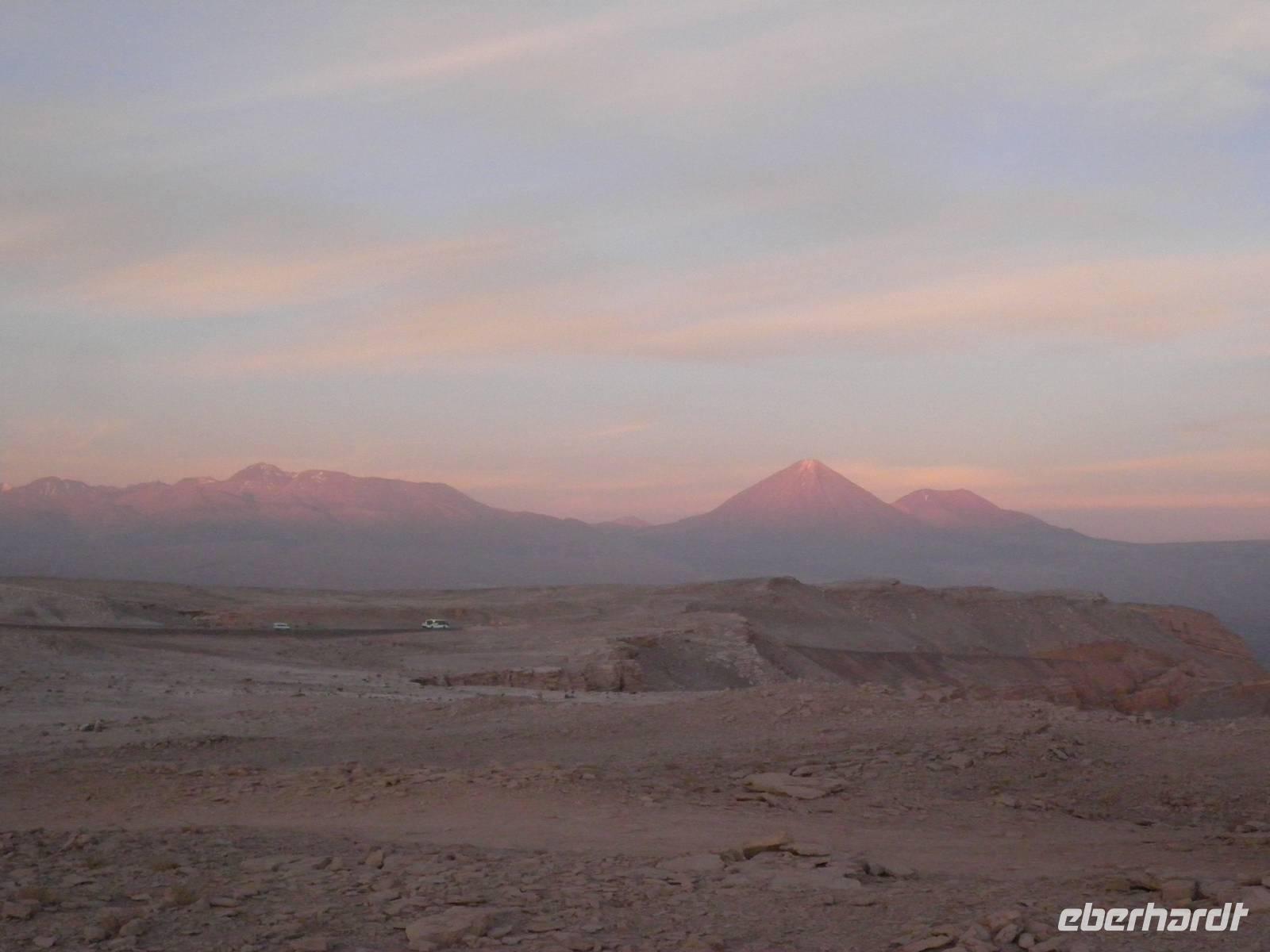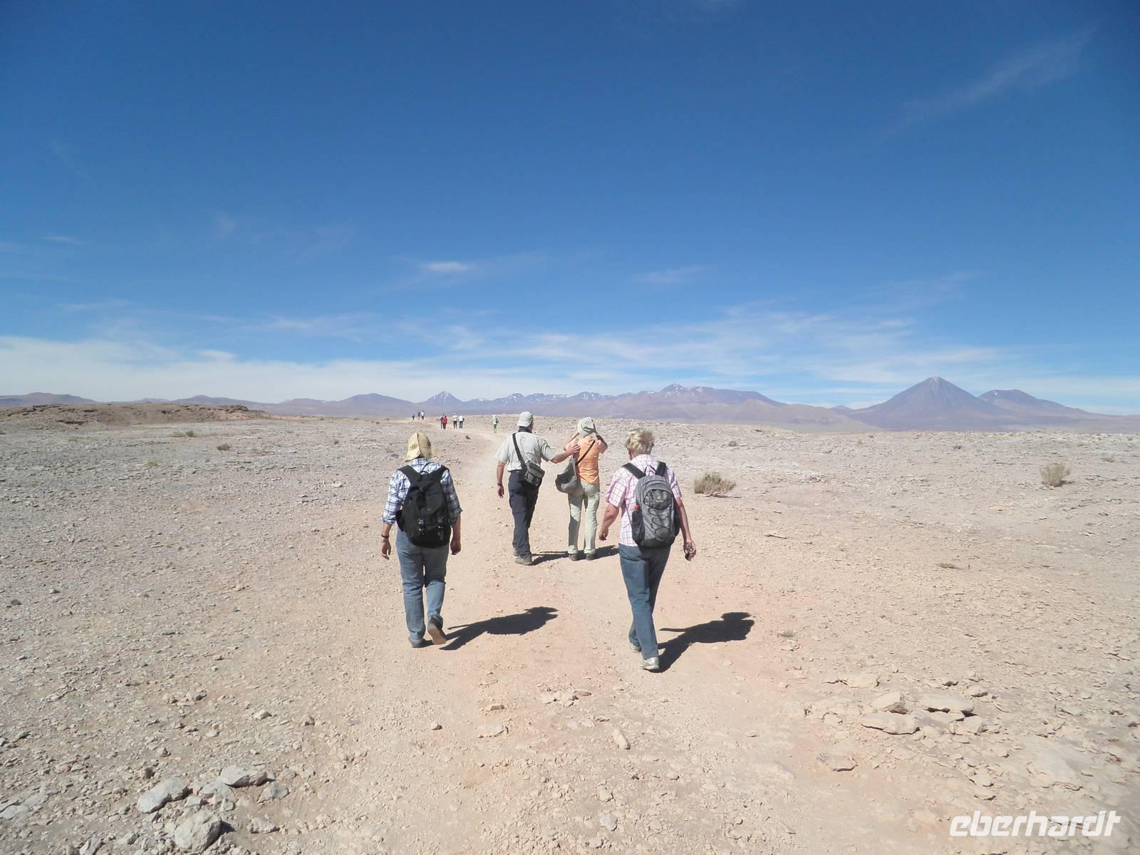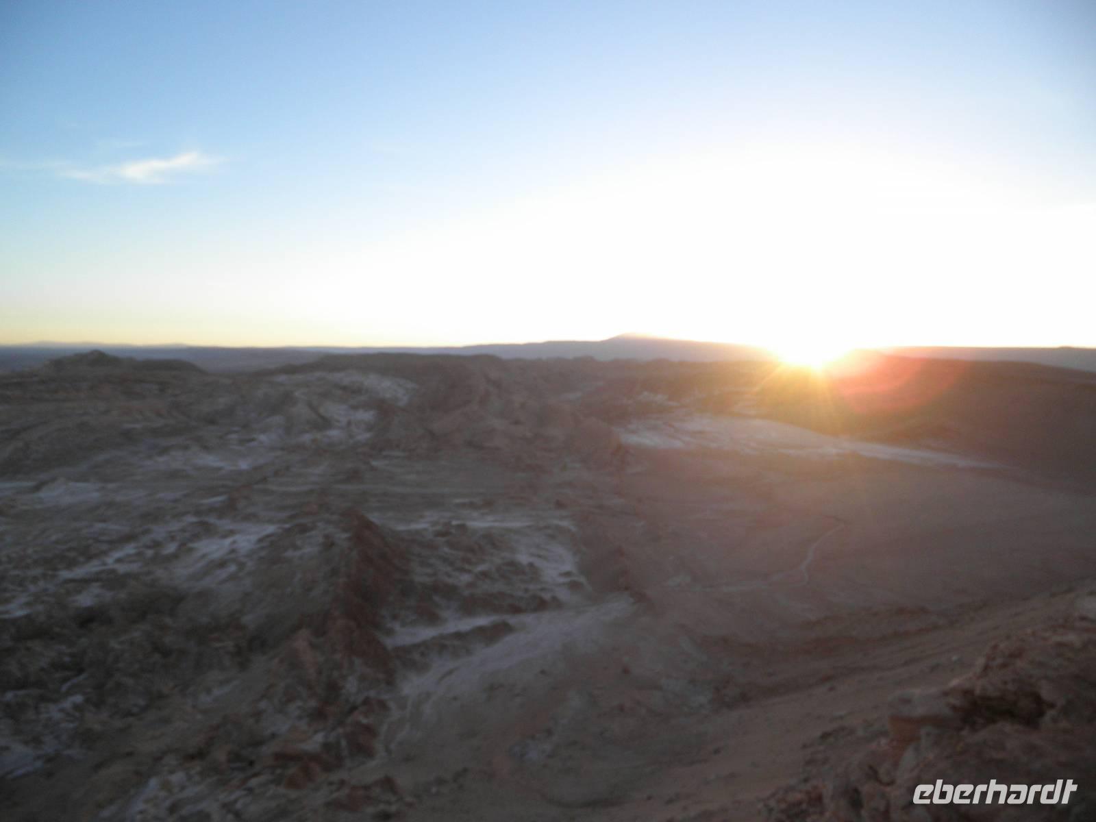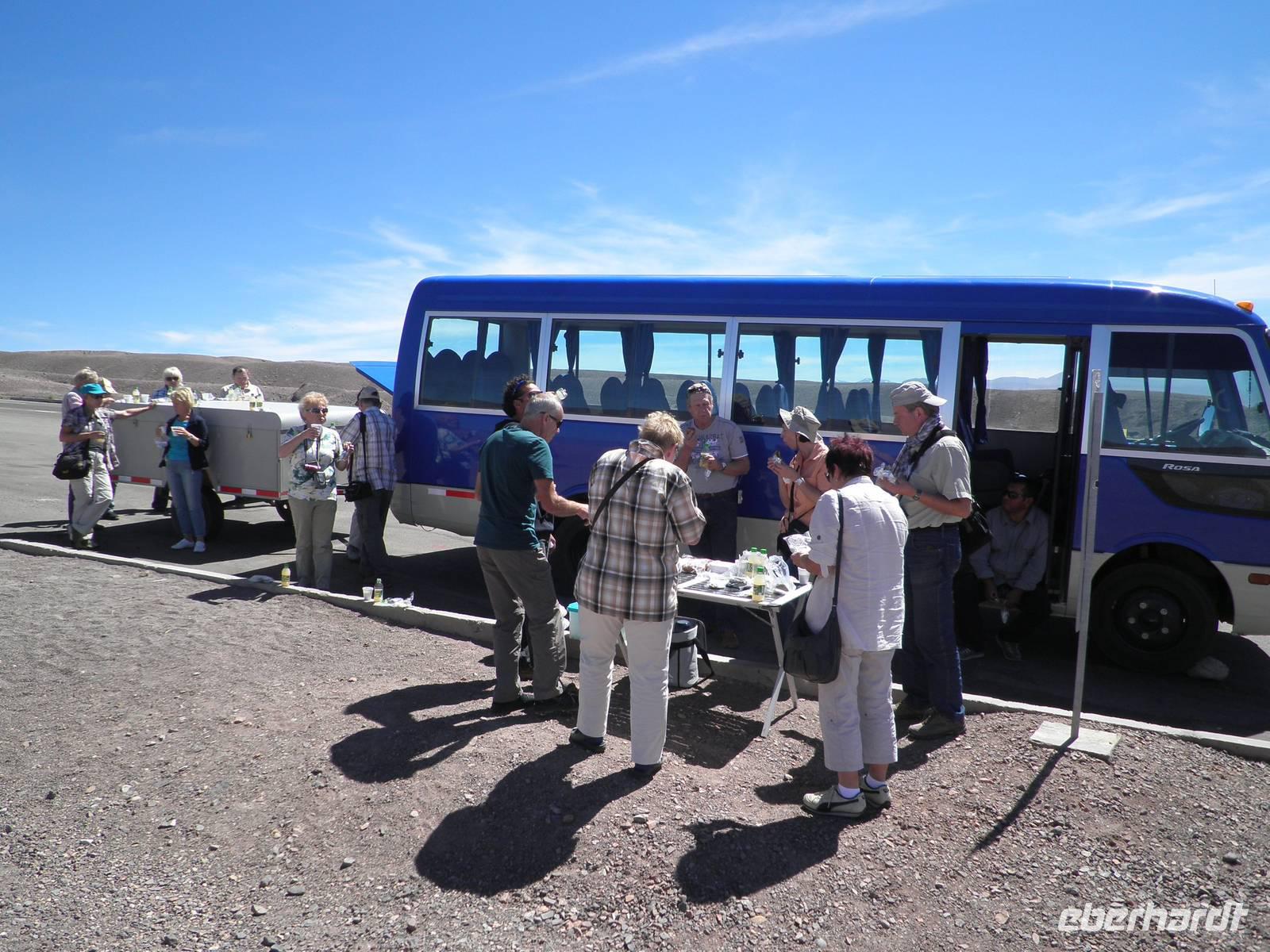 Bereits um 4:00 Uhr am Morgen wurden wir geweckt. Ein weiterer Flug sollte uns heute Morgen in den Norden des Landes bringen, nach Calama in der Atacamawüste. Unser Flugzeug startete und landete pünktlich. Auf dem Flughafen in Calama erwartete uns schon unser nächster Reiseleiter Emilio. Ein kleiner blauer Bus wartete vor dem Flughafengebäude mitten in der Wüste. Unser Fahrer Wilson lud unsere Koffer in einen Anhänger und los ging unsere Fahrt durch die Atacama. Calama ist eine Stadt, in der hauptsächlich die Arbeiter der großen Kupferminen wohnen, wenn sie arbeiten. Ihre Familien leben in der Regel nicht in dieser Wüstengegend, die Männer fliegen also „auf Montage" hier nach Calama. Die weltweit größte Kupfermine als Tagebau befindet sich vor den Toren der kleinen Stadt. Wir fuhren in Richtung San Pedro de Atacama. Das ist ein Oasendorf mitten in der Wüste. Auf unserem Weg dorthin machten wir einen Halt an der Straße, gerade als wir ankamen, entdeckten wir unser erstes Guanako, das leider schnell wieder verschwand, noch bevor wir alle unseren Fotoapparat bereit hatten. Dafür wurden wir entschädigt mit einem Picknick vorm Bus. Wir stärkten uns an frischen belegten Broten, Muffins, Kaffee, Tee und Saft. Danach fuhren wir weiter, waren beeindruckt von der kargen Landschaft. Kurz vor San Pedro durchquerten wir das Dinotal, das seinen Namen von der Form der Felsen bekommen hat, die im gesamten Tal zu sehen sind, runde Rücken, wie die eines Dinosauriers. Gegen Mittag erreichten wir unser Hotel in San Pedro, einer Art Lodge mit Bungalows, die sich um das Empfangsgebäude scharen. Wir bezogen unsere Zimmer und hatten noch einige Stunden Zeit, um auf eigene Faust diese Oase mitten in der Wüste zu erkunden. Es gibt lehmgestampfte Straßen, Häuser aus Lehm und viele kleine Geschäfte, vor denen die verschiedensten Hunde ausruhten oder durch die Straßen liefen. Ein archäologisches Museum sowie eine kleine Kirche gibt es auch. Auf dem Marktplatz wurden Heuballen, Zwiebeln und andere Waren angeboten. Am Nachmittag trafen wir uns wieder im Hotel, um einen Ausflug ins nahe gelegene Mondtal zu machen. Emilio zeigte uns verschiedene sehenswerte Felsen und Sanddünen in der Umgebung, wir unternahmen einige Spaziergänge, bis wir schließlich rechtzeitig zum Sonnenuntergang auf einer Aussichtsanhöhe über dem Mondtal ankamen. Die Sonne wollte gerade untergehen und während ihres Weges hinter den Horizont, färbte sie sich orange und die gegenüberliegenden Berge der Anden gleich mit. Wir bestaunten dieses beeindruckende Farbenspiel. Zu unserer großen Freude hatten die Kollegen von Emilio ein Picknick für uns vorbereitet, wieder gab es Pisco Sour, dazu selbst gebackene Pasteten und kleine belegte Toastscheiben mit Oliven. Wir ließen es uns schmecken. Schnell setzte die Dunkelheit ein und Emilio wollte uns gern noch das Kreuz des Südens am nächtlichen Himmel zeigen, aber wir warteten eine Weile vergebens, dieses Erlebnis sollten wir später noch in der Wüste Atacama nachholen.