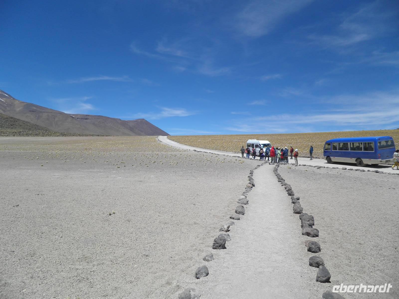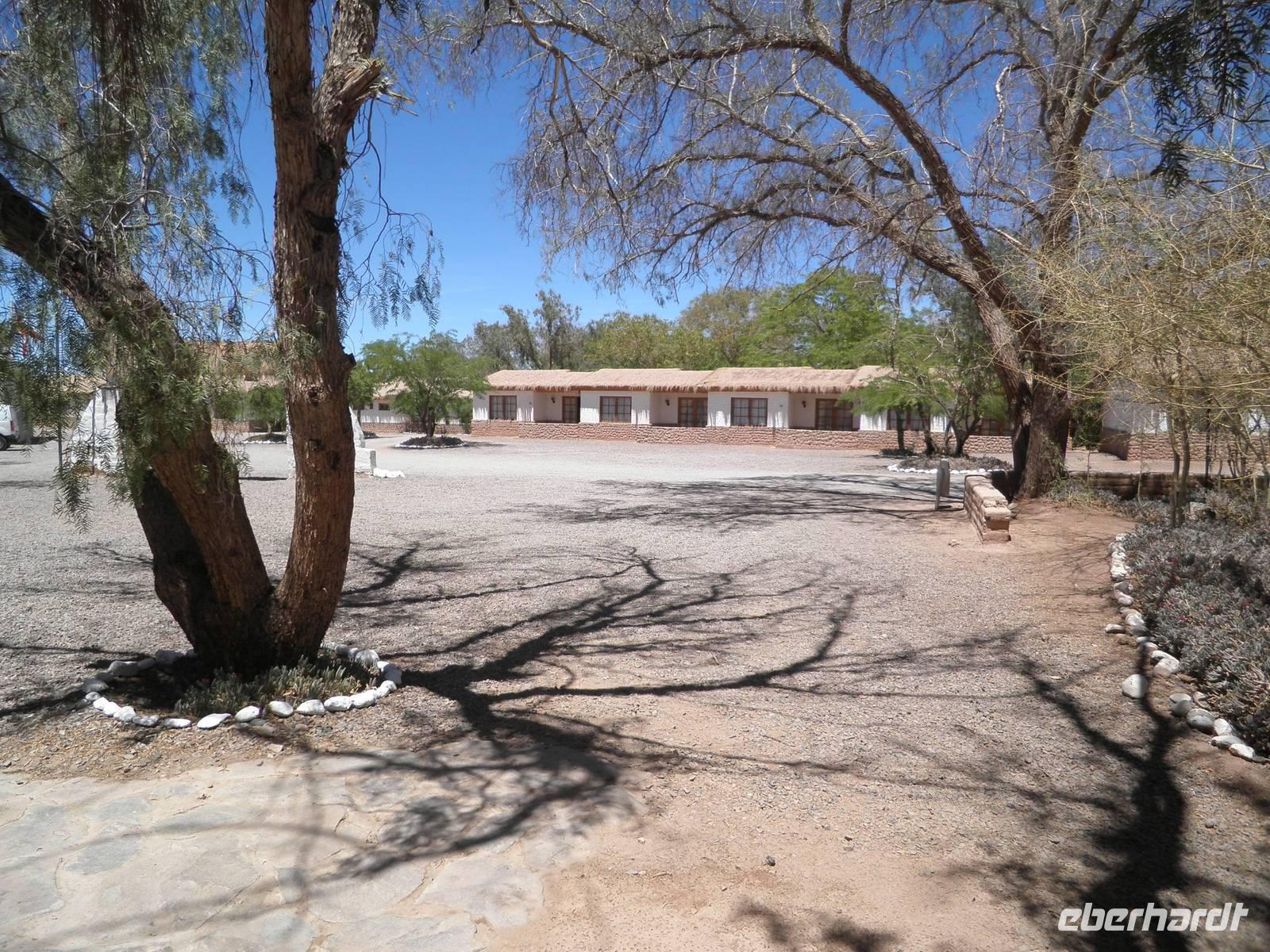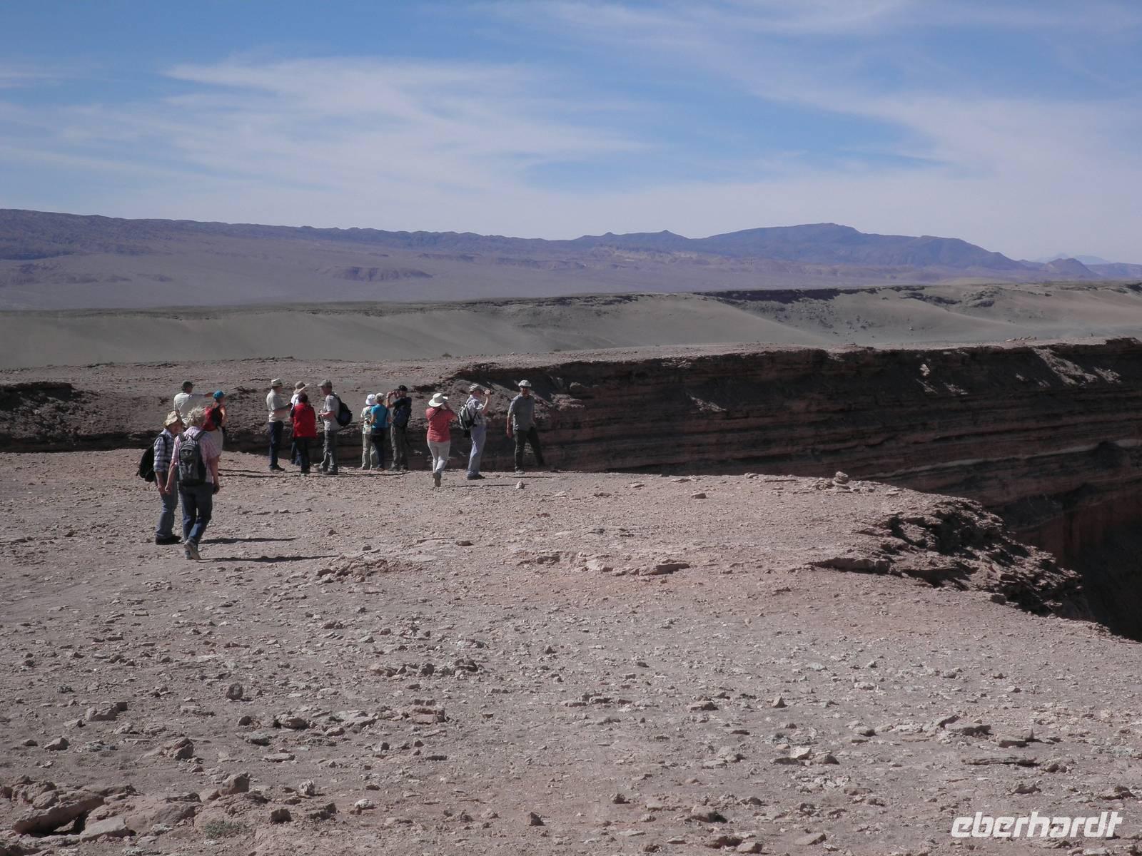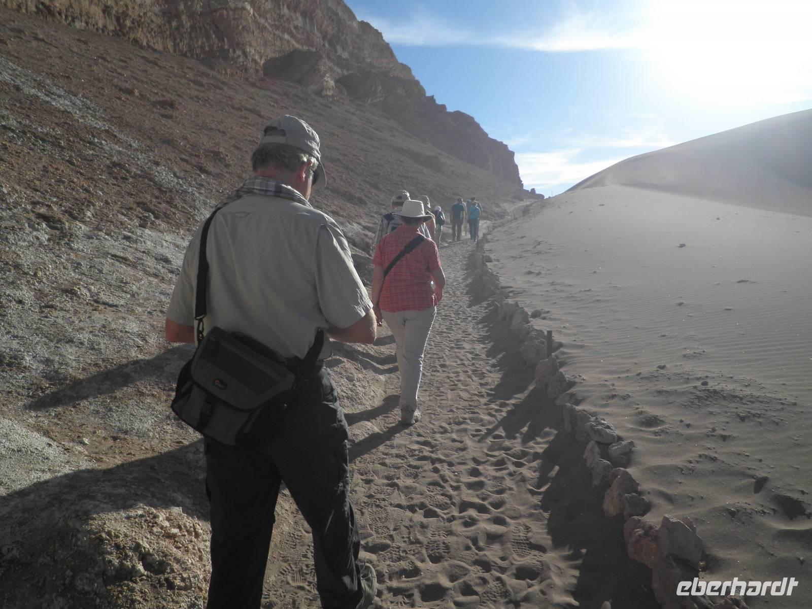 Bereits um 4:00 Uhr am Morgen wurden wir geweckt. Ein weiterer Flug sollte uns heute Morgen in den Norden des Landes bringen, nach Calama in der Atacamawüste. Unser Flugzeug startete und landete pünktlich. Auf dem Flughafen in Calama erwartete uns schon unser nächster Reiseleiter Emilio. Ein kleiner blauer Bus wartete vor dem Flughafengebäude mitten in der Wüste. Unser Fahrer Wilson lud unsere Koffer in einen Anhänger und los ging unsere Fahrt durch die Atacama. Calama ist eine Stadt, in der hauptsächlich die Arbeiter der großen Kupferminen wohnen, wenn sie arbeiten. Ihre Familien leben in der Regel nicht in dieser Wüstengegend, die Männer fliegen also „auf Montage" hier nach Calama. Die weltweit größte Kupfermine als Tagebau befindet sich vor den Toren der kleinen Stadt. Wir fuhren in Richtung San Pedro de Atacama. Das ist ein Oasendorf mitten in der Wüste. Auf unserem Weg dorthin machten wir einen Halt an der Straße, gerade als wir ankamen, entdeckten wir unser erstes Guanako, das leider schnell wieder verschwand, noch bevor wir alle unseren Fotoapparat bereit hatten. Dafür wurden wir entschädigt mit einem Picknick vorm Bus. Wir stärkten uns an frischen belegten Broten, Muffins, Kaffee, Tee und Saft. Danach fuhren wir weiter, waren beeindruckt von der kargen Landschaft. Kurz vor San Pedro durchquerten wir das Dinotal, das seinen Namen von der Form der Felsen bekommen hat, die im gesamten Tal zu sehen sind, runde Rücken, wie die eines Dinosauriers. Gegen Mittag erreichten wir unser Hotel in San Pedro, einer Art Lodge mit Bungalows, die sich um das Empfangsgebäude scharen. Wir bezogen unsere Zimmer und hatten noch einige Stunden Zeit, um auf eigene Faust diese Oase mitten in der Wüste zu erkunden. Es gibt lehmgestampfte Straßen, Häuser aus Lehm und viele kleine Geschäfte, vor denen die verschiedensten Hunde ausruhten oder durch die Straßen liefen. Ein archäologisches Museum sowie eine kleine Kirche gibt es auch. Auf dem Marktplatz wurden Heuballen, Zwiebeln und andere Waren angeboten. Am Nachmittag trafen wir uns wieder im Hotel, um einen Ausflug ins nahe gelegene Mondtal zu machen. Emilio zeigte uns verschiedene sehenswerte Felsen und Sanddünen in der Umgebung, wir unternahmen einige Spaziergänge, bis wir schließlich rechtzeitig zum Sonnenuntergang auf einer Aussichtsanhöhe über dem Mondtal ankamen. Die Sonne wollte gerade untergehen und während ihres Weges hinter den Horizont, färbte sie sich orange und die gegenüberliegenden Berge der Anden gleich mit. Wir bestaunten dieses beeindruckende Farbenspiel. Zu unserer großen Freude hatten die Kollegen von Emilio ein Picknick für uns vorbereitet, wieder gab es Pisco Sour, dazu selbst gebackene Pasteten und kleine belegte Toastscheiben mit Oliven. Wir ließen es uns schmecken. Schnell setzte die Dunkelheit ein und Emilio wollte uns gern noch das Kreuz des Südens am nächtlichen Himmel zeigen, aber wir warteten eine Weile vergebens, dieses Erlebnis sollten wir später noch in der Wüste Atacama nachholen.