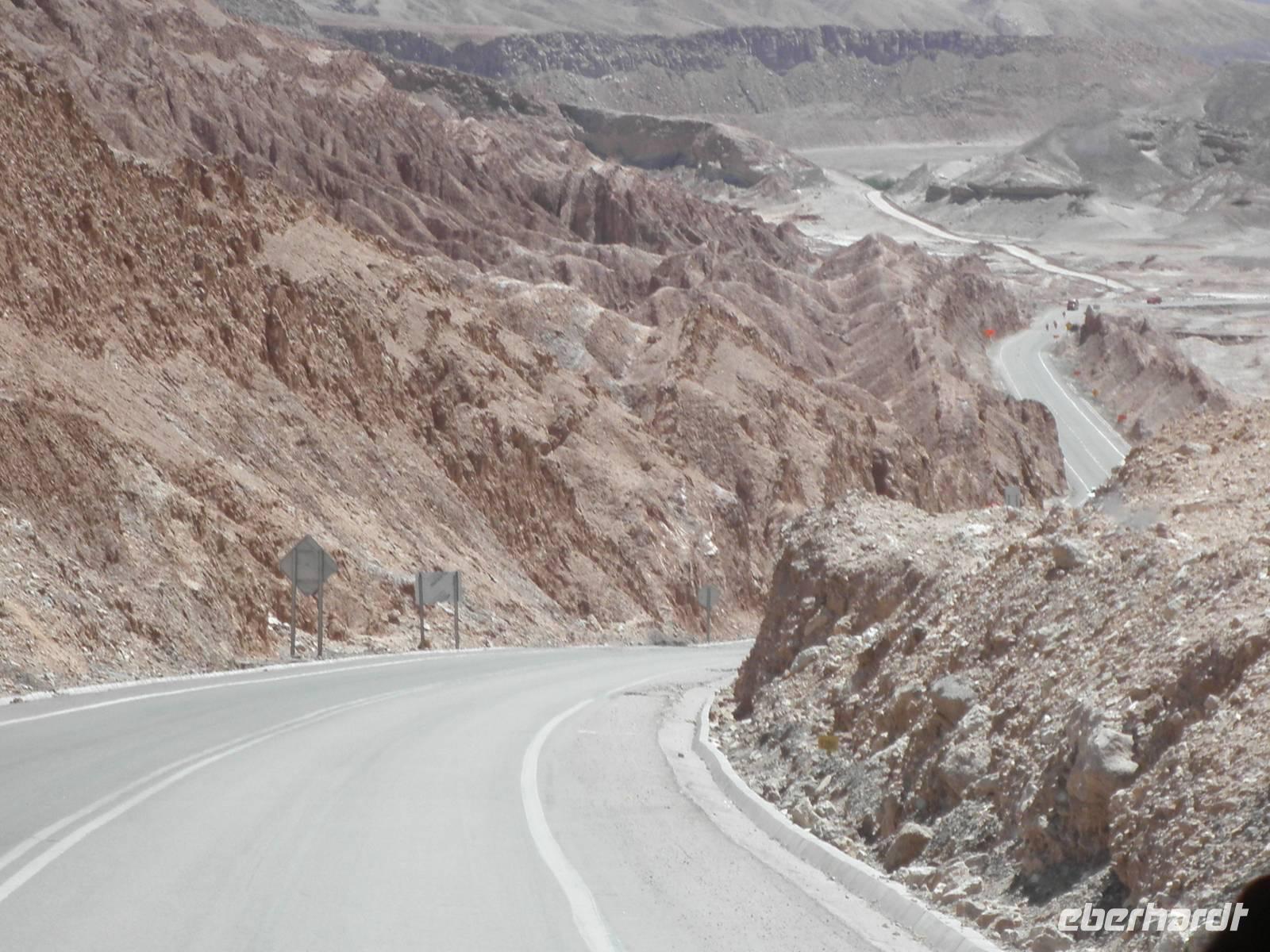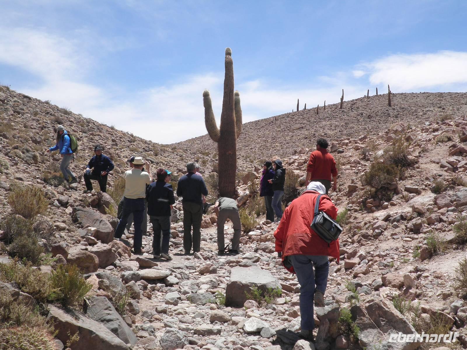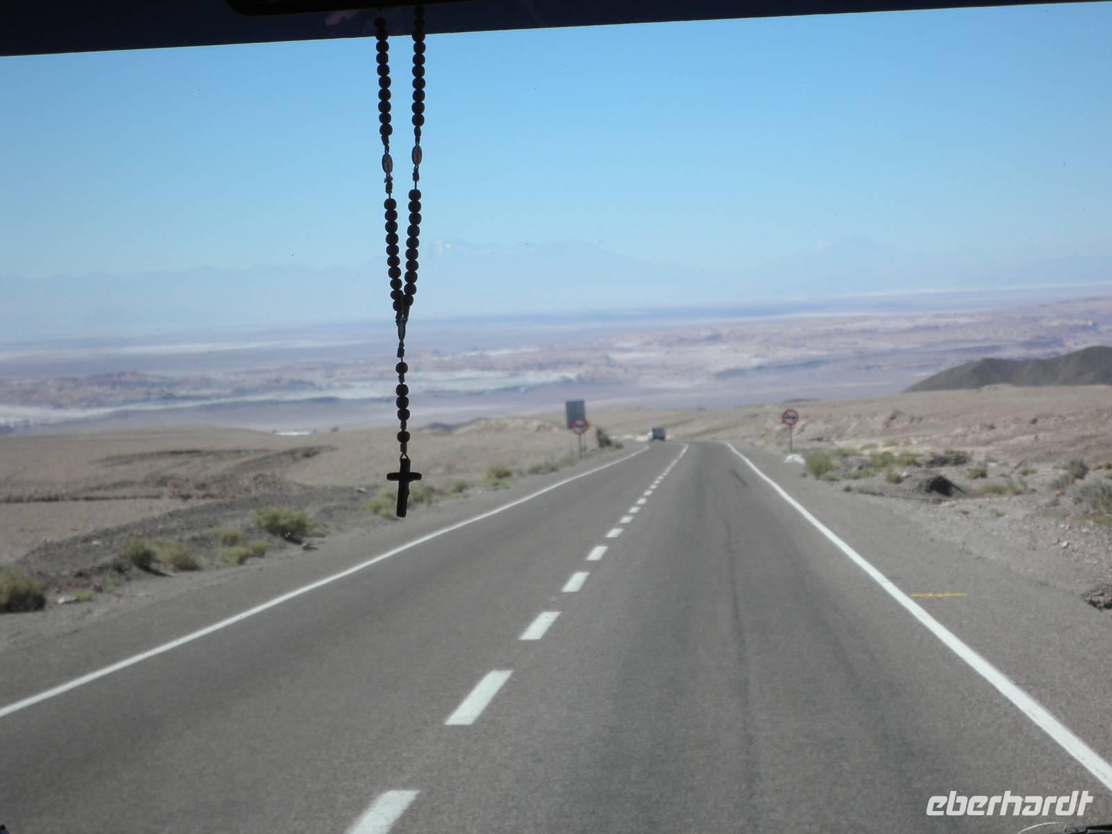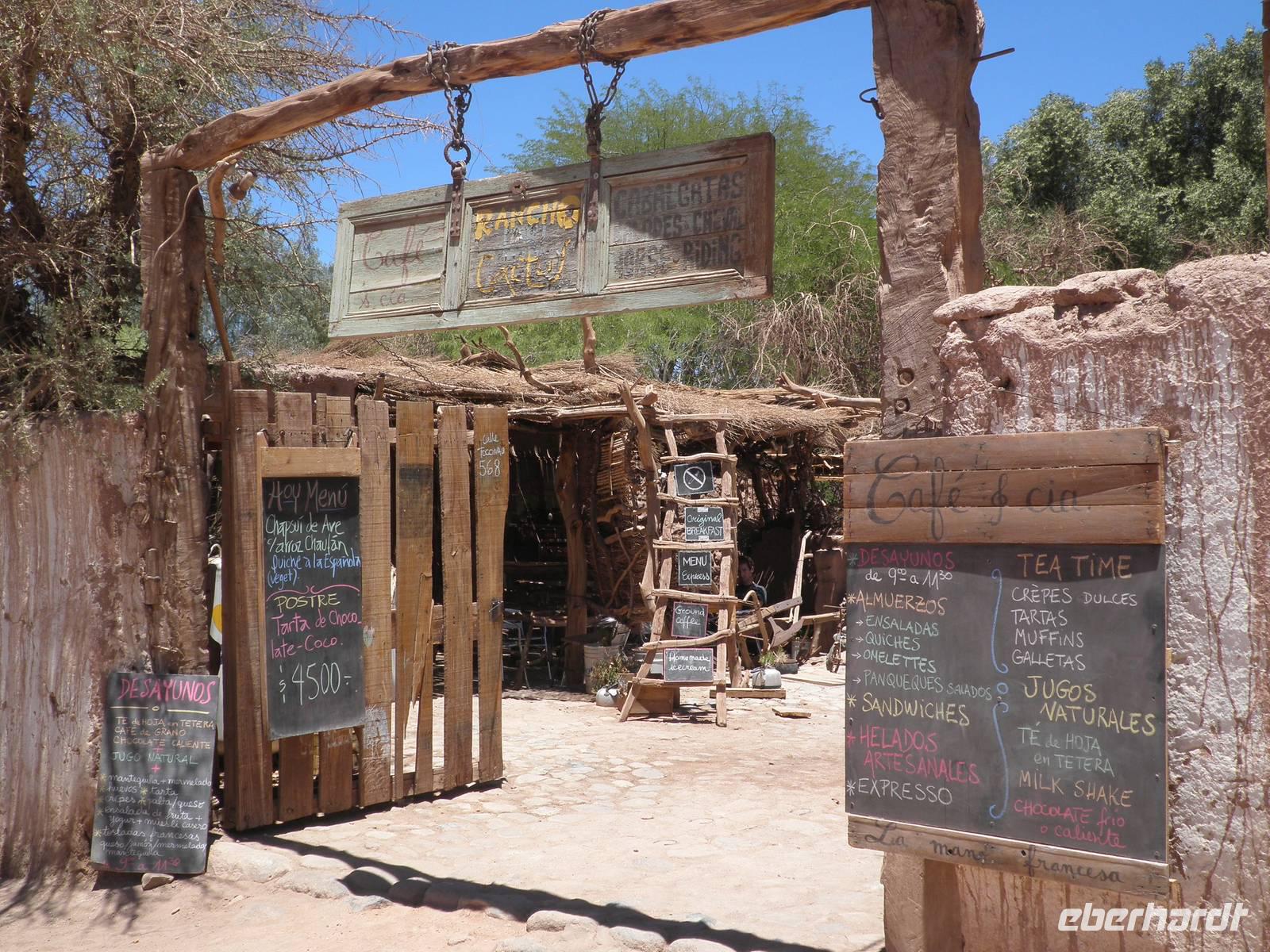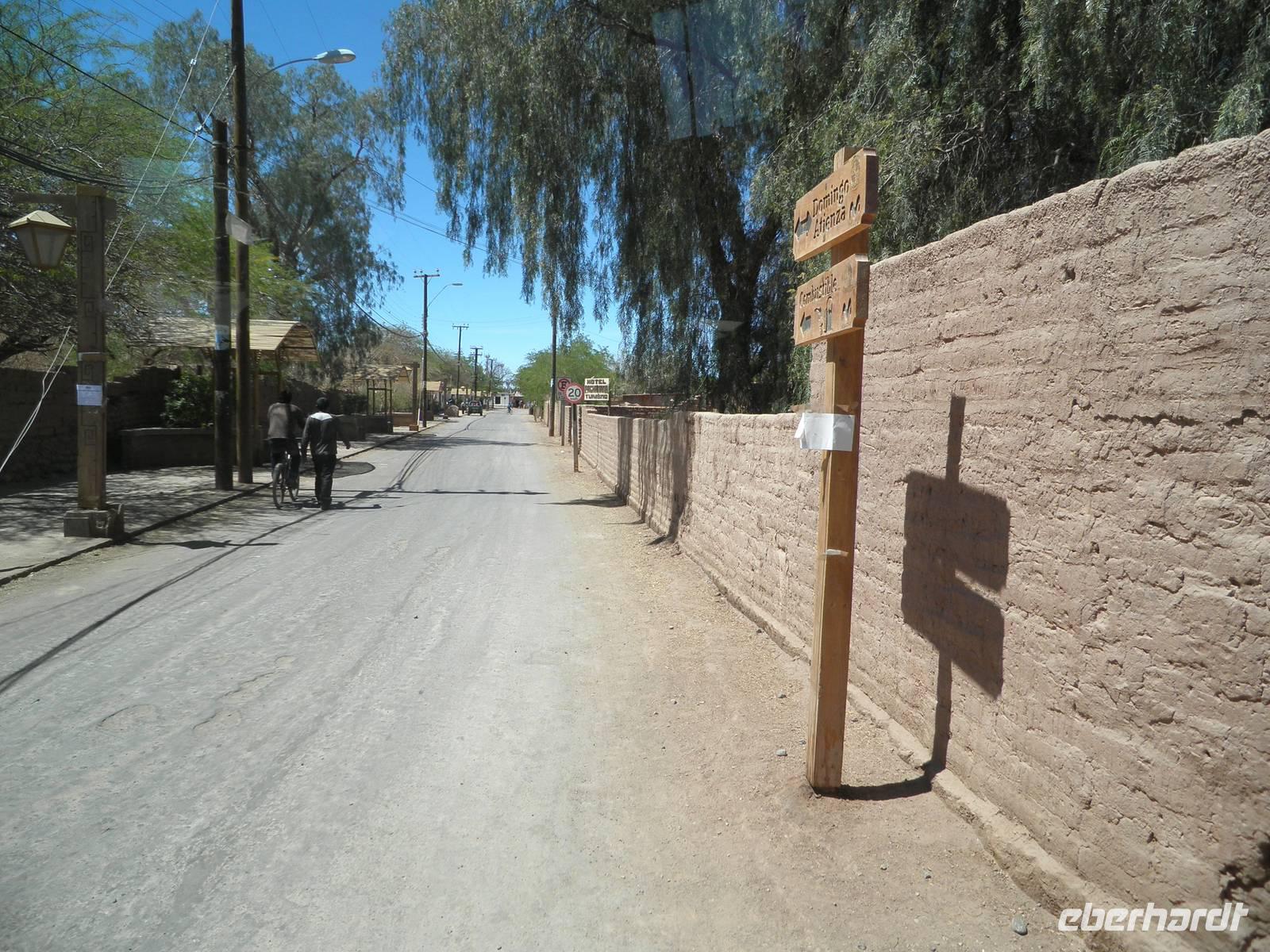Bereits um 4:00 Uhr am Morgen wurden wir geweckt. Ein weiterer Flug sollte uns heute Morgen in den Norden des Landes bringen, nach Calama in der Atacamawüste. Unser Flugzeug startete und landete pünktlich. Auf dem Flughafen in Calama erwartete uns schon unser nächster Reiseleiter Emilio. Ein kleiner blauer Bus wartete vor dem Flughafengebäude mitten in der Wüste. Unser Fahrer Wilson lud unsere Koffer in einen Anhänger und los ging unsere Fahrt durch die Atacama. Calama ist eine Stadt, in der hauptsächlich die Arbeiter der großen Kupferminen wohnen, wenn sie arbeiten. Ihre Familien leben in der Regel nicht in dieser Wüstengegend, die Männer fliegen also „auf Montage" hier nach Calama. Die weltweit größte Kupfermine als Tagebau befindet sich vor den Toren der kleinen Stadt. Wir fuhren in Richtung San Pedro de Atacama. Das ist ein Oasendorf mitten in der Wüste. Auf unserem Weg dorthin machten wir einen Halt an der Straße, gerade als wir ankamen, entdeckten wir unser erstes Guanako, das leider schnell wieder verschwand, noch bevor wir alle unseren Fotoapparat bereit hatten. Dafür wurden wir entschädigt mit einem Picknick vorm Bus. Wir stärkten uns an frischen belegten Broten, Muffins, Kaffee, Tee und Saft. Danach fuhren wir weiter, waren beeindruckt von der kargen Landschaft. Kurz vor San Pedro durchquerten wir das Dinotal, das seinen Namen von der Form der Felsen bekommen hat, die im gesamten Tal zu sehen sind, runde Rücken, wie die eines Dinosauriers. Gegen Mittag erreichten wir unser Hotel in San Pedro, einer Art Lodge mit Bungalows, die sich um das Empfangsgebäude scharen. Wir bezogen unsere Zimmer und hatten noch einige Stunden Zeit, um auf eigene Faust diese Oase mitten in der Wüste zu erkunden. Es gibt lehmgestampfte Straßen, Häuser aus Lehm und viele kleine Geschäfte, vor denen die verschiedensten Hunde ausruhten oder durch die Straßen liefen. Ein archäologisches Museum sowie eine kleine Kirche gibt es auch. Auf dem Marktplatz wurden Heuballen, Zwiebeln und andere Waren angeboten. Am Nachmittag trafen wir uns wieder im Hotel, um einen Ausflug ins nahe gelegene Mondtal zu machen. Emilio zeigte uns verschiedene sehenswerte Felsen und Sanddünen in der Umgebung, wir unternahmen einige Spaziergänge, bis wir schließlich rechtzeitig zum Sonnenuntergang auf einer Aussichtsanhöhe über dem Mondtal ankamen. Die Sonne wollte gerade untergehen und während ihres Weges hinter den Horizont, färbte sie sich orange und die gegenüberliegenden Berge der Anden gleich mit. Wir bestaunten dieses beeindruckende Farbenspiel. Zu unserer großen Freude hatten die Kollegen von Emilio ein Picknick für uns vorbereitet, wieder gab es Pisco Sour, dazu selbst gebackene Pasteten und kleine belegte Toastscheiben mit Oliven. Wir ließen es uns schmecken. Schnell setzte die Dunkelheit ein und Emilio wollte uns gern noch das Kreuz des Südens am nächtlichen Himmel zeigen, aber wir warteten eine Weile vergebens, dieses Erlebnis sollten wir später noch in der Wüste Atacama nachholen.