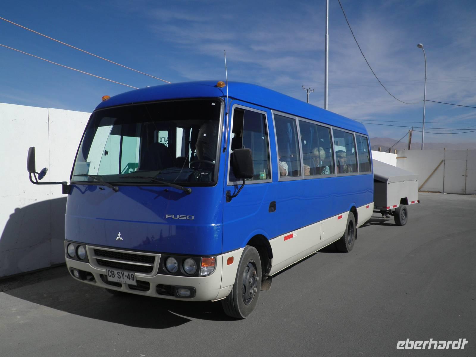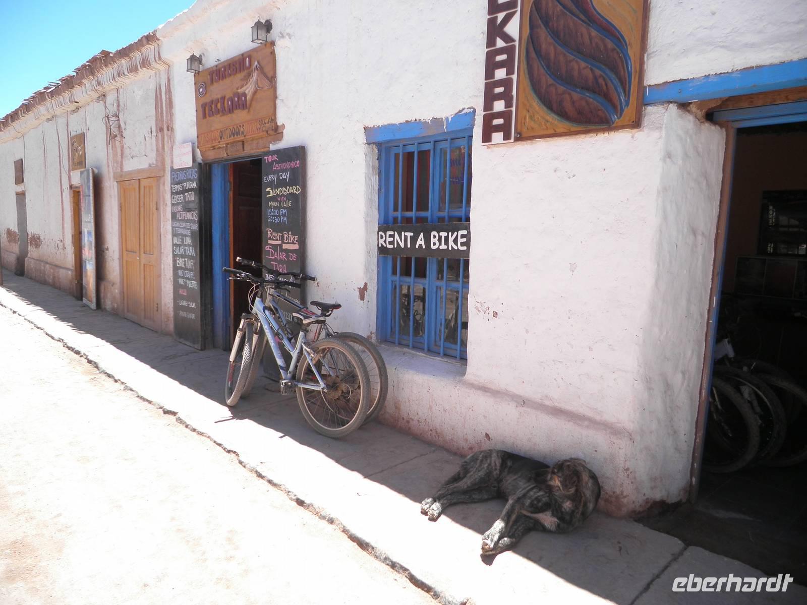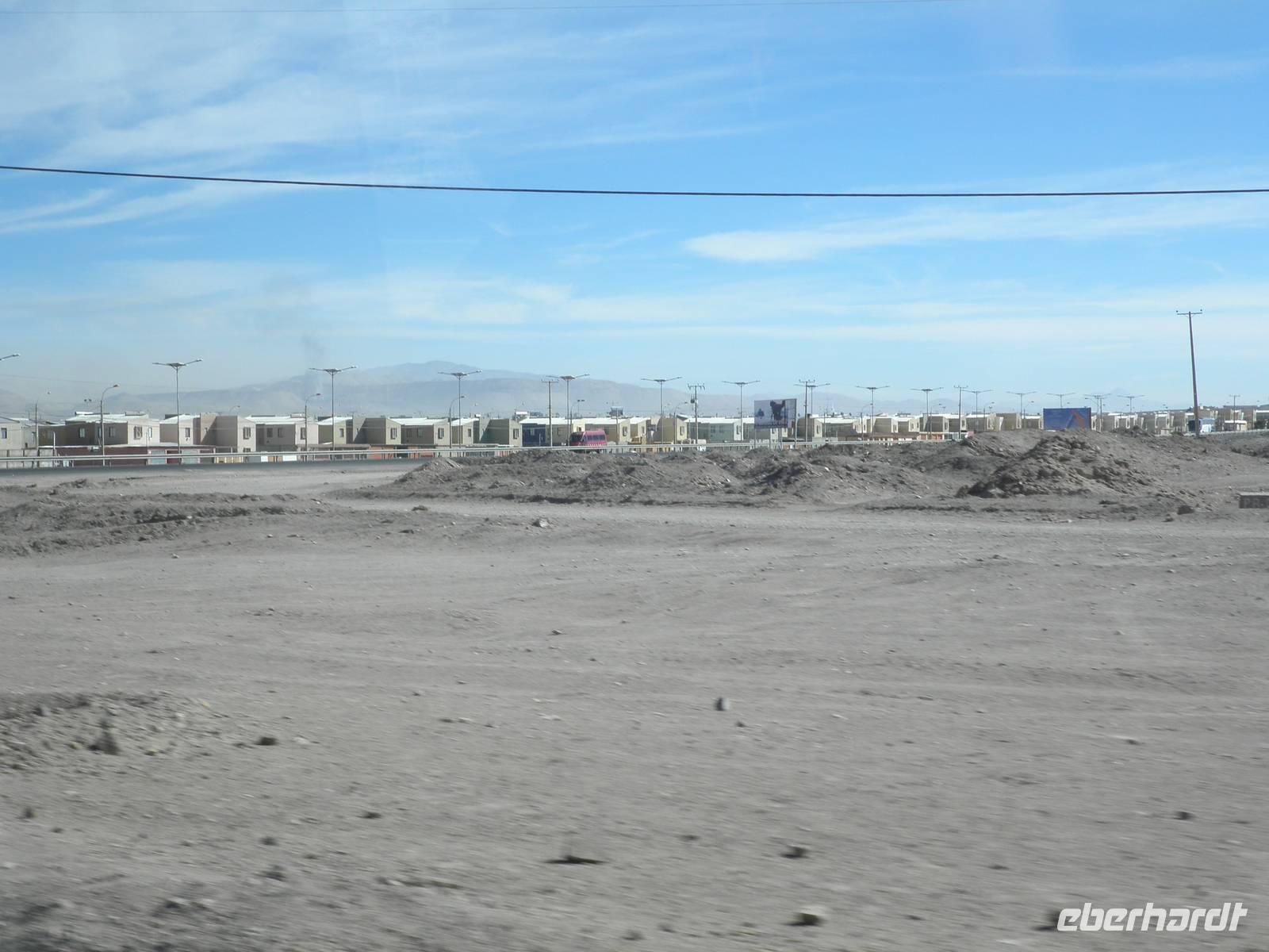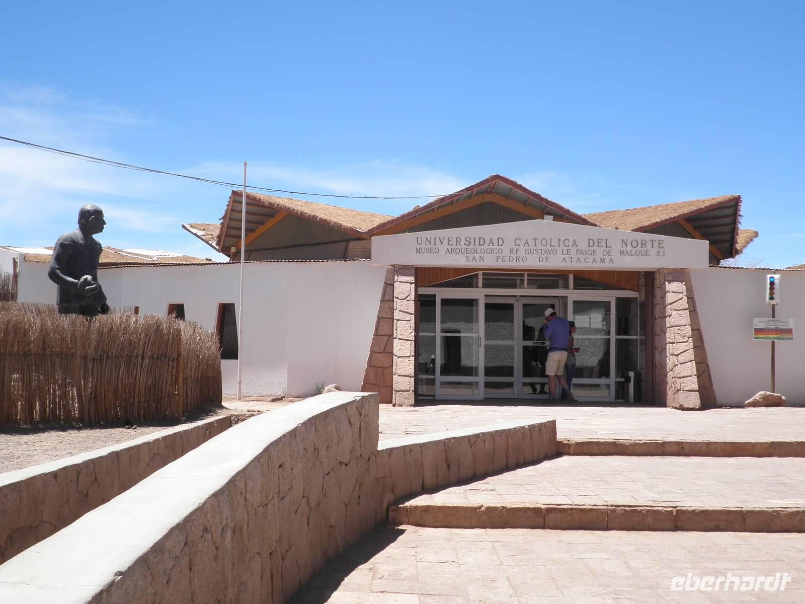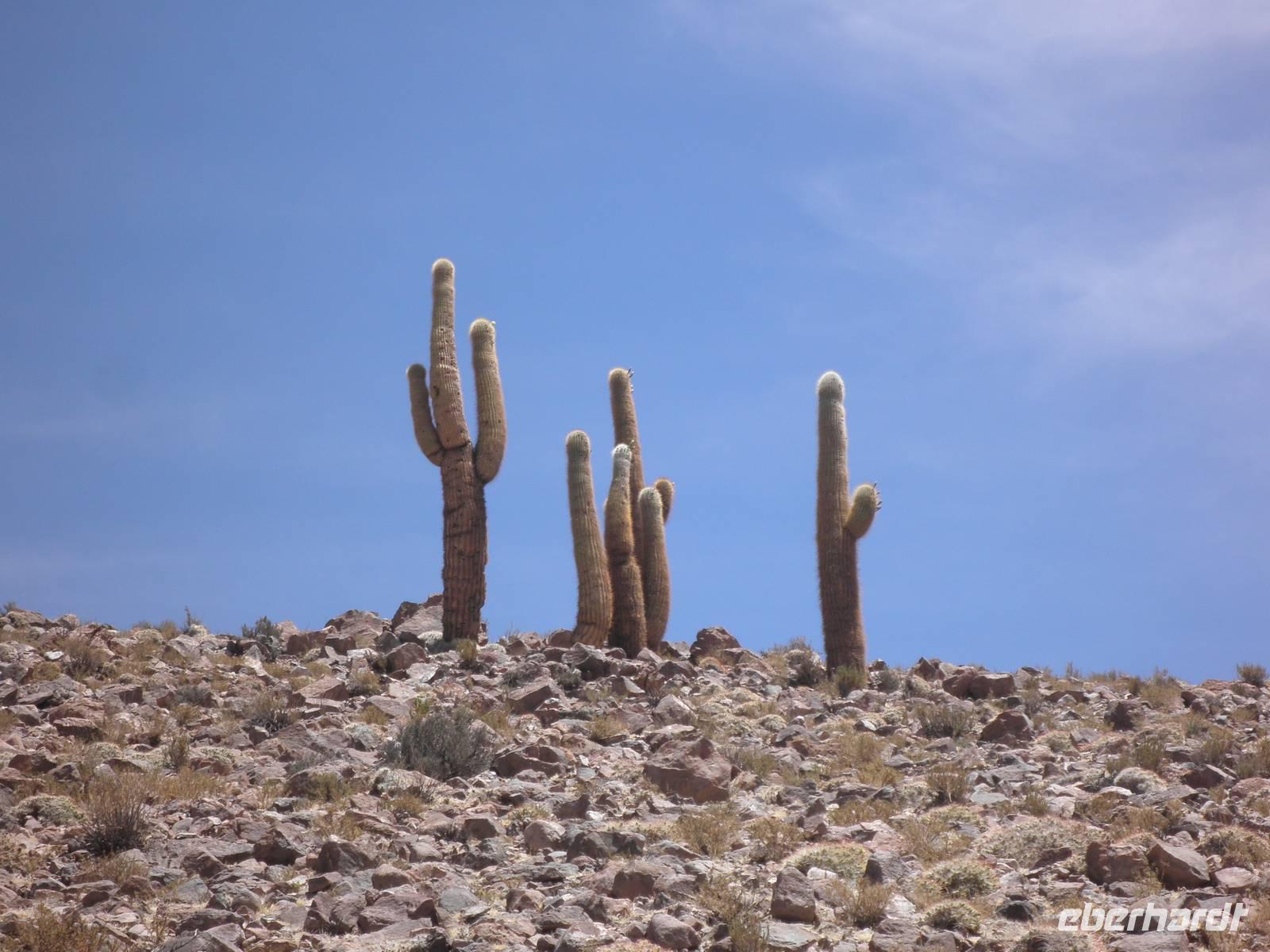 Bereits um 4:00 Uhr am Morgen wurden wir geweckt. Ein weiterer Flug sollte uns heute Morgen in den Norden des Landes bringen, nach Calama in der Atacamawüste. Unser Flugzeug startete und landete pünktlich. Auf dem Flughafen in Calama erwartete uns schon unser nächster Reiseleiter Emilio. Ein kleiner blauer Bus wartete vor dem Flughafengebäude mitten in der Wüste. Unser Fahrer Wilson lud unsere Koffer in einen Anhänger und los ging unsere Fahrt durch die Atacama. Calama ist eine Stadt, in der hauptsächlich die Arbeiter der großen Kupferminen wohnen, wenn sie arbeiten. Ihre Familien leben in der Regel nicht in dieser Wüstengegend, die Männer fliegen also „auf Montage" hier nach Calama. Die weltweit größte Kupfermine als Tagebau befindet sich vor den Toren der kleinen Stadt. Wir fuhren in Richtung San Pedro de Atacama. Das ist ein Oasendorf mitten in der Wüste. Auf unserem Weg dorthin machten wir einen Halt an der Straße, gerade als wir ankamen, entdeckten wir unser erstes Guanako, das leider schnell wieder verschwand, noch bevor wir alle unseren Fotoapparat bereit hatten. Dafür wurden wir entschädigt mit einem Picknick vorm Bus. Wir stärkten uns an frischen belegten Broten, Muffins, Kaffee, Tee und Saft. Danach fuhren wir weiter, waren beeindruckt von der kargen Landschaft. Kurz vor San Pedro durchquerten wir das Dinotal, das seinen Namen von der Form der Felsen bekommen hat, die im gesamten Tal zu sehen sind, runde Rücken, wie die eines Dinosauriers. Gegen Mittag erreichten wir unser Hotel in San Pedro, einer Art Lodge mit Bungalows, die sich um das Empfangsgebäude scharen. Wir bezogen unsere Zimmer und hatten noch einige Stunden Zeit, um auf eigene Faust diese Oase mitten in der Wüste zu erkunden. Es gibt lehmgestampfte Straßen, Häuser aus Lehm und viele kleine Geschäfte, vor denen die verschiedensten Hunde ausruhten oder durch die Straßen liefen. Ein archäologisches Museum sowie eine kleine Kirche gibt es auch. Auf dem Marktplatz wurden Heuballen, Zwiebeln und andere Waren angeboten. Am Nachmittag trafen wir uns wieder im Hotel, um einen Ausflug ins nahe gelegene Mondtal zu machen. Emilio zeigte uns verschiedene sehenswerte Felsen und Sanddünen in der Umgebung, wir unternahmen einige Spaziergänge, bis wir schließlich rechtzeitig zum Sonnenuntergang auf einer Aussichtsanhöhe über dem Mondtal ankamen. Die Sonne wollte gerade untergehen und während ihres Weges hinter den Horizont, färbte sie sich orange und die gegenüberliegenden Berge der Anden gleich mit. Wir bestaunten dieses beeindruckende Farbenspiel. Zu unserer großen Freude hatten die Kollegen von Emilio ein Picknick für uns vorbereitet, wieder gab es Pisco Sour, dazu selbst gebackene Pasteten und kleine belegte Toastscheiben mit Oliven. Wir ließen es uns schmecken. Schnell setzte die Dunkelheit ein und Emilio wollte uns gern noch das Kreuz des Südens am nächtlichen Himmel zeigen, aber wir warteten eine Weile vergebens, dieses Erlebnis sollten wir später noch in der Wüste Atacama nachholen.