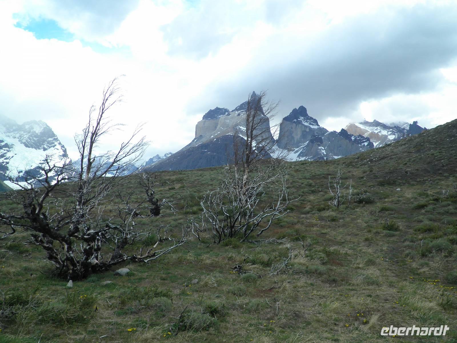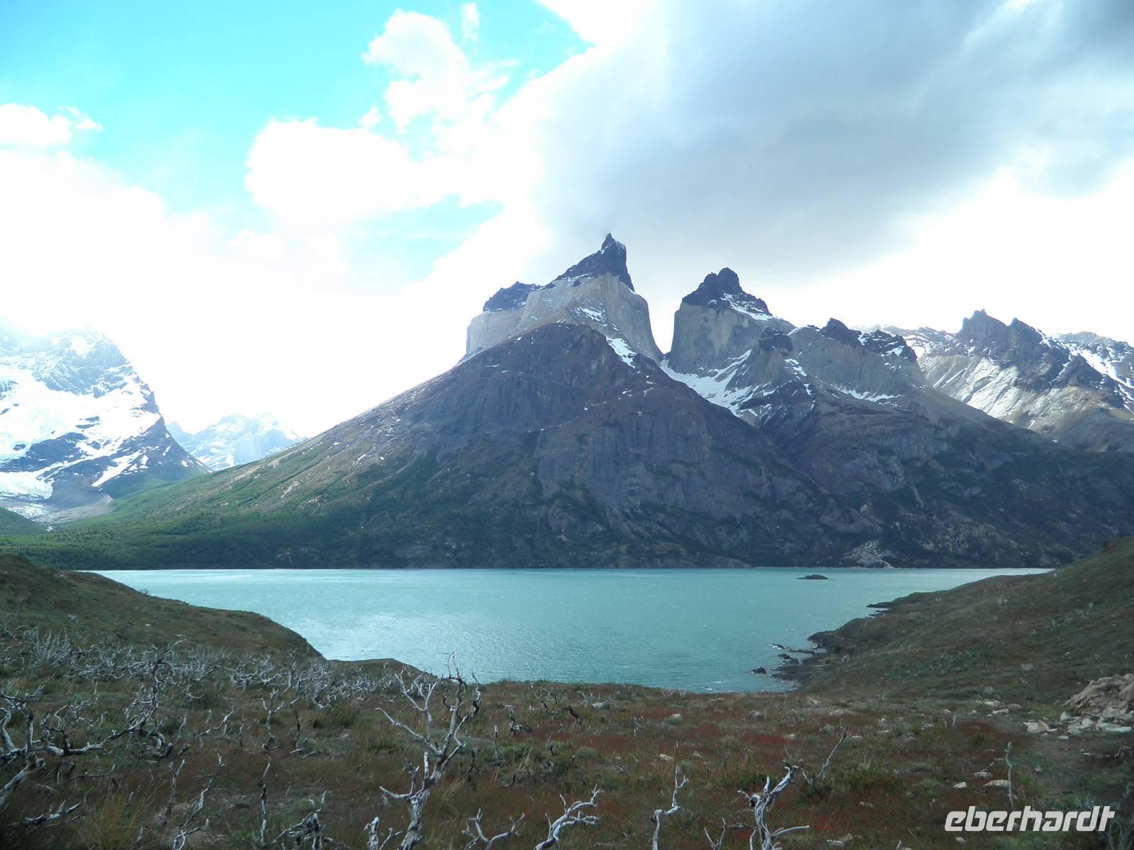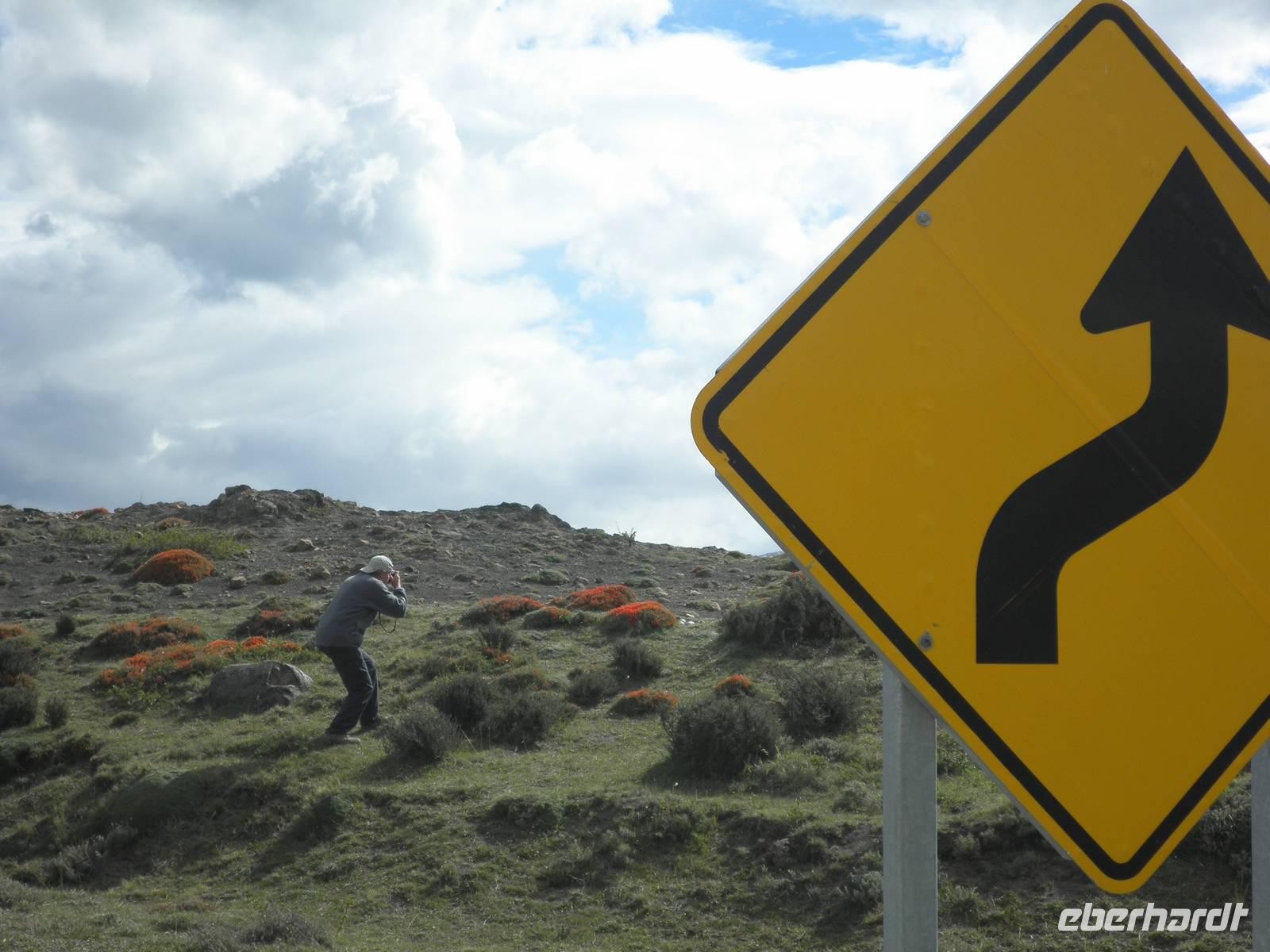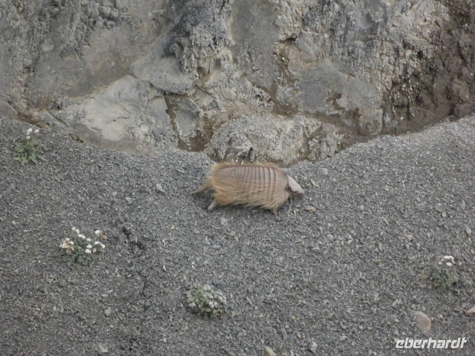 Zurück im Bus blieb uns gar nicht viel Zeit zum Verschnaufen, denn nach kurzer Fahrt stiegen wir wieder aus, um eine weitere Wanderung durch die herrliche Landschaft des Nationalparks zu unternehmen. Los ging es an den Cascades del Paine, imposante Wasserfälle, die es dort zu bestaunen gibt. Durch etwas gespenstisch anmutende Landschaft stiegen wir weiter hinauf, unser Ziel war ein Aussichtspunkt am Lago Pehoe, einem weiteren See im Nationalpark. Gespenstisch war es wegen eines furchtbaren Feuers, das sich vor zwei Jahren hier ereignet und viele viele Hektar Fläche niedergebrannt hatte. Die weiß-schwarzen verglühten Skelette der einstmals grünen Bäume bedeckten nahezu alles. Man konnte sich gut vorstellen, wie das Feuer gewütet haben musste. Unser Reiseleiter Eric erzählte uns, dass diese Bäume, Lengas, viele Jahrzehnte brauchen würden, um wieder zu wachsen und die Landschaft zu begrünen. Oben am Aussichtspunkt packten wir unsere Lunchpakete aus, die uns vom Hotel am Morgen mitgegeben worden waren. Wir verbrachten eine zugige Mittagspause, denn der Wind war auch hier oben unser Begleiter. Wir genossen den herrlichen Ausblick auf die Berge und ins Tal hinab, bevor wir unsere Wanderung zurück zum Bus begannen. Auf unserem Weg ins Hotel hielt unser Bus noch mehrere Male, denn es gab noch einiges zu fotografieren: eine schöne Sicht auf die Hörner del Torres, den Lago Amargo, ein abflussloser See, dessen Wasser wohl bitter schmeckt, denn das ist die Übersetzung von Amargo, rot blühende kleine Büsche und das Beste: sogar ein Gürteltier eilte neben unserem Bus am Wegesrand entlang und ließ sich von uns ablichten.