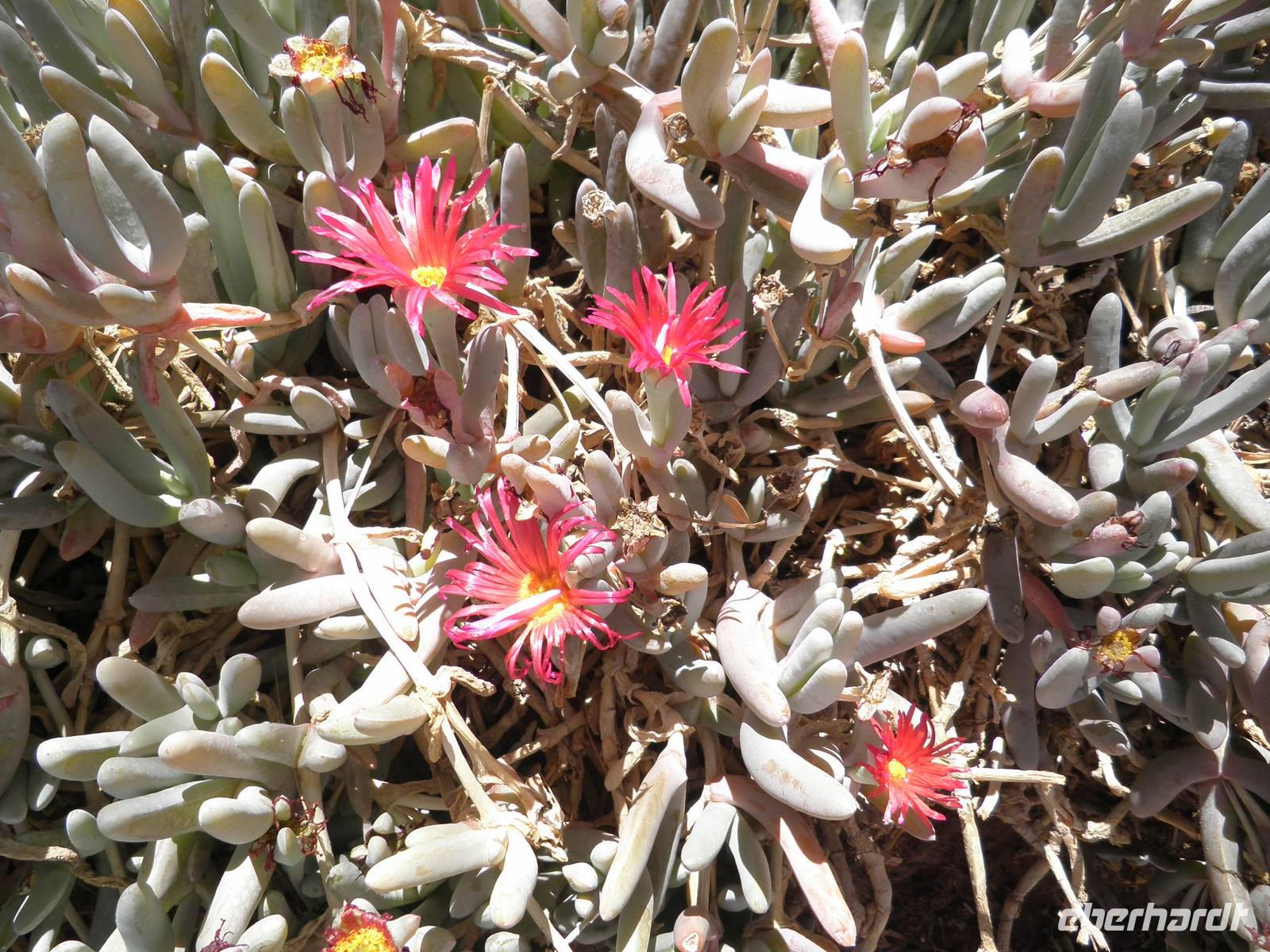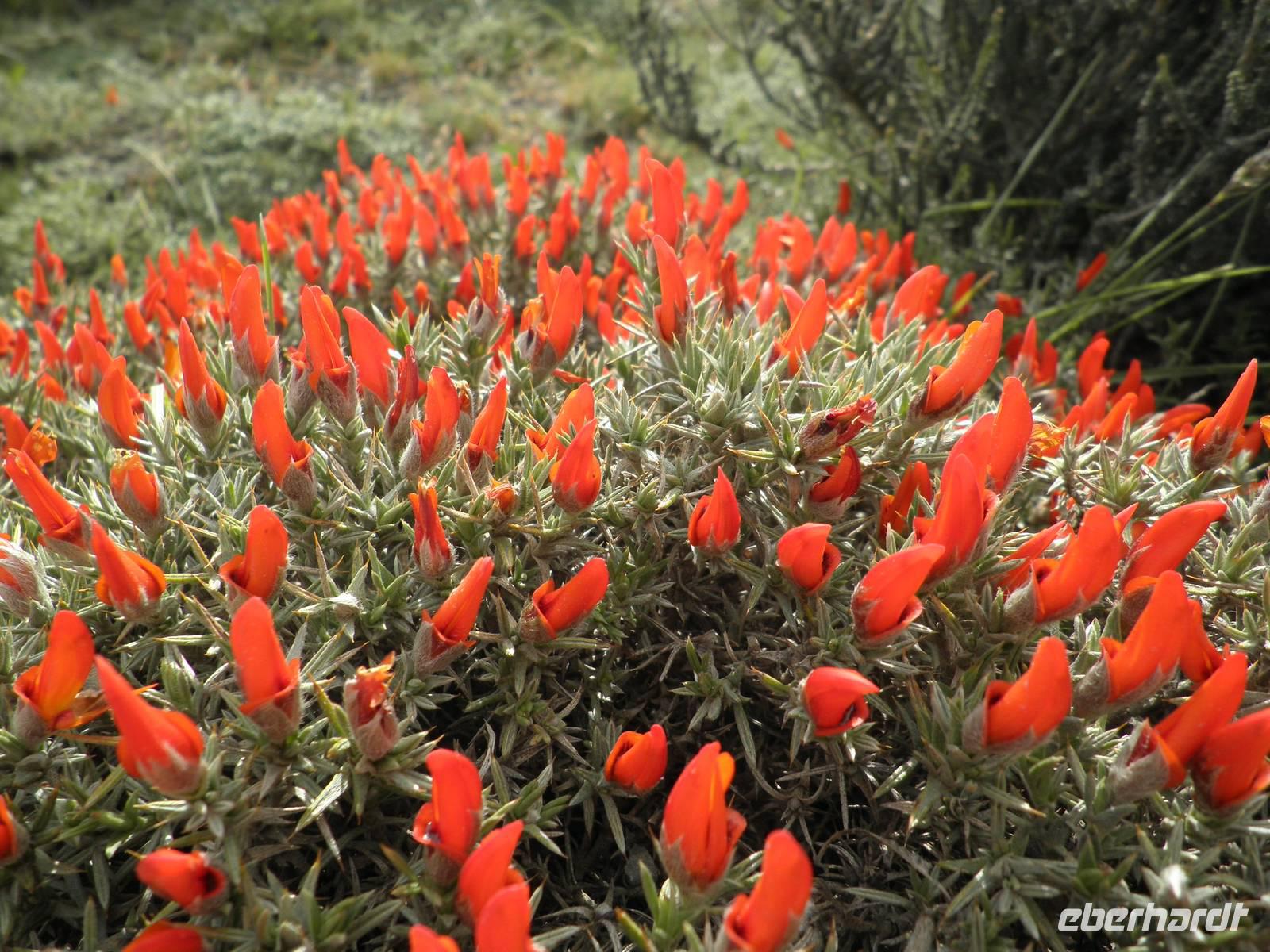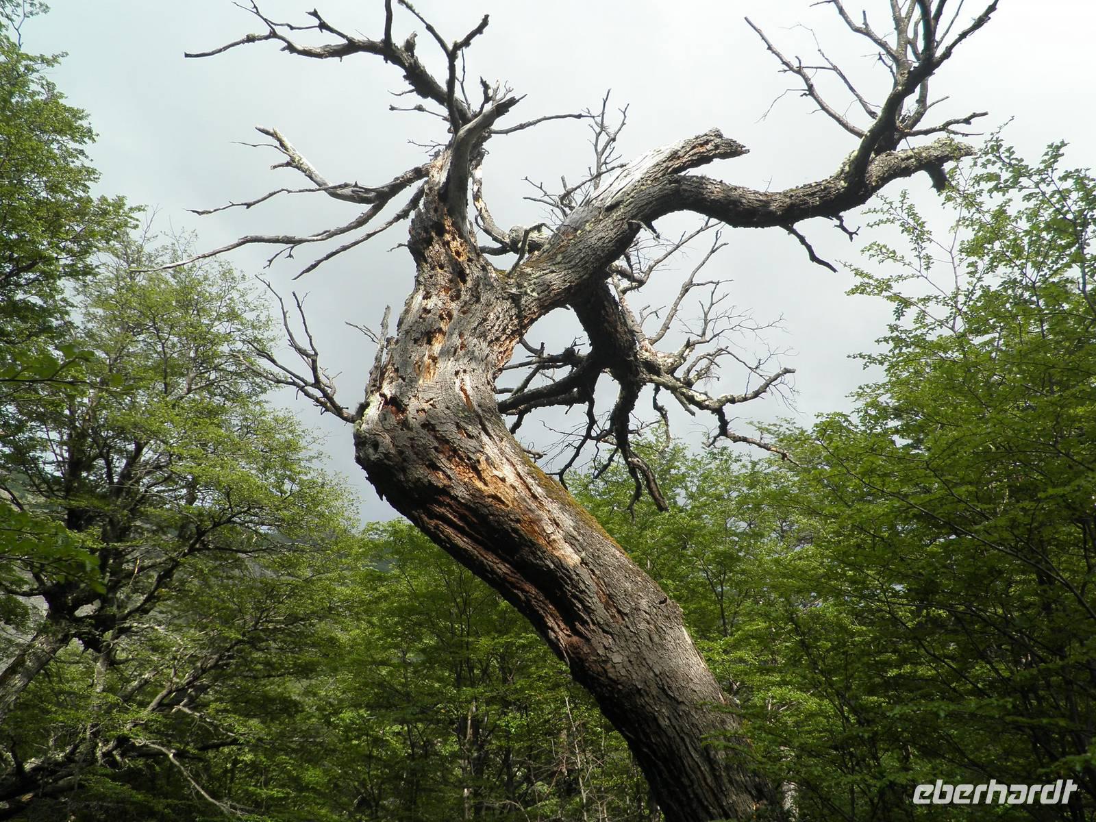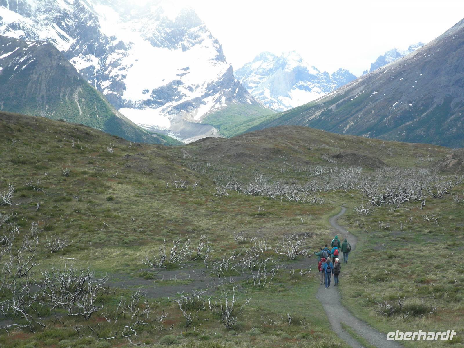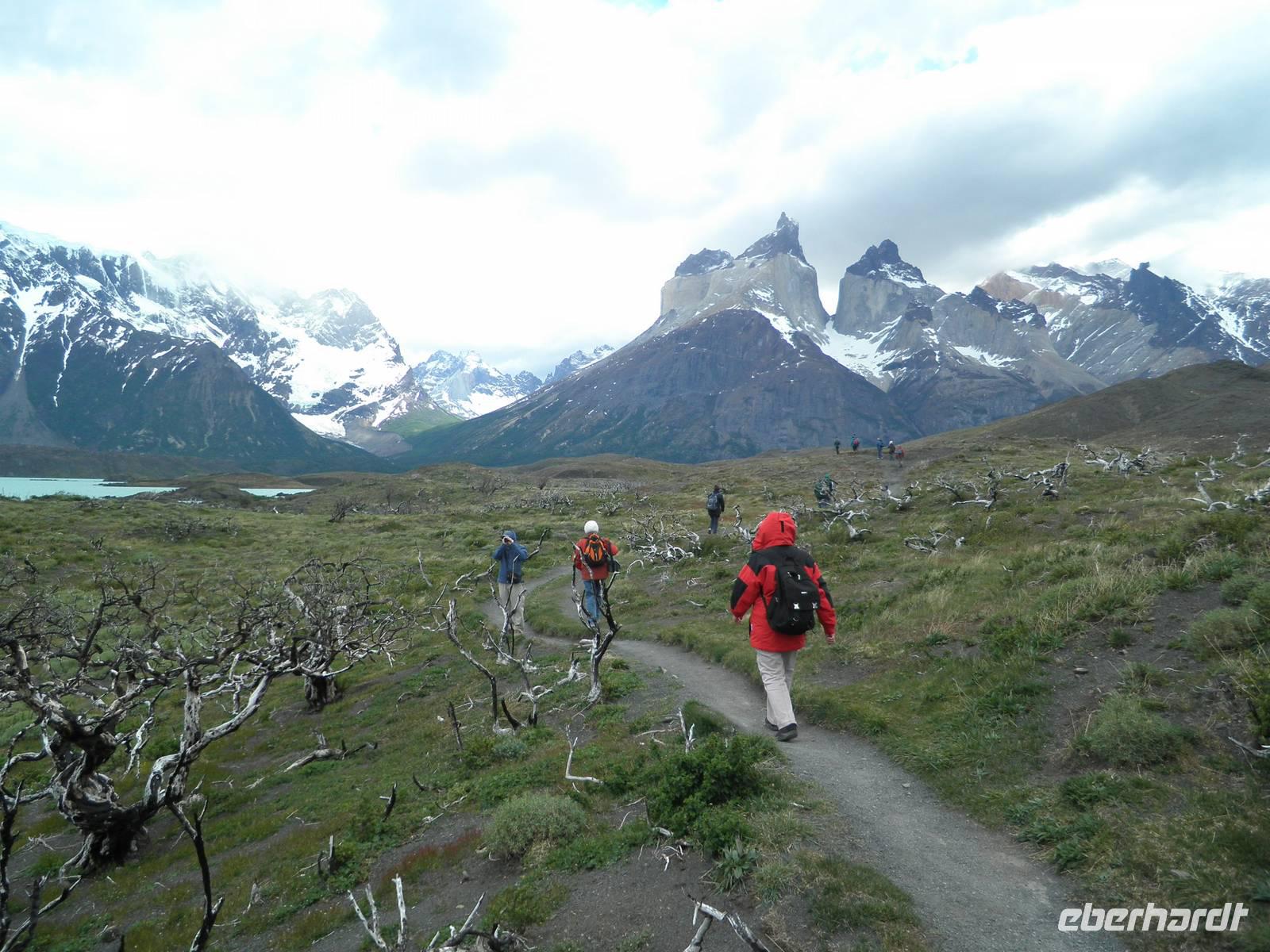 Zurück im Bus blieb uns gar nicht viel Zeit zum Verschnaufen, denn nach kurzer Fahrt stiegen wir wieder aus, um eine weitere Wanderung durch die herrliche Landschaft des Nationalparks zu unternehmen. Los ging es an den Cascades del Paine, imposante Wasserfälle, die es dort zu bestaunen gibt. Durch etwas gespenstisch anmutende Landschaft stiegen wir weiter hinauf, unser Ziel war ein Aussichtspunkt am Lago Pehoe, einem weiteren See im Nationalpark. Gespenstisch war es wegen eines furchtbaren Feuers, das sich vor zwei Jahren hier ereignet und viele viele Hektar Fläche niedergebrannt hatte. Die weiß-schwarzen verglühten Skelette der einstmals grünen Bäume bedeckten nahezu alles. Man konnte sich gut vorstellen, wie das Feuer gewütet haben musste. Unser Reiseleiter Eric erzählte uns, dass diese Bäume, Lengas, viele Jahrzehnte brauchen würden, um wieder zu wachsen und die Landschaft zu begrünen. Oben am Aussichtspunkt packten wir unsere Lunchpakete aus, die uns vom Hotel am Morgen mitgegeben worden waren. Wir verbrachten eine zugige Mittagspause, denn der Wind war auch hier oben unser Begleiter. Wir genossen den herrlichen Ausblick auf die Berge und ins Tal hinab, bevor wir unsere Wanderung zurück zum Bus begannen. Auf unserem Weg ins Hotel hielt unser Bus noch mehrere Male, denn es gab noch einiges zu fotografieren: eine schöne Sicht auf die Hörner del Torres, den Lago Amargo, ein abflussloser See, dessen Wasser wohl bitter schmeckt, denn das ist die Übersetzung von Amargo, rot blühende kleine Büsche und das Beste: sogar ein Gürteltier eilte neben unserem Bus am Wegesrand entlang und ließ sich von uns ablichten.