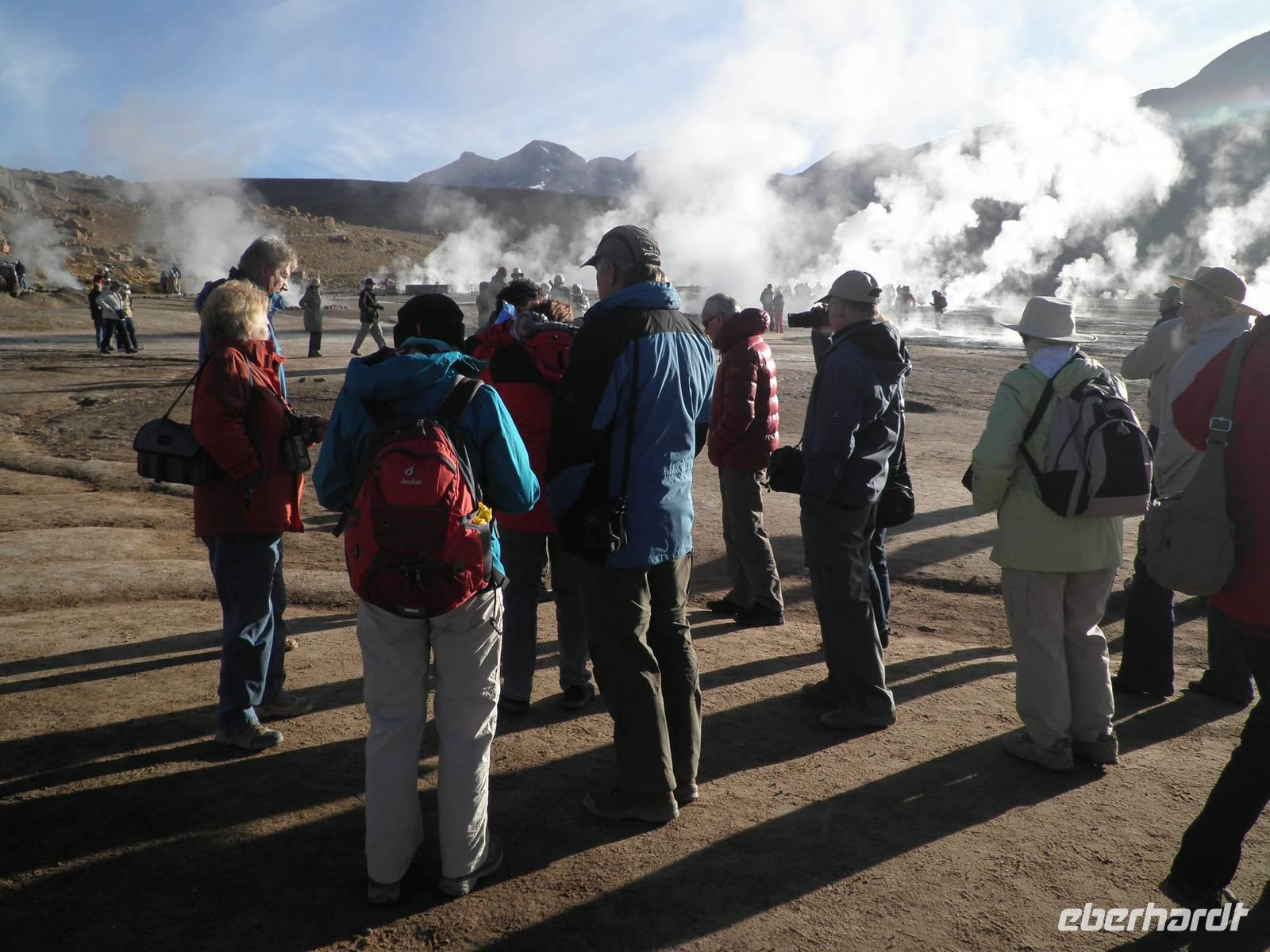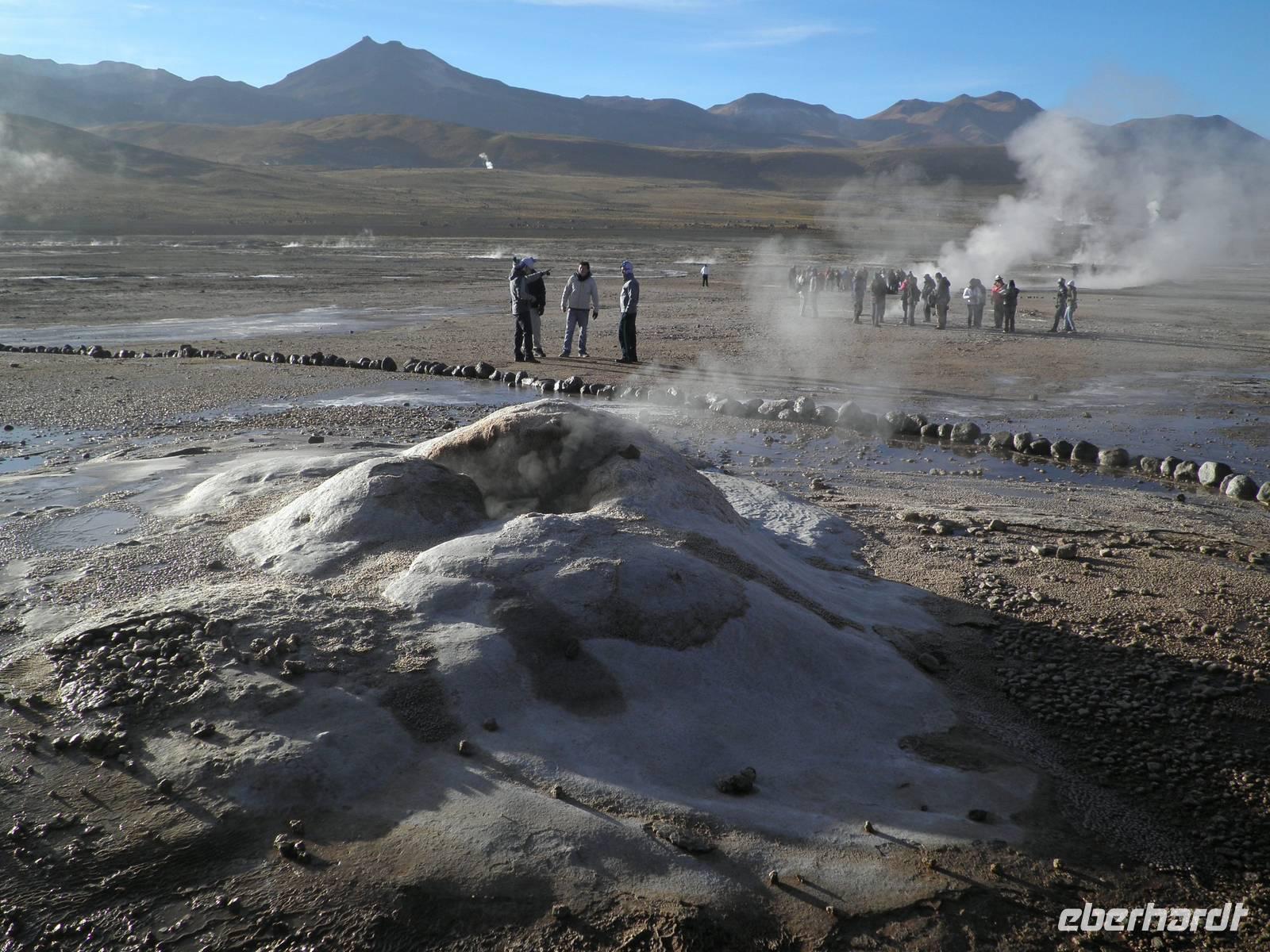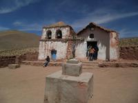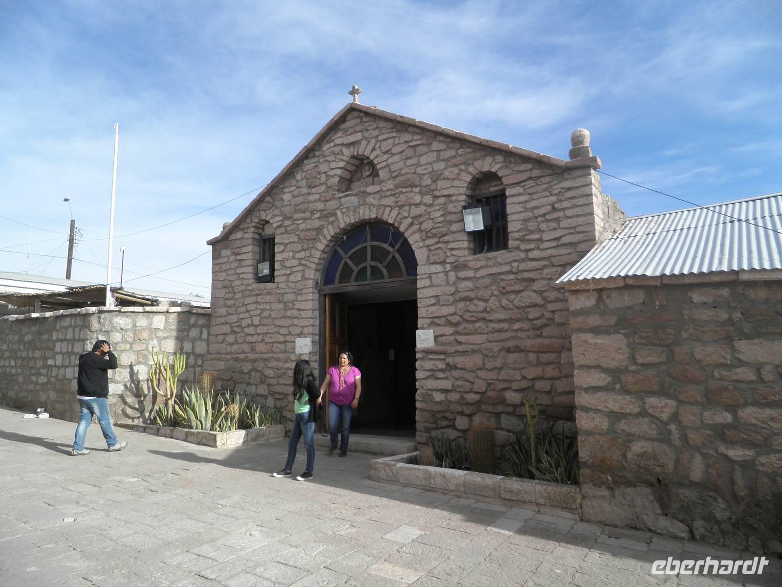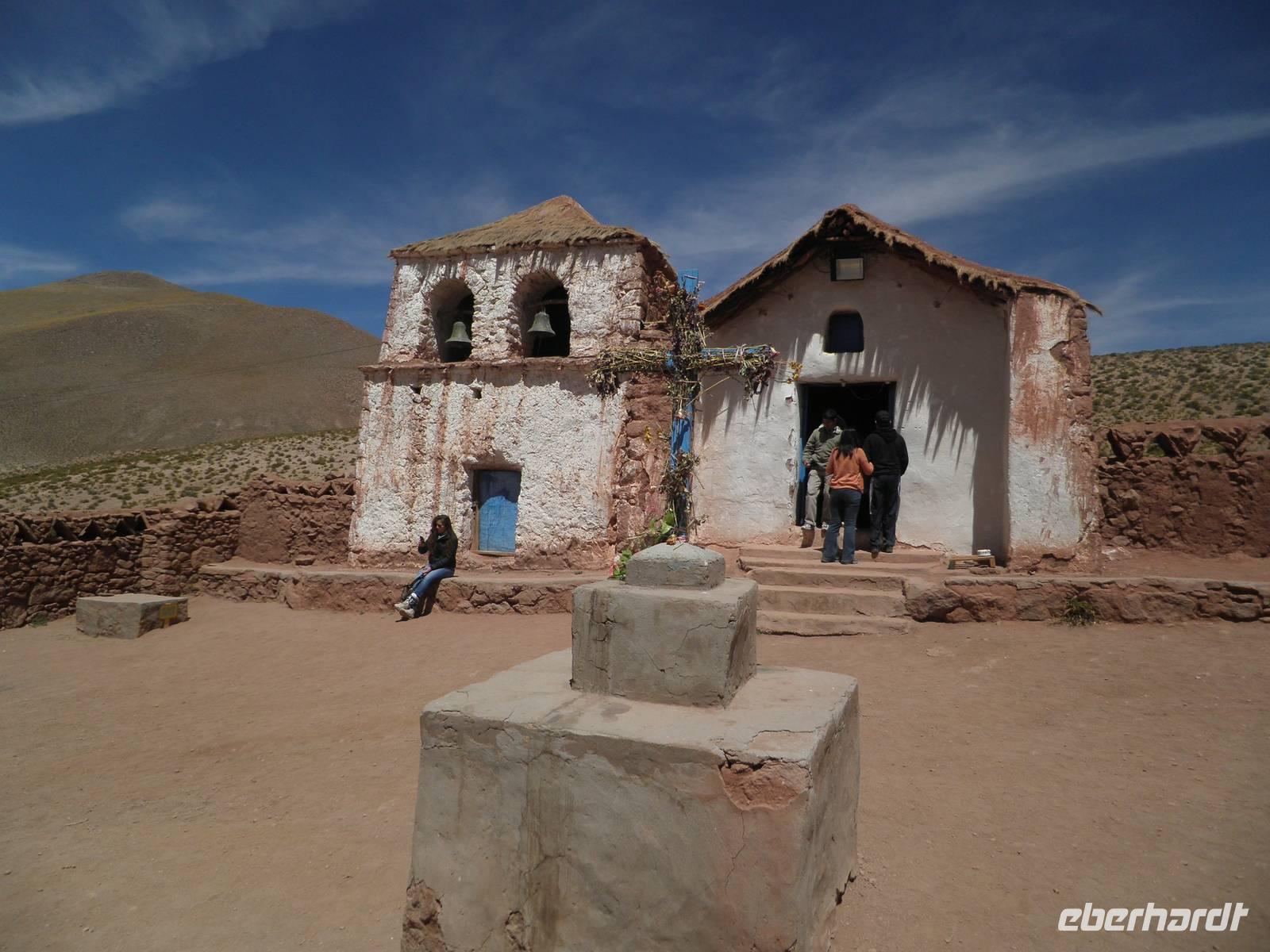 Heute klingelte unser Wecker schon 4:30 Uhr. Nach einem Kaffee oder Tee im Hotel starteten wir schon 5:30 Uhr. Unser früher Aufbruch hatte einen triftigen Grund: heute ging's hinauf über 4300 m zum Tatio, um dort im Morgengrauen die Geysire zu sehen. Zwei Stunden mussten wir fahren mit unserem kleinen blauen Bus. Anfangs war es noch stockdunkel, einmal hielten wir an, um nun doch das Kreuz des Südens am Himmel zu bestaunen. Dann ging die Fahrt weiter über Schotterstraßen, durch Wasserrinnsale, über reifbedeckte Wege. Nach zwei Stunden endlich hatten wir die Tatio-Geysire erreicht. Unser Reiseleiter Emilio erklärte uns die Entstehung der Geysire und dass sie früher viel höher in die Luft geschossen waren, aber durch geologische Untersuchungen waren Schichten verletzt worden, so dass die Geysire heute etwas gezähmter sind. Dennoch war es für uns ein beeindruckendes Schauspiel, die heißen Dämpfe und blubbernden Geysire zu bestaunen. Unser Busfahrer und Emilio bereiteten ein leckeres Frühstück für uns vor, dass wir uns dann vor der Kulisse des Tatio schmecken ließen. Sogar Eier hatte Emilio gekocht, wegen der Höhe allerdings mehr als 20 Minuten, denn hier siedet das Wasser schon bei 85 °C, so dass die Eier einfach länger brauchen, um fest zu werden. Nach unserem tollen Frühstück fuhren wir ein Stück mit dem Bus, nicht lange, denn ganz in der Nähe der Geysire gibt es ein Thermalbad, oder besser ein Becken im Freien, dass von einer heißen Quelle gespeist wird. Aus unserer Gruppe wollte so früh am Morgen noch niemand in das wärmende Nass steigen, aber wir genossen den Anblick der anderen Badenden oder gingen ein bisschen spazieren in der Umgebung, denn auch hier gibt es Geysire und anderes Interessantes zu entdecken. Der nächste Punkt am heutigen Tage sollten die Thermalbäder von Puritama sein. Aber unser Weg führte uns nicht sofort dahin. Unterwegs hielten wir hin und wieder an, um Tiere zu beobachten und Fotos zu machen. Wir sahen Vicuñas, die kleinsten kamelartigen Tiere hier in der Atacama. An einem Steilhang beobachteten wir minutenlang Steine und Vegetation, um die Hochandenmaus Vizcacha zu entdecken, die dort leben soll. Einige von uns erhaschten einen kurzen Blick auf eines dieser kleinen Tierchen, die von Weitem wie graugrüne Eichhörnchen, aus der Nähe aber wie Kaninchen aussehen, und doch sind es Mäuse. In Machuca - einem Hochandendorf - legten wir wieder einen Halt ein. Wir spazierten durch den kleinen Ort, in dem typisches Essen und Souvenirs aus den Anden angeboten werden. Hoch über den kleinen Häuschen steht die alte Dorfkirche, die wir besichtigen konnten.