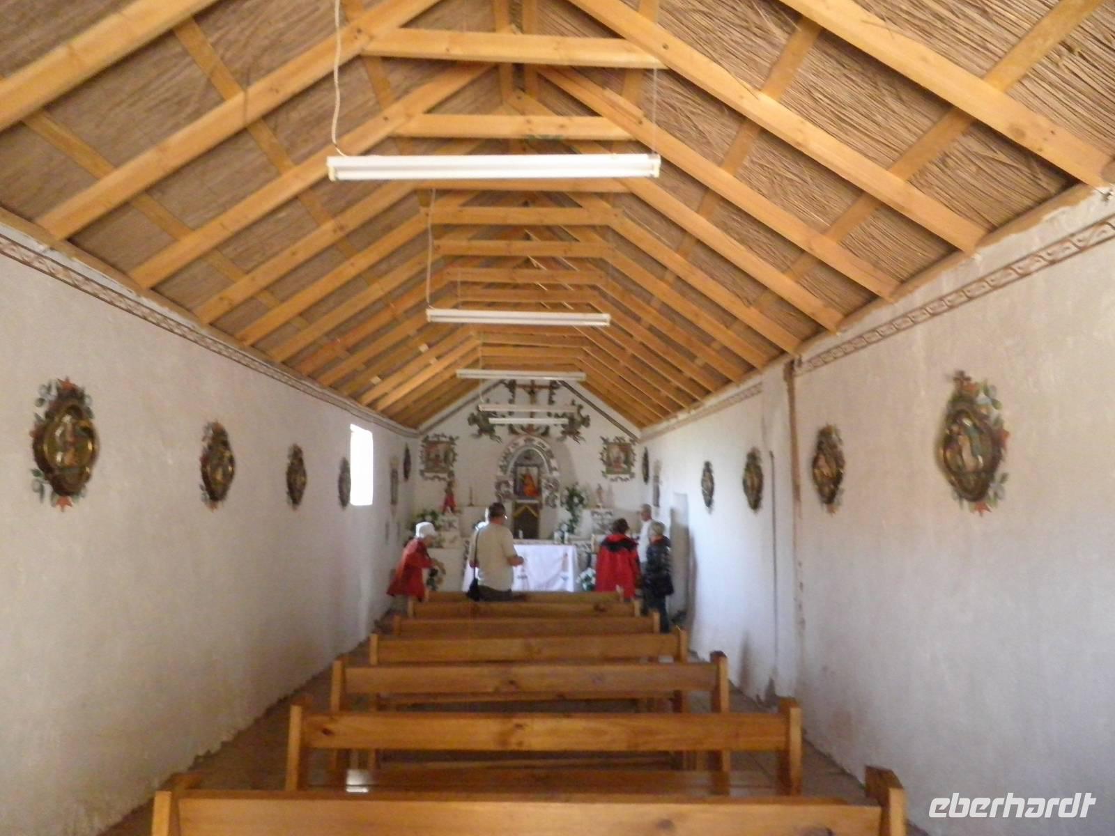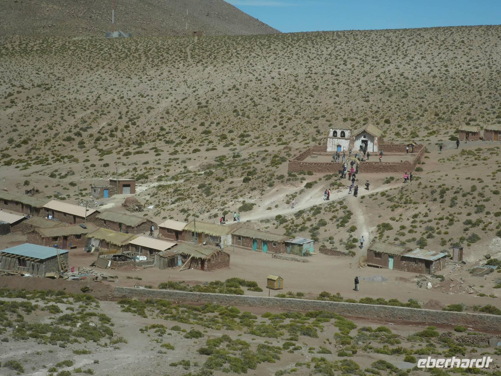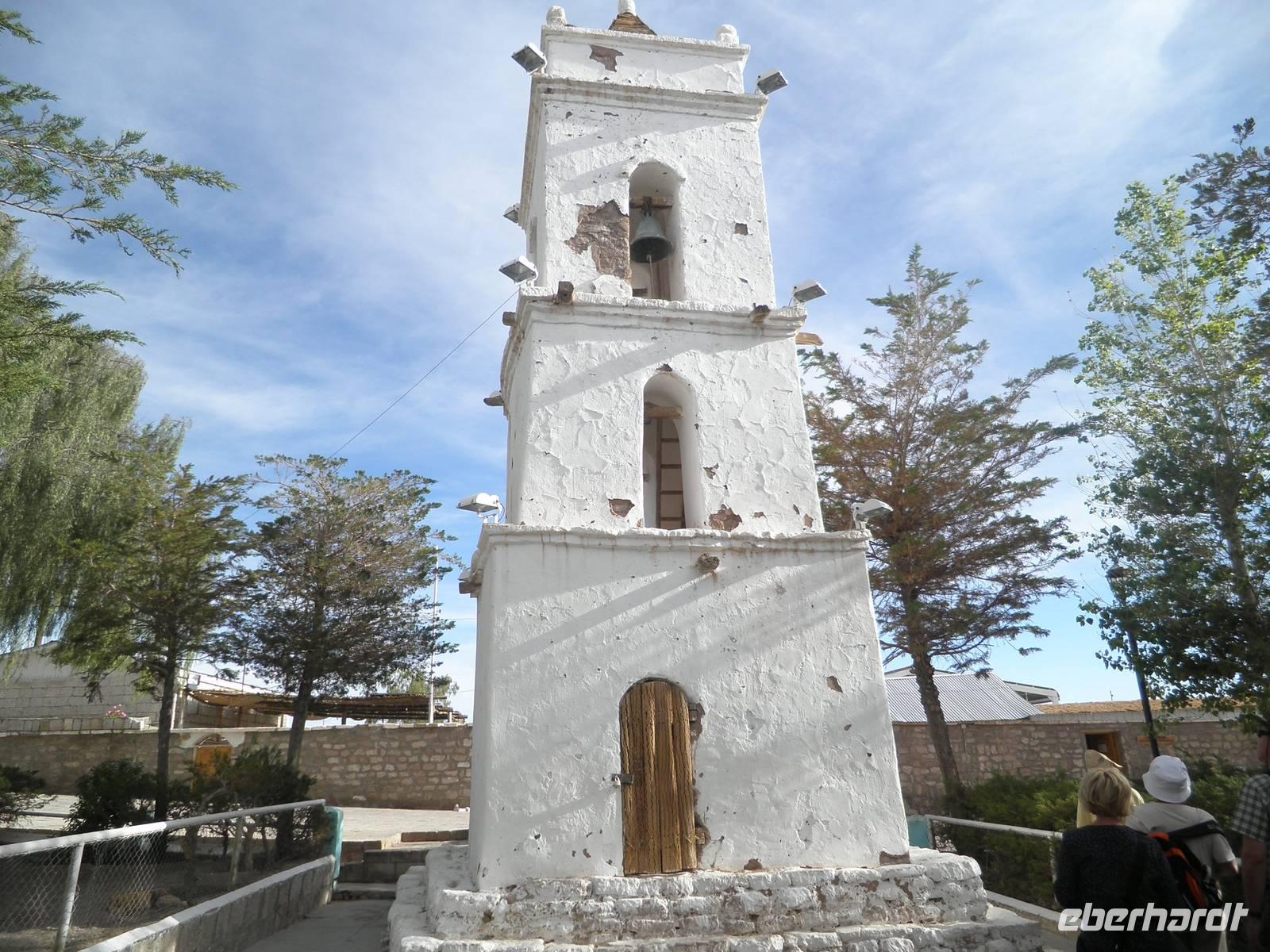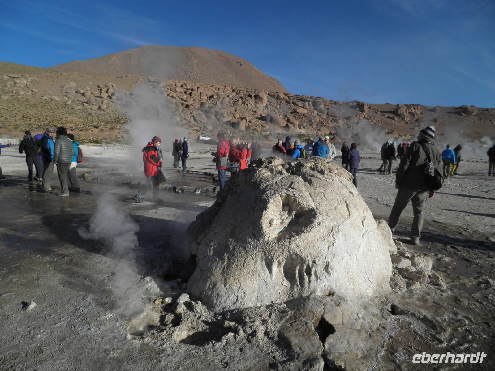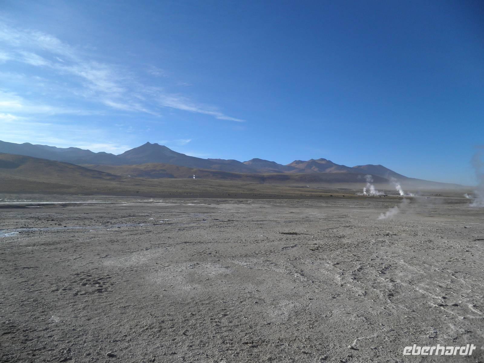 Heute klingelte unser Wecker schon 4:30 Uhr. Nach einem Kaffee oder Tee im Hotel starteten wir schon 5:30 Uhr. Unser früher Aufbruch hatte einen triftigen Grund: heute ging's hinauf über 4300 m zum Tatio, um dort im Morgengrauen die Geysire zu sehen. Zwei Stunden mussten wir fahren mit unserem kleinen blauen Bus. Anfangs war es noch stockdunkel, einmal hielten wir an, um nun doch das Kreuz des Südens am Himmel zu bestaunen. Dann ging die Fahrt weiter über Schotterstraßen, durch Wasserrinnsale, über reifbedeckte Wege. Nach zwei Stunden endlich hatten wir die Tatio-Geysire erreicht. Unser Reiseleiter Emilio erklärte uns die Entstehung der Geysire und dass sie früher viel höher in die Luft geschossen waren, aber durch geologische Untersuchungen waren Schichten verletzt worden, so dass die Geysire heute etwas gezähmter sind. Dennoch war es für uns ein beeindruckendes Schauspiel, die heißen Dämpfe und blubbernden Geysire zu bestaunen. Unser Busfahrer und Emilio bereiteten ein leckeres Frühstück für uns vor, dass wir uns dann vor der Kulisse des Tatio schmecken ließen. Sogar Eier hatte Emilio gekocht, wegen der Höhe allerdings mehr als 20 Minuten, denn hier siedet das Wasser schon bei 85 °C, so dass die Eier einfach länger brauchen, um fest zu werden. Nach unserem tollen Frühstück fuhren wir ein Stück mit dem Bus, nicht lange, denn ganz in der Nähe der Geysire gibt es ein Thermalbad, oder besser ein Becken im Freien, dass von einer heißen Quelle gespeist wird. Aus unserer Gruppe wollte so früh am Morgen noch niemand in das wärmende Nass steigen, aber wir genossen den Anblick der anderen Badenden oder gingen ein bisschen spazieren in der Umgebung, denn auch hier gibt es Geysire und anderes Interessantes zu entdecken. Der nächste Punkt am heutigen Tage sollten die Thermalbäder von Puritama sein. Aber unser Weg führte uns nicht sofort dahin. Unterwegs hielten wir hin und wieder an, um Tiere zu beobachten und Fotos zu machen. Wir sahen Vicuñas, die kleinsten kamelartigen Tiere hier in der Atacama. An einem Steilhang beobachteten wir minutenlang Steine und Vegetation, um die Hochandenmaus Vizcacha zu entdecken, die dort leben soll. Einige von uns erhaschten einen kurzen Blick auf eines dieser kleinen Tierchen, die von Weitem wie graugrüne Eichhörnchen, aus der Nähe aber wie Kaninchen aussehen, und doch sind es Mäuse. In Machuca - einem Hochandendorf - legten wir wieder einen Halt ein. Wir spazierten durch den kleinen Ort, in dem typisches Essen und Souvenirs aus den Anden angeboten werden. Hoch über den kleinen Häuschen steht die alte Dorfkirche, die wir besichtigen konnten.