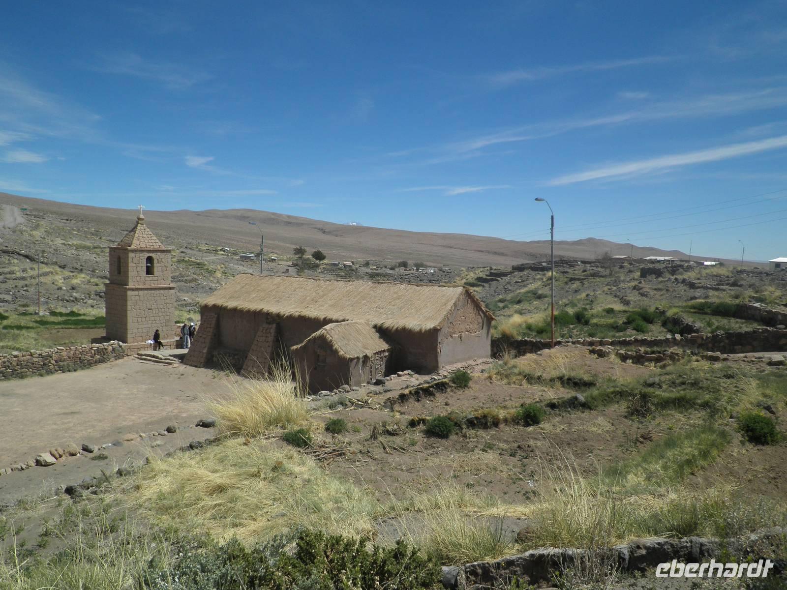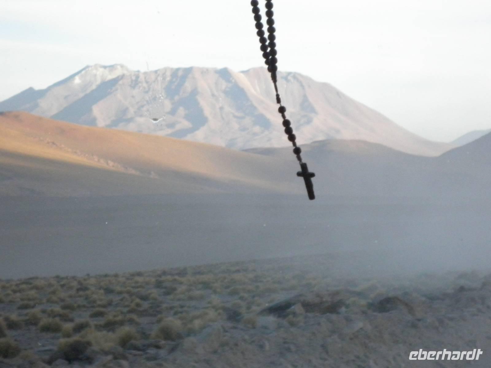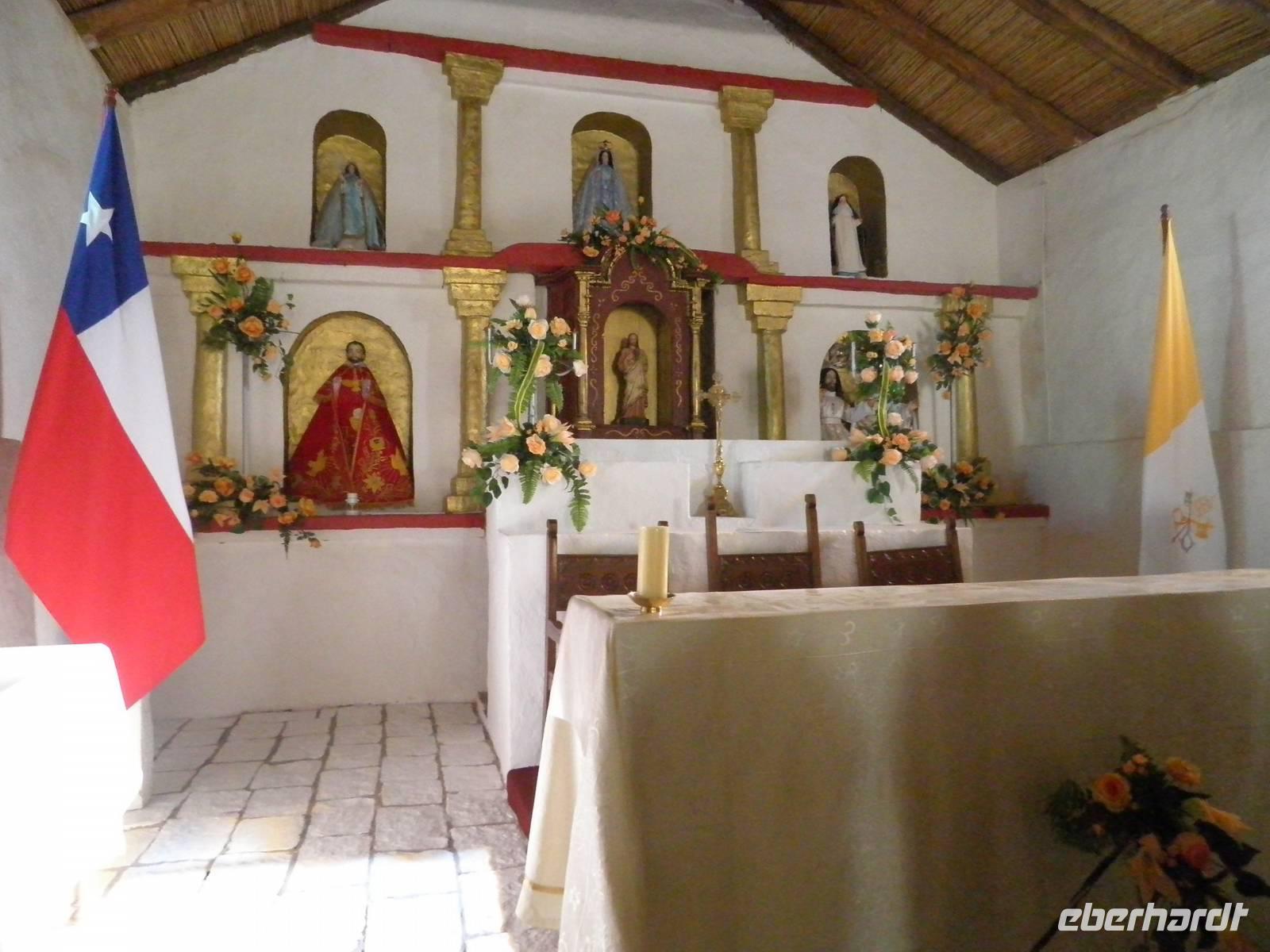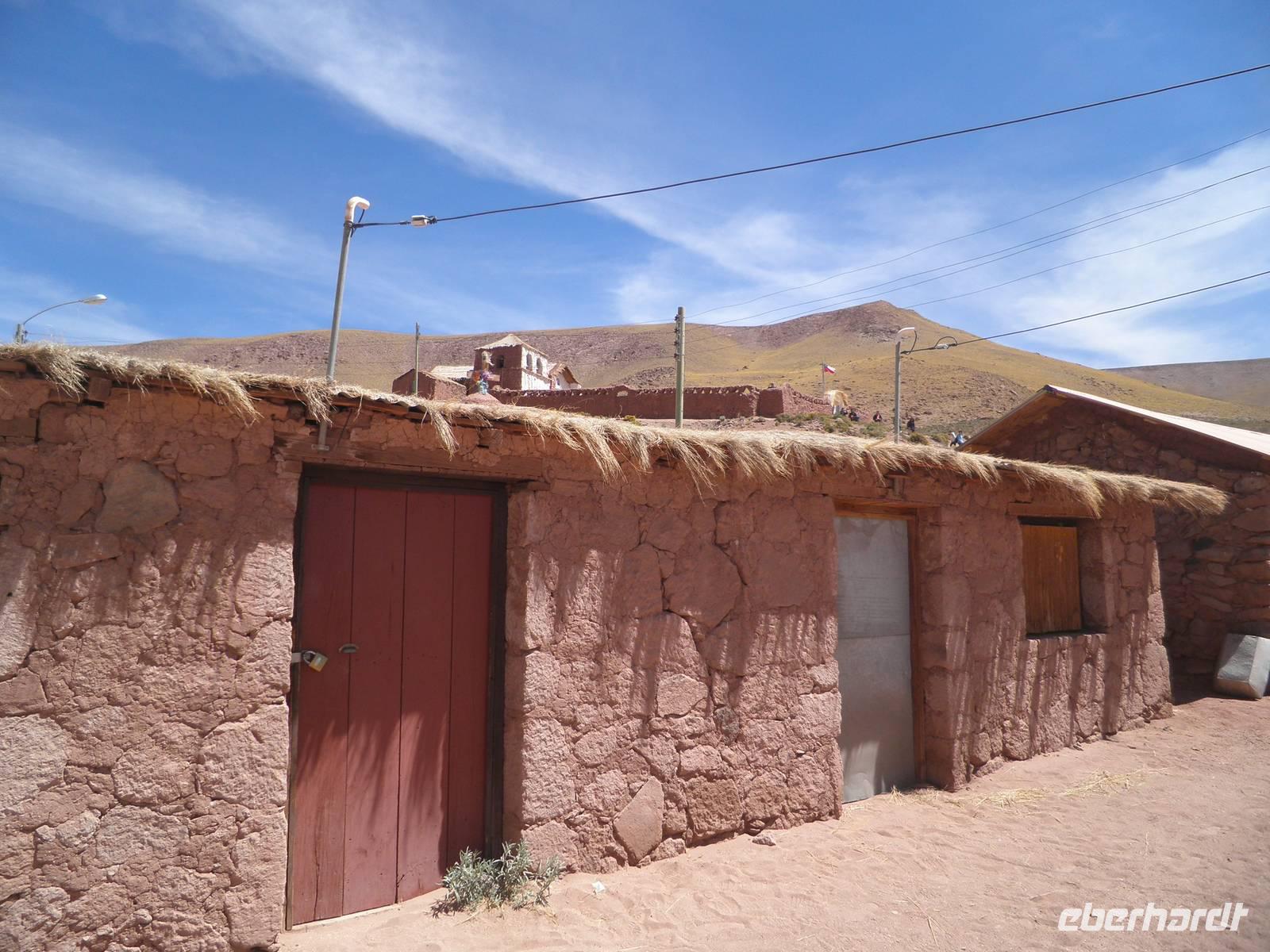 Heute klingelte unser Wecker schon 4:30 Uhr. Nach einem Kaffee oder Tee im Hotel starteten wir schon 5:30 Uhr. Unser früher Aufbruch hatte einen triftigen Grund: heute ging's hinauf über 4300 m zum Tatio, um dort im Morgengrauen die Geysire zu sehen. Zwei Stunden mussten wir fahren mit unserem kleinen blauen Bus. Anfangs war es noch stockdunkel, einmal hielten wir an, um nun doch das Kreuz des Südens am Himmel zu bestaunen. Dann ging die Fahrt weiter über Schotterstraßen, durch Wasserrinnsale, über reifbedeckte Wege. Nach zwei Stunden endlich hatten wir die Tatio-Geysire erreicht. Unser Reiseleiter Emilio erklärte uns die Entstehung der Geysire und dass sie früher viel höher in die Luft geschossen waren, aber durch geologische Untersuchungen waren Schichten verletzt worden, so dass die Geysire heute etwas gezähmter sind. Dennoch war es für uns ein beeindruckendes Schauspiel, die heißen Dämpfe und blubbernden Geysire zu bestaunen. Unser Busfahrer und Emilio bereiteten ein leckeres Frühstück für uns vor, dass wir uns dann vor der Kulisse des Tatio schmecken ließen. Sogar Eier hatte Emilio gekocht, wegen der Höhe allerdings mehr als 20 Minuten, denn hier siedet das Wasser schon bei 85 °C, so dass die Eier einfach länger brauchen, um fest zu werden. Nach unserem tollen Frühstück fuhren wir ein Stück mit dem Bus, nicht lange, denn ganz in der Nähe der Geysire gibt es ein Thermalbad, oder besser ein Becken im Freien, dass von einer heißen Quelle gespeist wird. Aus unserer Gruppe wollte so früh am Morgen noch niemand in das wärmende Nass steigen, aber wir genossen den Anblick der anderen Badenden oder gingen ein bisschen spazieren in der Umgebung, denn auch hier gibt es Geysire und anderes Interessantes zu entdecken. Der nächste Punkt am heutigen Tage sollten die Thermalbäder von Puritama sein. Aber unser Weg führte uns nicht sofort dahin. Unterwegs hielten wir hin und wieder an, um Tiere zu beobachten und Fotos zu machen. Wir sahen Vicuñas, die kleinsten kamelartigen Tiere hier in der Atacama. An einem Steilhang beobachteten wir minutenlang Steine und Vegetation, um die Hochandenmaus Vizcacha zu entdecken, die dort leben soll. Einige von uns erhaschten einen kurzen Blick auf eines dieser kleinen Tierchen, die von Weitem wie graugrüne Eichhörnchen, aus der Nähe aber wie Kaninchen aussehen, und doch sind es Mäuse. In Machuca - einem Hochandendorf - legten wir wieder einen Halt ein. Wir spazierten durch den kleinen Ort, in dem typisches Essen und Souvenirs aus den Anden angeboten werden. Hoch über den kleinen Häuschen steht die alte Dorfkirche, die wir besichtigen konnten.