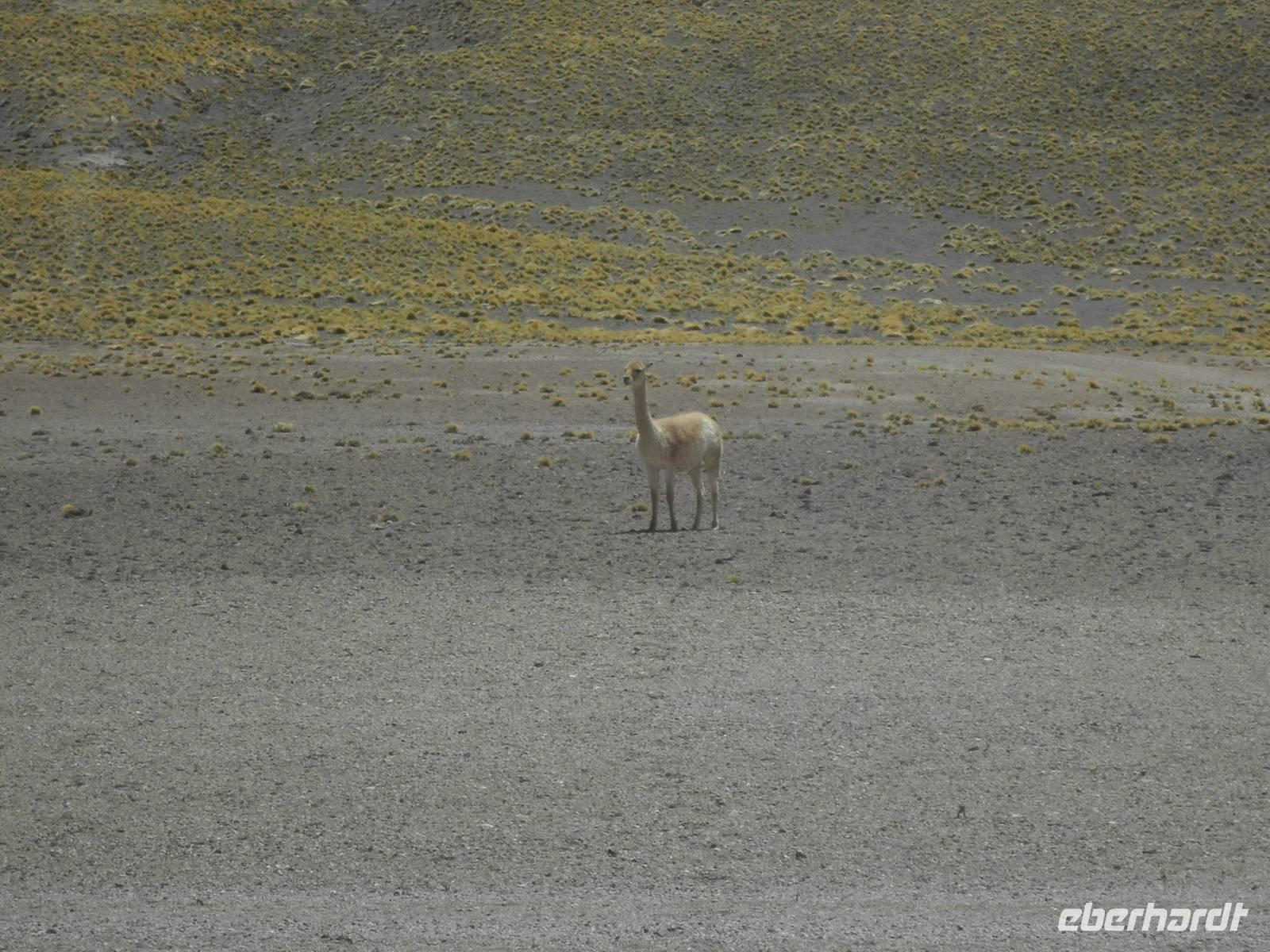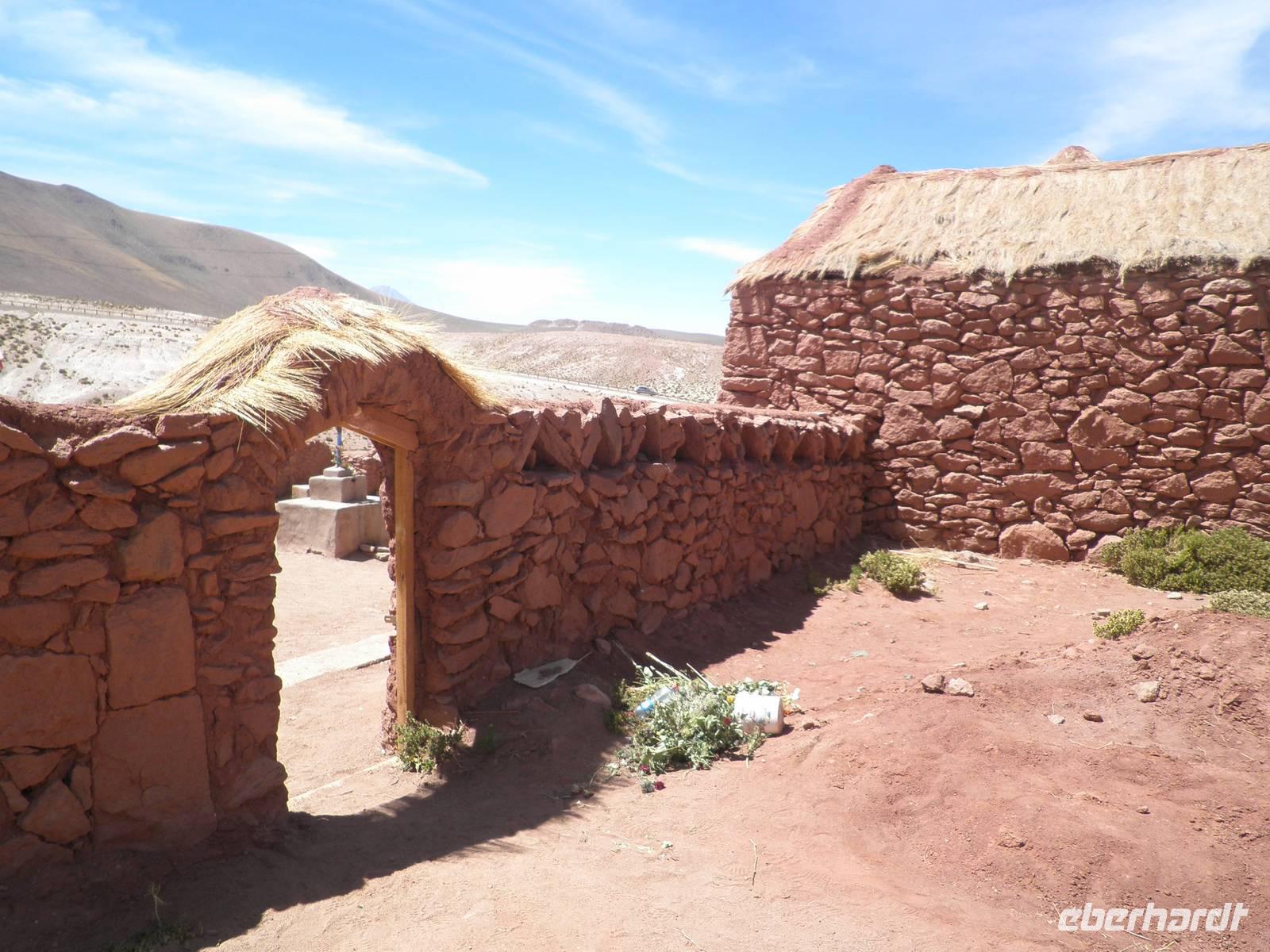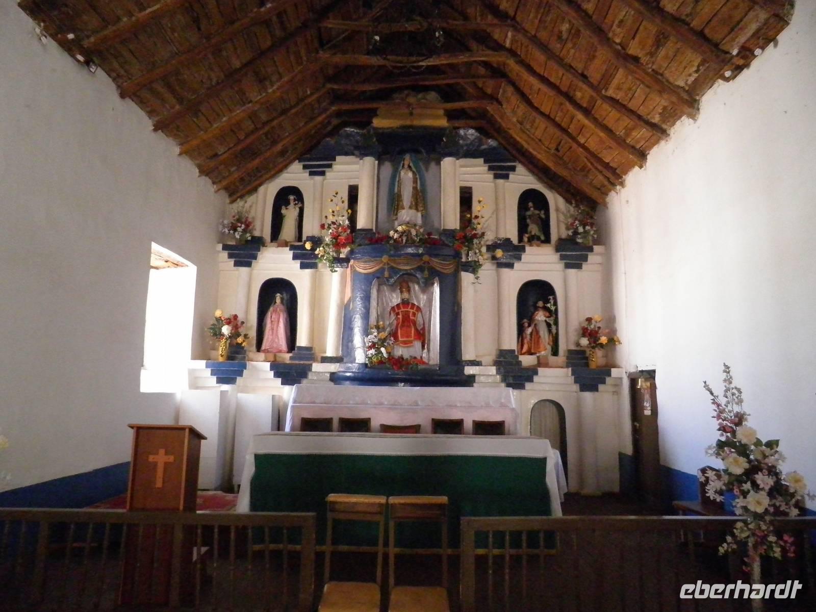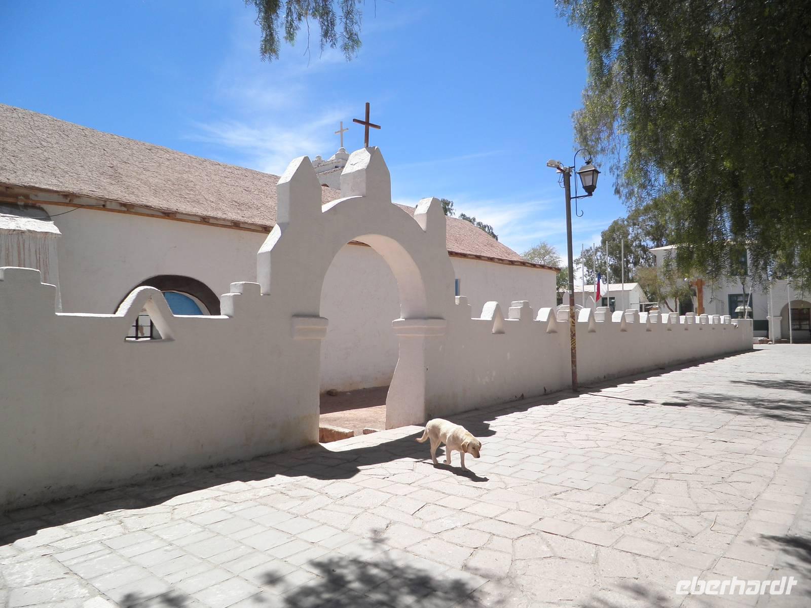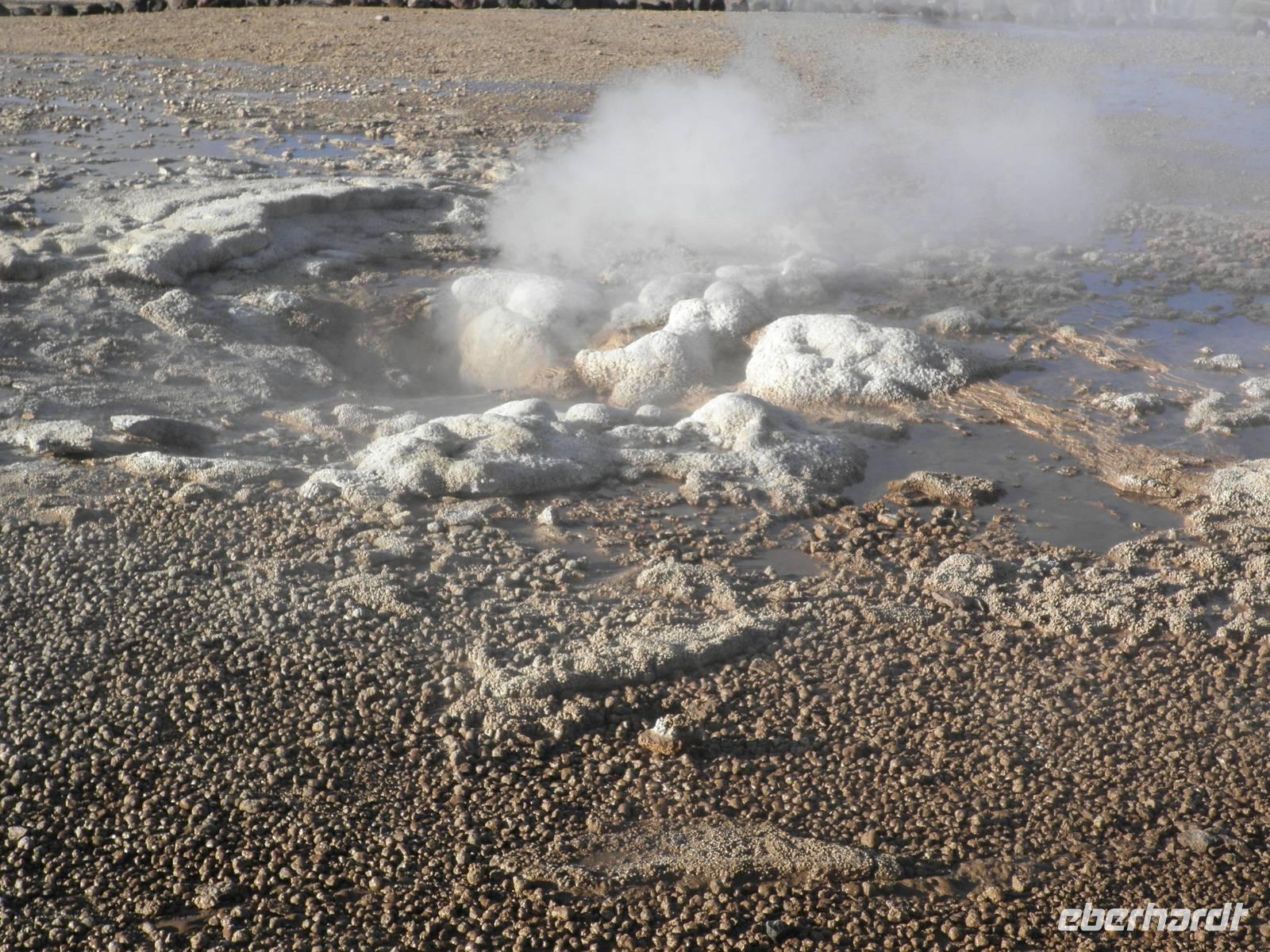 Heute klingelte unser Wecker schon 4:30 Uhr. Nach einem Kaffee oder Tee im Hotel starteten wir schon 5:30 Uhr. Unser früher Aufbruch hatte einen triftigen Grund: heute ging's hinauf über 4300 m zum Tatio, um dort im Morgengrauen die Geysire zu sehen. Zwei Stunden mussten wir fahren mit unserem kleinen blauen Bus. Anfangs war es noch stockdunkel, einmal hielten wir an, um nun doch das Kreuz des Südens am Himmel zu bestaunen. Dann ging die Fahrt weiter über Schotterstraßen, durch Wasserrinnsale, über reifbedeckte Wege. Nach zwei Stunden endlich hatten wir die Tatio-Geysire erreicht. Unser Reiseleiter Emilio erklärte uns die Entstehung der Geysire und dass sie früher viel höher in die Luft geschossen waren, aber durch geologische Untersuchungen waren Schichten verletzt worden, so dass die Geysire heute etwas gezähmter sind. Dennoch war es für uns ein beeindruckendes Schauspiel, die heißen Dämpfe und blubbernden Geysire zu bestaunen. Unser Busfahrer und Emilio bereiteten ein leckeres Frühstück für uns vor, dass wir uns dann vor der Kulisse des Tatio schmecken ließen. Sogar Eier hatte Emilio gekocht, wegen der Höhe allerdings mehr als 20 Minuten, denn hier siedet das Wasser schon bei 85 °C, so dass die Eier einfach länger brauchen, um fest zu werden. Nach unserem tollen Frühstück fuhren wir ein Stück mit dem Bus, nicht lange, denn ganz in der Nähe der Geysire gibt es ein Thermalbad, oder besser ein Becken im Freien, dass von einer heißen Quelle gespeist wird. Aus unserer Gruppe wollte so früh am Morgen noch niemand in das wärmende Nass steigen, aber wir genossen den Anblick der anderen Badenden oder gingen ein bisschen spazieren in der Umgebung, denn auch hier gibt es Geysire und anderes Interessantes zu entdecken. Der nächste Punkt am heutigen Tage sollten die Thermalbäder von Puritama sein. Aber unser Weg führte uns nicht sofort dahin. Unterwegs hielten wir hin und wieder an, um Tiere zu beobachten und Fotos zu machen. Wir sahen Vicuñas, die kleinsten kamelartigen Tiere hier in der Atacama. An einem Steilhang beobachteten wir minutenlang Steine und Vegetation, um die Hochandenmaus Vizcacha zu entdecken, die dort leben soll. Einige von uns erhaschten einen kurzen Blick auf eines dieser kleinen Tierchen, die von Weitem wie graugrüne Eichhörnchen, aus der Nähe aber wie Kaninchen aussehen, und doch sind es Mäuse. In Machuca - einem Hochandendorf - legten wir wieder einen Halt ein. Wir spazierten durch den kleinen Ort, in dem typisches Essen und Souvenirs aus den Anden angeboten werden. Hoch über den kleinen Häuschen steht die alte Dorfkirche, die wir besichtigen konnten.