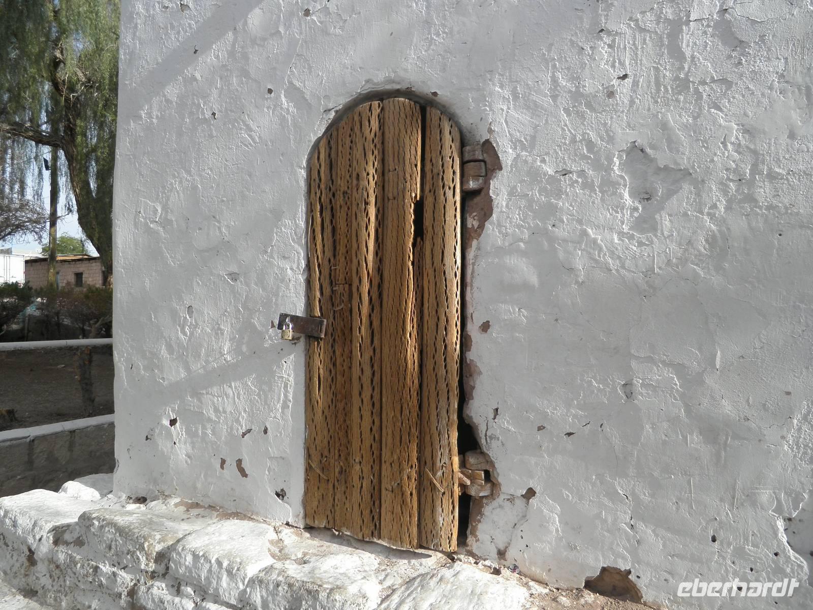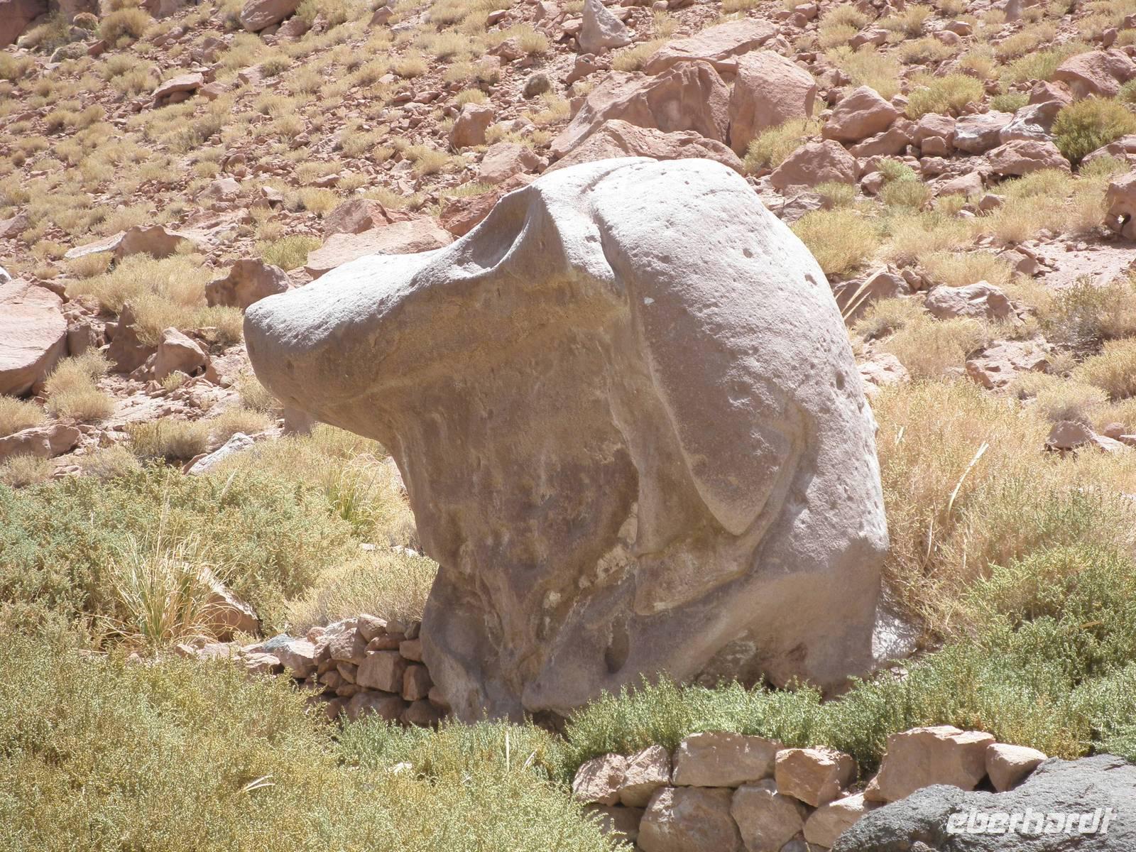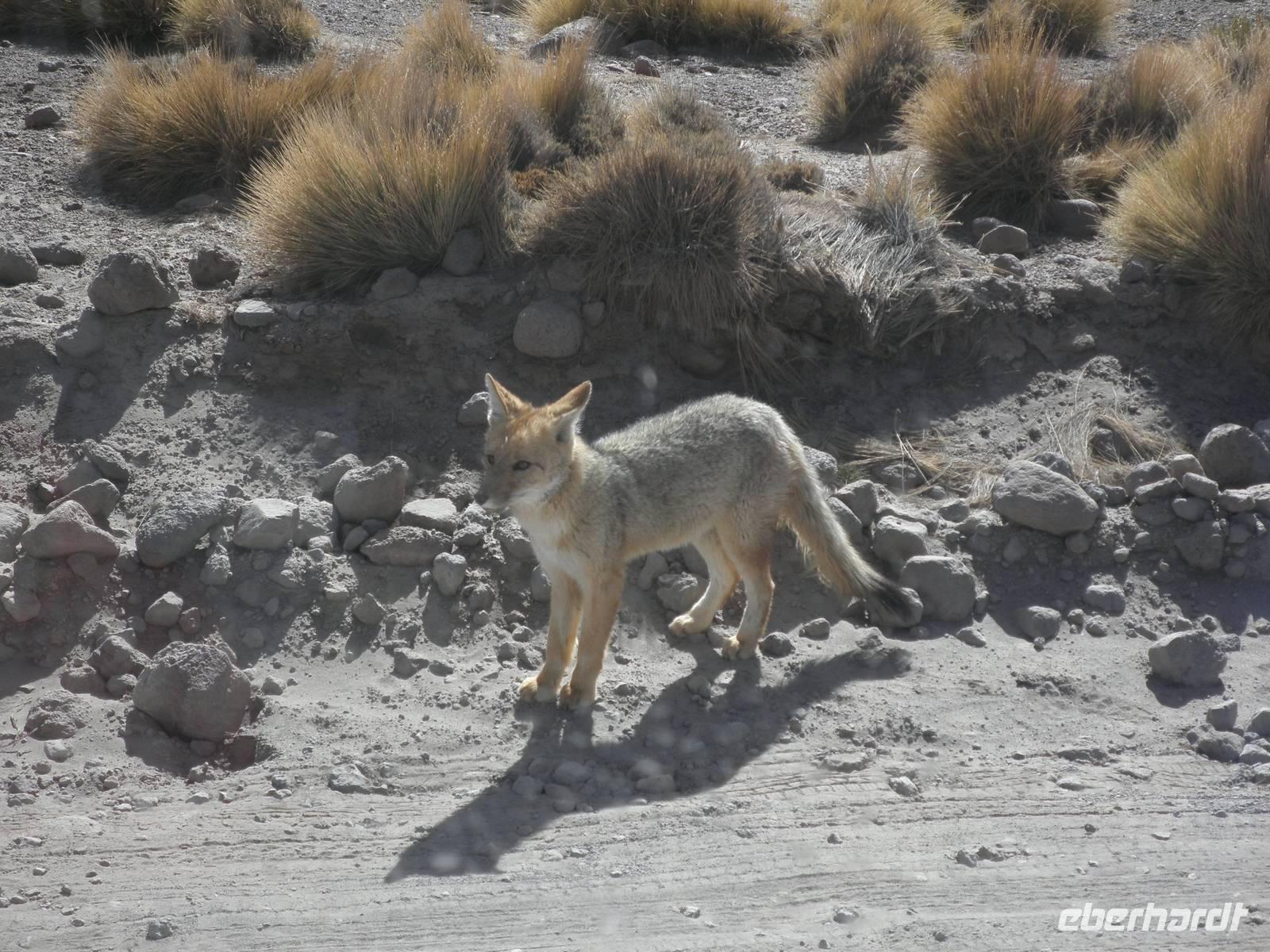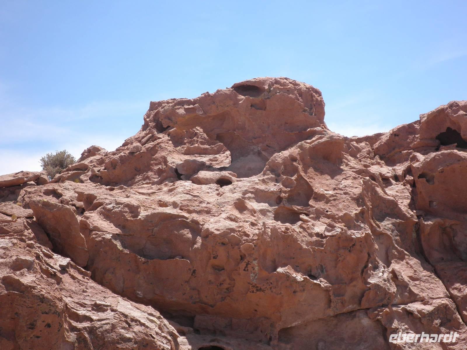 Heute klingelte unser Wecker schon 4:30 Uhr. Nach einem Kaffee oder Tee im Hotel starteten wir schon 5:30 Uhr. Unser früher Aufbruch hatte einen triftigen Grund: heute ging's hinauf über 4300 m zum Tatio, um dort im Morgengrauen die Geysire zu sehen. Zwei Stunden mussten wir fahren mit unserem kleinen blauen Bus. Anfangs war es noch stockdunkel, einmal hielten wir an, um nun doch das Kreuz des Südens am Himmel zu bestaunen. Dann ging die Fahrt weiter über Schotterstraßen, durch Wasserrinnsale, über reifbedeckte Wege. Nach zwei Stunden endlich hatten wir die Tatio-Geysire erreicht. Unser Reiseleiter Emilio erklärte uns die Entstehung der Geysire und dass sie früher viel höher in die Luft geschossen waren, aber durch geologische Untersuchungen waren Schichten verletzt worden, so dass die Geysire heute etwas gezähmter sind. Dennoch war es für uns ein beeindruckendes Schauspiel, die heißen Dämpfe und blubbernden Geysire zu bestaunen. Unser Busfahrer und Emilio bereiteten ein leckeres Frühstück für uns vor, dass wir uns dann vor der Kulisse des Tatio schmecken ließen. Sogar Eier hatte Emilio gekocht, wegen der Höhe allerdings mehr als 20 Minuten, denn hier siedet das Wasser schon bei 85 °C, so dass die Eier einfach länger brauchen, um fest zu werden. Nach unserem tollen Frühstück fuhren wir ein Stück mit dem Bus, nicht lange, denn ganz in der Nähe der Geysire gibt es ein Thermalbad, oder besser ein Becken im Freien, dass von einer heißen Quelle gespeist wird. Aus unserer Gruppe wollte so früh am Morgen noch niemand in das wärmende Nass steigen, aber wir genossen den Anblick der anderen Badenden oder gingen ein bisschen spazieren in der Umgebung, denn auch hier gibt es Geysire und anderes Interessantes zu entdecken. Der nächste Punkt am heutigen Tage sollten die Thermalbäder von Puritama sein. Aber unser Weg führte uns nicht sofort dahin. Unterwegs hielten wir hin und wieder an, um Tiere zu beobachten und Fotos zu machen. Wir sahen Vicuñas, die kleinsten kamelartigen Tiere hier in der Atacama. An einem Steilhang beobachteten wir minutenlang Steine und Vegetation, um die Hochandenmaus Vizcacha zu entdecken, die dort leben soll. Einige von uns erhaschten einen kurzen Blick auf eines dieser kleinen Tierchen, die von Weitem wie graugrüne Eichhörnchen, aus der Nähe aber wie Kaninchen aussehen, und doch sind es Mäuse. In Machuca - einem Hochandendorf - legten wir wieder einen Halt ein. Wir spazierten durch den kleinen Ort, in dem typisches Essen und Souvenirs aus den Anden angeboten werden. Hoch über den kleinen Häuschen steht die alte Dorfkirche, die wir besichtigen konnten.