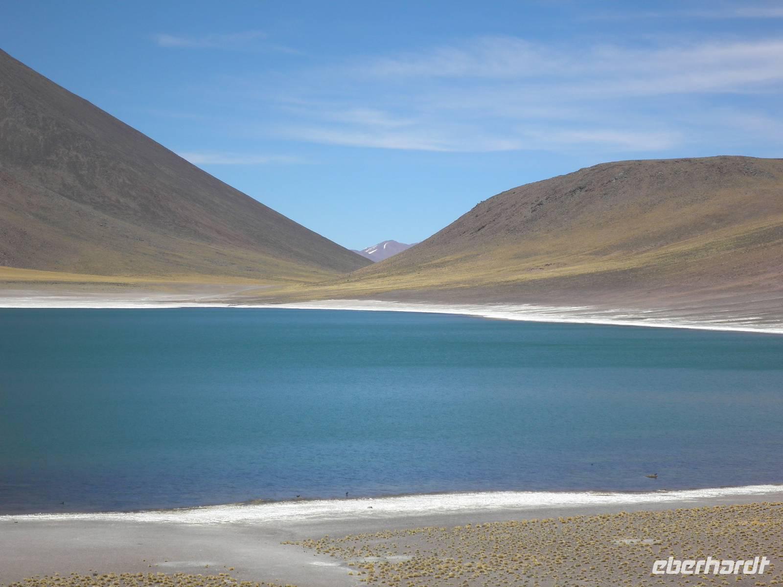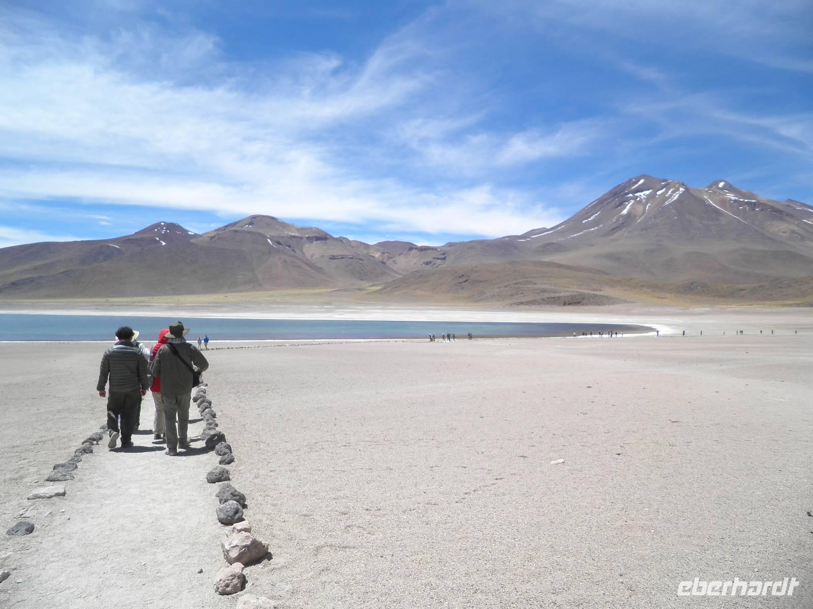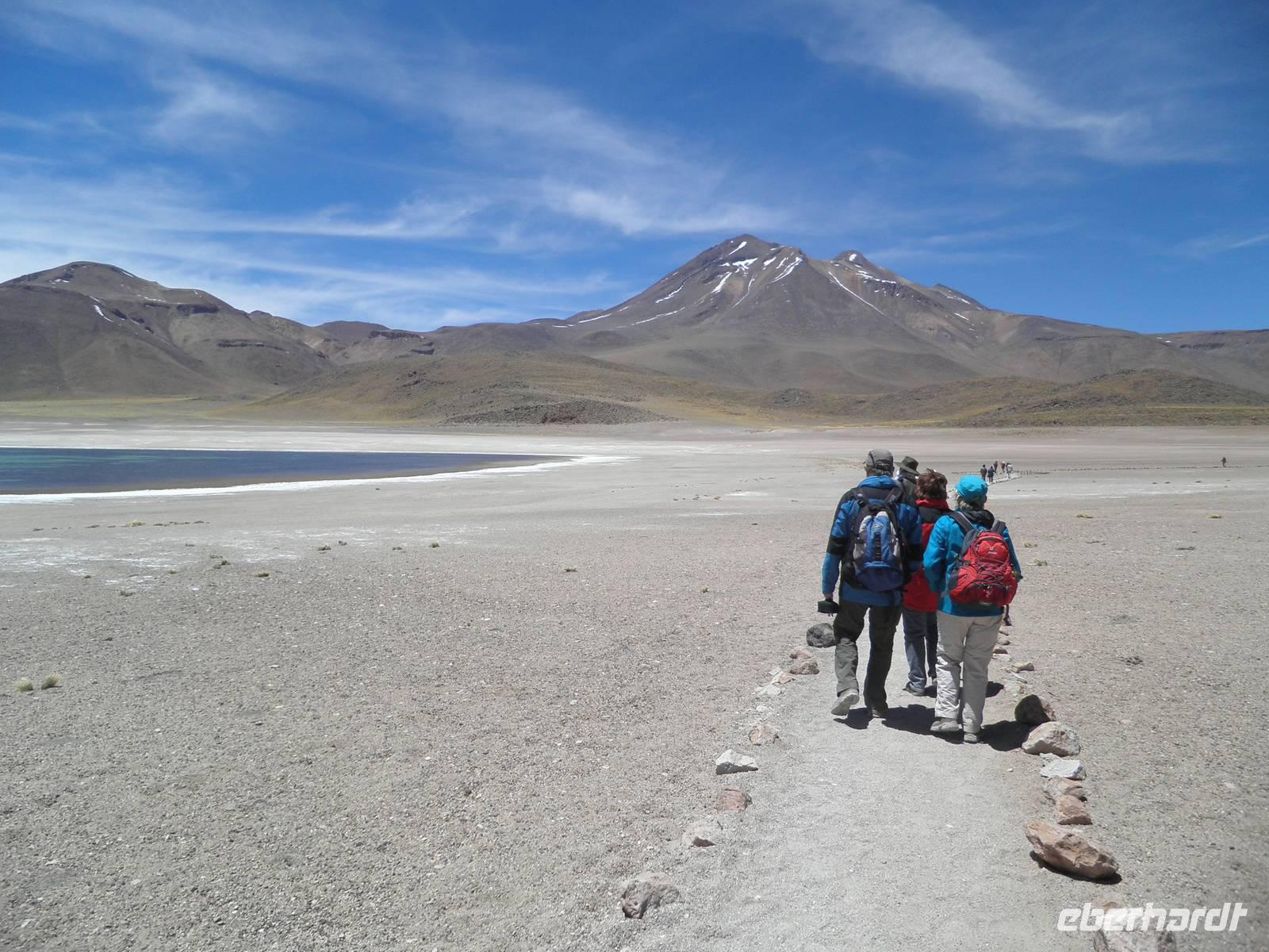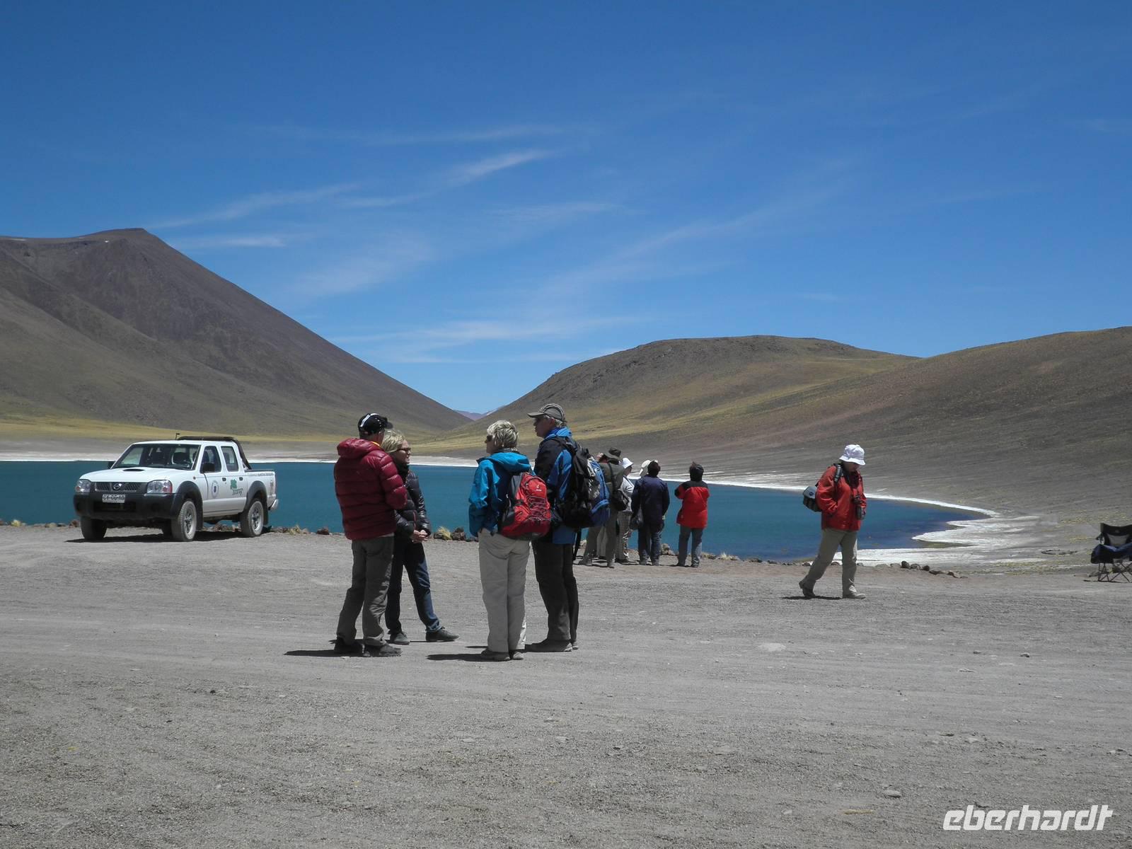 Am nächsten Morgen brachen wir nach dem Frühstück auf, um hoch hinauf zu fahren. Unser Ziel für diesen Vormittag lag auf einer Höhe von über 4200 m über dem Meeresspiegel: die beiden Lagunen Miscanti und Menique. Unser kleiner blauer Bus fuhr uns hinauf, wir sahen wieder beeindruckende Landschaft, karge Felsen und nahezu unbewachsene Ebenen. Unterwegs hielten wir an und Emilio zeigte uns den einzigen noch aktiven Vulkan der Umgebung. Wir mussten unsere Augen ziemlich anstrengen, aber man konnte den weißen Nebel doch erkennen, der aus dem Krater des Vulkans nach oben stieg. Gegen Mittag erreichten wir die Lagunen im Hochland. Ihr klares Wasser erstrahlte tiefblau und spiegelte damit die klare blaue Farbe des Himmels. Im Hintergrund erhoben sich Vulkane und Berge, ein sagenhaftes Naturschauspiel. Langsam spazierten wir durch die Ebene, wir atmeten ruhig und langsam, denn die Höhe über 4000 m ist doch ziemlich anstrengend. An der zweiten Lagune bereiteten Emilio und unser Fahrer Wilson ein wunderbares Mittagspicknick für uns vor. Wir saßen in der Sonne, genossen Andenreis, Lachs und Salat mit herrlichem Ausblick auf Lagunen und Berge. Auf unserem Weg zum Salar de Atacama, einem Salzsee in der Wüste, machten wir Halt in dem kleinen Andendorf Socaire. Wir besuchten die Kirche und spazierten vorbei an Terrassenfeldern. Diese Art des Anbaus haben einst die Inkas in diese Gegend gebracht.