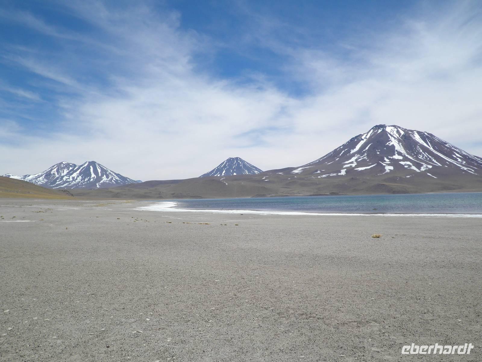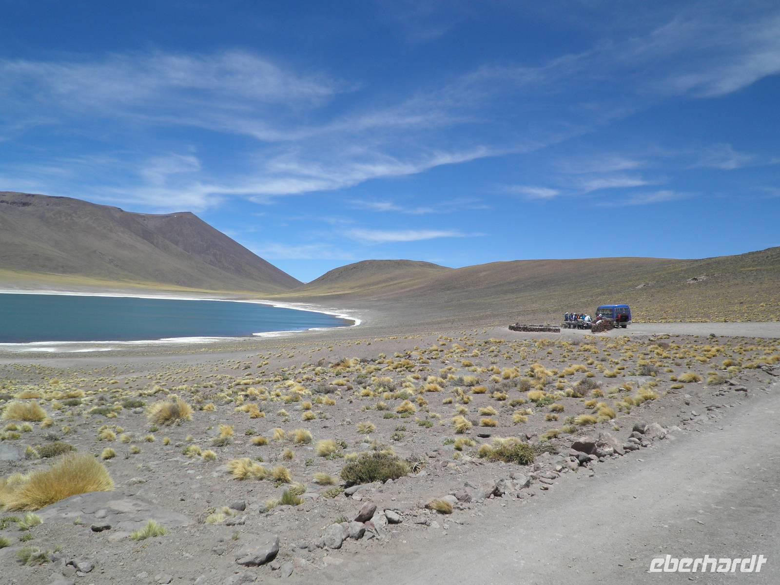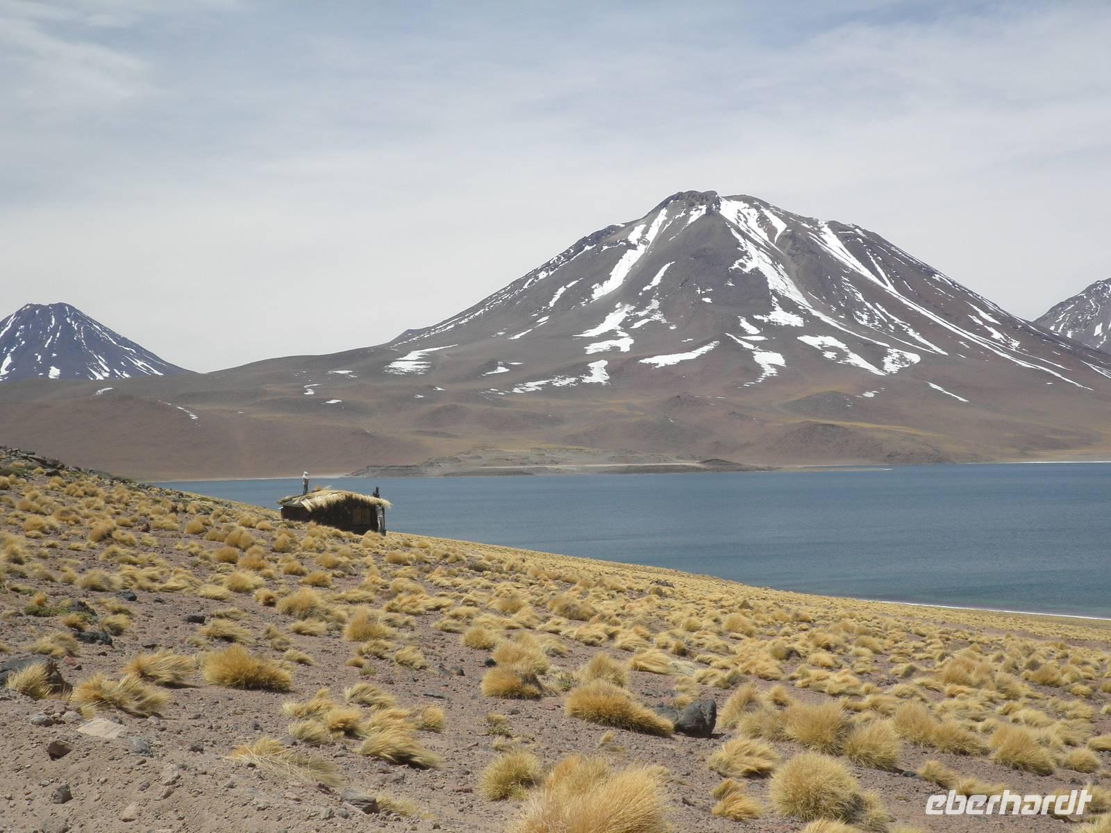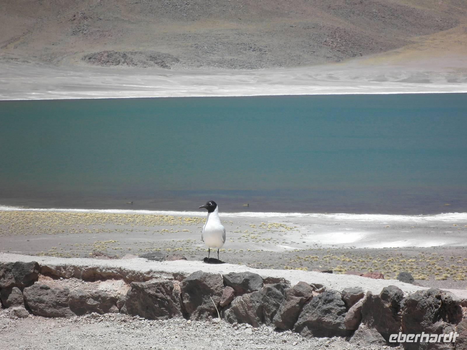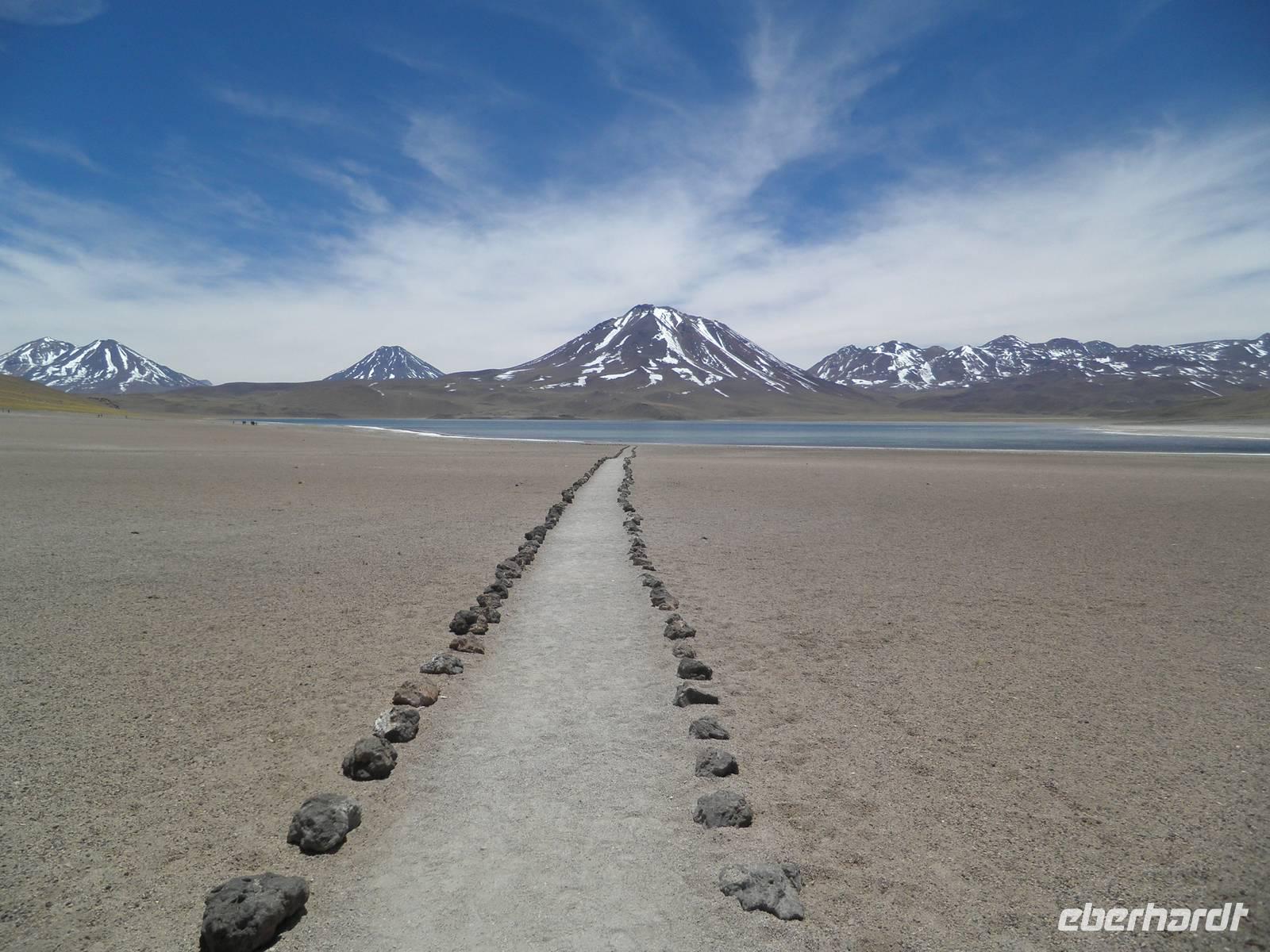 Am nächsten Morgen brachen wir nach dem Frühstück auf, um hoch hinauf zu fahren. Unser Ziel für diesen Vormittag lag auf einer Höhe von über 4200 m über dem Meeresspiegel: die beiden Lagunen Miscanti und Menique. Unser kleiner blauer Bus fuhr uns hinauf, wir sahen wieder beeindruckende Landschaft, karge Felsen und nahezu unbewachsene Ebenen. Unterwegs hielten wir an und Emilio zeigte uns den einzigen noch aktiven Vulkan der Umgebung. Wir mussten unsere Augen ziemlich anstrengen, aber man konnte den weißen Nebel doch erkennen, der aus dem Krater des Vulkans nach oben stieg. Gegen Mittag erreichten wir die Lagunen im Hochland. Ihr klares Wasser erstrahlte tiefblau und spiegelte damit die klare blaue Farbe des Himmels. Im Hintergrund erhoben sich Vulkane und Berge, ein sagenhaftes Naturschauspiel. Langsam spazierten wir durch die Ebene, wir atmeten ruhig und langsam, denn die Höhe über 4000 m ist doch ziemlich anstrengend. An der zweiten Lagune bereiteten Emilio und unser Fahrer Wilson ein wunderbares Mittagspicknick für uns vor. Wir saßen in der Sonne, genossen Andenreis, Lachs und Salat mit herrlichem Ausblick auf Lagunen und Berge. Auf unserem Weg zum Salar de Atacama, einem Salzsee in der Wüste, machten wir Halt in dem kleinen Andendorf Socaire. Wir besuchten die Kirche und spazierten vorbei an Terrassenfeldern. Diese Art des Anbaus haben einst die Inkas in diese Gegend gebracht.