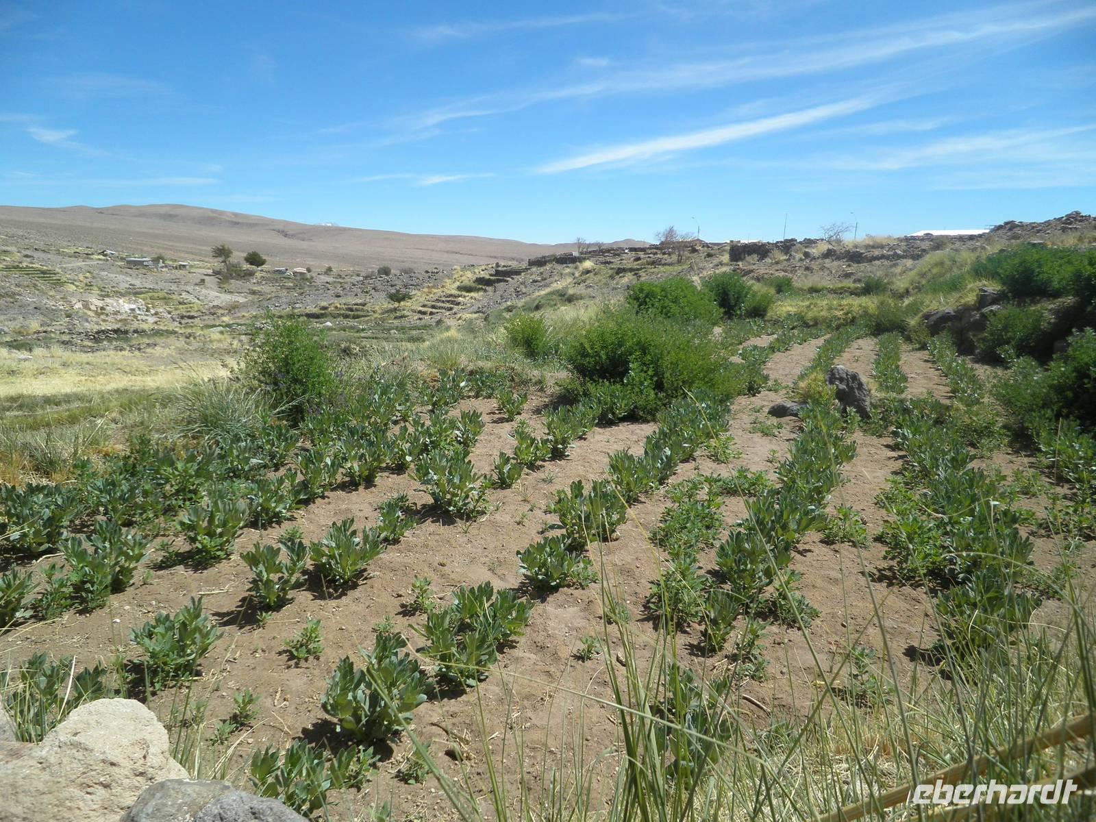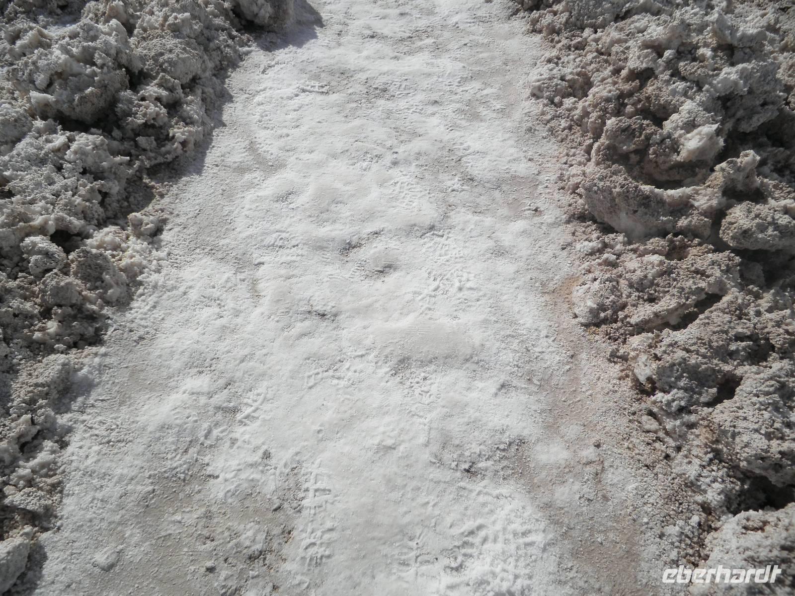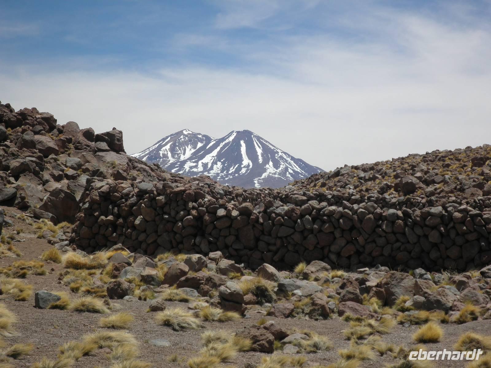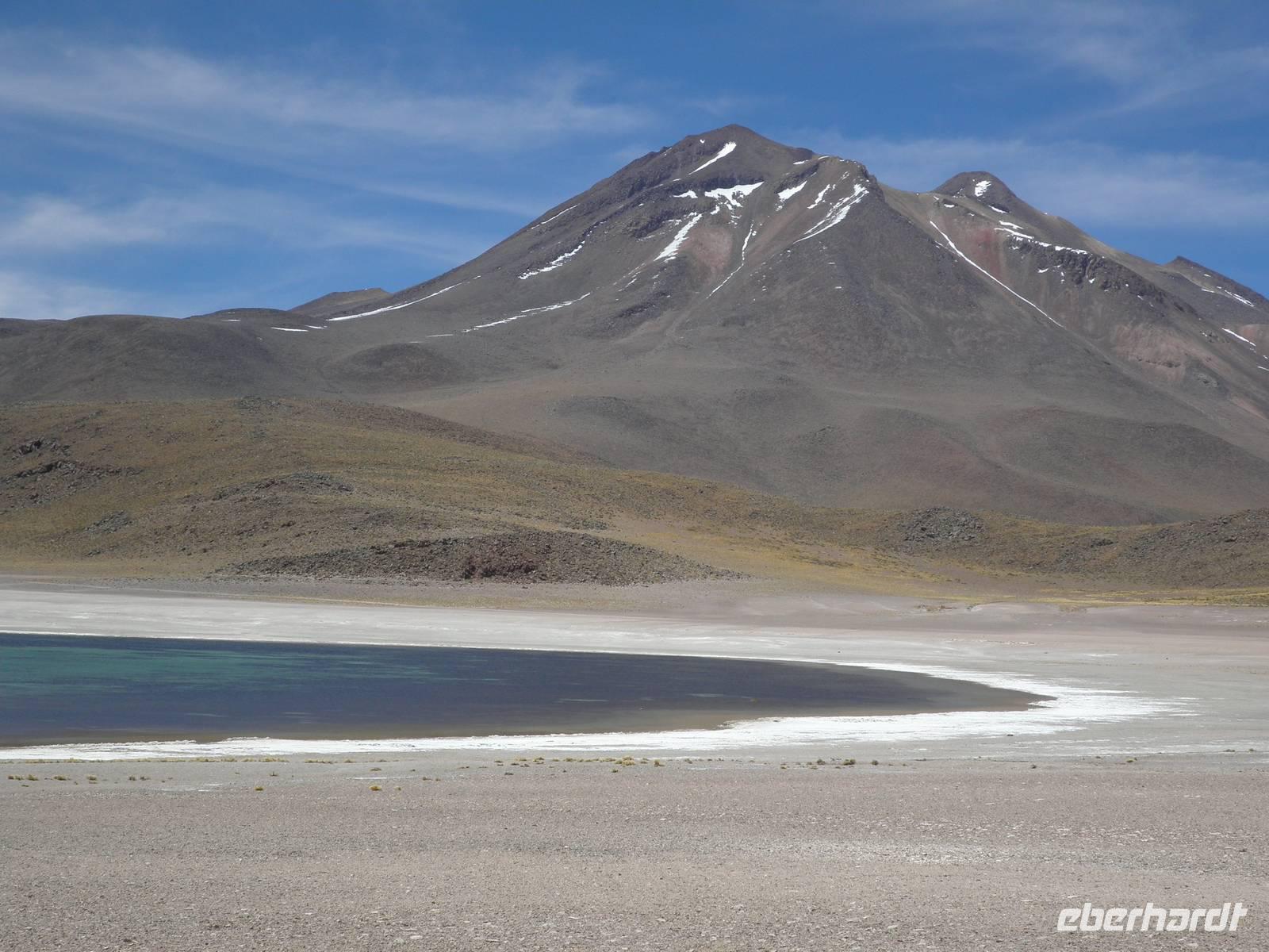 Am nächsten Morgen brachen wir nach dem Frühstück auf, um hoch hinauf zu fahren. Unser Ziel für diesen Vormittag lag auf einer Höhe von über 4200 m über dem Meeresspiegel: die beiden Lagunen Miscanti und Menique. Unser kleiner blauer Bus fuhr uns hinauf, wir sahen wieder beeindruckende Landschaft, karge Felsen und nahezu unbewachsene Ebenen. Unterwegs hielten wir an und Emilio zeigte uns den einzigen noch aktiven Vulkan der Umgebung. Wir mussten unsere Augen ziemlich anstrengen, aber man konnte den weißen Nebel doch erkennen, der aus dem Krater des Vulkans nach oben stieg. Gegen Mittag erreichten wir die Lagunen im Hochland. Ihr klares Wasser erstrahlte tiefblau und spiegelte damit die klare blaue Farbe des Himmels. Im Hintergrund erhoben sich Vulkane und Berge, ein sagenhaftes Naturschauspiel. Langsam spazierten wir durch die Ebene, wir atmeten ruhig und langsam, denn die Höhe über 4000 m ist doch ziemlich anstrengend. An der zweiten Lagune bereiteten Emilio und unser Fahrer Wilson ein wunderbares Mittagspicknick für uns vor. Wir saßen in der Sonne, genossen Andenreis, Lachs und Salat mit herrlichem Ausblick auf Lagunen und Berge. Auf unserem Weg zum Salar de Atacama, einem Salzsee in der Wüste, machten wir Halt in dem kleinen Andendorf Socaire. Wir besuchten die Kirche und spazierten vorbei an Terrassenfeldern. Diese Art des Anbaus haben einst die Inkas in diese Gegend gebracht.