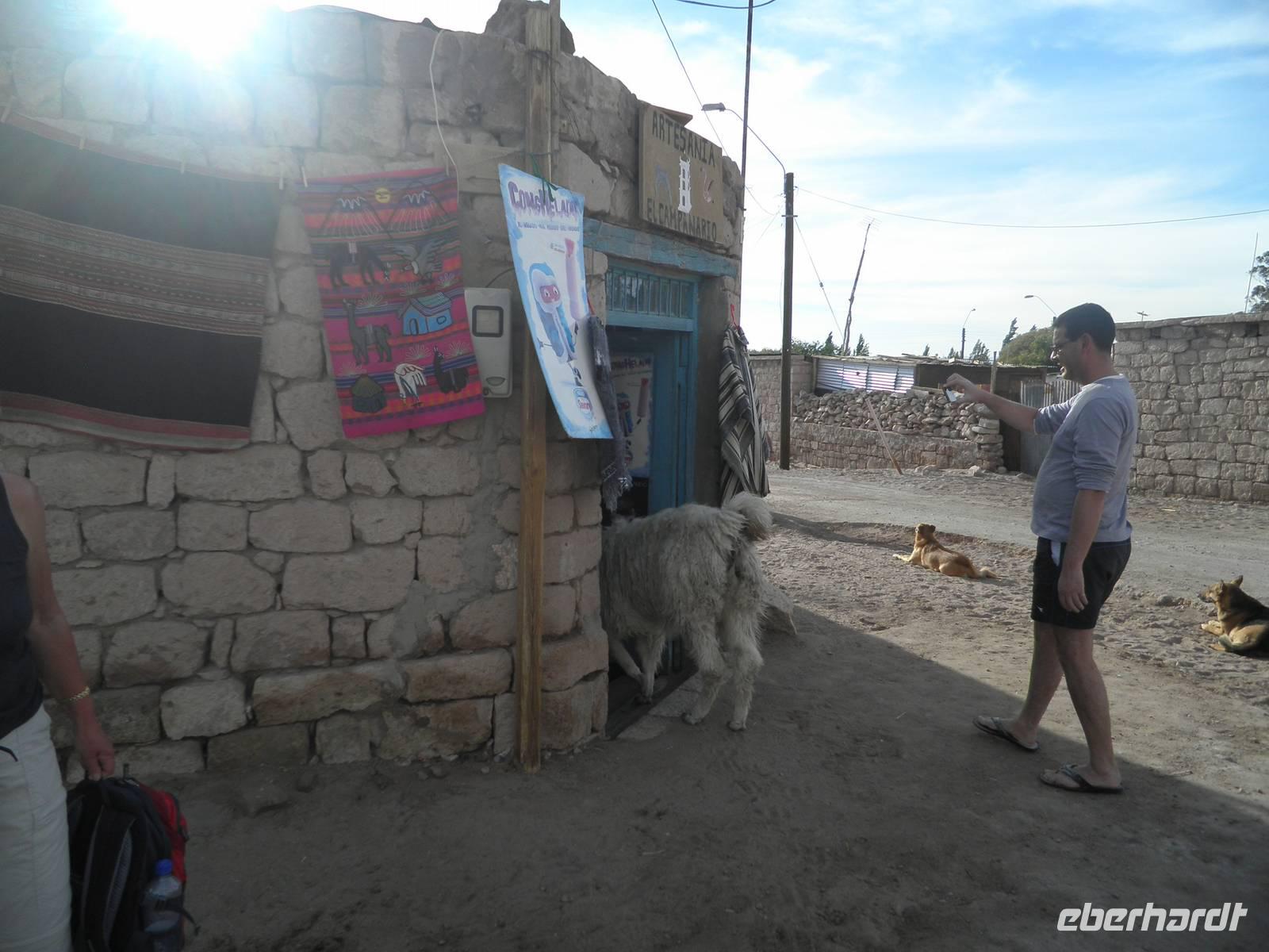 Nach weiterer kurzer Fahrt kamen wir schließlich am Salar de Atacama an. Hier sollten wir endlich Flamingos in freier Wildbahn sehen. Und wir wurden nicht enttäuscht. In mehreren Lagunen standen die rosa gefärbten Vögel und filterten winzige Krabben mit ihren Schnäbeln aus dem Wasser. Wir erfuhren, wie diese kleinen Wassertiere hier im warmen Salzwasser gedeihen und dass sie die Lebensgrundlage der Flamingos sind. Es gibt hier drei Arten von Flamingos: den Andenflamingo, den Chileflamingo und James, eine kleinere Art dieser wunderschönen Vögel. Bei unserem Spaziergang durch die Salzwüste um die Lagunen herum wurde uns ziemlich heiß, die Sonne schien unerbittlich auf uns hernieder. Mit wunderbaren Eindrücken und tollen Fotos im Gepäck stiegen wir schließlich wieder in unseren Bus, um die Heimfahrt zum Hotel in San Pedro anzutreten. Unterwegs hielten wir noch in einem weiteren Andendorf: Tocanao. Hier sahen wir Lamas, die vor einem kleinen Laden warteten und lernten Kaktusholz kennen, das durch die Stacheln dieser Gewächse ziemlich löchrig aussieht. Am frühen Abend erreichten wir unser Hotel. Nach kurzer Verschnaufpause verabredeten wir uns wieder und spazierten ein paar Meter hinein in den Ort, um in einem typischen chilenischen Restaurant gemeinsam zu Abend zu essen. Wir probierten gegrillten Fisch oder Nudeln, tranken chilenisches Bier oder frisch gepressten Saft. Zum Dessert gab's eine Art Vanillepudding oder Kaffee. Zwar erschöpft, doch satt und zufrieden und voller schöner Eindrücke spazierten wir schließlich in unser Hotel und verbrachten eine erholsame Nacht in der Atacama-Wüste.