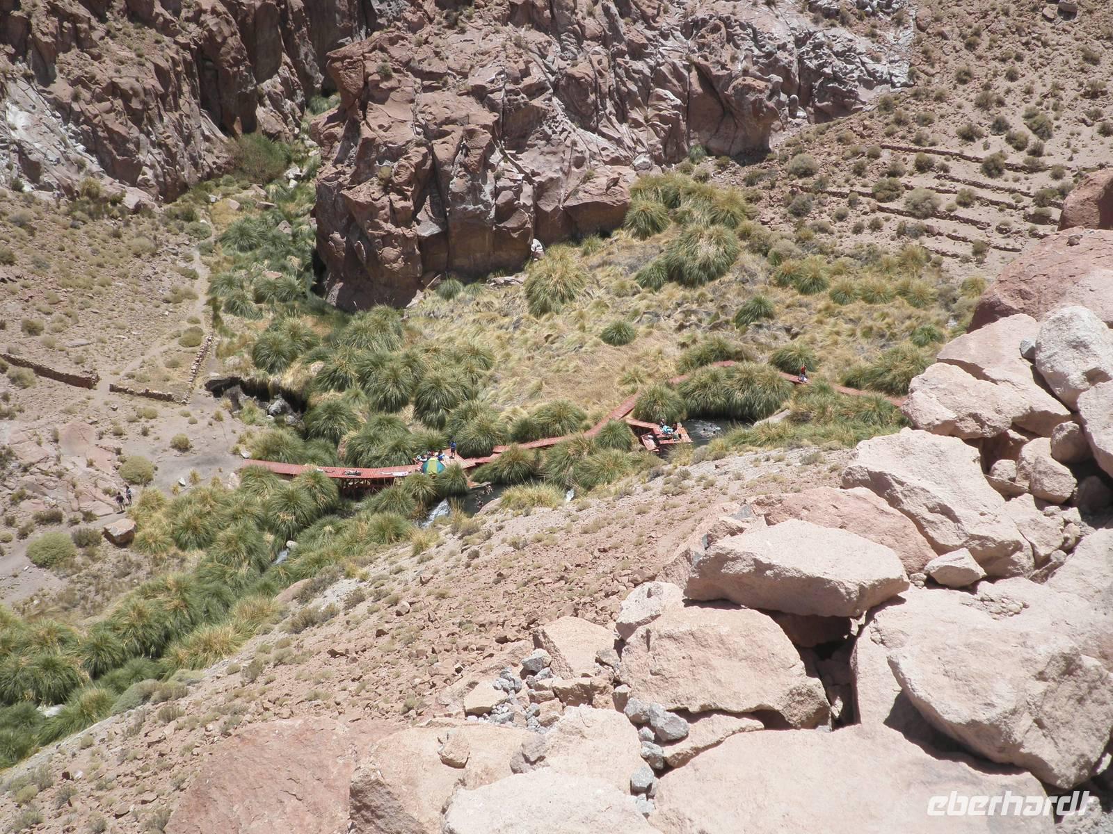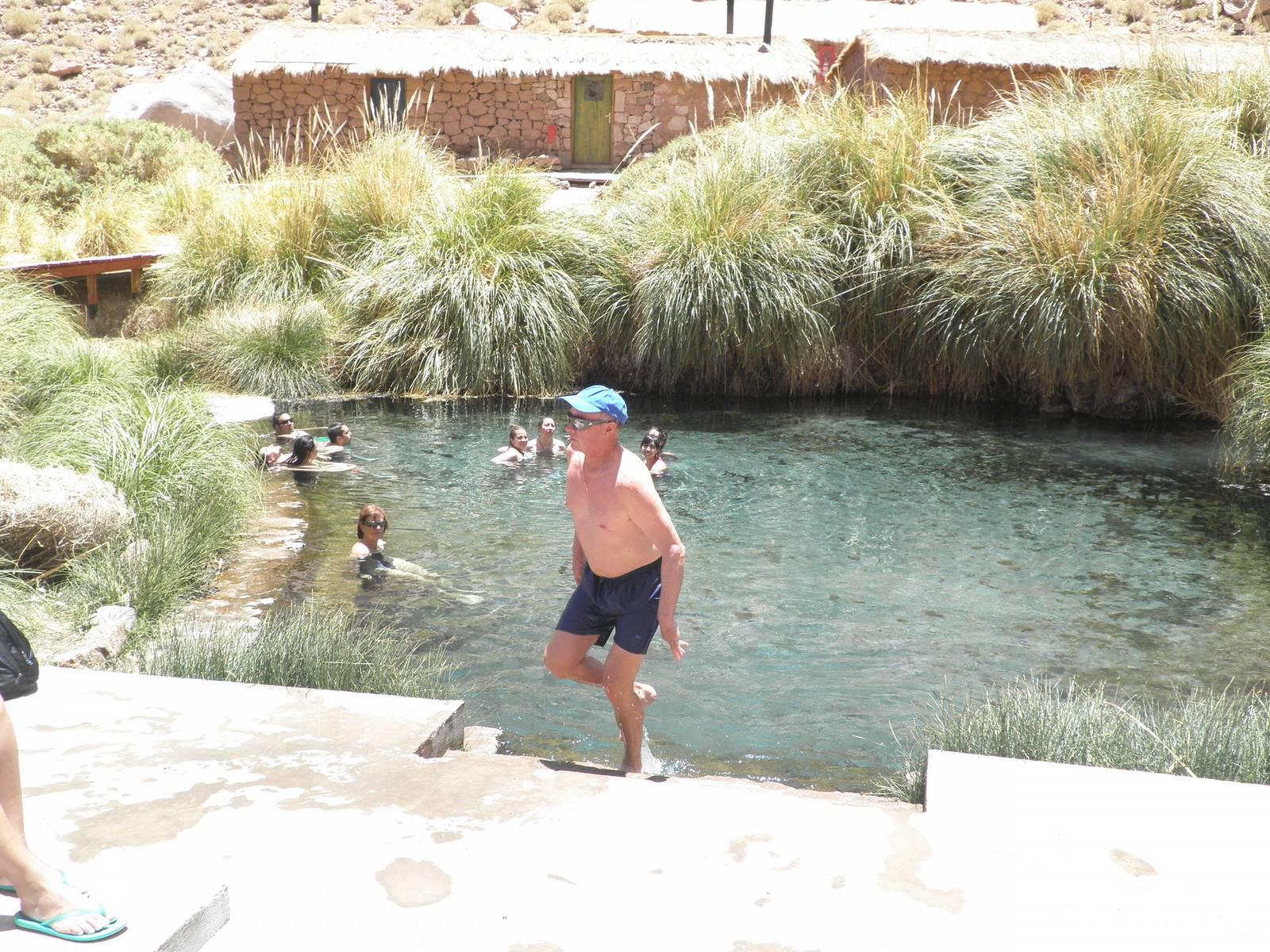 Am Mittag erreichten wir schließlich die Puritama-Thermalbäder. Wir wanderten einen steilen unbefestigten Pfad hinunter in die Puritama-Schlucht. Dort erwartete uns ein Mittagspicknick. Gestärkt nach der Mahlzeit gingen einige von uns baden und probierten die unterschiedlich warmen Thermalbecken. Andere ruhten sich aus oder spazierten durch die schön gestaltete Anlage mit allerlei Pflanzen. Den steilen Aufstieg zurück zu unserem Bus schafften wir alle, so dass wir schon nach zwei Stunden in Puritama unsere Rückfahrt zum Hotel antreten konnten. Dort angelangt ruhten wir ein wenig aus, saßen am Pool oder in der Lobby und warteten auf unsere Weiterfahrt nach Calama, denn heute noch sollten wir zurück fliegen nach Santiago de Chile. Am späten Nachmittag holte uns der kleine blaue Bus wieder ab und wir fuhren zum Flughafen. Das Check in und die Sicherheitskontrollen gingen unkompliziert und schnell. Pünktlich flogen wir ab und landeten auch pünktlich in Santiago. Dort holte uns unser neuer Reiseleiter Nelson ab. Wir hatten aber für diesen Tag schon sehr viel erlebt und gesehen und waren entsprechend müde und erschöpft. Das einzige, was wir noch brauchten, war schnell ein Bett. Also fuhren wir recht zügig in die Stadt hinein und bezogen unsere Hotelzimmer. Ein langer Tag war zu Ende gegangen, wir hatten viel erlebt und gesehen.
