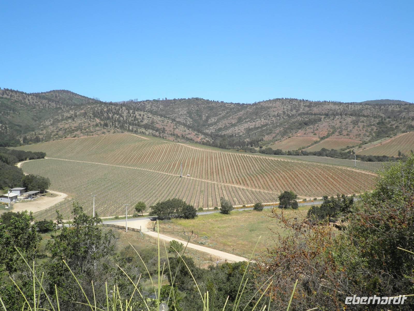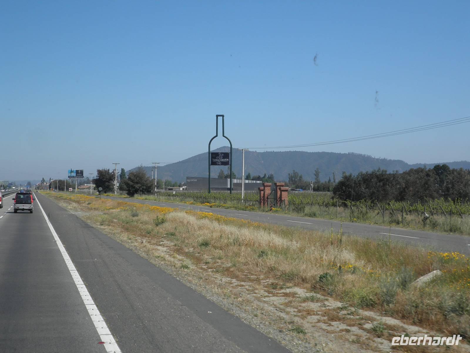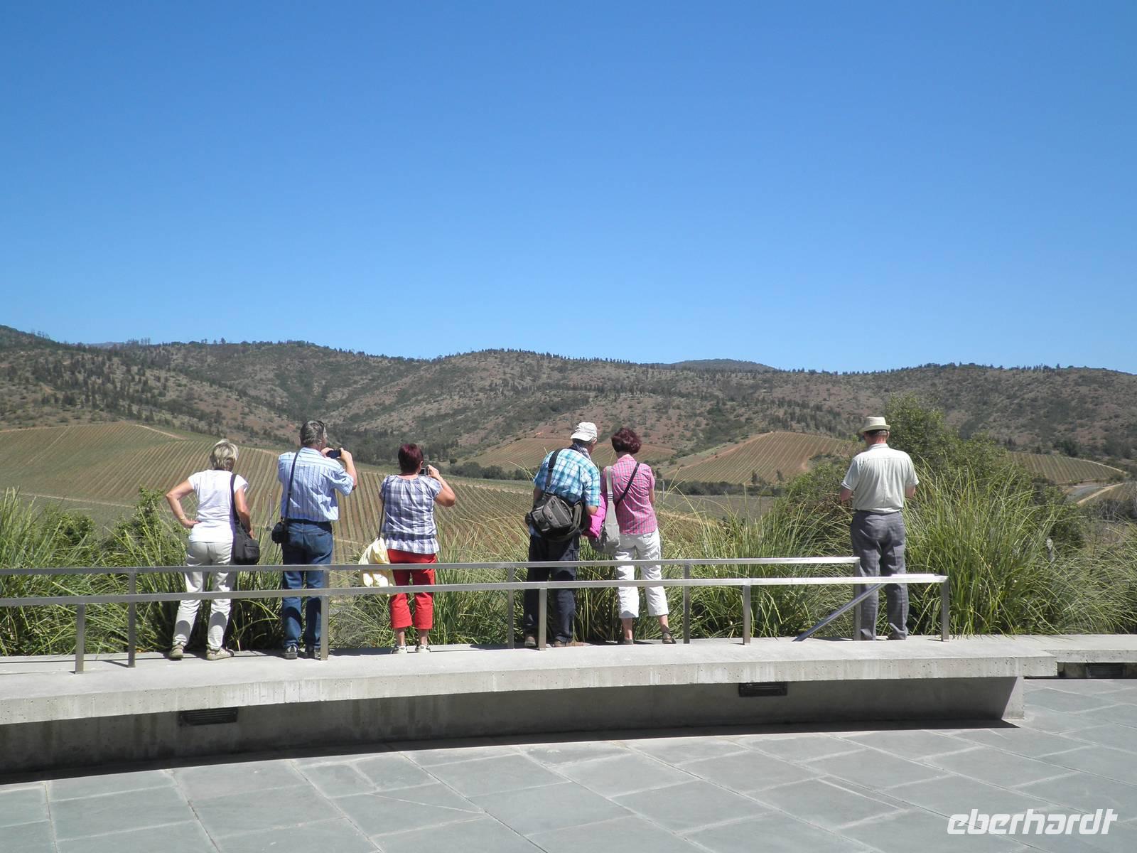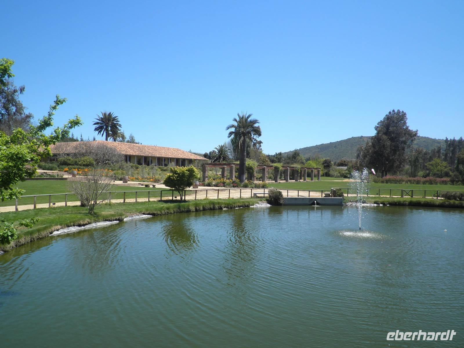 Unser Aufenthalt am Strand war nicht lang, denn wir wurden zum Mittagessen im Weingut Matetic erwartet. Als wir ankamen, war schon alles vorbereitet. Wir ließen uns ein traditionelles chilenisches Gericht schmecken: Asado. Das sind verschiedene gegrillte Fleischsorten, die uns mit leckeren Salaten und Beilagen angeboten wurden. Dazu gab es natürlich chilenischen Wein, Weißwein aus dem eigenen Weingut. Nach dem Dessert tranken einige noch einen Kaffee, um das üppige Mahl besser verdauen zu können. Dann spazierten wir durch die herrliche Anlage mit schönen Blumen, Palmen und einem Teich mit Gänsen zurück zu unserem Bus. Nach kurzer Fahrt erreichten wir ein sehr modernes Gebäude, das ebenfalls zum Weingut Matetic gehört. Dort besichtigten wir eine der Lagerhallen für die Weinfässer, sahen riesige Edelstahltanks, in denen die Trauben gären nach der Lese. Zuletzt konnten wir noch einen Weiß- und einen Rotwein probieren. Einige fanden den Wein so lecker, dass sie die ein oder andere Flasche erwarben, um sie in Ruhe später im Hotel zu trinken oder als Souvenir mit nach Hause zu nehmen.