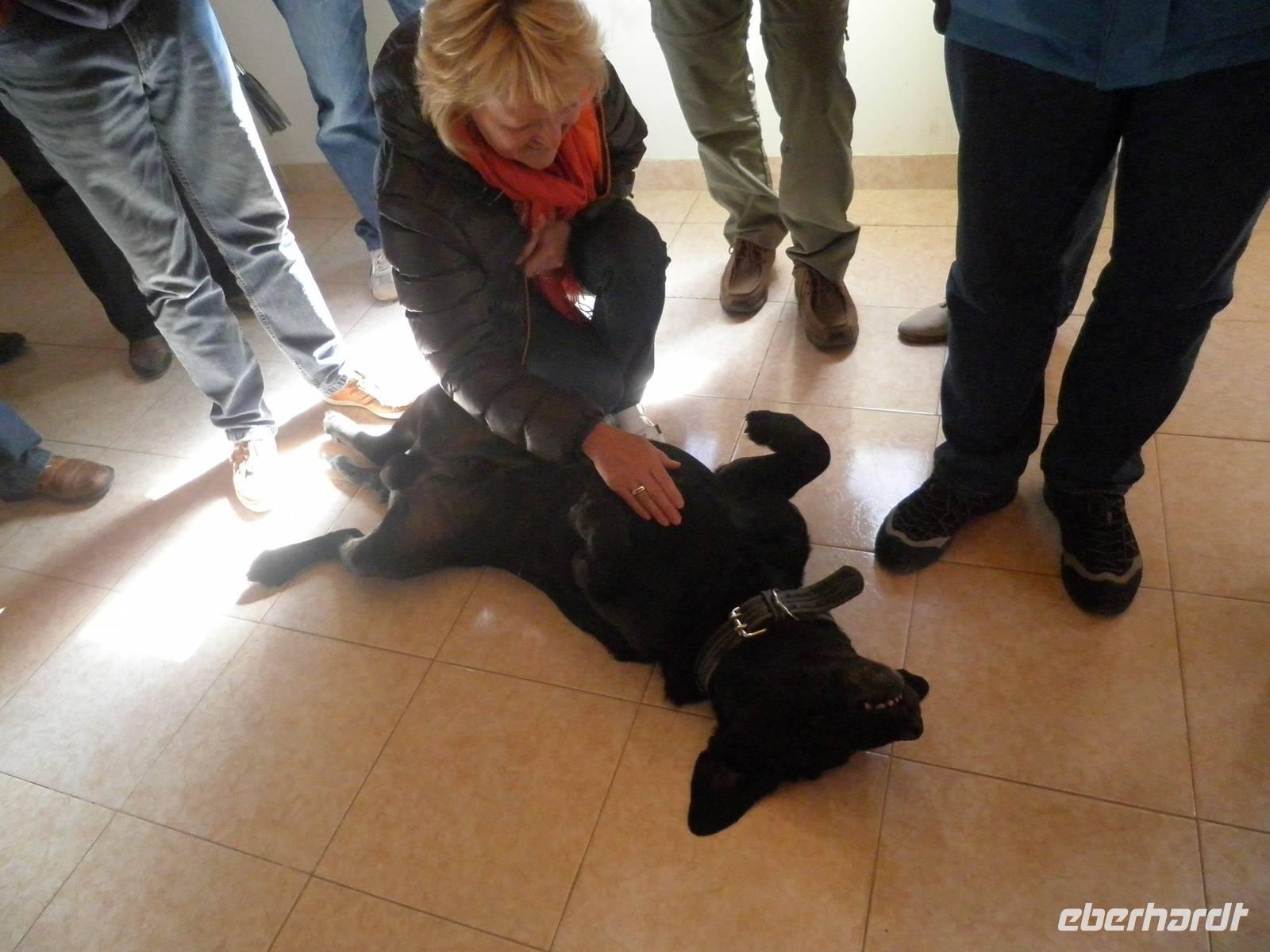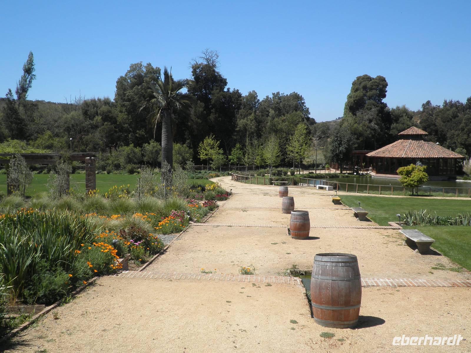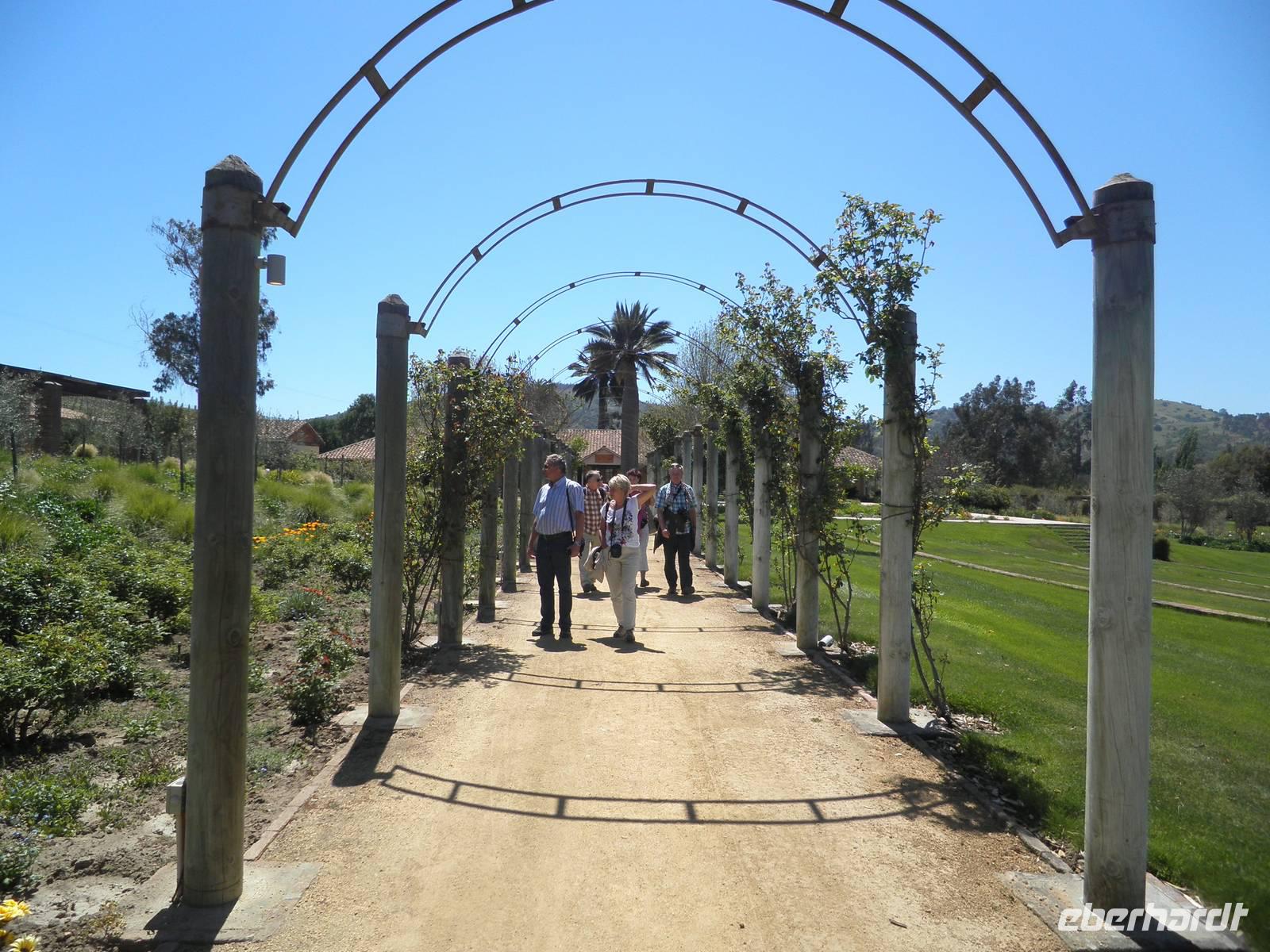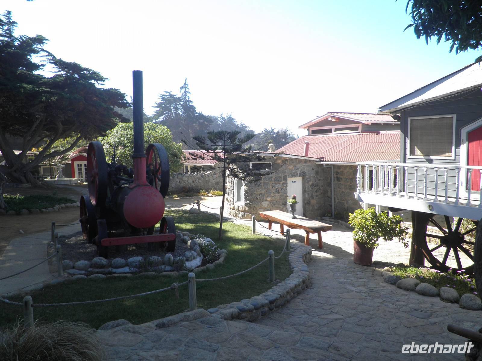 Unser Aufenthalt am Strand war nicht lang, denn wir wurden zum Mittagessen im Weingut Matetic erwartet. Als wir ankamen, war schon alles vorbereitet. Wir ließen uns ein traditionelles chilenisches Gericht schmecken: Asado. Das sind verschiedene gegrillte Fleischsorten, die uns mit leckeren Salaten und Beilagen angeboten wurden. Dazu gab es natürlich chilenischen Wein, Weißwein aus dem eigenen Weingut. Nach dem Dessert tranken einige noch einen Kaffee, um das üppige Mahl besser verdauen zu können. Dann spazierten wir durch die herrliche Anlage mit schönen Blumen, Palmen und einem Teich mit Gänsen zurück zu unserem Bus. Nach kurzer Fahrt erreichten wir ein sehr modernes Gebäude, das ebenfalls zum Weingut Matetic gehört. Dort besichtigten wir eine der Lagerhallen für die Weinfässer, sahen riesige Edelstahltanks, in denen die Trauben gären nach der Lese. Zuletzt konnten wir noch einen Weiß- und einen Rotwein probieren. Einige fanden den Wein so lecker, dass sie die ein oder andere Flasche erwarben, um sie in Ruhe später im Hotel zu trinken oder als Souvenir mit nach Hause zu nehmen.