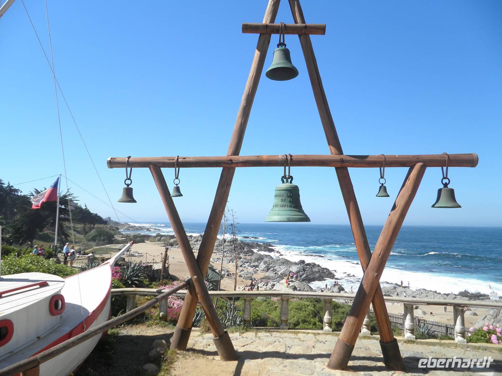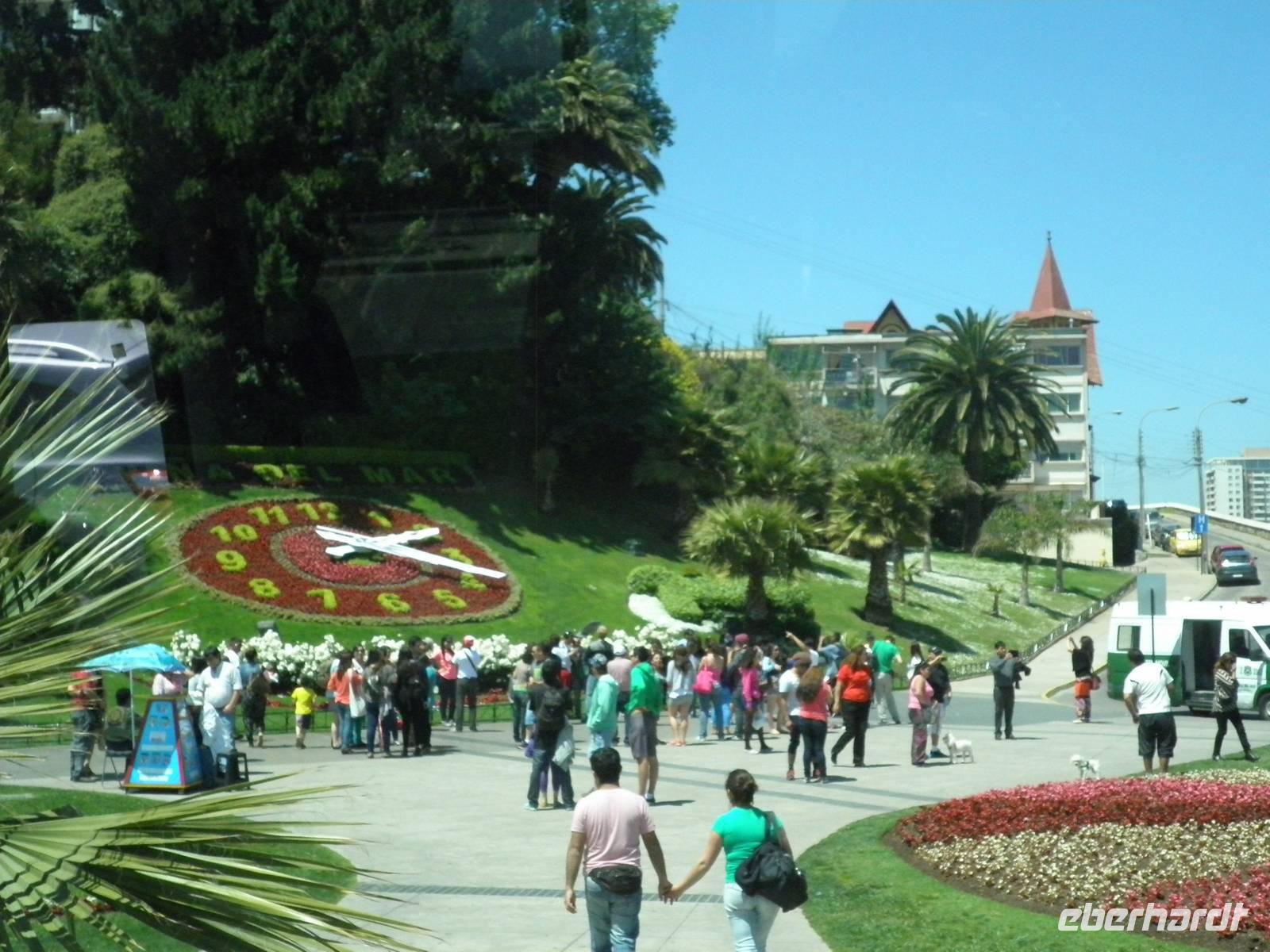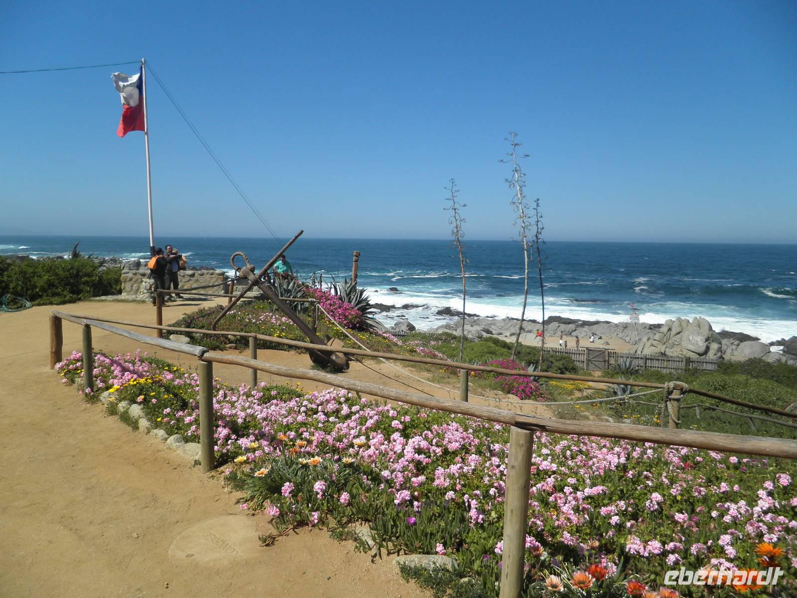 Nach dem Frühstück in unserem Hotel Las Galerias in Santiago verließen wir schon wieder die Hauptstadt Chiles. Wir fuhren mit unserem Reiseleiter Nelson hinaus nach Valparaiso - ins paradiesische Tal. Nach der kargen Landschaft in der Atacama-Wüste sogen unsere Augen das fruchtbare Grün förmlich auf. Wir genossen den Frühling, der hier in allen Farben blühte. An einem Aussichtspunkt über einem Weintal hielten wir an und überblickten ein großes Anbaugebiet voller Rebstöcke. In Valparaiso sahen wir schon vom Bus aus das geschäftige Treiben auf dem Flohmarkt, der hier an den Wochenenden abgehalten wird. Alte Trolley-Busse chauffieren immer noch ihre Fahrgäste durch die Stadt. Unser Bus fuhr auf engen Serpentinenstraßen hinauf, vorbei an kleinen Häuschen, die förmlich an die steilen Hänge der Stadt geklebt zu sein scheinen. Überall gibt es Graffitis in Valparaiso. Irgendwo im Straßengewirr hielt unser Bus an und wir stiegen aus. Ein paar Meter zu Fuß und wir erreichten das ehemalige Haus des Nationaldichters Pablo Neruda, der auch den Literaturnobelpreis bekommen hat. Im Garten gibt es eine Aussichtsplattform, von der aus man hinunter zum Meer über den Hafen von Valparaiso sehen kann. Wir bestaunten einen Teil des Gartens des berühmten Dichters. Dann fuhren wir noch ein Stück weiter mit dem Bus, aber nicht lange, denn bald stiegen wir aus und machten einen Spaziergang die engen Gassen, Treppen und Straßen hinab bis zum Hafen. Unterwegs bestaunten wir die Arbeiten von einheimischen Künstlern, kauften das ein oder andere Bild. Wir hörten chilenische Musik von einem Sänger, der sich auf der Gitarre begleitete. Auf unserem gesamten Weg entdeckten wir Blumen und Pflanzen, die wir einfach fotografieren mussten, so schön waren sie. Weil gerade die Angestellten des Rathauses in Valparaiso streikten, fuhren auch nicht alle Aufzüge, mit denen man sonst bequem die großen Höhenunterschiede innerhalb der Stadt überwinden kann. Also gingen wir zu Fuß, aber immer nur bergab, das war nicht schwierig. Unten angekommen, sahen wir den Justizpalast mit der Justitia davor und andere imposante Gebäude aus der Kolonialzeit. Am Hafen endete unser Rundgang mit unserem Reiseleiter Nelson durch Valparaiso. Wir bestiegen unseren Bus und fuhren ins nahegelegene Viña del Mar. Dort kamen wir zu einem Restaurant direkt an der Uferpromenade, das architektonisch an ein Schloss erinnerte. Und es hieß auch Castillo del Mar, also Schloss am Meer. Dort ließen wir uns ein leckeres Mittagessen schmecken. Besonders der fangfrische Fisch und die Meeresfrüchte waren eine Köstlichkeit. Nach dem Essen spazierten wir noch ein Stück die Uferpromenade entlang, auf den Felsen vor der Küste saßen Pelikane, die ihre letzte Mahlzeit zu verdauen schienen. Wir bestiegen wieder unseren Bus und fuhren noch ein Stück weiter im Ort zum Badestrand. Dort konnten wir das erste Mal unsere Füße in den Pazifik stecken, aber er war doch recht kalt. Am belebten Sandstrand gingen wir ein bisschen spazieren, bevor wir schließlich wieder in unseren Bus einstiegen, um zu unserem Hotel in Valparaiso zu fahren. Wir bekamen unsere Zimmer und jeder verbrachte den Rest des Tages auf seine Weise. Einige erkundeten auf eigene Faust die Stadt, andere kauften noch etwas in der Nähe ein oder saßen im Hotel, tranken Kaffee oder Bier und unterhielten sich, um den ereignisreichen Tag ausklingen zu lassen.