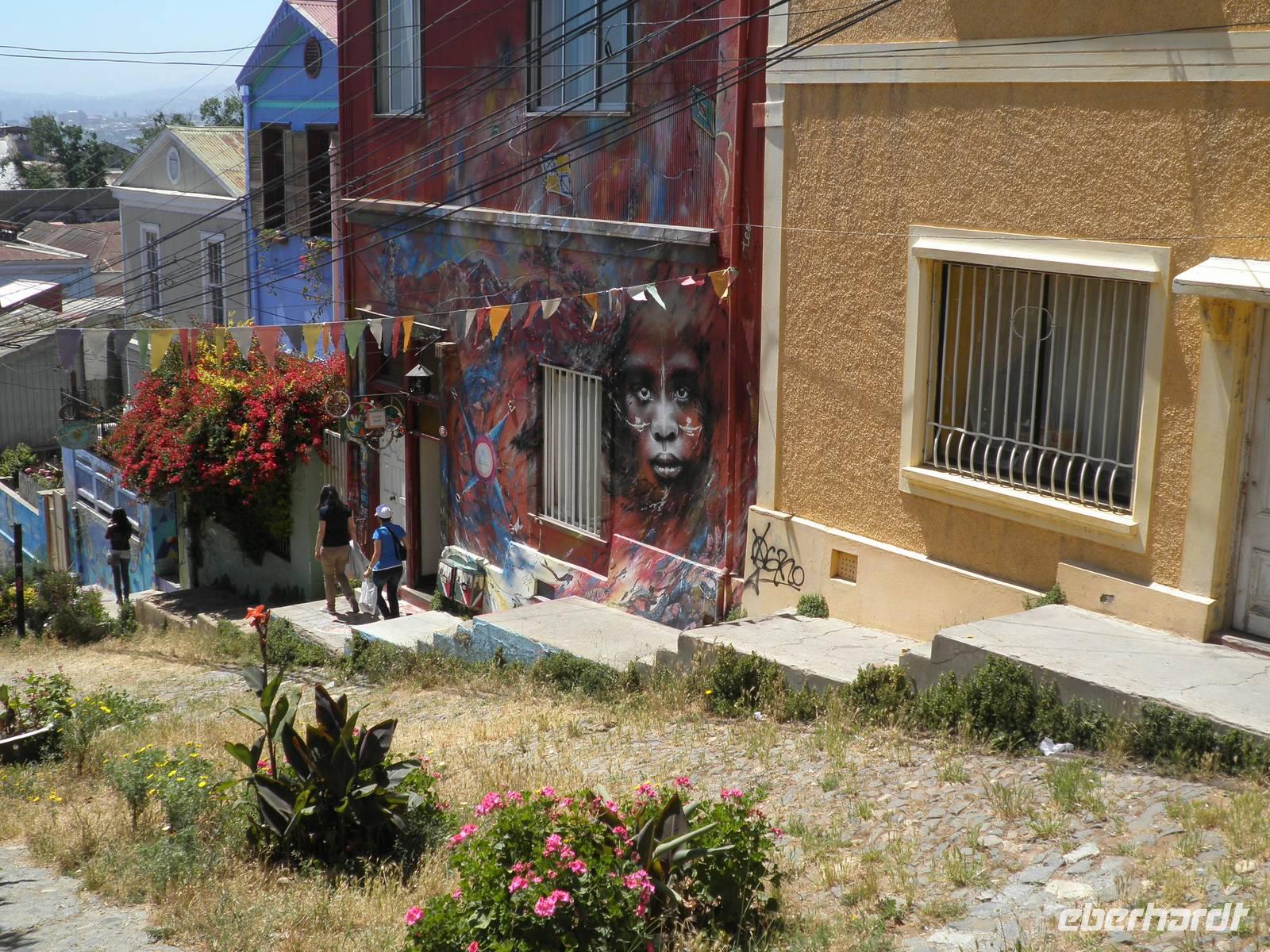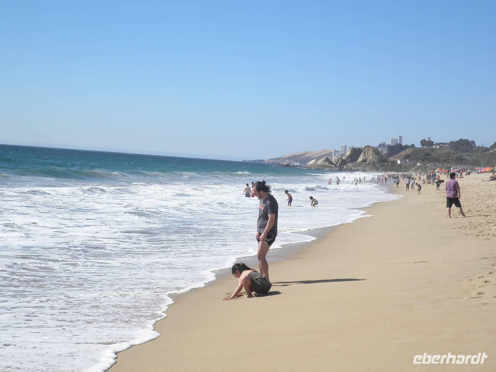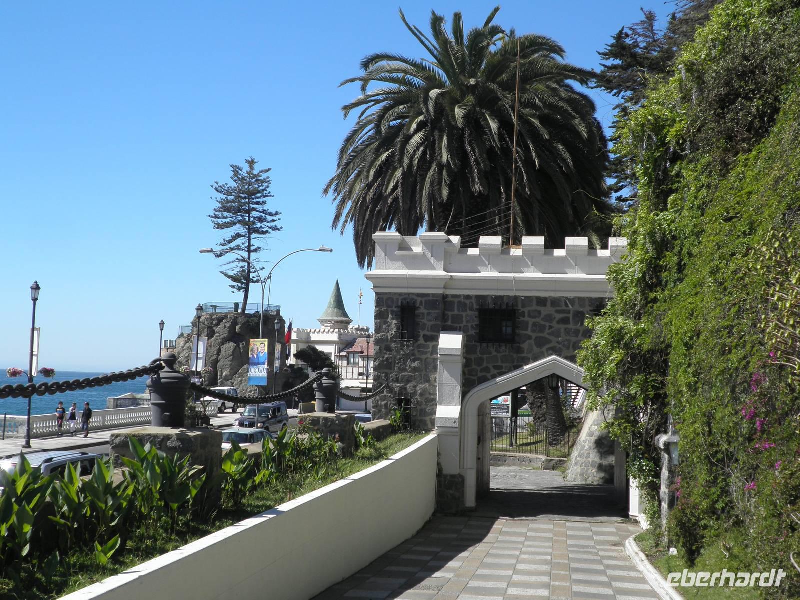 Nach dem Frühstück in unserem Hotel Las Galerias in Santiago verließen wir schon wieder die Hauptstadt Chiles. Wir fuhren mit unserem Reiseleiter Nelson hinaus nach Valparaiso - ins paradiesische Tal. Nach der kargen Landschaft in der Atacama-Wüste sogen unsere Augen das fruchtbare Grün förmlich auf. Wir genossen den Frühling, der hier in allen Farben blühte. An einem Aussichtspunkt über einem Weintal hielten wir an und überblickten ein großes Anbaugebiet voller Rebstöcke. In Valparaiso sahen wir schon vom Bus aus das geschäftige Treiben auf dem Flohmarkt, der hier an den Wochenenden abgehalten wird. Alte Trolley-Busse chauffieren immer noch ihre Fahrgäste durch die Stadt. Unser Bus fuhr auf engen Serpentinenstraßen hinauf, vorbei an kleinen Häuschen, die förmlich an die steilen Hänge der Stadt geklebt zu sein scheinen. Überall gibt es Graffitis in Valparaiso. Irgendwo im Straßengewirr hielt unser Bus an und wir stiegen aus. Ein paar Meter zu Fuß und wir erreichten das ehemalige Haus des Nationaldichters Pablo Neruda, der auch den Literaturnobelpreis bekommen hat. Im Garten gibt es eine Aussichtsplattform, von der aus man hinunter zum Meer über den Hafen von Valparaiso sehen kann. Wir bestaunten einen Teil des Gartens des berühmten Dichters. Dann fuhren wir noch ein Stück weiter mit dem Bus, aber nicht lange, denn bald stiegen wir aus und machten einen Spaziergang die engen Gassen, Treppen und Straßen hinab bis zum Hafen. Unterwegs bestaunten wir die Arbeiten von einheimischen Künstlern, kauften das ein oder andere Bild. Wir hörten chilenische Musik von einem Sänger, der sich auf der Gitarre begleitete. Auf unserem gesamten Weg entdeckten wir Blumen und Pflanzen, die wir einfach fotografieren mussten, so schön waren sie. Weil gerade die Angestellten des Rathauses in Valparaiso streikten, fuhren auch nicht alle Aufzüge, mit denen man sonst bequem die großen Höhenunterschiede innerhalb der Stadt überwinden kann. Also gingen wir zu Fuß, aber immer nur bergab, das war nicht schwierig. Unten angekommen, sahen wir den Justizpalast mit der Justitia davor und andere imposante Gebäude aus der Kolonialzeit. Am Hafen endete unser Rundgang mit unserem Reiseleiter Nelson durch Valparaiso. Wir bestiegen unseren Bus und fuhren ins nahegelegene Viña del Mar. Dort kamen wir zu einem Restaurant direkt an der Uferpromenade, das architektonisch an ein Schloss erinnerte. Und es hieß auch Castillo del Mar, also Schloss am Meer. Dort ließen wir uns ein leckeres Mittagessen schmecken. Besonders der fangfrische Fisch und die Meeresfrüchte waren eine Köstlichkeit. Nach dem Essen spazierten wir noch ein Stück die Uferpromenade entlang, auf den Felsen vor der Küste saßen Pelikane, die ihre letzte Mahlzeit zu verdauen schienen. Wir bestiegen wieder unseren Bus und fuhren noch ein Stück weiter im Ort zum Badestrand. Dort konnten wir das erste Mal unsere Füße in den Pazifik stecken, aber er war doch recht kalt. Am belebten Sandstrand gingen wir ein bisschen spazieren, bevor wir schließlich wieder in unseren Bus einstiegen, um zu unserem Hotel in Valparaiso zu fahren. Wir bekamen unsere Zimmer und jeder verbrachte den Rest des Tages auf seine Weise. Einige erkundeten auf eigene Faust die Stadt, andere kauften noch etwas in der Nähe ein oder saßen im Hotel, tranken Kaffee oder Bier und unterhielten sich, um den ereignisreichen Tag ausklingen zu lassen.