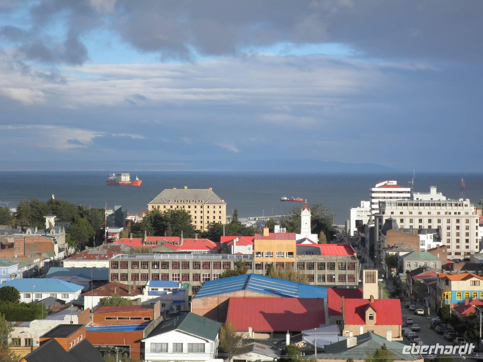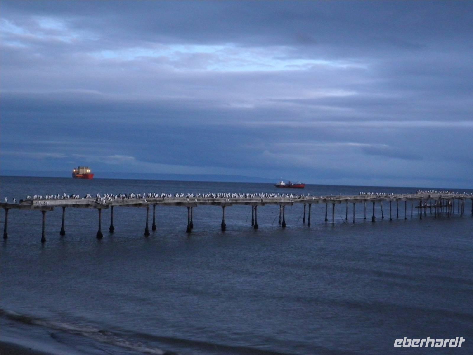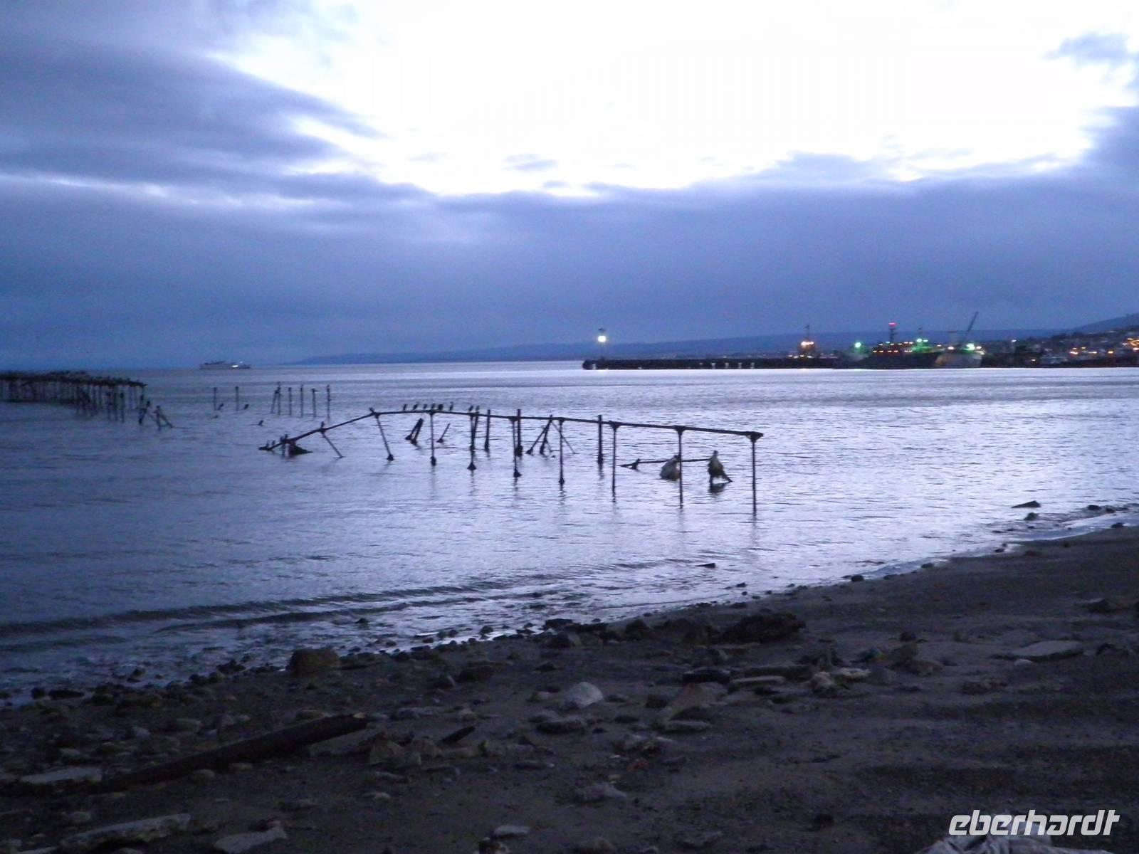 Gleich nach dem Frühstück verließen wir Valparaiso und fuhren zurück nach Santiago de Chile, aber nicht in die Stadt, sondern zum Flughafen. Denn jetzt sollte es weiter in Richtung Süden gehen, genauer nach Punta Arenas, der südlichsten Stadt auf unserer Reise. Sie befindet sich direkt an der Magellanstraße in Patagonien. Die Fahrt zum Flughafen verlief reibungslos, pünktlich konnten wir unser Gepäck abgeben und einchecken. Danach hatten wir noch etwas Zeit für Einkäufe oder um Geld zu tauschen. Unser Flugzeug landete noch einmal in Puerto Montt, wir stiegen nicht aus, sondern flogen weiter bis nach Punta Arenas. Dort angekommen, wurden wir von unserem Reiseleiter für die nächsten Tage empfangen: Eric. Gleich nachdem wir in unserem neuen Bus Platz genommen hatten, begann eine kleine Besichtigungstour durch die Stadt. Vom Aussichtspunkt Cerro La Luz aus hatten wir einen herrlichen Blick auf die Magellanstraße mit Feuerland dahinter. Auf einer kurzen Rundfahrt durch die Stadt erklärte uns Eric noch einiges Interessantes über Punta Arenas und seine Bewohner. An der Promenade der Magellanstraße hockten Hunderte Kormorane auf alten und zerfallenden Piers und schienen auf den Sonnenuntergang zu warten. Die Rundfahrt endete schließlich direkt am Hotel, das sich am Hauptplatz der Stadt befindet: an der Plaza de Armas. Im Zentrum dieses Platzes steht ein Denkmal für den berühmten Seefahrer Magellan, der die wichtige Seeverbindung einst entdeckt hat, die noch heute seinen Namen trägt: die Magellanstraße. Im Hotel angekommen wurden wir mit einem Pisco Sour begrüßt, dann bezogen wir alle unsere Zimmer und verbrachten den Abend jeder, wie er wollte. Einige bestellten sich ein sehr gutes Abendessen im Hotelrestaurant, andere machten noch einen abendlichen Spaziergang, bevor wir an diesem Abend erschöpft zu Bett gingen, in unserem komfortablen Hotel.