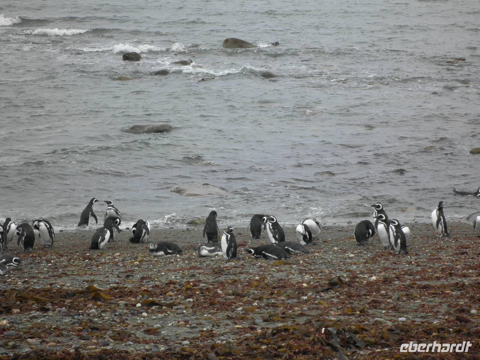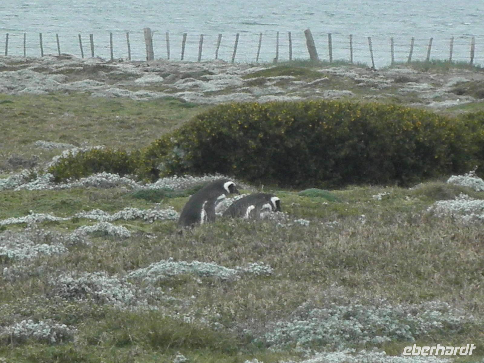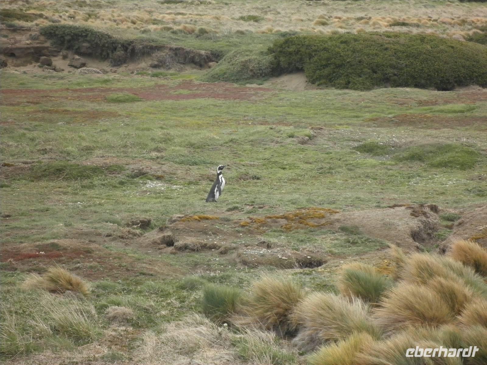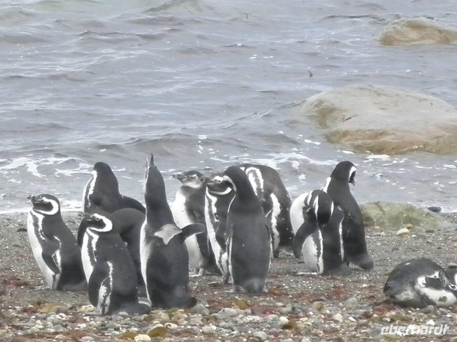 Nach einem Rundgang über den parkähnlich angelegten Friedhof verließen wir schließlich Punta Arenas und fuhren hinaus in die Natur. Schnell lag die Stadt hinter uns. Unser nächstes Ziel war Seno Otway, eine Pinguinkolonie. Zunächst waren wir skeptisch, ob wir überhaupt die dort nistenden Magellanpinguine zu sehen bekämen, denn unser Reiseleiter Eric hatte uns erzählt, dass wir mit viel Glück vielleicht einen oder zwei der possierlichen schwarz-weißen Vögel sehen könnten. Die meiste Zeit des Tages verbringen die Eltern in den Bruthöhlen, die in Seno Otway überall zwischen Gras und flachem Gebüsch zu entdecken sind. Dazwischen gibt es Pfade, die die Pinguine benutzen, um zum Wasser zu gelangen, um Futter für den Nachwuchs zu holen. Das würden sie aber nur am frühen Morgen und am Abend tun. Wir waren dort am späten Vormittag, also hatten wir so unsere Zweifel. Wir spazierten auf festgelegten Wegen durch das Gebiet der Nisthöhlen. Nicht einen Pinguin konnten wir entdecken. Schließlich kamen wir in die Nähe des Ufers, wo ein Ausschau aus Holz aufgebaut worden war. Als wir durch die Fensteröffnungen schauten, konnten wir unseren Augen erst gar nicht trauen: mehr als 40 Magellanpinguine hielten sich am Ufer der Bucht direkt vor uns auf. Sie lagen auf dem Boden oder putzten sich, um ihr Gefieder zu trocknen, bevor sie wieder in die Bruthöhlen wanderten. Einige tummelten sich im Wasser, wenn sie wieder an Land watschelten, schüttelten sie ihre schmalen Flügel aus, was sehr putzig aussah. Wir beobachteten und fotografierten, konnten uns kaum trennen von ihrem Anblick. Aber schließlich mussten wir gehen, auf unserem Rückweg entdeckten wir sogar noch den ein oder anderen Pinguin, der auf den ausgetretenen Pfaden zwischen den Bruthöhlen unterwegs war. Was für ein Vormittag!