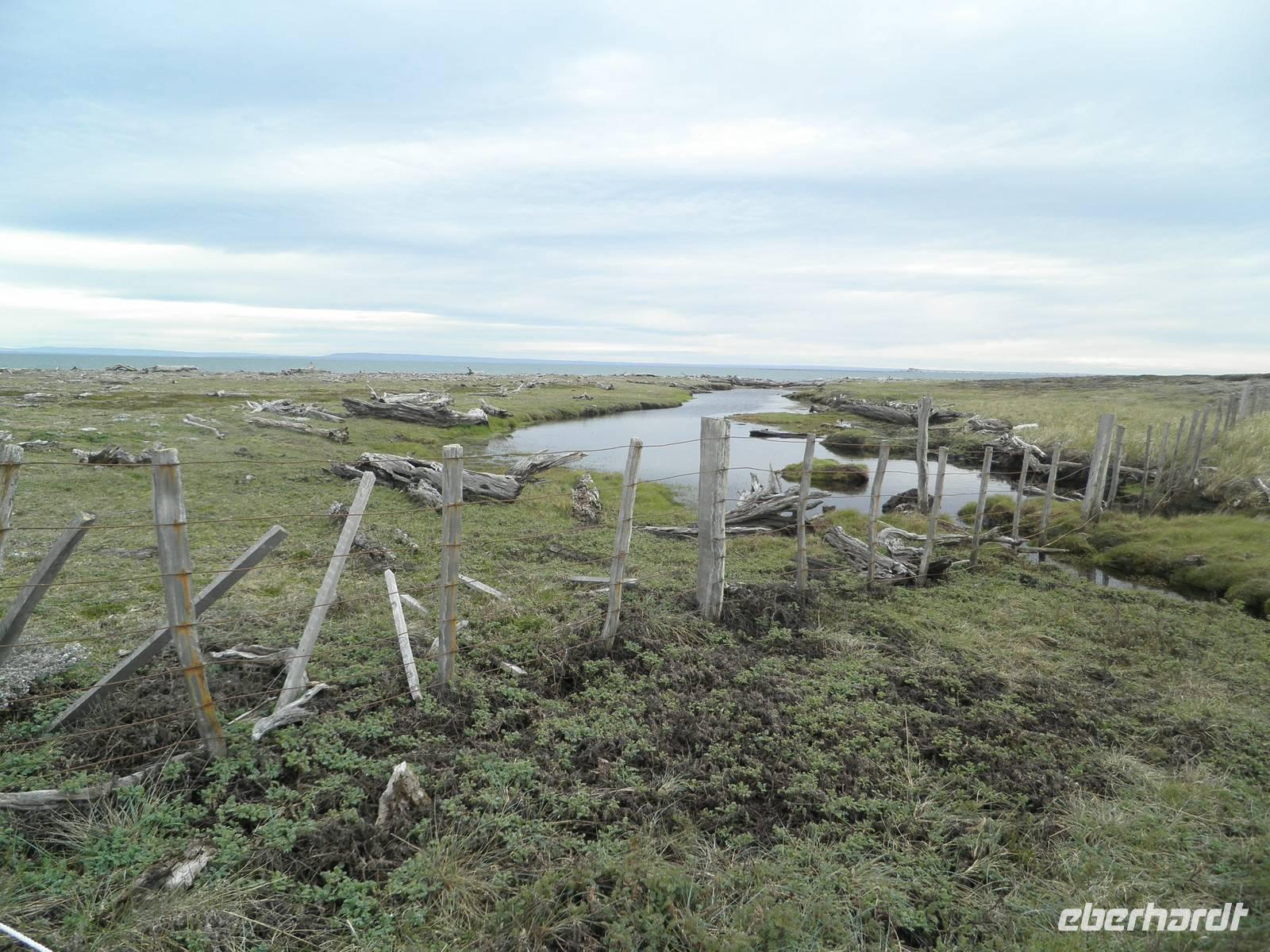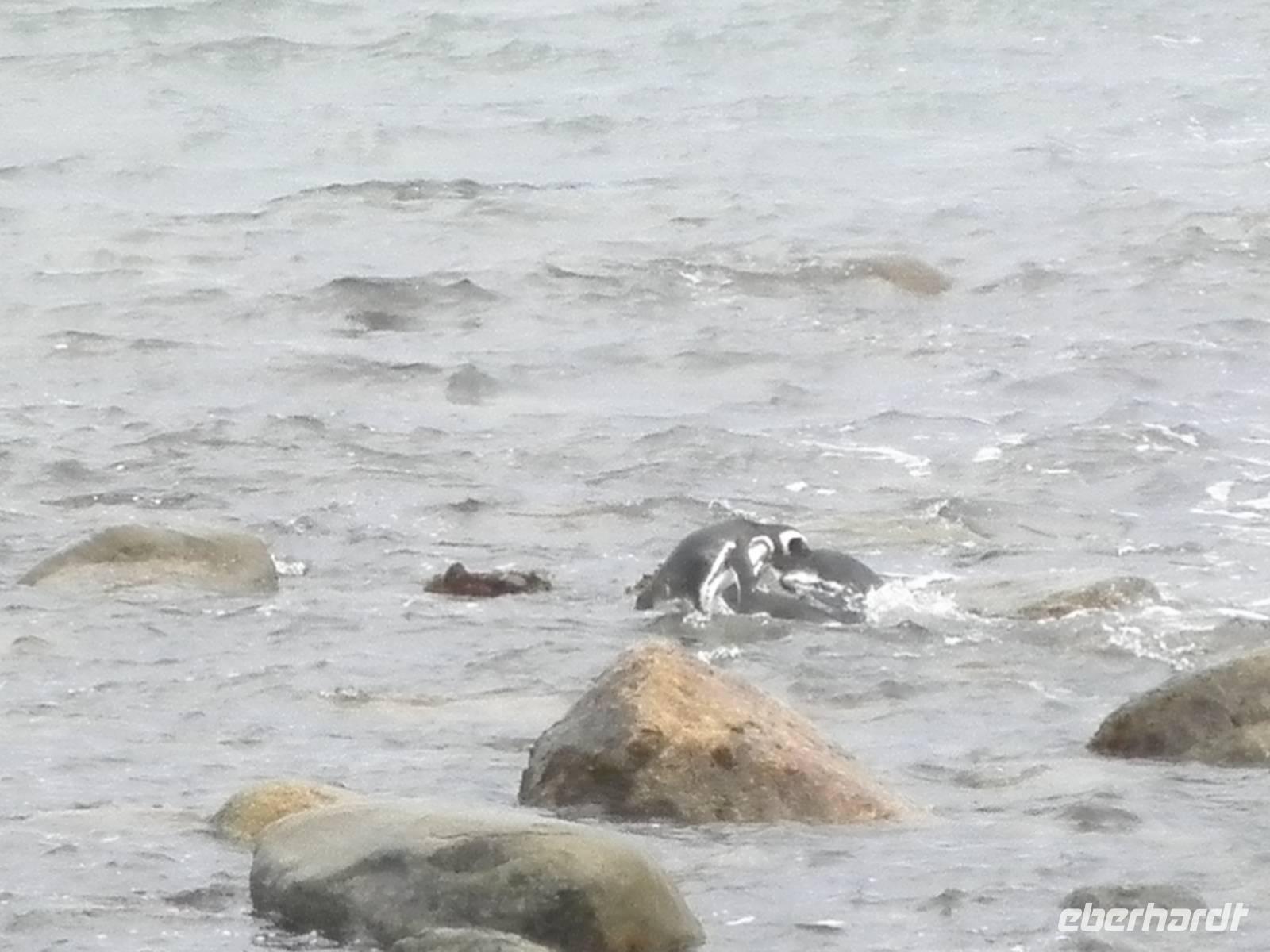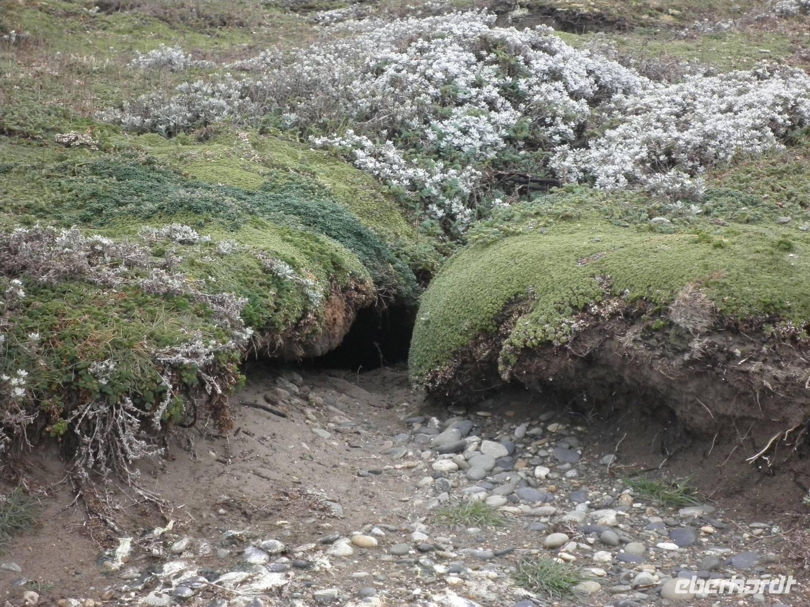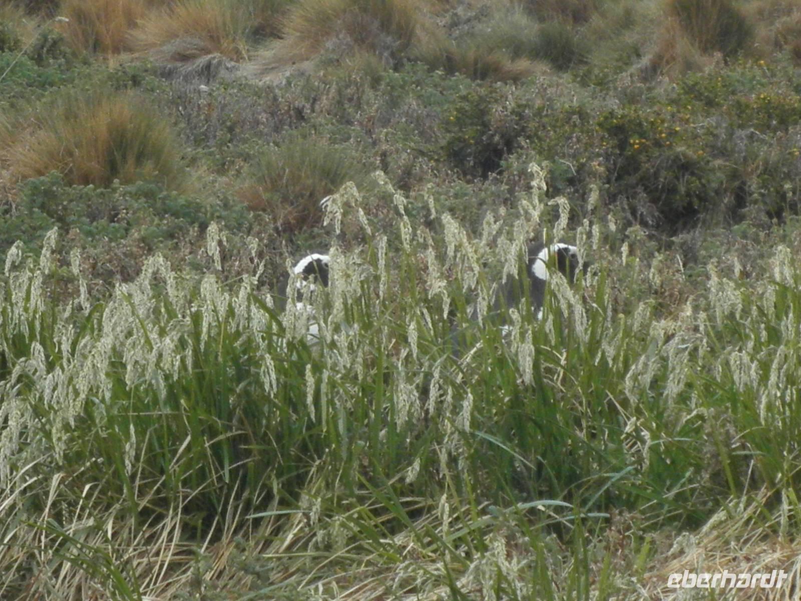 Nach einem Rundgang über den parkähnlich angelegten Friedhof verließen wir schließlich Punta Arenas und fuhren hinaus in die Natur. Schnell lag die Stadt hinter uns. Unser nächstes Ziel war Seno Otway, eine Pinguinkolonie. Zunächst waren wir skeptisch, ob wir überhaupt die dort nistenden Magellanpinguine zu sehen bekämen, denn unser Reiseleiter Eric hatte uns erzählt, dass wir mit viel Glück vielleicht einen oder zwei der possierlichen schwarz-weißen Vögel sehen könnten. Die meiste Zeit des Tages verbringen die Eltern in den Bruthöhlen, die in Seno Otway überall zwischen Gras und flachem Gebüsch zu entdecken sind. Dazwischen gibt es Pfade, die die Pinguine benutzen, um zum Wasser zu gelangen, um Futter für den Nachwuchs zu holen. Das würden sie aber nur am frühen Morgen und am Abend tun. Wir waren dort am späten Vormittag, also hatten wir so unsere Zweifel. Wir spazierten auf festgelegten Wegen durch das Gebiet der Nisthöhlen. Nicht einen Pinguin konnten wir entdecken. Schließlich kamen wir in die Nähe des Ufers, wo ein Ausschau aus Holz aufgebaut worden war. Als wir durch die Fensteröffnungen schauten, konnten wir unseren Augen erst gar nicht trauen: mehr als 40 Magellanpinguine hielten sich am Ufer der Bucht direkt vor uns auf. Sie lagen auf dem Boden oder putzten sich, um ihr Gefieder zu trocknen, bevor sie wieder in die Bruthöhlen wanderten. Einige tummelten sich im Wasser, wenn sie wieder an Land watschelten, schüttelten sie ihre schmalen Flügel aus, was sehr putzig aussah. Wir beobachteten und fotografierten, konnten uns kaum trennen von ihrem Anblick. Aber schließlich mussten wir gehen, auf unserem Rückweg entdeckten wir sogar noch den ein oder anderen Pinguin, der auf den ausgetretenen Pfaden zwischen den Bruthöhlen unterwegs war. Was für ein Vormittag!