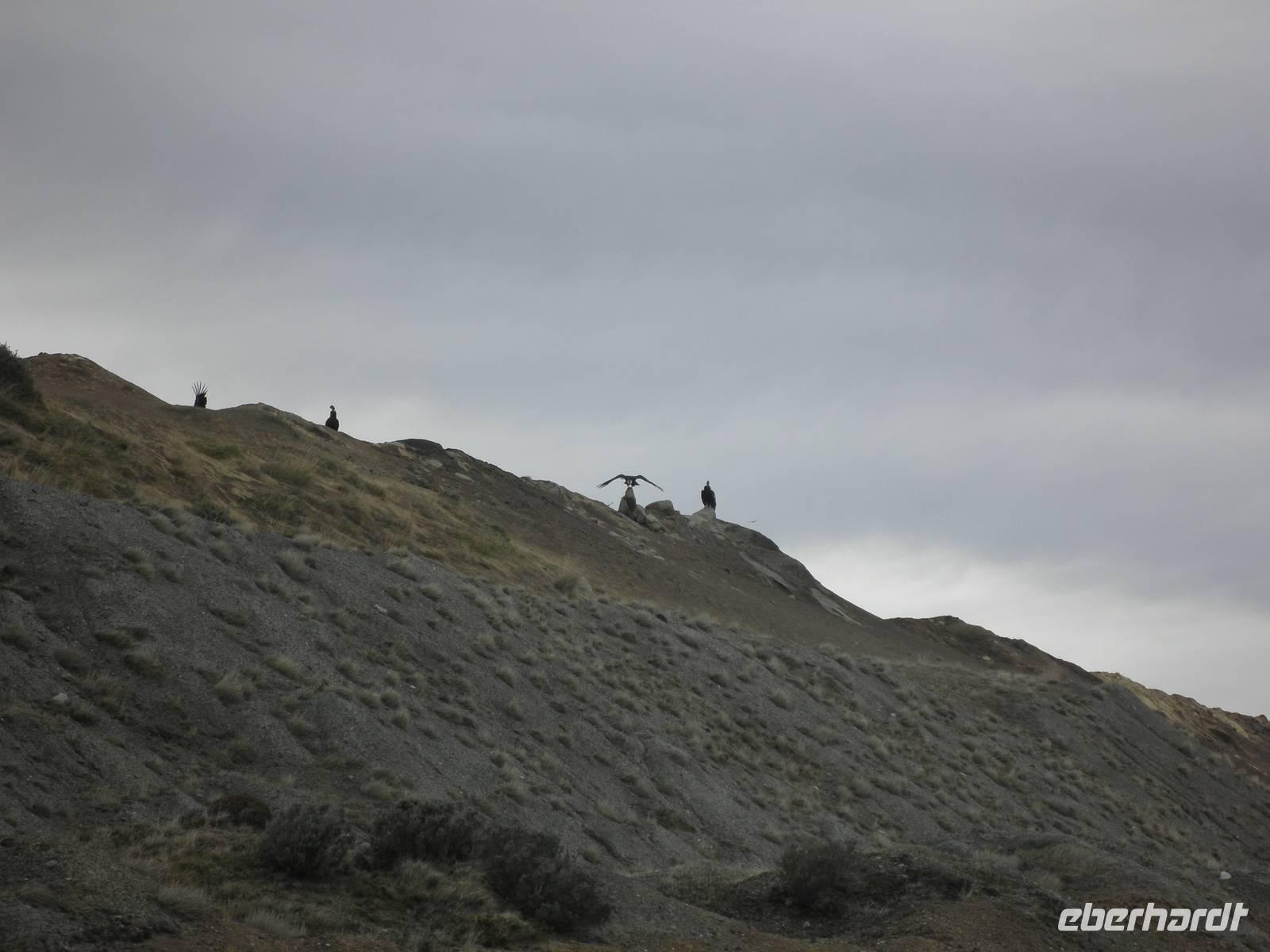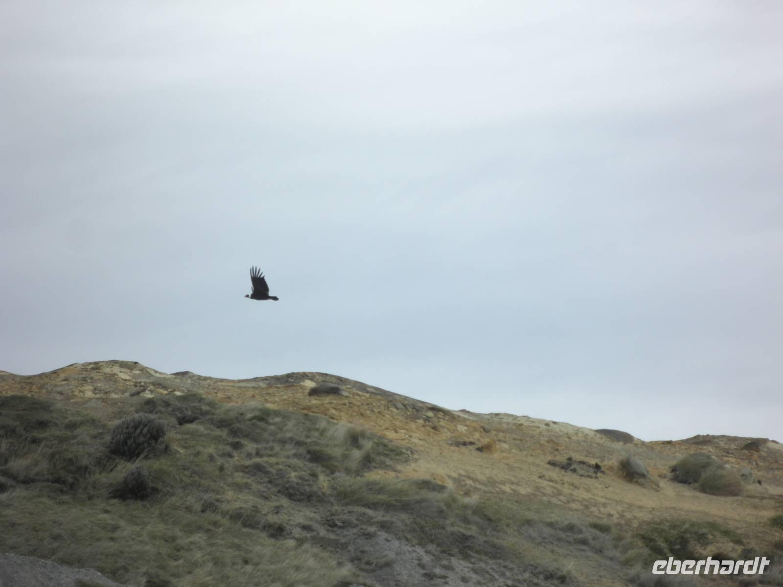 Noch beeindruckt von diesem Erlebnis fuhren wir bald weiter durch die nur karg bewachsene Steppe. Nicht lange und wir hielten an, weil unser aufmerksamer Busfahrer einen Condor in der Luft bemerkt hatte. Nachdem wir ausgestiegen waren, entdeckten wir noch weitere dieser imposanten Vögel mit einer Spannweite von bis zu 3 m, die auf den Felsen neben unserem Weg saßen. Als wir gerade unsere Kameras bereit hatten, flogen sie einer nach dem anderen an uns vorbei und wir bekamen so eine einmalige Gelegenheit, den Condor in der Luft über der patagonischen Steppe zu fotografieren. Ein besonderes Erlebnis.