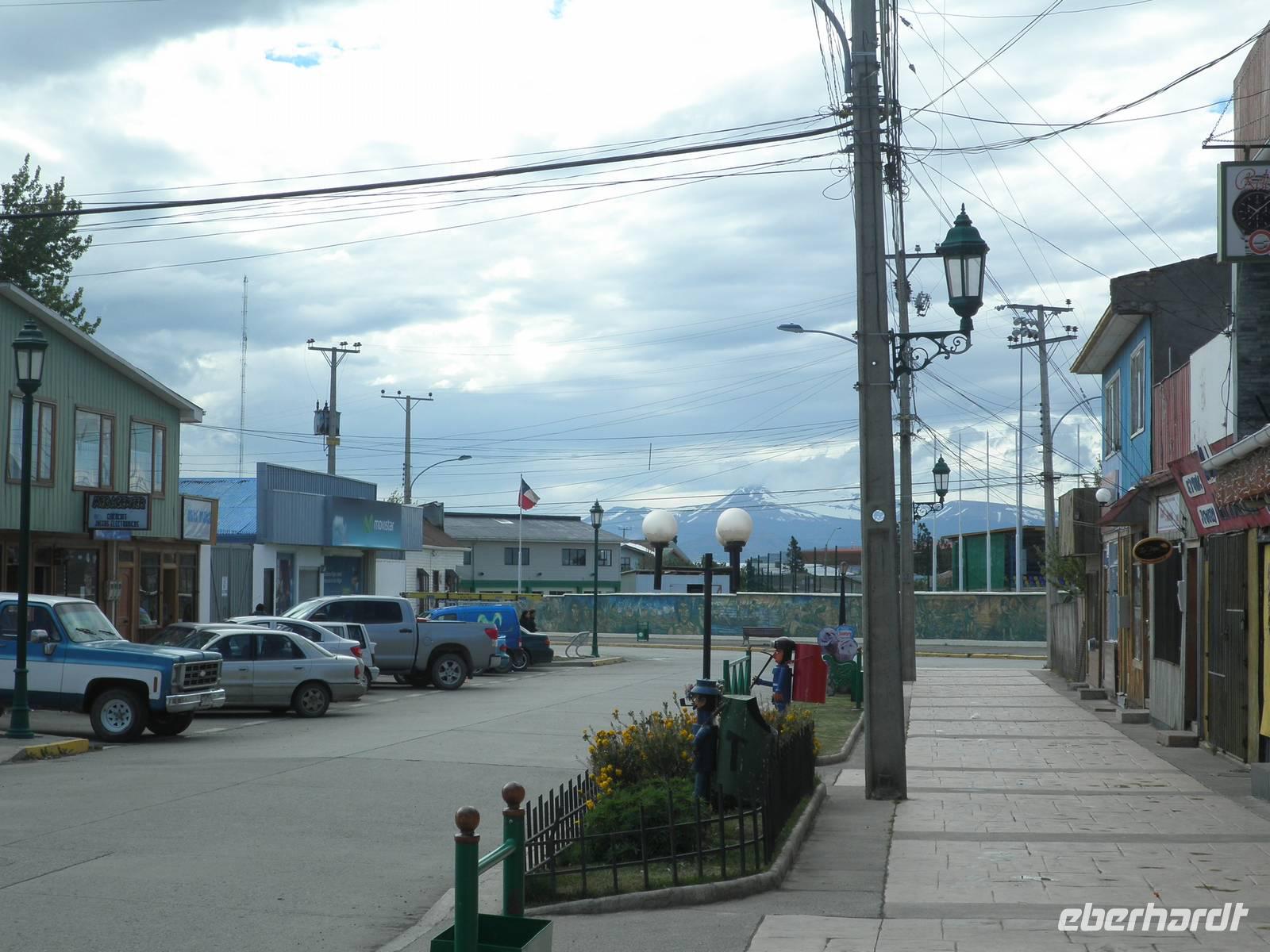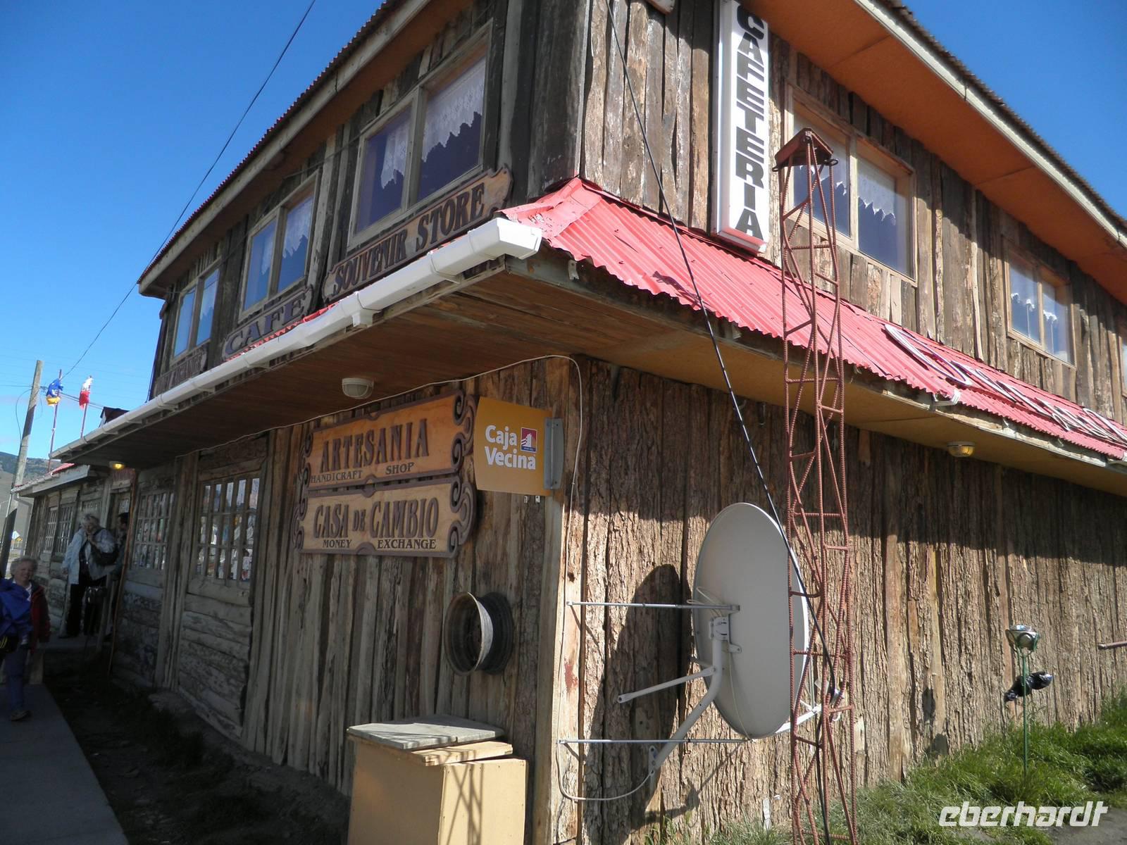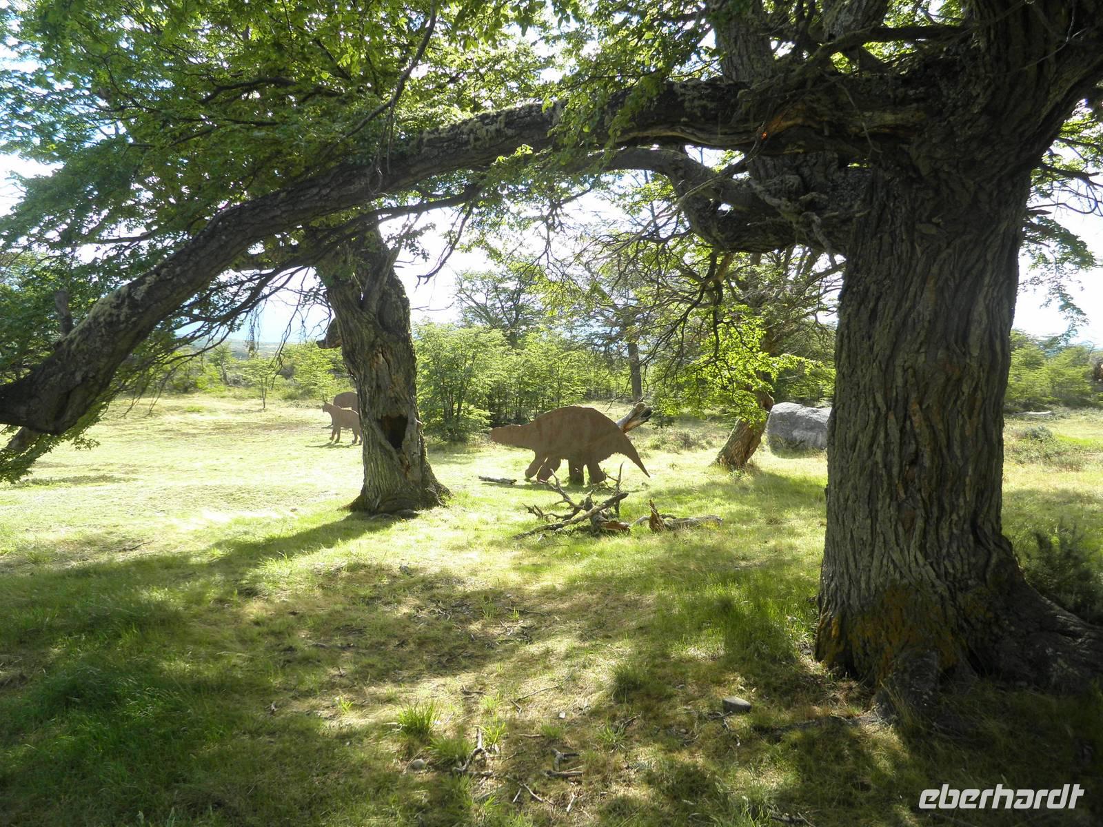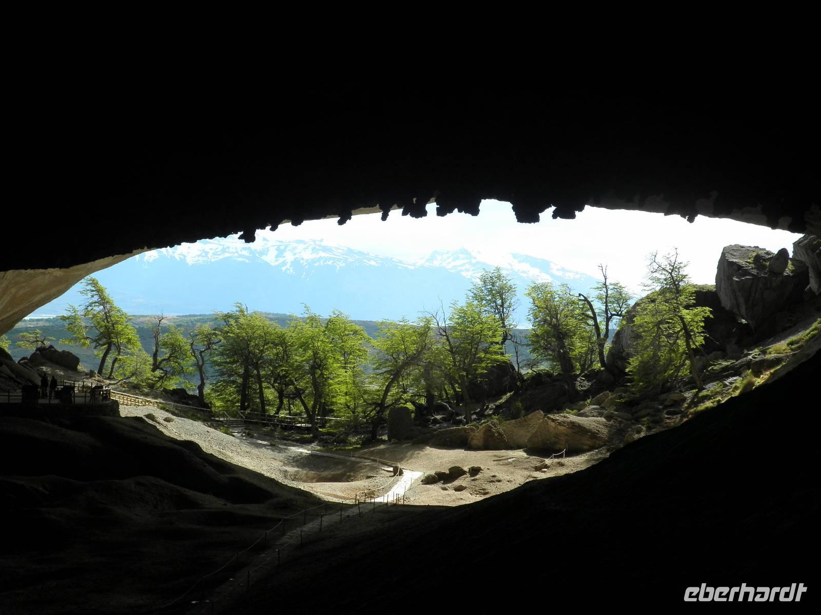 In Puerto Natales machten wir Mittagspause. Wir hatten Gelegenheit, noch Einkäufe zu erledigen, etwas zu essen oder Geld zu tauschen. Schon im Ort fiel uns ein seltsam auf zwei Beinen stehender Bär aus Holz auf, der einen sehr langen schmalen Kopf hatte. Dieser stand unter anderem vor einem der Geschäfte, in denen landestypische Souvenirs verkauft werden. Wir mussten nicht lange warten, um zu erfahren, um was für ein seltsames Tier es sich dabei handelte. Ganz in der Nähe von Puerto Natales hatte ein Deutscher namens Eberhard vor vielen Jahren die Überreste eines Milodons (oder Mylodon) entdeckt, ein Tier aus der Urzeit, das neben kleinen Urpferden und anderen heute ausgestorbenen Wesen hier gelebt hatte. Die Überreste hatten sich in einer Höhle befunden, die vor Tausenden von Jahren durch die Brandung eines Sees ausgespült worden war. Dieser See existiert heute nicht mehr, aber die Höhle, die besucht werden kann. Bei herrlichem Wetter besichtigten auch wir diese Höhle, erfuhren viel über das Leben des Milodons, ausgestorbene Arten und die Pflanzen, die in der Umgebung zu finden sind.