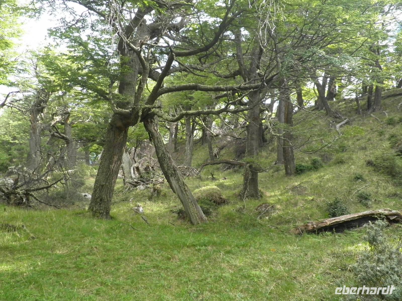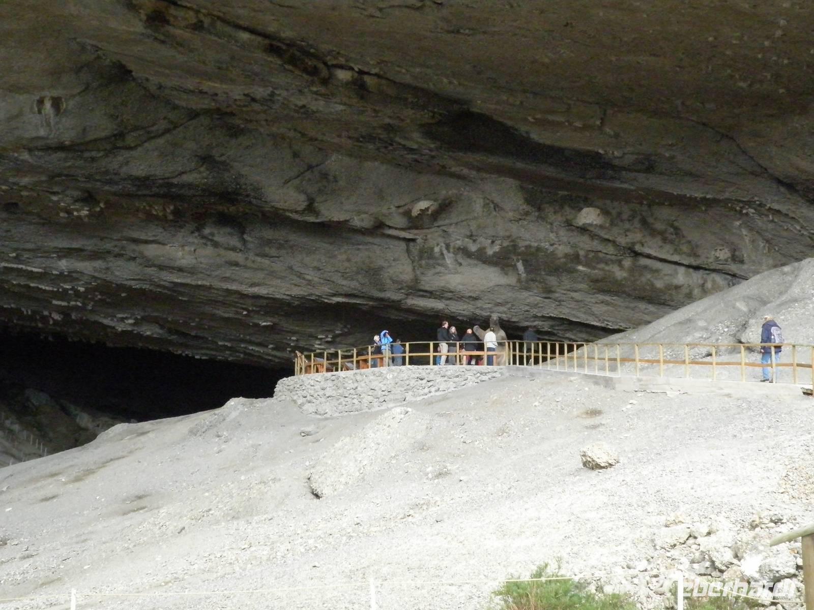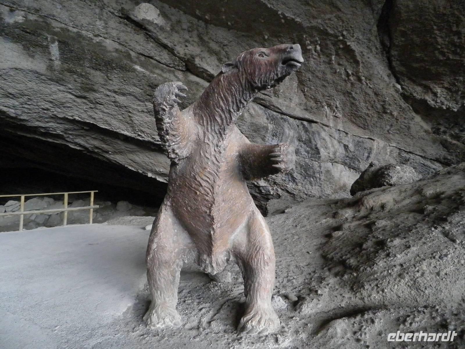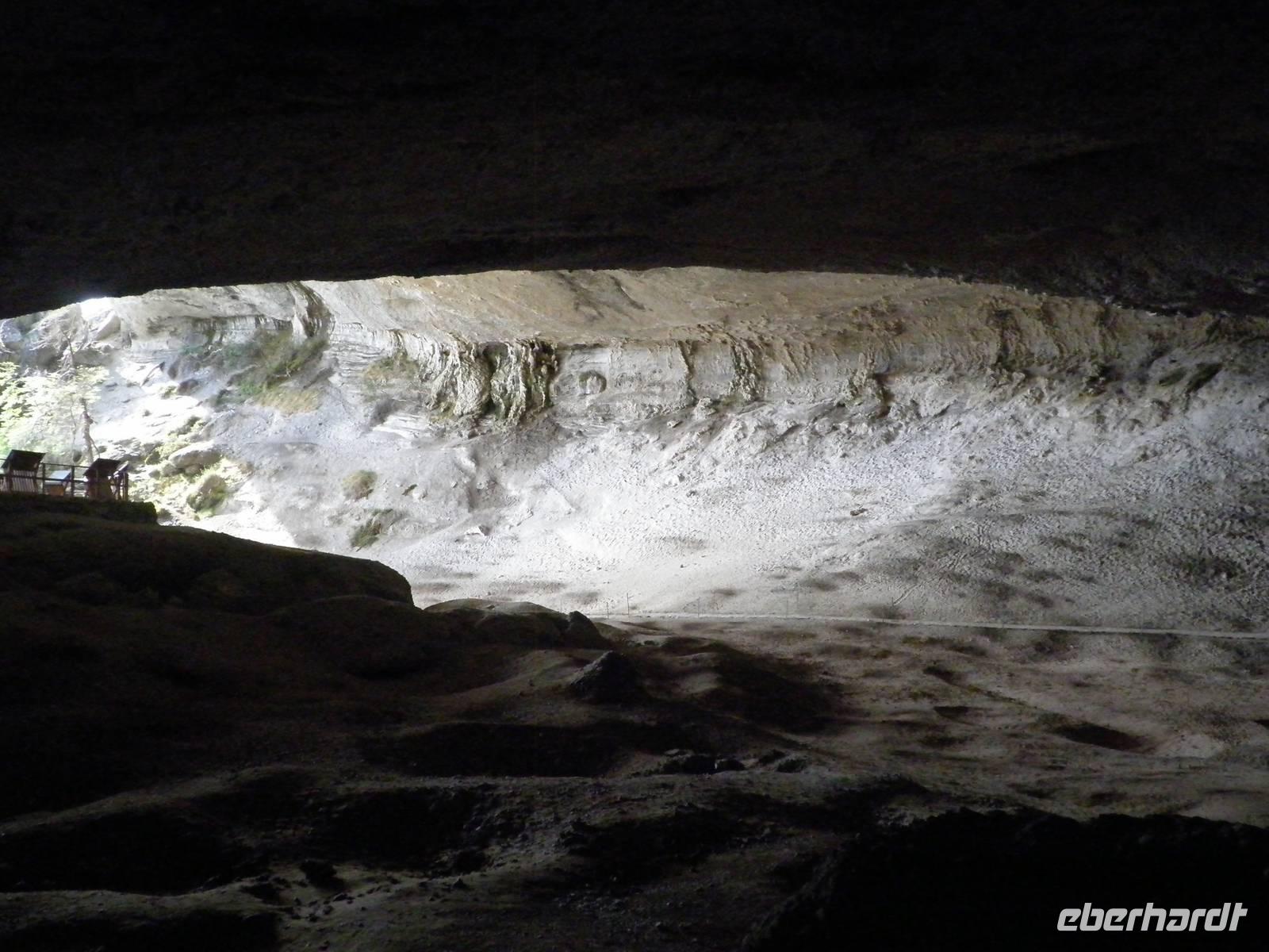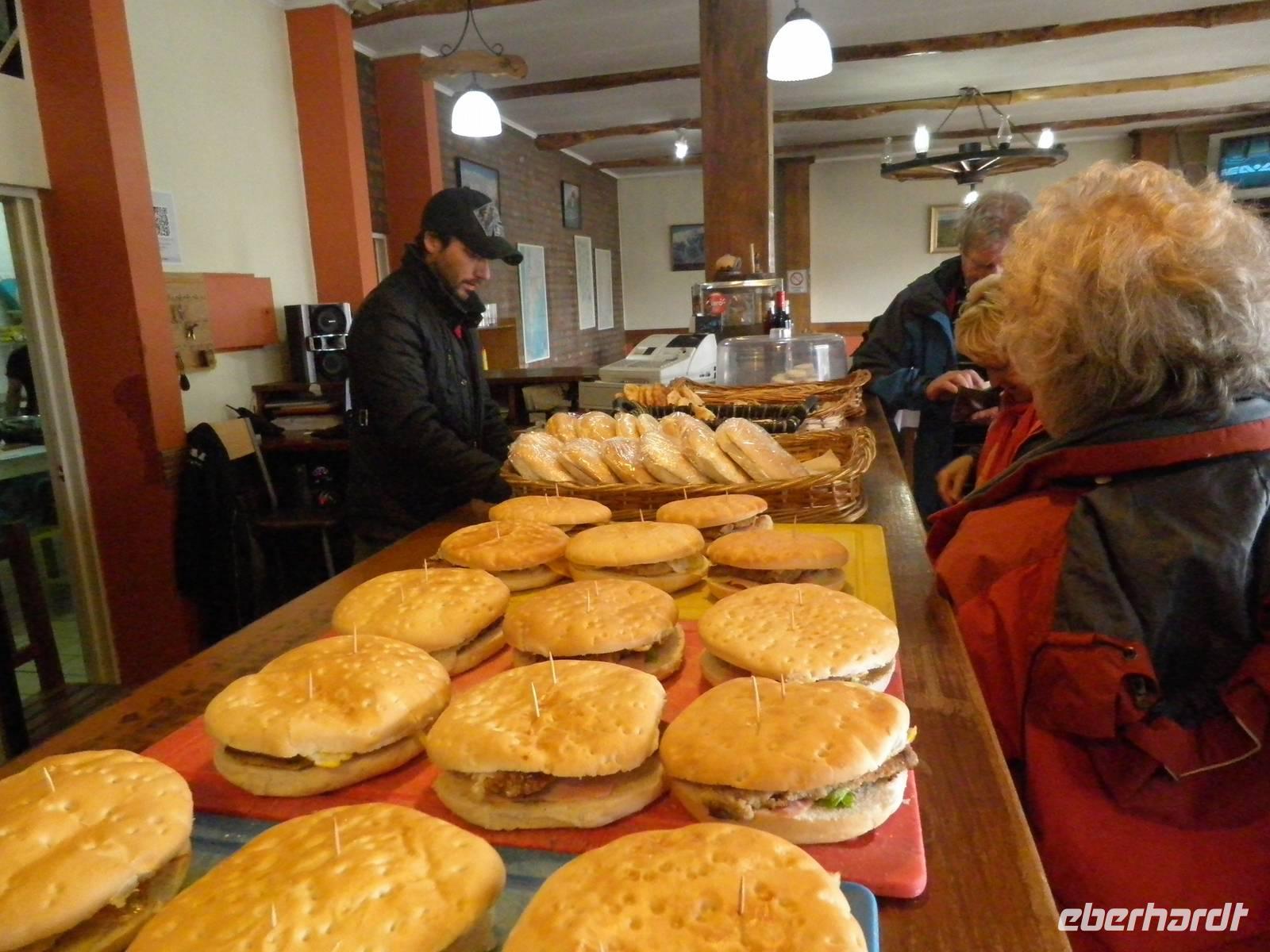In Puerto Natales machten wir Mittagspause. Wir hatten Gelegenheit, noch Einkäufe zu erledigen, etwas zu essen oder Geld zu tauschen. Schon im Ort fiel uns ein seltsam auf zwei Beinen stehender Bär aus Holz auf, der einen sehr langen schmalen Kopf hatte. Dieser stand unter anderem vor einem der Geschäfte, in denen landestypische Souvenirs verkauft werden. Wir mussten nicht lange warten, um zu erfahren, um was für ein seltsames Tier es sich dabei handelte. Ganz in der Nähe von Puerto Natales hatte ein Deutscher namens Eberhard vor vielen Jahren die Überreste eines Milodons (oder Mylodon) entdeckt, ein Tier aus der Urzeit, das neben kleinen Urpferden und anderen heute ausgestorbenen Wesen hier gelebt hatte. Die Überreste hatten sich in einer Höhle befunden, die vor Tausenden von Jahren durch die Brandung eines Sees ausgespült worden war. Dieser See existiert heute nicht mehr, aber die Höhle, die besucht werden kann. Bei herrlichem Wetter besichtigten auch wir diese Höhle, erfuhren viel über das Leben des Milodons, ausgestorbene Arten und die Pflanzen, die in der Umgebung zu finden sind.