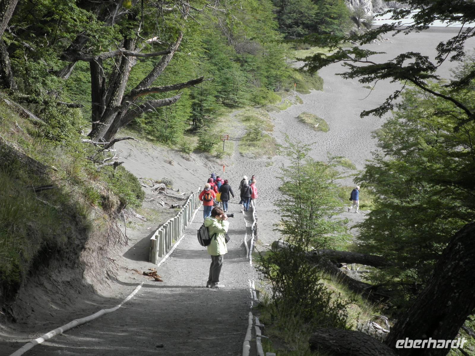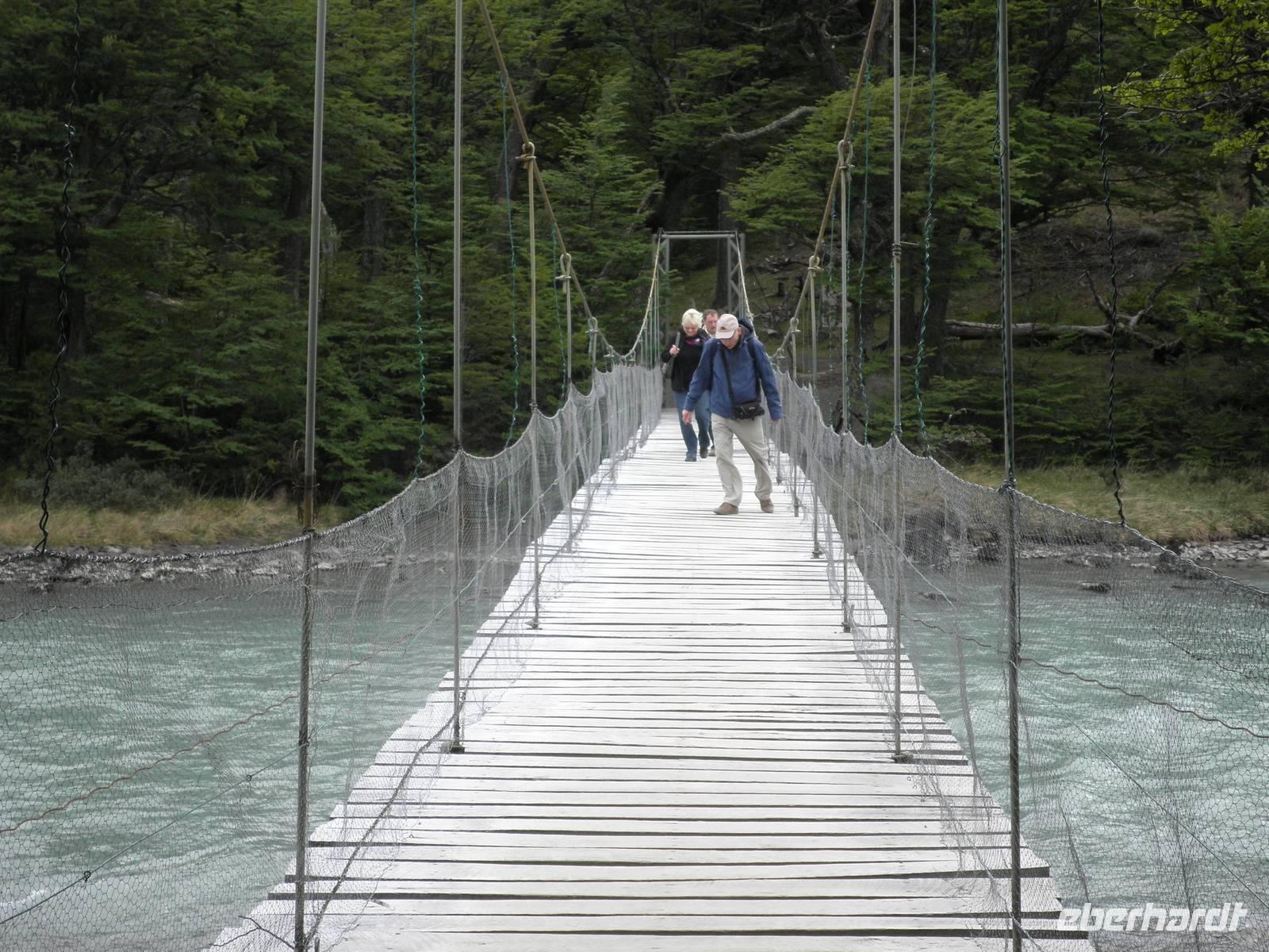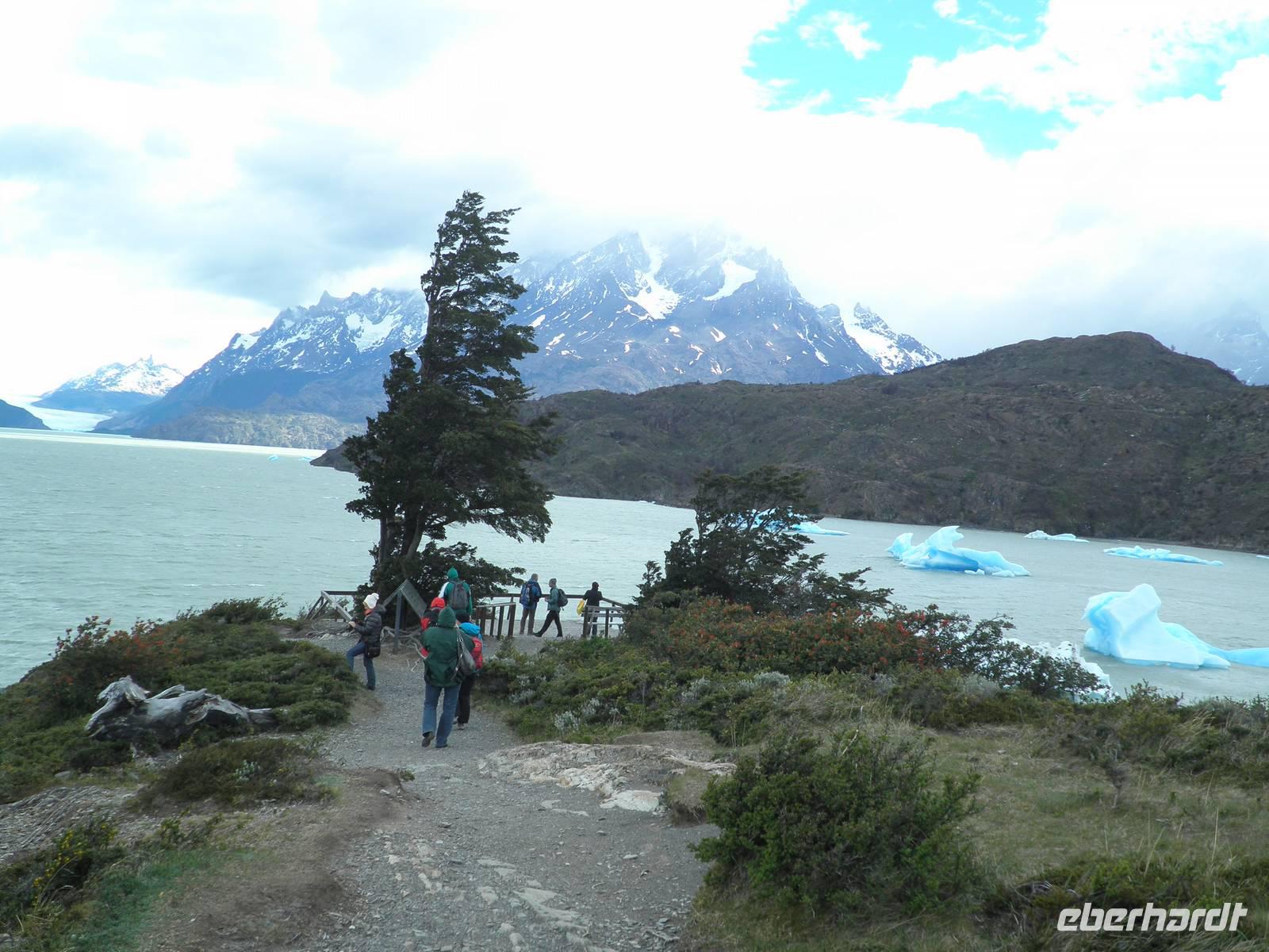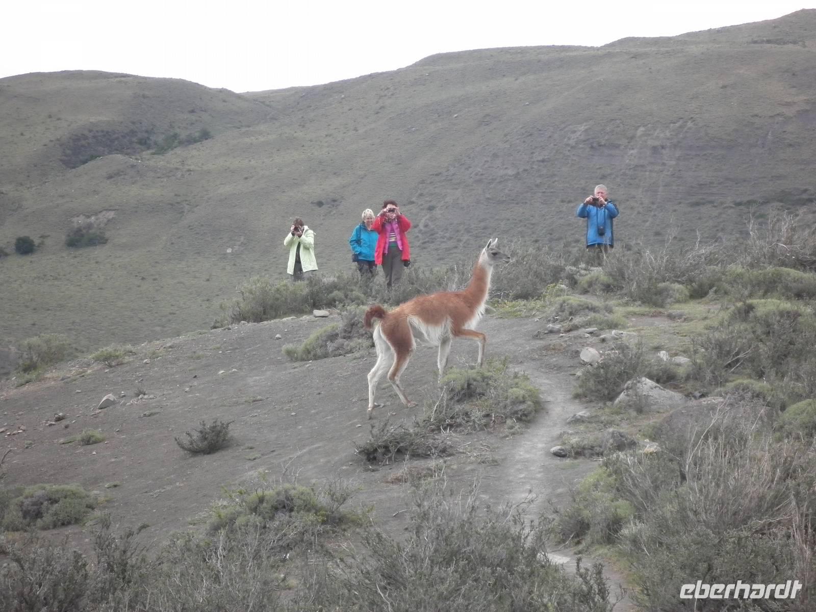 Der heutige Tag war ganz dem Nationalpark Torres del Paine gewidmet. Nach einem ausgiebigen Frühstück verließen wir mit unserem Bus das Hotel und fuhren in Richtung Lago Grey mit dem Grey Gletscher. Auf dem Weg dahin hielten wir mehrere Male an, um Fotos von der beeindruckenden Landschaft um uns herum zu machen. Wir sahen auch Guanakos und machten Bekanntschaft mit dem Calafate-Busch, der eine Art der Berberitze ist. In der Nähe des Lago Grey parkte unser Bus und wir wanderten in Richtung seines Ufers. Zunächst überquerten wir eine schwankende Brücke aus Holzplanken, die durch den Wind und unsere Schritte ziemlich in Bewegung geriet und unter uns rauschte das Wasser hindurch. Nach kurzer Wanderung durch einen Wald erreichten wir das Ufer des Lago Grey und staunten gewaltig. Auf dem milchig grauen Wasser schwammen Eisberge, die uns in strahlendem Hellblau entgegenschimmerten. Wir fotografierten und waren begeistert. Am Ufer des Sees entlang spazierten wir weiter, kämpften gegen den Wind, der uns ziemlich durchblies, staunten über die Eisberge. Einige von uns sammelten ein paar Steine, die am Ufer angespült worden waren, ein Souvenir an ein unvergessliches Erlebnis. Am Rand des Ufers erhob sich eine Felsformation, an deren Rand ein Wanderweg hinauf zum Aussichtspunkt führte, von wo man einen sensationellen Blick auf den Grey Gletscher haben sollte. Die meisten von uns entschlossen sich, den Aufstieg zu wagen und wurden einige Zeit später belohnt mit diesem Anblick: der Grey Gletscher, der seine Eisfracht portioniert in mehr oder weniger großen Eisbergen in den Lago Grey entlässt, jene hellblau strahlenden Eisformationen, die wir schon vorher gesehen hatten. Am Aussichtspunkt angelangt, hielten wir dieses unvergessliche Erlebnis auf zahlreichen Fotos fest. Der Wind blies ordentlich, so dass wir ziemlich zerzaust den Rückweg antraten, aber glücklich über die herrliche Aussicht, die wir auf den Gletscher gehabt hatten.