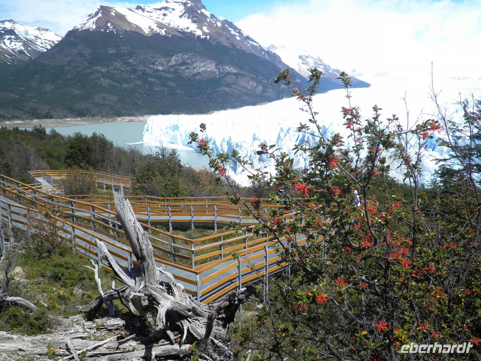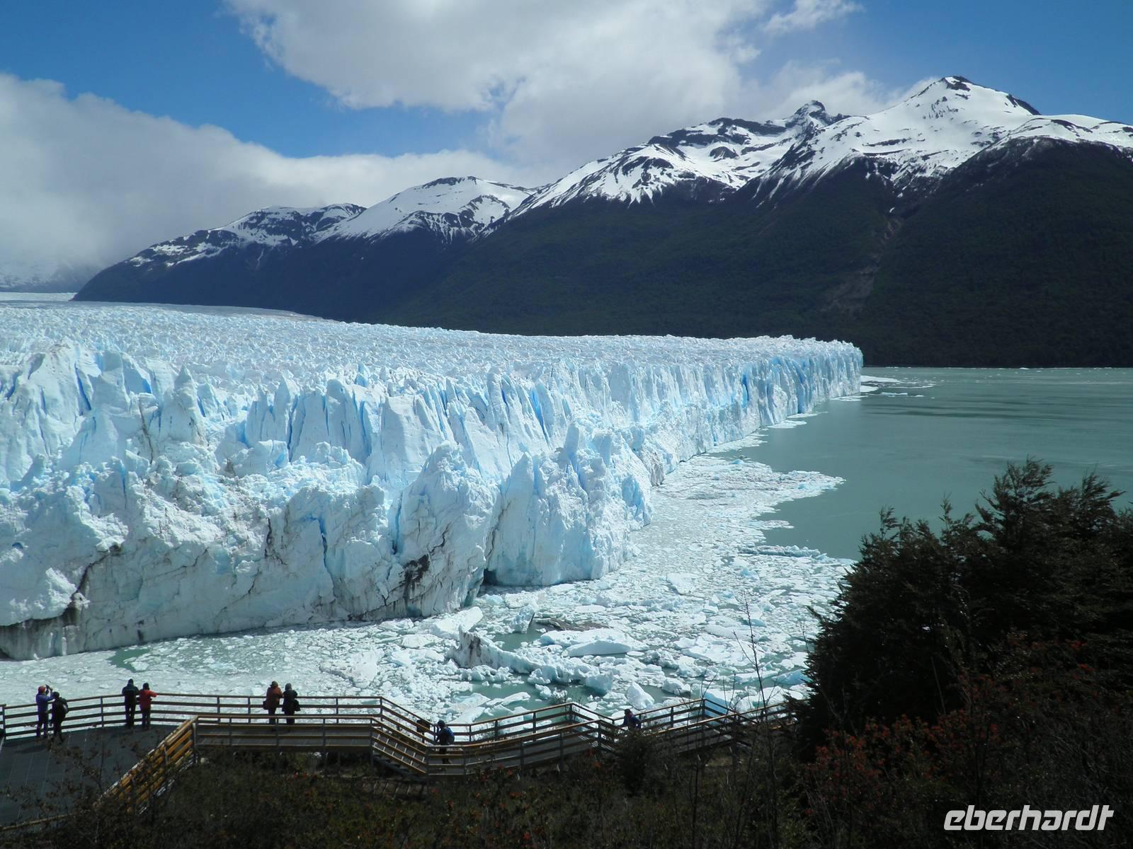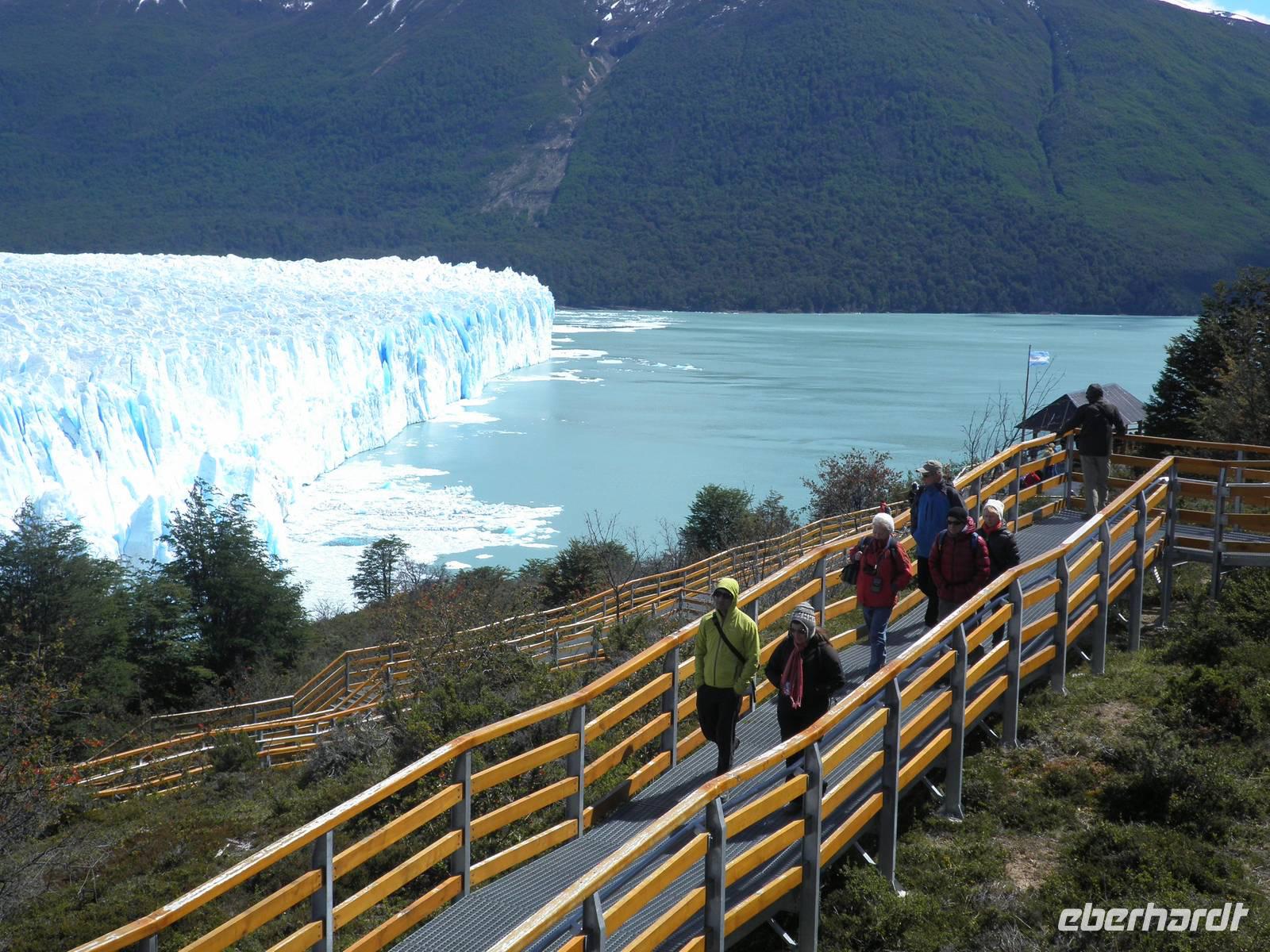 Das Programm für heute sollte uns in den argentinischen Nationalpark Los Glaciares führen, ein besonderer Höhepunkt unserer Reise. Vanessa, unsere Reiseleiterin für diesen Ausflug, erwartete uns am Morgen schon in unserem Bus. Wir fuhren aus der Stadt Calafate hinaus, hielten an einer Lagune, an der Flamingos standen und fraßen, und erreichten schließlich nach etwa 1 Stunde Fahrt den Eingang zum Nationalpark. Einige Gäste hatten das Glück, sogar einen dort heimischen Papagei mit grün- rotem Gefieder zu entdecken. Als der berühmte Perito Moreno Gletscher in Sicht kam, hielt unser Bus, damit wir einen ersten überwältigenden Blick hinüber genießen konnten. Natürlich wurden unzählige Fotos gemacht. Bei einer Schifffahrt an die Abbruchkante des Gletschers konnten wir uns von der ungeheuren Eismenge selbst überzeugen. Hellblau strahlten riesige Eisformationen, wir genossen einen Whisky mit reinem Gletschereis während unserer Bootsfahrt und hatten viel Spaß dabei, uns damit zuzuprosten. Nachdem wir wieder an Land gegangen waren, besuchten wir noch eine besondere Attraktion am Gletscher: Ein ausgefeiltes Wegesystem mit mehreren Aussichtsbalkonen auf den riesigen Gletscher. Wir verbrachten herrliche zwei Stunden auf den verschiedenen Balkonen und genossen die Sonnenstrahlen. Wenn man ein windgeschütztes Plätzchen entdeckt hatte, konnte man nicht anders, als die Zeit hier zu genießen. Danach fuhren wir zurück nach El Calafate. Am Abend besuchten wir ein anderes Restaurant in der Nachbarschaft unserer Hostería. Dort aßen wir frisch auf dem Grill zubereitetes Lammfleisch und Rindersteaks. Zur besonderen Atmosphäre trug das offene Feuer bei, das wir durch Glasscheiben geschützt direkt neben unserem Tisch beobachten konnten. Rund herum um die Glut waren die zu grillenden Lammhälften aufgestellt worden. Sie werden also über dem offenen Feuer gegrillt. Asado nennt auch hier diese Art der Zubereitung. Wir ließen es uns schmecken, einige probierten Wein, andere ortstypische Biersorten. Es wurde ein gemütlicher Abend, den wir nach den beeindruckenden Naturerlebnissen des heutigen Tages sehr genossen.