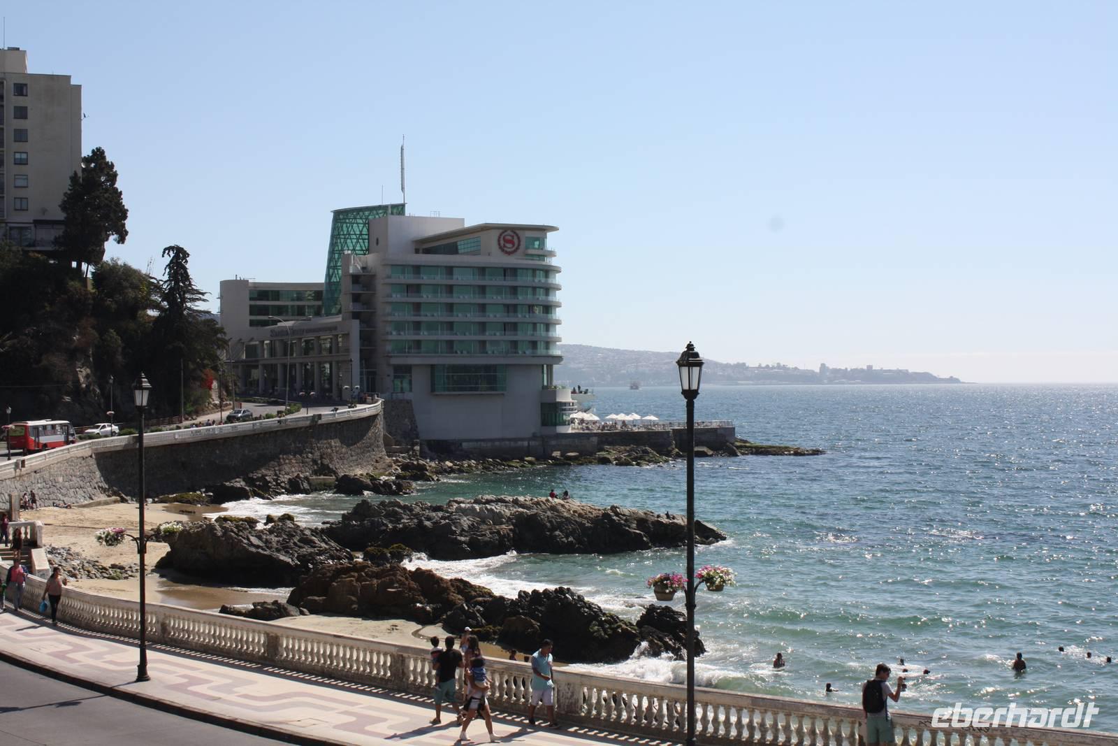 Nach einem ausgiebigen Frühstück im Hotel starteten wir um 9 Uhr mit Bhavito etwa 150 Kilometer in Richtung Süden zum Küstenort Isla Negra. Hier liegt das idyllische Strandhaus des chilenischen Nationaldichters Pablo Neruda. Die Sonne schien und wir hatten noch ein wenig Zeit vor unserer reservierten Besichtigung, so dass wir alle zusammen an den Strand hinunter gelaufen sind und die Aussicht genossen haben. Etliche Vögel waren zu sehen und eine Unmenge an Algen am Strand. Wir spazierten eine Weile den Strand entlang und hatten anschließend den Rundgang durch das Strandhaus. Hier waren wir unter anderem von der wundervollen Lage direkt am Meer begeistert! Am frühen Nachmittag machten wir uns auf nach Vina del Mar, dem Nachbarort von Valparaiso. Hier erwartete man uns in einem tollen Restaurant am Meer, wo wir sehr gut zu Mittag speisten. Zum späten Nachmittag fuhren wir, mit einem kleinen Abstecher am Fischereihafen, zum gebuchten Hotel „Ultramar" am Stadtrand von Valparaiso. Ein Teil der Gruppe unternahm am Abend noch einen gemütlichen Bummel durch die verwinkelten Gassen und freute sich auf ein kühles Bier.