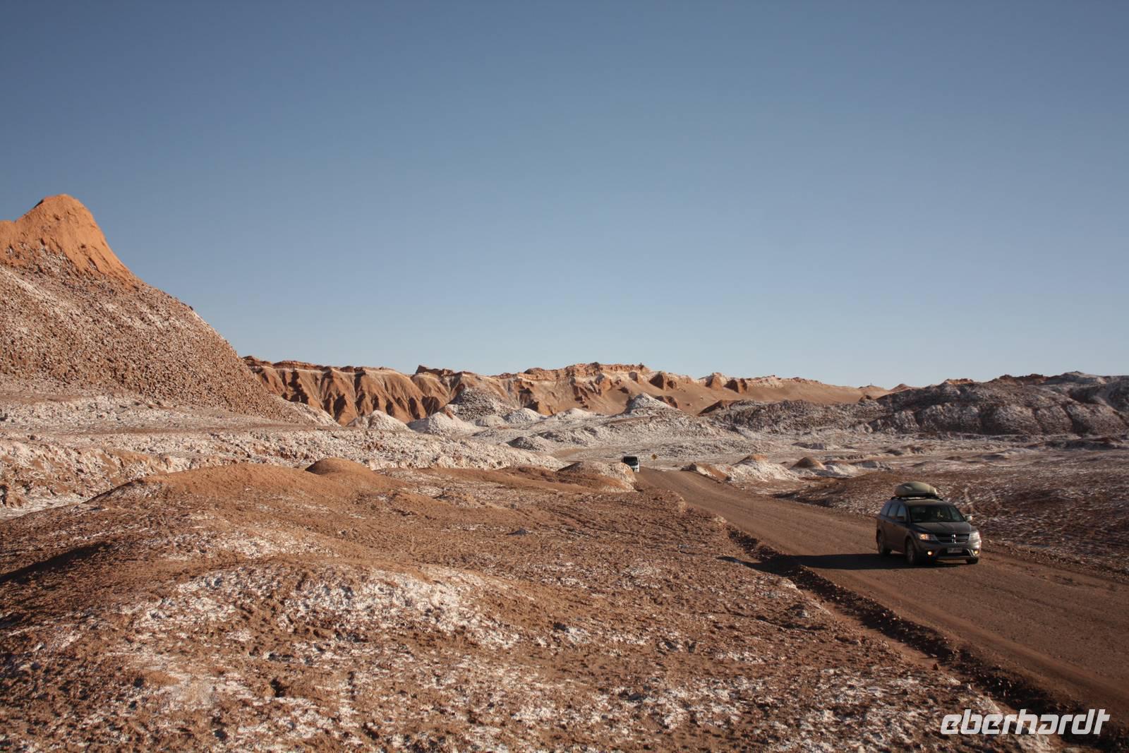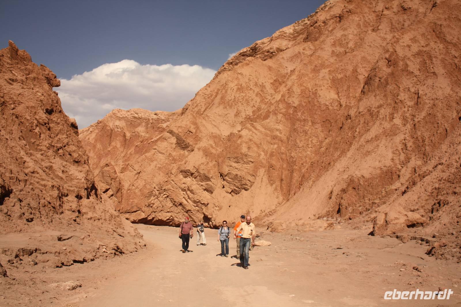 Gegen Mittag kamen wir im Hotel an und konnten auch schon unsere Zimmer beziehen. Kurze Zeit später gingen wir alle zusammen auf einen ersten Erkundungsgang durch den Ort und kehrten in einem netten Lokal zum Mittagessen ein. Danach ruhten wir uns noch ein wenig im Hotel aus und genossen die ruhige Atmosphäre am Pool. Pünktlich um 17 Uhr holte uns Claudia wieder vom Hotel ab und wir fuhren zur Teufelsschlucht. Hier machten wir einen Spaziergang durch die mehr als karge und trockene Landschaft und fuhren dann weiter zum Valle de la Luna - dem Mondtal. Auf etwa 2.300 Höhenmeter stoppten wir an einem Aussichtspunkt und genossen den Sonnenuntergang. Als die Sonne untergetaucht war, servierte uns Claudia einen leckeren Cocktail mit Häppchen am Bus, die wir in Windeseile verzehrten.