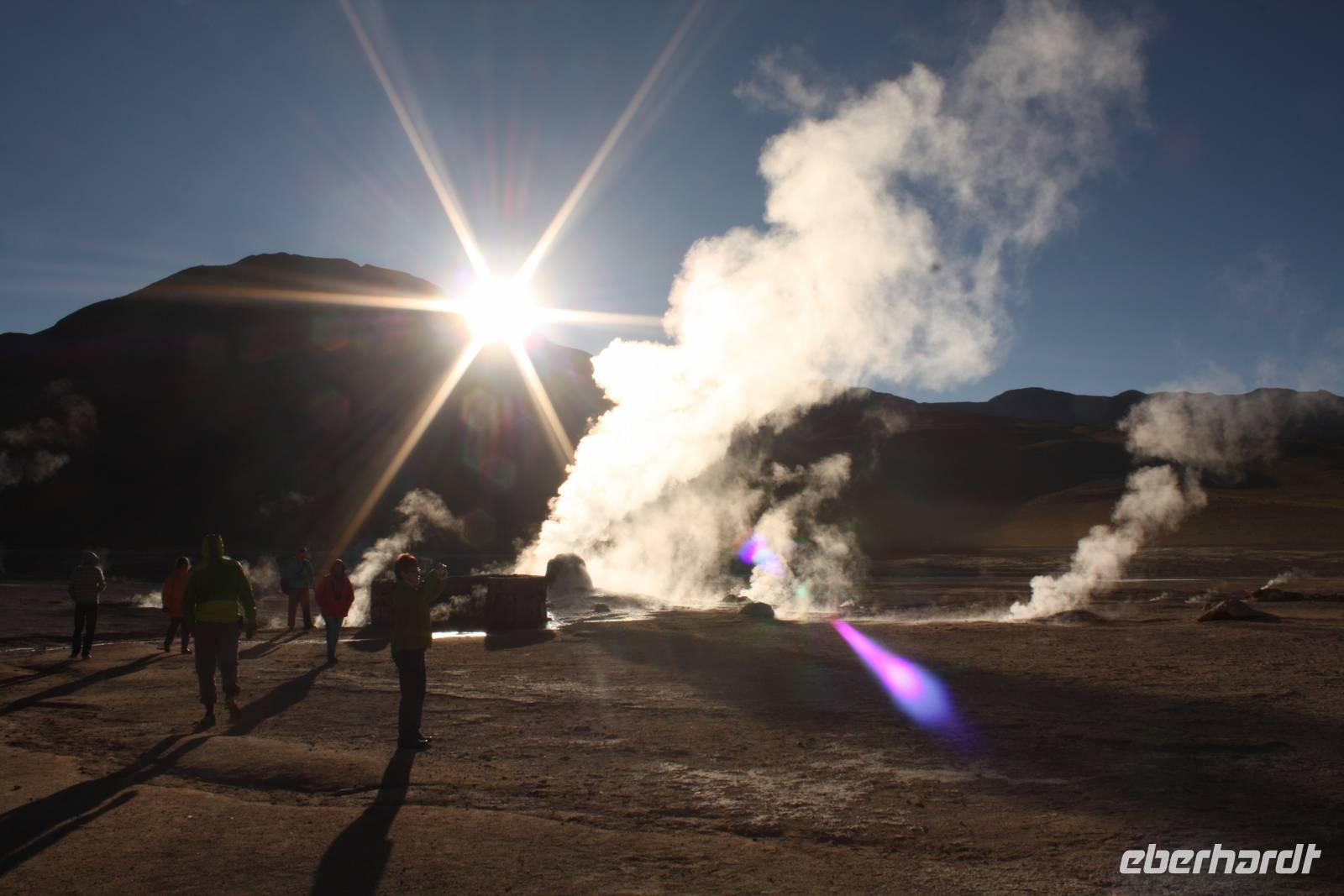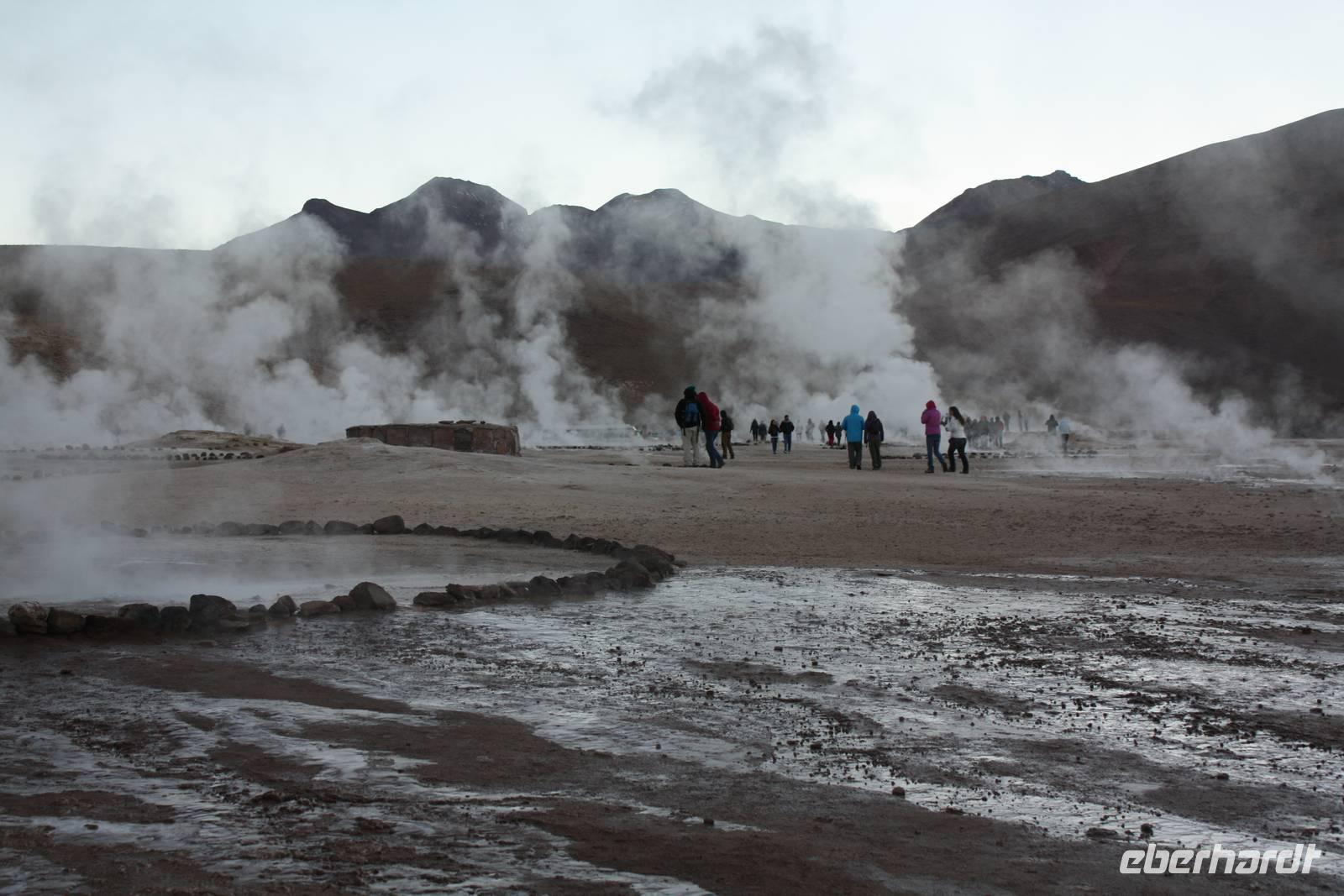 Unsere Nacht endete heute schon 3:30 Uhr, denn wir wollten pünktlich zum Sonnenaufgang bei den El Tatio Geysiren sein. Wir fuhren also zwei Stunden mit dem Bus durch eisige Kälte - wir hatten fast -10 Grad - auf eine Höhe von 4.300 Meter. Oben am Geysirfeld angekommen, stiegen wir mit all unseren warmen Sachen wie Schal, Mütze und Handschuhe aus dem Bus und gingen über das weitläufige Gelände. Rechts und links des Weges bestaunten wir die zahlreichen Fumarolen und Schlammlöcher. Später kam die Sonne raus und es wurde ganz langsam wärmer. Wir wärmten uns inzwischen mit gekochten Eiern vom Frühstücksbuffet vor unserem Bus. Gegen 9 Uhr verließen wir das Geysirfeld und stoppten kurz am Dorf Machico. Kurze Zeit später besuchten wir die Puritama-Thermalbäder und stiegen 150 Meter hinab zu den Wasserbecken. Einige genossen das angenehm warme Wasser und wir speisten hier gemütlich zu Mittag. Man hatte uns ein tolles Mittagsmahl gezaubert, welches man uns direkt am Thermalbad reichte. Als wir alles aufgegessen hatten, fuhren wir zurück zum Hotel, holten unsere Koffer ab und machten uns gleich auf den Weg zum Flughafen von Calama. Pünktlich um 18:10 Uhr hob unsere Maschine nach Santiago de Chile ab, wo wir zwei Stunden später wieder landeten. Vom Flughafen aus hatten wir heute einen kurzen Weg, denn unser Hotel für diese Nacht lag direkt gegenüber des Flughafens. Das neu renovierte Holiday Inn Hotel war ein sehr angenehmes Hotel, wo wir am späten Abend noch gemeinsam zu Abend aßen und dann, todmüde vom langen Tag, ins Bett fielen.