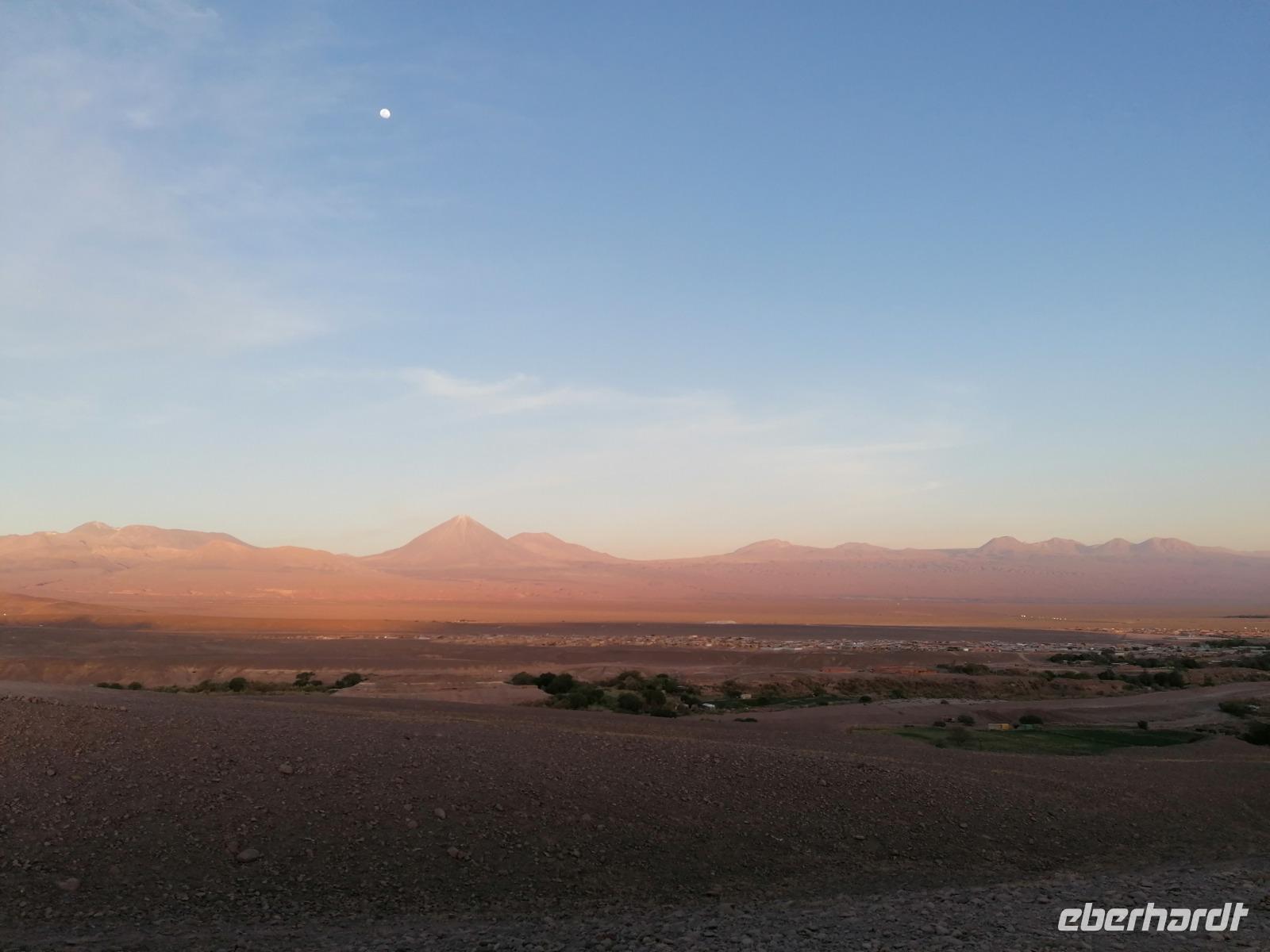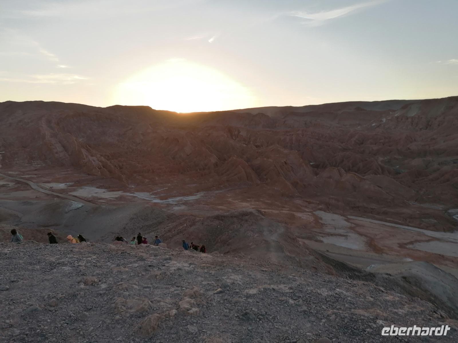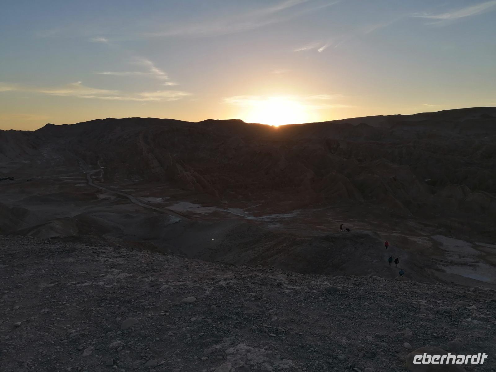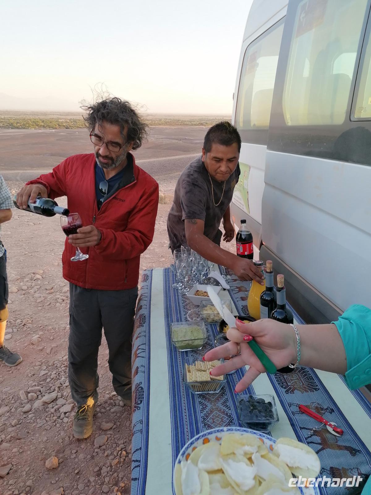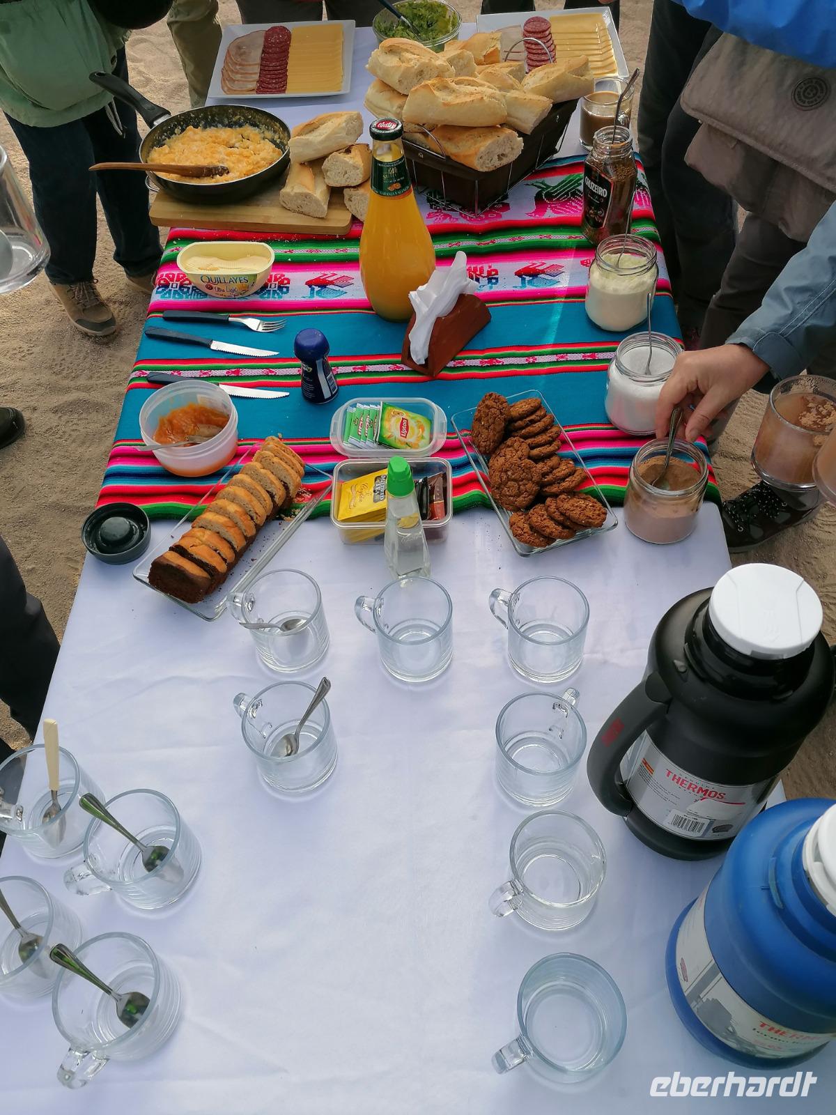 Unser erstes Frühstück auf dem südamerikanischen Kontinent genossen wir in vollen Zügen. Gut gestärkt und ausgeschlafen fuhren wir mit dem Ziel Atacama Wüste zum Flughafen zurück. Das Flug verging schnell und plötzlich erreichten wir eine völlig neue Welt. Die Atacama-Wüste gilt als trockenste Wüste außerhalb der Polargebiete. Es gibt sogar Orte, wo es seit Jahren nicht mehr geregnet hat. Geprägt wird die Sandwüste durch die trockenen Ostwinde von der Anden-Seite und der kalten Meeresströmung der Küstenregion. Dieser sogenannte Humboldtstrom ist auch für das Klimaphänomen El-Nino verantwortlich, das alle 6 - 10 Jahre zu heftigen Niederschlägen und ein kurzzeitiges Erblühen der Wüste führt. Vom Flughafen Calama fuhren wir nach San Pedro, wo wir unser Domizil für die nächsten Tage bezogen. Nach einer kurzen Mittagspause stand das Mondtal und Marstal auf unserer Agenda. Ursprüngliche sollte das Marstal, Tal des Todes heißen, aber durch einen Übersetzungsfehler des belgischen Geistlichen Gustav le Paige entstand das Marstal. Aber egal ob Tal des Todes oder Marstal - der Besuch hat uns gut gefallen und wir wurden von unserer örtlichen Reiseleiterin Jenny hervoragend geführt und erhielten viele Informationen, obwohl ihre Steinsammlung verschwunden war. Unsere Route führte uns im Anschluss weiter ins Mondtal - Valle de la Luna. Im Mondtal fuhren wir zunächst zu den 3 Schwestern absolvierten wir einen kleinen Spaziergang. Nach dem Spaziergang durch das Mondtal, fuhren wir auf eine Sanddüne, um den Sonnenuntergang bei Priedra del Coyote zu erleben. Hier gab es eine weitere Überraschung. Unsere Reiseleiterin Jenny und Erik breiteten einen wunderbaren Snack und Wein vor und wir stießen auf den wunderschönen Sonnenuntergang im Mondtal an. Unser Abendessen Namen wir in einem Restaurant in San Pedro ein, wo wir leckeres Hühnchen essen konnten und von einer tollen Musikerin begleitet wurden.