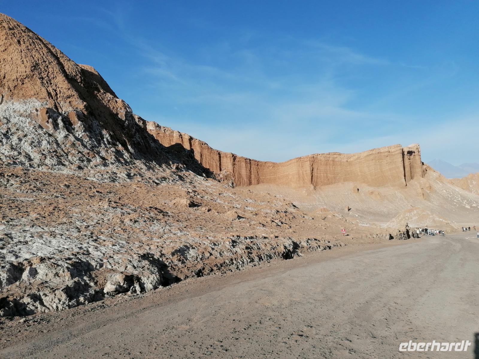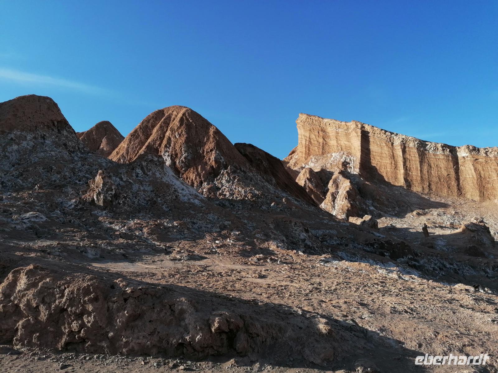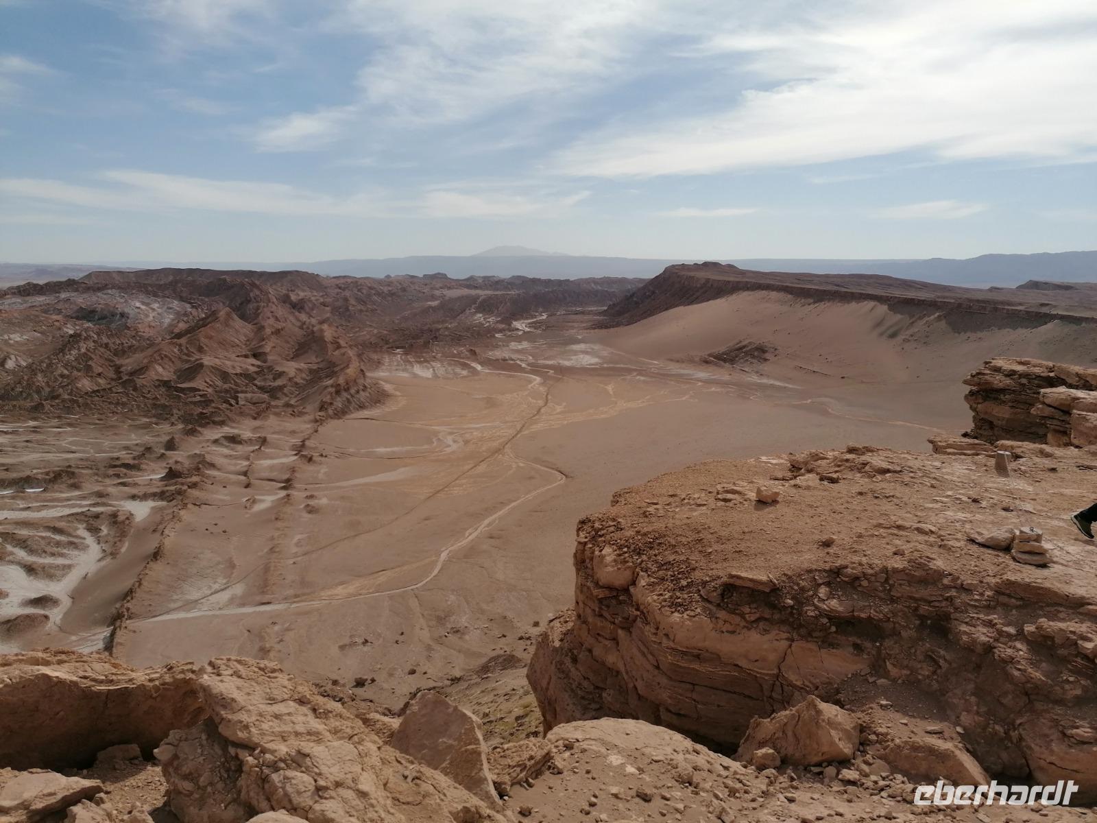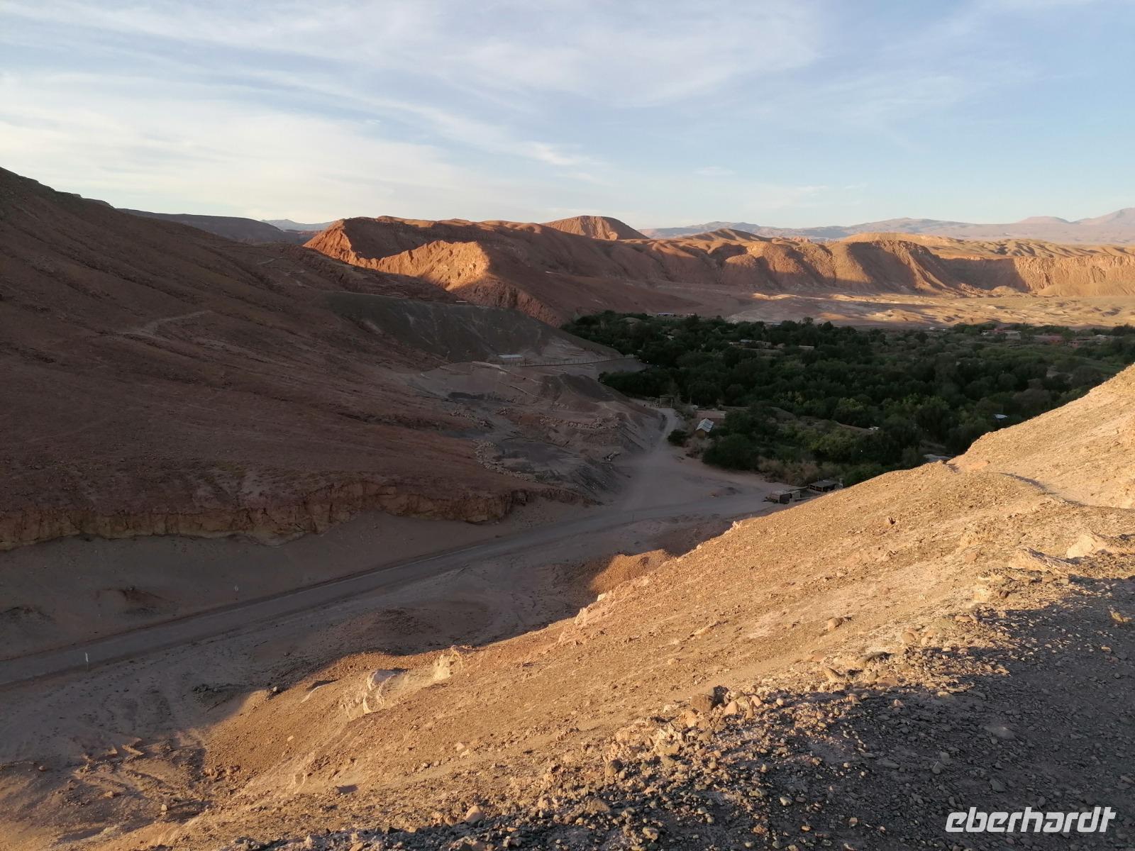 Unser erstes Frühstück auf dem südamerikanischen Kontinent genossen wir in vollen Zügen. Gut gestärkt und ausgeschlafen fuhren wir mit dem Ziel Atacama Wüste zum Flughafen zurück. Das Flug verging schnell und plötzlich erreichten wir eine völlig neue Welt. Die Atacama-Wüste gilt als trockenste Wüste außerhalb der Polargebiete. Es gibt sogar Orte, wo es seit Jahren nicht mehr geregnet hat. Geprägt wird die Sandwüste durch die trockenen Ostwinde von der Anden-Seite und der kalten Meeresströmung der Küstenregion. Dieser sogenannte Humboldtstrom ist auch für das Klimaphänomen El-Nino verantwortlich, das alle 6 - 10 Jahre zu heftigen Niederschlägen und ein kurzzeitiges Erblühen der Wüste führt. Vom Flughafen Calama fuhren wir nach San Pedro, wo wir unser Domizil für die nächsten Tage bezogen. Nach einer kurzen Mittagspause stand das Mondtal und Marstal auf unserer Agenda. Ursprüngliche sollte das Marstal, Tal des Todes heißen, aber durch einen Übersetzungsfehler des belgischen Geistlichen Gustav le Paige entstand das Marstal. Aber egal ob Tal des Todes oder Marstal - der Besuch hat uns gut gefallen und wir wurden von unserer örtlichen Reiseleiterin Jenny hervoragend geführt und erhielten viele Informationen, obwohl ihre Steinsammlung verschwunden war. Unsere Route führte uns im Anschluss weiter ins Mondtal - Valle de la Luna. Im Mondtal fuhren wir zunächst zu den 3 Schwestern absolvierten wir einen kleinen Spaziergang. Nach dem Spaziergang durch das Mondtal, fuhren wir auf eine Sanddüne, um den Sonnenuntergang bei Priedra del Coyote zu erleben. Hier gab es eine weitere Überraschung. Unsere Reiseleiterin Jenny und Erik breiteten einen wunderbaren Snack und Wein vor und wir stießen auf den wunderschönen Sonnenuntergang im Mondtal an. Unser Abendessen Namen wir in einem Restaurant in San Pedro ein, wo wir leckeres Hühnchen essen konnten und von einer tollen Musikerin begleitet wurden.