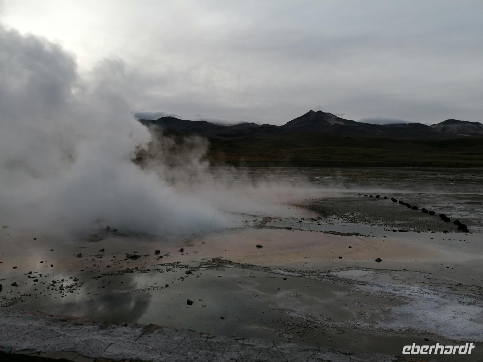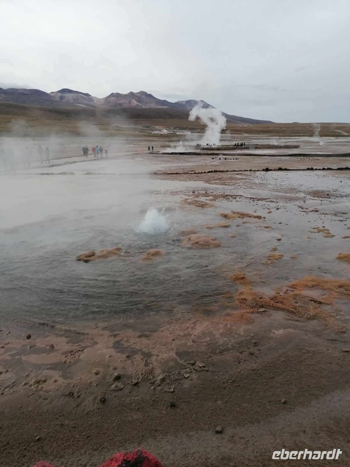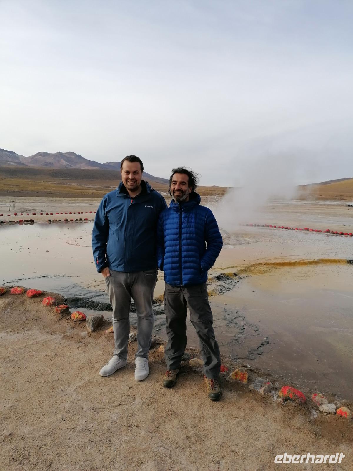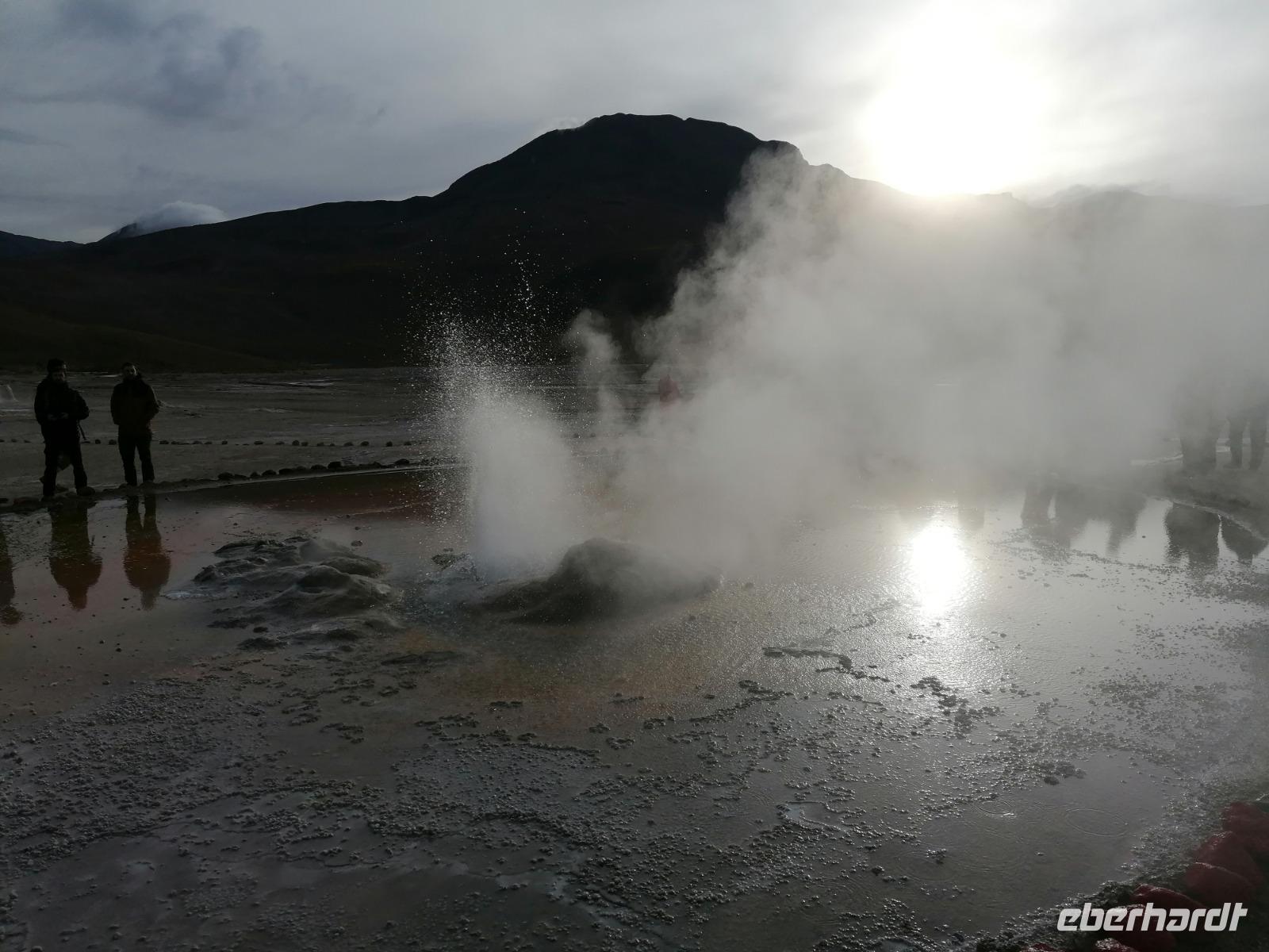 Getreu nach dem Motto: Der frühe Vogel fängt den Wurm, standen wir früh morgens auf. Unser Ziel war der Geysir El Tatio. Früh am Morgen sind die Aktivitäten des Geysirs am ausgeprägtesten, da die Kälte der Nacht auf die Wärme des Tages trifft und wir somit die Fontänen der Geysire erkennen konnten. Auf dem Weg in Richtung Geysir, machten wir noch einen kurzen Halt beim Bäcker und fuhren gute zwei Stunden über eine Schotterpiste zum Geysir. Beim Geysir El Tatio spazierten wir durch das Geysirenfeld und waren fasziniert von der atemberaubenden Natur. Das ganze Gebiet rund um die Geysire ist eine einzigartige Landschaft, welche uns zum Staunen brachte. Nach unserem Spaziergang kamen wir alle zurück zum Bus. Da es sehr kalt auf den Geysiren waren freuten wir uns schon auf unseren Kaffee. Was wir aber nicht wussten, unser Busfahrer bereitete uns ein leckeres Frühstück vor mit frischem Rührei, Brot, Kaffee und andere kleine Leckereien. Gestärkt fuhren zurück nach San Pedro. Unterwegs zeigt uns unser Guide Erik noch zwei wunderbare Stopps. Der erste erfolgte bei einer kleinen See, wo die Tierwelt mit der Anden Ente oder auch Flamingos entdecken konnten. Unser zweite und letzte stoppe in der Atacama-Wüste erfolgte einen kleinen Aussichtspunkt, wo wunderbare Kakteen wuchsen. Im Anschluss ging es zurück nach San Pedro. Sie hatten wir noch Zeit zum Bummeln oder eine Kleinigkeit zu essen. Am Nachmittag fuhren wir zurück zum Flughafen und nach einem kurzen Flug erreichten wir wieder am Abend Santiago de Chile. Die Situation in Santiago hatte sich in der Zwischenzeit nicht verbessert, sodass wir beschlossen im Hotel zu Abend zu essen. Hier trafen wir auch wieder auf unsere restlichen Gäste und unsere Reisegruppe war wieder komplett.