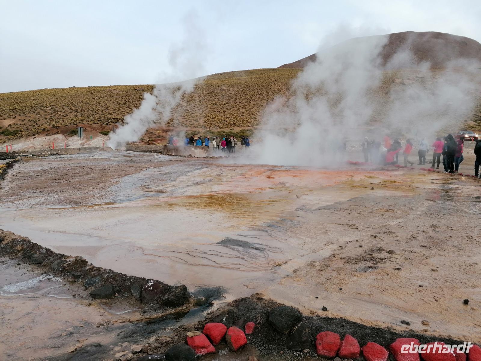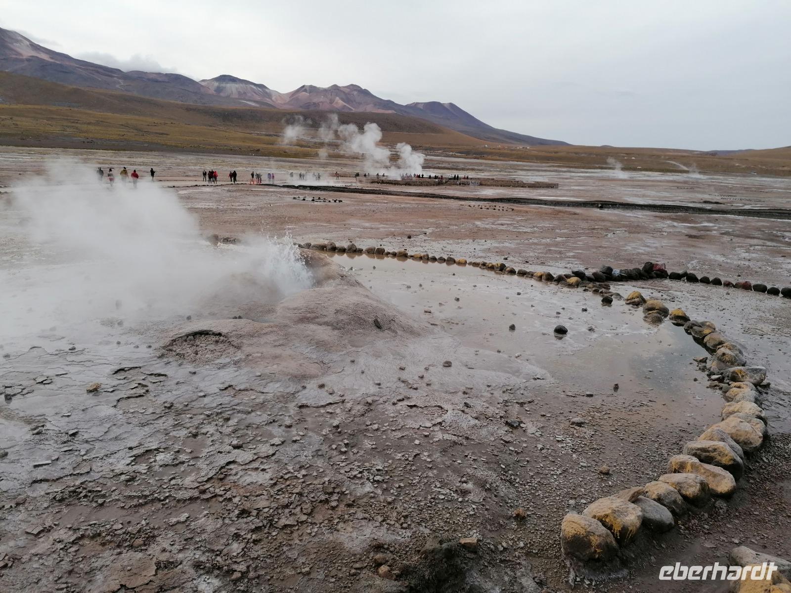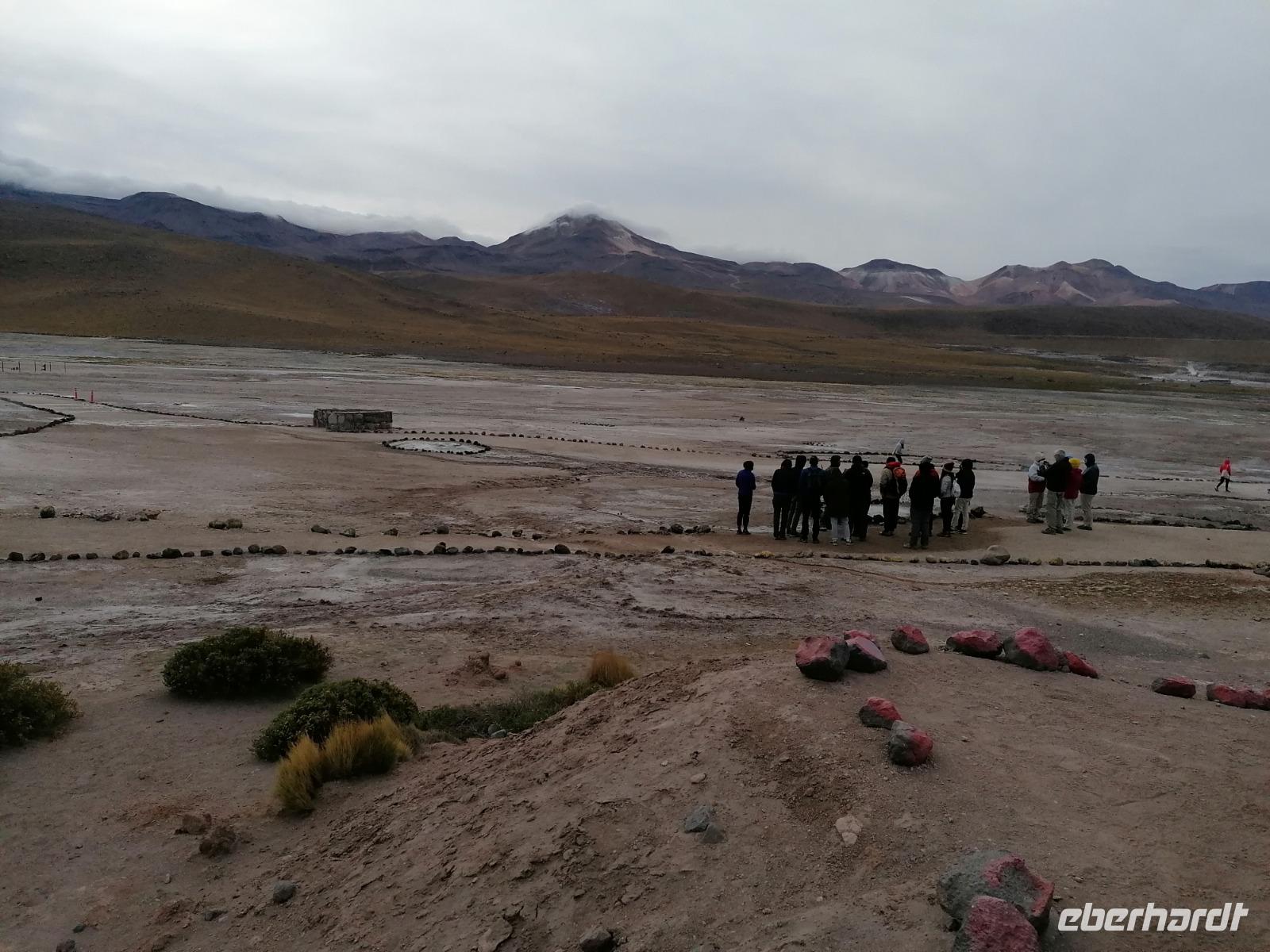 Getreu nach dem Motto: Der frühe Vogel fängt den Wurm, standen wir früh morgens auf. Unser Ziel war der Geysir El Tatio. Früh am Morgen sind die Aktivitäten des Geysirs am ausgeprägtesten, da die Kälte der Nacht auf die Wärme des Tages trifft und wir somit die Fontänen der Geysire erkennen konnten. Auf dem Weg in Richtung Geysir, machten wir noch einen kurzen Halt beim Bäcker und fuhren gute zwei Stunden über eine Schotterpiste zum Geysir. Beim Geysir El Tatio spazierten wir durch das Geysirenfeld und waren fasziniert von der atemberaubenden Natur. Das ganze Gebiet rund um die Geysire ist eine einzigartige Landschaft, welche uns zum Staunen brachte. Nach unserem Spaziergang kamen wir alle zurück zum Bus. Da es sehr kalt auf den Geysiren waren freuten wir uns schon auf unseren Kaffee. Was wir aber nicht wussten, unser Busfahrer bereitete uns ein leckeres Frühstück vor mit frischem Rührei, Brot, Kaffee und andere kleine Leckereien. Gestärkt fuhren zurück nach San Pedro. Unterwegs zeigt uns unser Guide Erik noch zwei wunderbare Stopps. Der erste erfolgte bei einer kleinen See, wo die Tierwelt mit der Anden Ente oder auch Flamingos entdecken konnten. Unser zweite und letzte stoppe in der Atacama-Wüste erfolgte einen kleinen Aussichtspunkt, wo wunderbare Kakteen wuchsen. Im Anschluss ging es zurück nach San Pedro. Sie hatten wir noch Zeit zum Bummeln oder eine Kleinigkeit zu essen. Am Nachmittag fuhren wir zurück zum Flughafen und nach einem kurzen Flug erreichten wir wieder am Abend Santiago de Chile. Die Situation in Santiago hatte sich in der Zwischenzeit nicht verbessert, sodass wir beschlossen im Hotel zu Abend zu essen. Hier trafen wir auch wieder auf unsere restlichen Gäste und unsere Reisegruppe war wieder komplett.