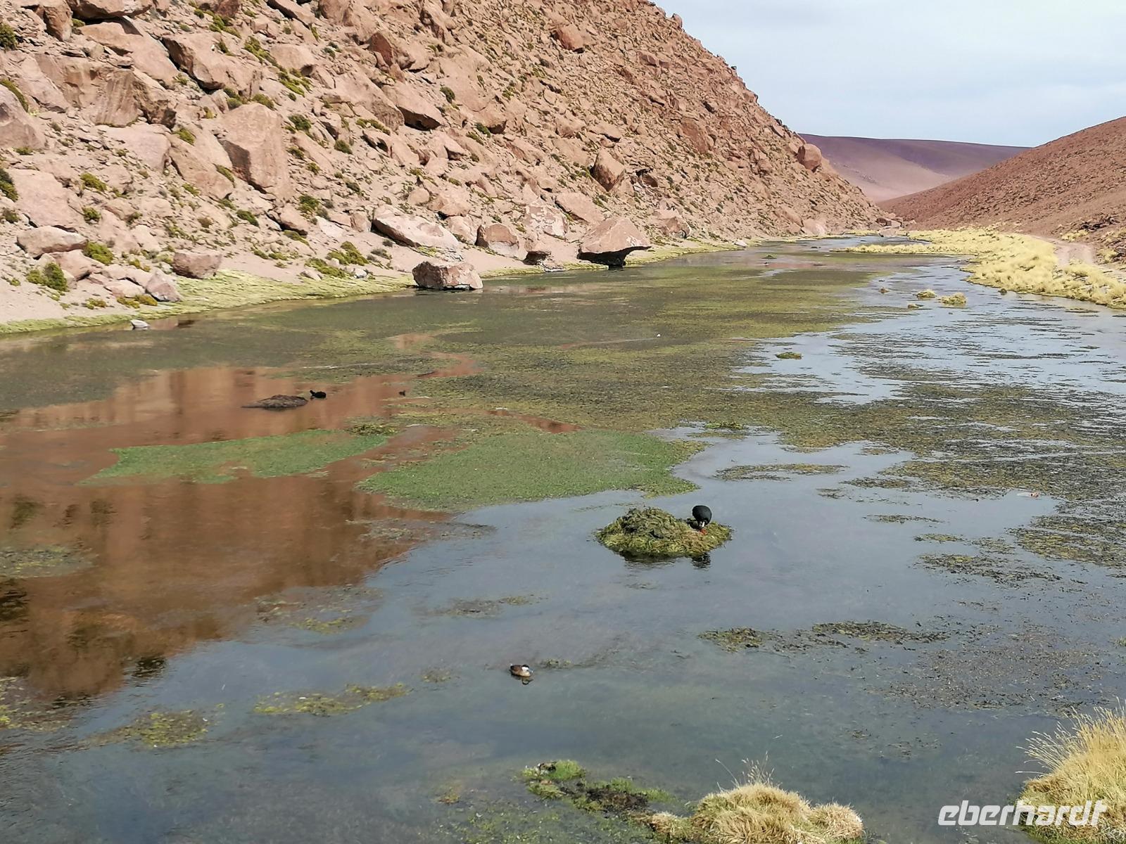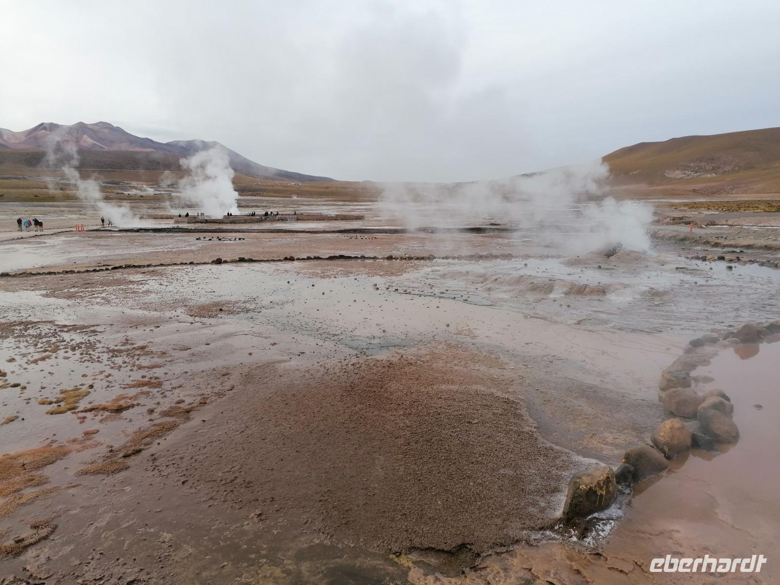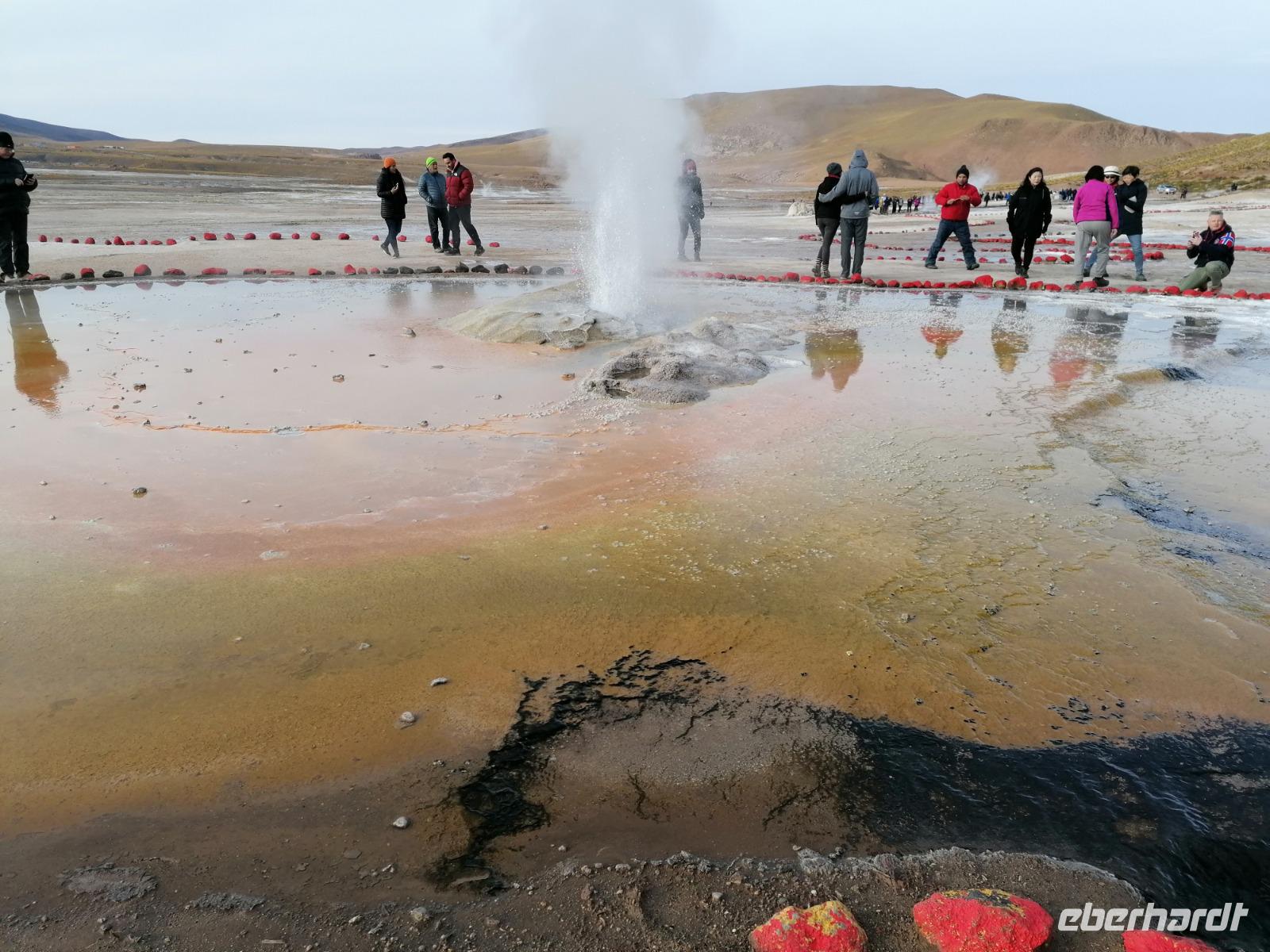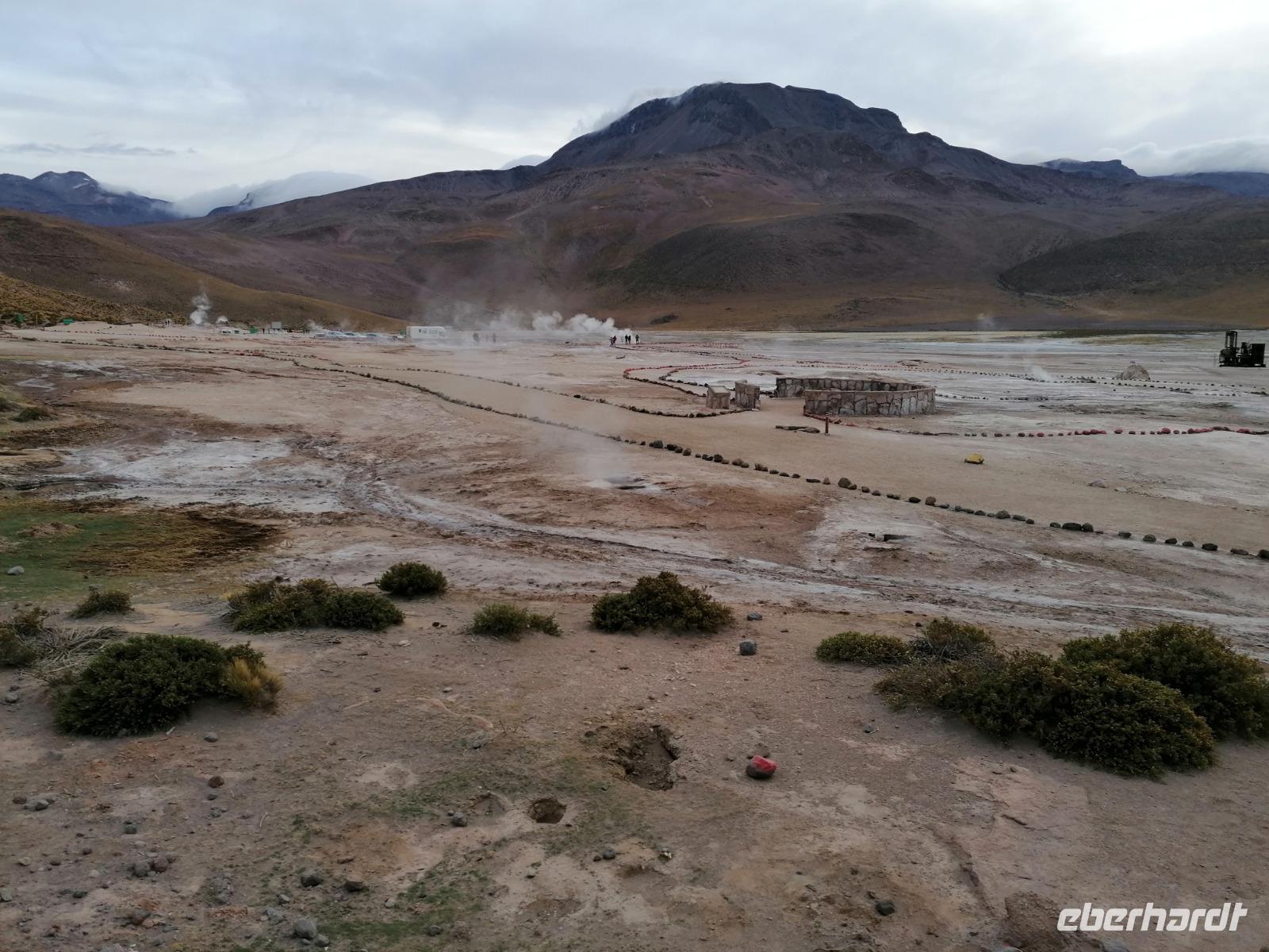 Getreu nach dem Motto: Der frühe Vogel fängt den Wurm, standen wir früh morgens auf. Unser Ziel war der Geysir El Tatio. Früh am Morgen sind die Aktivitäten des Geysirs am ausgeprägtesten, da die Kälte der Nacht auf die Wärme des Tages trifft und wir somit die Fontänen der Geysire erkennen konnten. Auf dem Weg in Richtung Geysir, machten wir noch einen kurzen Halt beim Bäcker und fuhren gute zwei Stunden über eine Schotterpiste zum Geysir. Beim Geysir El Tatio spazierten wir durch das Geysirenfeld und waren fasziniert von der atemberaubenden Natur. Das ganze Gebiet rund um die Geysire ist eine einzigartige Landschaft, welche uns zum Staunen brachte. Nach unserem Spaziergang kamen wir alle zurück zum Bus. Da es sehr kalt auf den Geysiren waren freuten wir uns schon auf unseren Kaffee. Was wir aber nicht wussten, unser Busfahrer bereitete uns ein leckeres Frühstück vor mit frischem Rührei, Brot, Kaffee und andere kleine Leckereien. Gestärkt fuhren zurück nach San Pedro. Unterwegs zeigt uns unser Guide Erik noch zwei wunderbare Stopps. Der erste erfolgte bei einer kleinen See, wo die Tierwelt mit der Anden Ente oder auch Flamingos entdecken konnten. Unser zweite und letzte stoppe in der Atacama-Wüste erfolgte einen kleinen Aussichtspunkt, wo wunderbare Kakteen wuchsen. Im Anschluss ging es zurück nach San Pedro. Sie hatten wir noch Zeit zum Bummeln oder eine Kleinigkeit zu essen. Am Nachmittag fuhren wir zurück zum Flughafen und nach einem kurzen Flug erreichten wir wieder am Abend Santiago de Chile. Die Situation in Santiago hatte sich in der Zwischenzeit nicht verbessert, sodass wir beschlossen im Hotel zu Abend zu essen. Hier trafen wir auch wieder auf unsere restlichen Gäste und unsere Reisegruppe war wieder komplett.