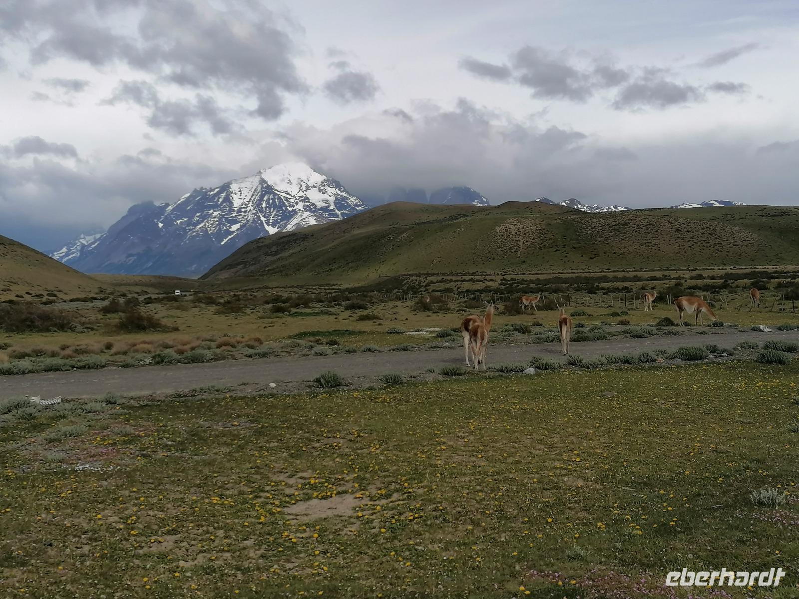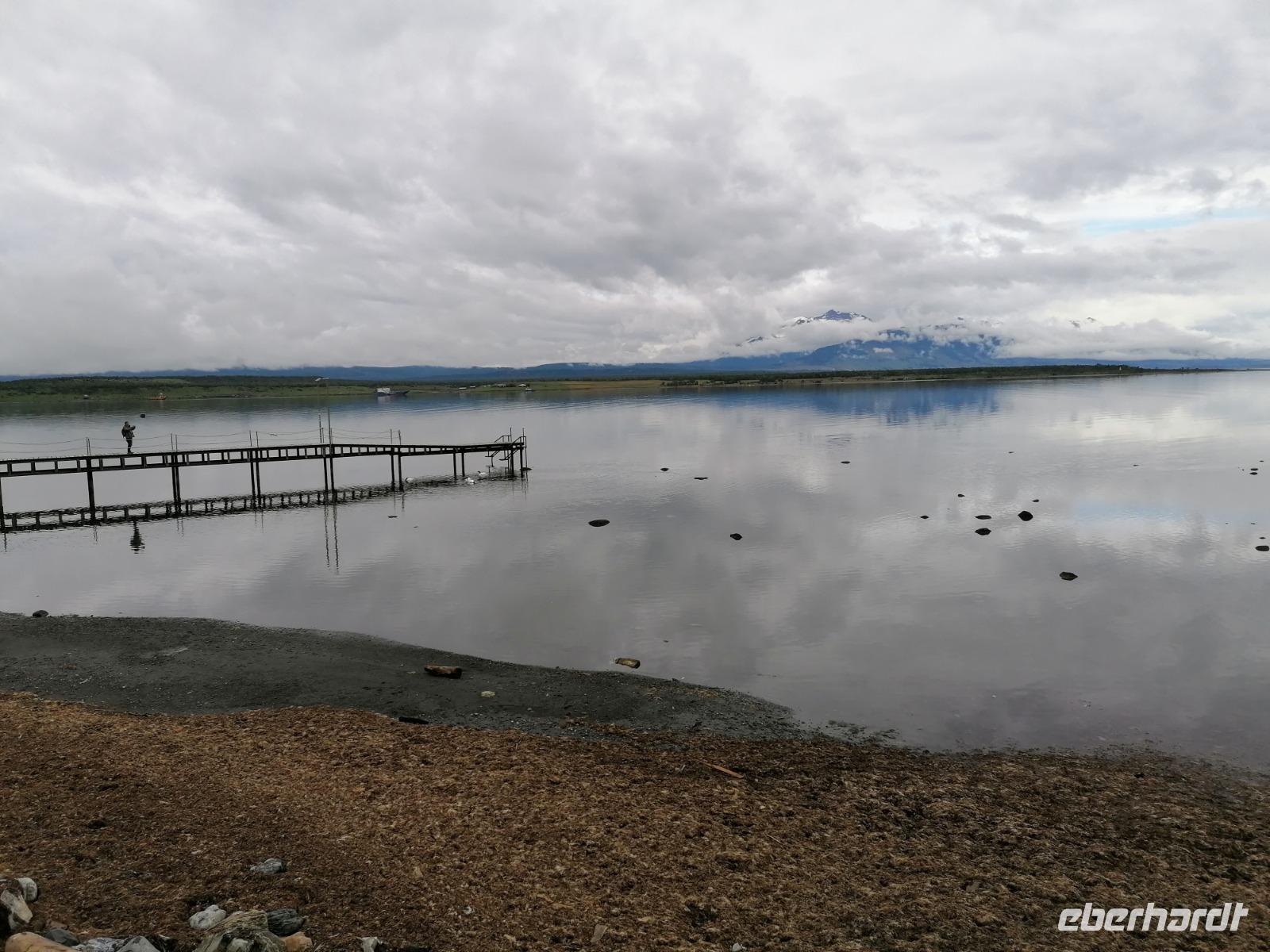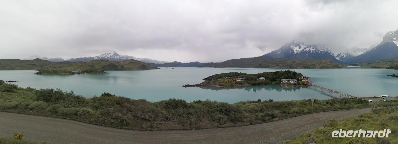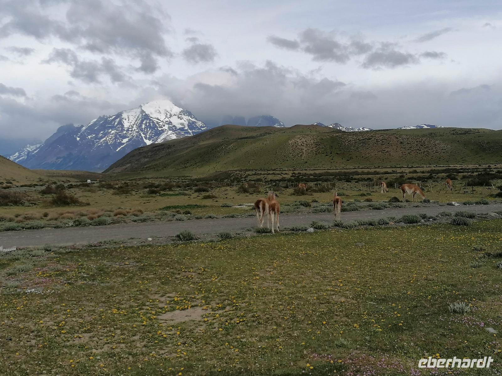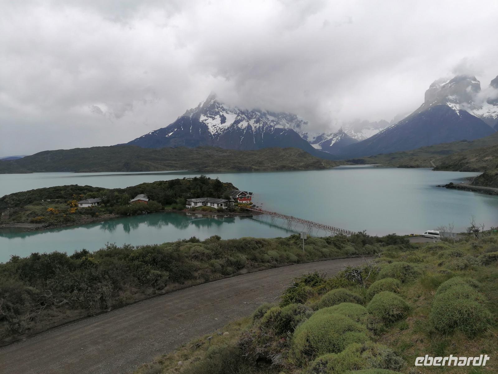 Schon früh am Morgen hieß es Abschied von der chilenischen Hauptstadt Santiago de Chile nehmen. Wir waren erleichtert, dass wir die Tage in Santiago de Chile so positiv gestalten konnten. Aber jetzt freuen wir uns auf Patagonien. Mit dem ersten Flieger flogen wir von der Hauptstadt nach Punta Arenas. Nachdem alle Koffer eingetroffen waren, wie uns mit Wasser versorgt hatten, gingen wir zum Bus. Leider hatten wir nicht ganz so viel Glück mit dem Wetter, aber wir waren guter Dinge und freuten uns auf Patagonien. In Puntarenas war es am Vortag zu Ausschreitungen gekommen, sodass wir nicht ins Zentrum fuhren. Nach einer kleinen Fahrtstrecke machten wir unseren ersten Stopp. Bei einem kleinen Café holen wir unser Frühstück nach und stärken uns mit einem frischen Sandwich und einen Kaffee. Weiter führt uns unser Route nach Puerto Natales. Hier machten wir einen kleinen Spaziergang entlang der Promenade und knipsen viele Bilder von dem wunderschönen Bergpanorama in Hintergrund und der Strandpromenade. Da wir mittlerweile die Mittagszeit erreicht hatten, beschlossen wir in einem Restaurant zu speisen. Wir bestellten frischen Fisch, Meeresspinne, Muscheln und andere Leckereien. Nach dem Mittagessen hielten wir noch bei einem kleinen Supermarkt und fuhren weiter in den Nationalpark Torres del Paine. Die letzte Teilstrecke unsere Route führte über eine Schotterstraße bis hin in unser Hotel, das mitten in den Nationalpark Torres del Paine gelegen war. Auch hier war das Wetter uns nicht hold, aber wir wärmten uns im hoteleigenen Restaurant und genossen den Ausblick auf die Bergkette.