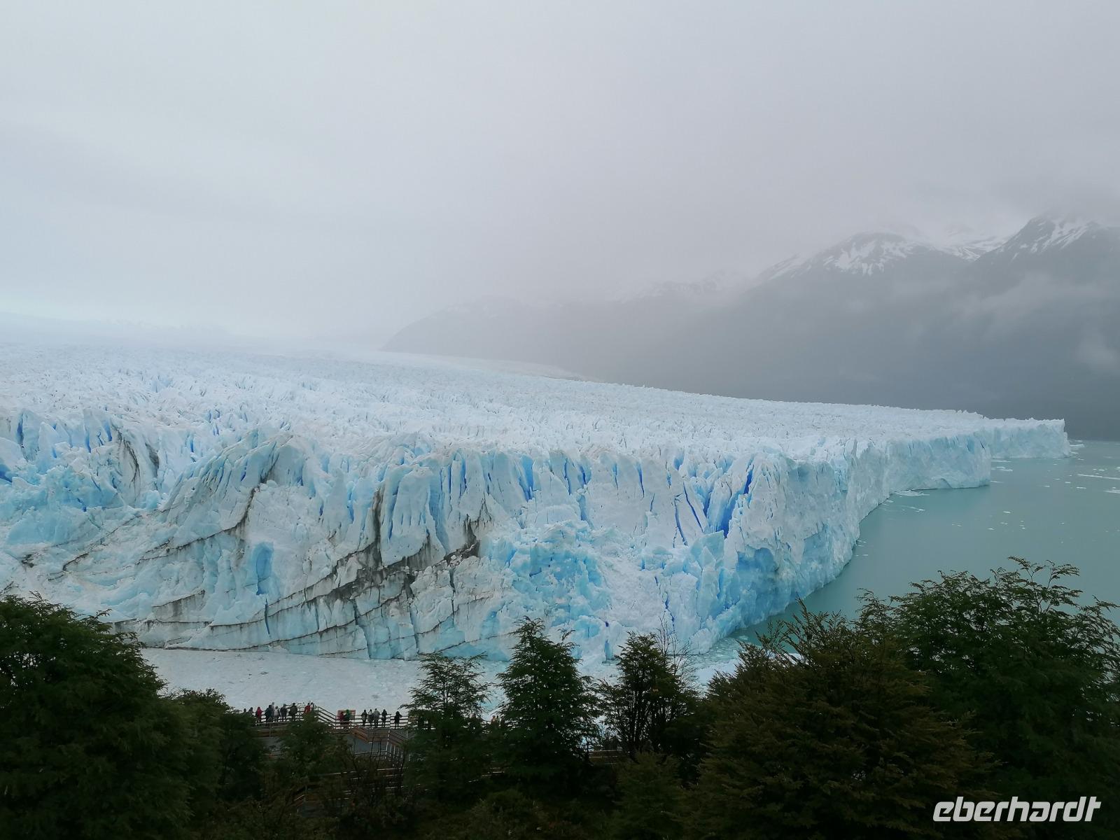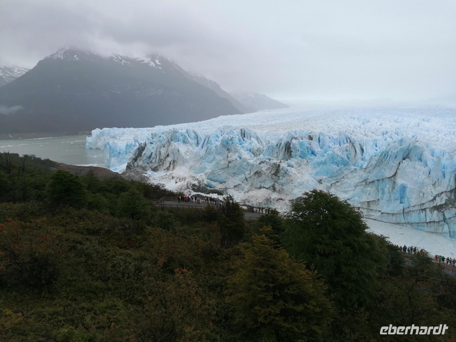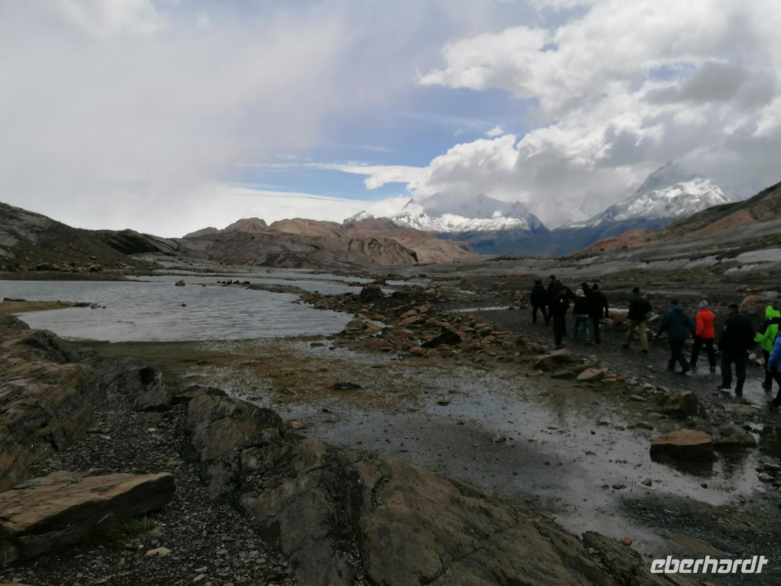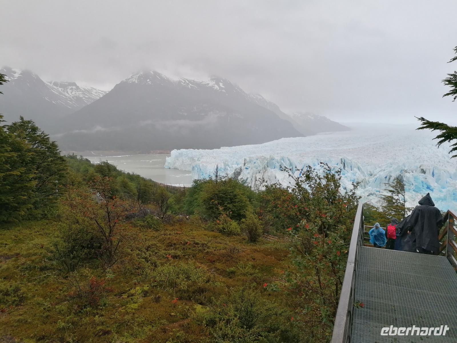 Nachdem wir schon so viel über die Gletscher in Patagonien gehört hatten, wollten wir nun endlich Gletscher aus nächster Nähe sehen. Mit unserem Bus und Reiseleiter Eric brachen wir auf und den Gletscher Perito Moreno zu erkunden. Mitarbeiter auch unser örtlicher Nationalpark Guide. Gemeinsam fuhren wir ca. eine Stunde bis wir den Nationalpark erreichten. Zwischendurch brach immer wieder die Sonne zwischen den Wolken hindurch, aber wir hofften das das Wetter sich hielt. Nach einer kurzen Toilettenpause erreichten wir schließlich den Kai, wo unser Boot bereits wartete. Schnell checken wir ein und freuen uns auf eine Bootsfahrt bis hin zum Perito-Moreno-Gletscher. Auf dem Bode hätten wir zuerst einmal Informationen über den Gletscher und fuhren schließlich sehr nah heran. Ein absolutes Highlight. Während der Fahrt machten wir uns selige Bilder von uns, dem Gletscher und auch Gruppenbilder. Am Gletscher gab es im Anschluss noch eine kleine Überraschung. Der örtliche Boots Guide half uns ein kleines Stück Eis aus dem Wasser zu fischen. Mit dem Eis bereitet mir einen leckeren Whisky on the rocks vor. Gemeinsam stießen wir auf die schöne Zeit in Patagonien an und genossen die Atmosphäre auf der Bootsfahrt. Gegen Mittag fuhren wir dann weiter mit dem Bus zum Aussichtspunkt. Hier steht ein kleines Restaurant wo wir uns aufwärmen konnten. Freundlicherweise hat uns das Hotel ein Lunchpaket mit auf dem Weg gegeben. Leider spielte das Wetter uns einen Streich und es regnete in Strömen. Getreu dem Motto es gibt kein schlechtes Wetter, sondern nur schlechte Kleidung, spazierten wir entlang den Laufstegen bis hin zu den Aussichtspunkten des Gletschers. Trotz Regen ein einzigartiges Erlebnis. Nach dem kleinen Spaziergang kamen wir nass, aber glücklich zum Bus zurück. Schnell machten wir uns zurück auf dem Weg nach El Calafate. Hier konnten wir uns etwas aufwärmen oder in den kleinen Städtchen bummeln gehen. Am Abend war kein Abendessen inklusive, sodass wir beschlossen ein Steakhouse zu besuchen. Die Atmosphäre war einzigartig und das Steak sehr lecker, so dass wir in voller Freude den Abend ausklingen ließen.