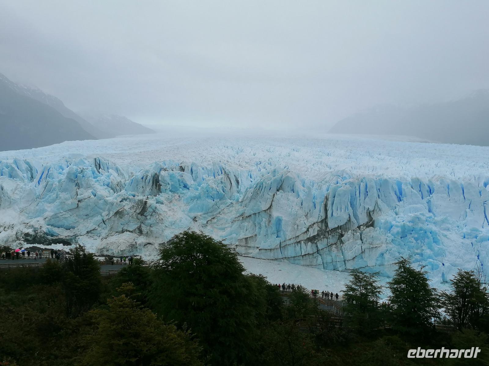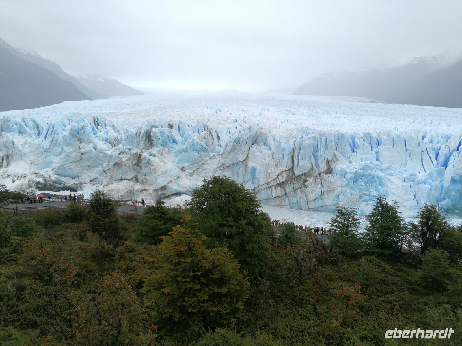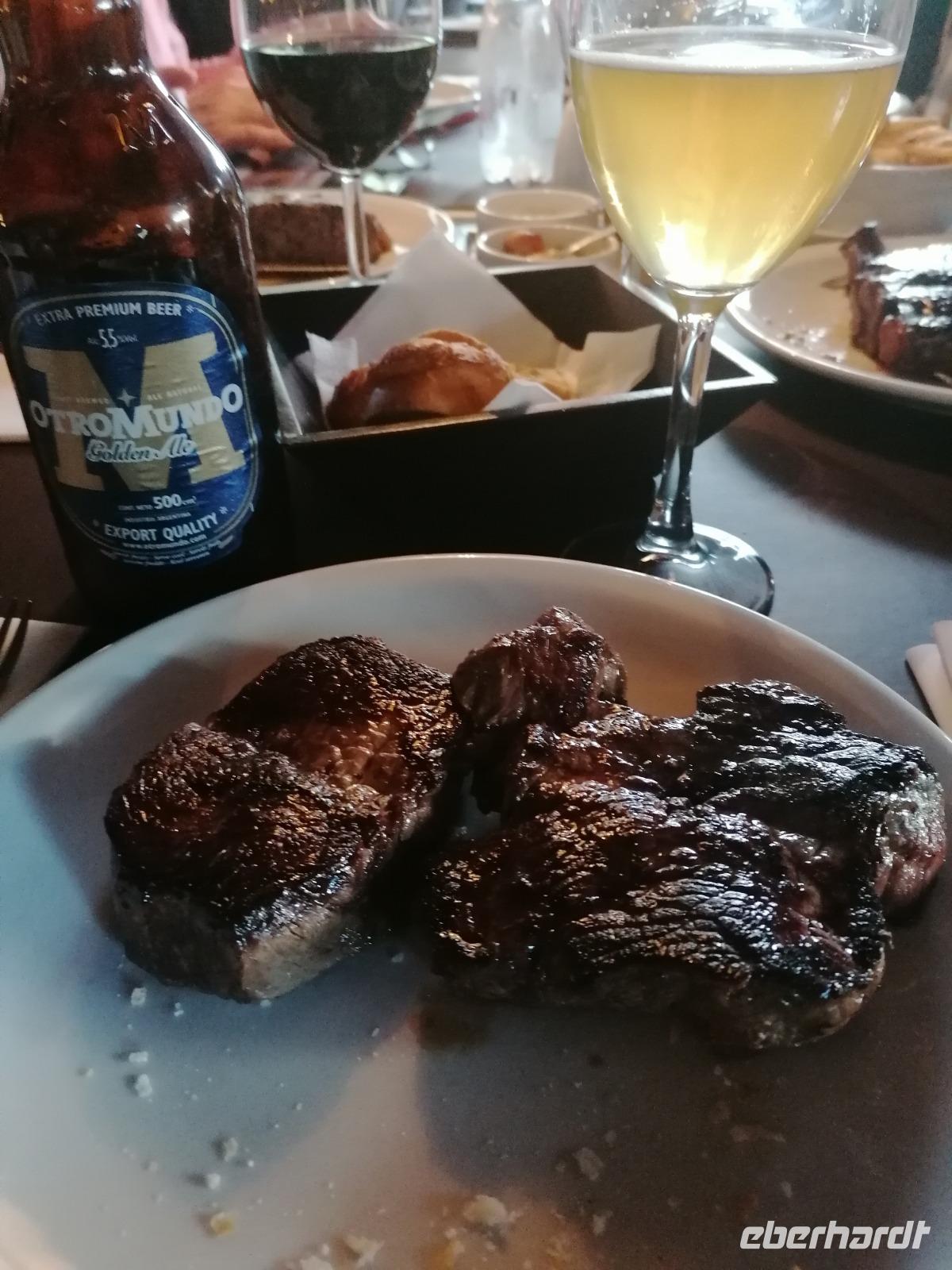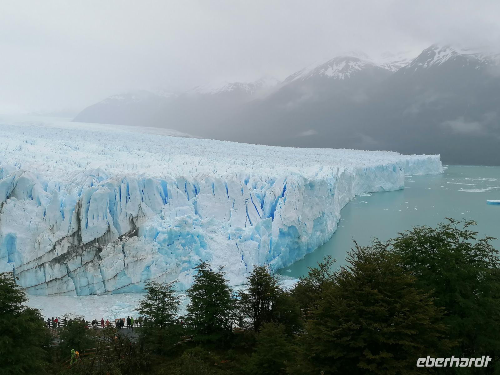 Nachdem wir schon so viel über die Gletscher in Patagonien gehört hatten, wollten wir nun endlich Gletscher aus nächster Nähe sehen. Mit unserem Bus und Reiseleiter Eric brachen wir auf und den Gletscher Perito Moreno zu erkunden. Mitarbeiter auch unser örtlicher Nationalpark Guide. Gemeinsam fuhren wir ca. eine Stunde bis wir den Nationalpark erreichten. Zwischendurch brach immer wieder die Sonne zwischen den Wolken hindurch, aber wir hofften das das Wetter sich hielt. Nach einer kurzen Toilettenpause erreichten wir schließlich den Kai, wo unser Boot bereits wartete. Schnell checken wir ein und freuen uns auf eine Bootsfahrt bis hin zum Perito-Moreno-Gletscher. Auf dem Bode hätten wir zuerst einmal Informationen über den Gletscher und fuhren schließlich sehr nah heran. Ein absolutes Highlight. Während der Fahrt machten wir uns selige Bilder von uns, dem Gletscher und auch Gruppenbilder. Am Gletscher gab es im Anschluss noch eine kleine Überraschung. Der örtliche Boots Guide half uns ein kleines Stück Eis aus dem Wasser zu fischen. Mit dem Eis bereitet mir einen leckeren Whisky on the rocks vor. Gemeinsam stießen wir auf die schöne Zeit in Patagonien an und genossen die Atmosphäre auf der Bootsfahrt. Gegen Mittag fuhren wir dann weiter mit dem Bus zum Aussichtspunkt. Hier steht ein kleines Restaurant wo wir uns aufwärmen konnten. Freundlicherweise hat uns das Hotel ein Lunchpaket mit auf dem Weg gegeben. Leider spielte das Wetter uns einen Streich und es regnete in Strömen. Getreu dem Motto es gibt kein schlechtes Wetter, sondern nur schlechte Kleidung, spazierten wir entlang den Laufstegen bis hin zu den Aussichtspunkten des Gletschers. Trotz Regen ein einzigartiges Erlebnis. Nach dem kleinen Spaziergang kamen wir nass, aber glücklich zum Bus zurück. Schnell machten wir uns zurück auf dem Weg nach El Calafate. Hier konnten wir uns etwas aufwärmen oder in den kleinen Städtchen bummeln gehen. Am Abend war kein Abendessen inklusive, sodass wir beschlossen ein Steakhouse zu besuchen. Die Atmosphäre war einzigartig und das Steak sehr lecker, so dass wir in voller Freude den Abend ausklingen ließen.