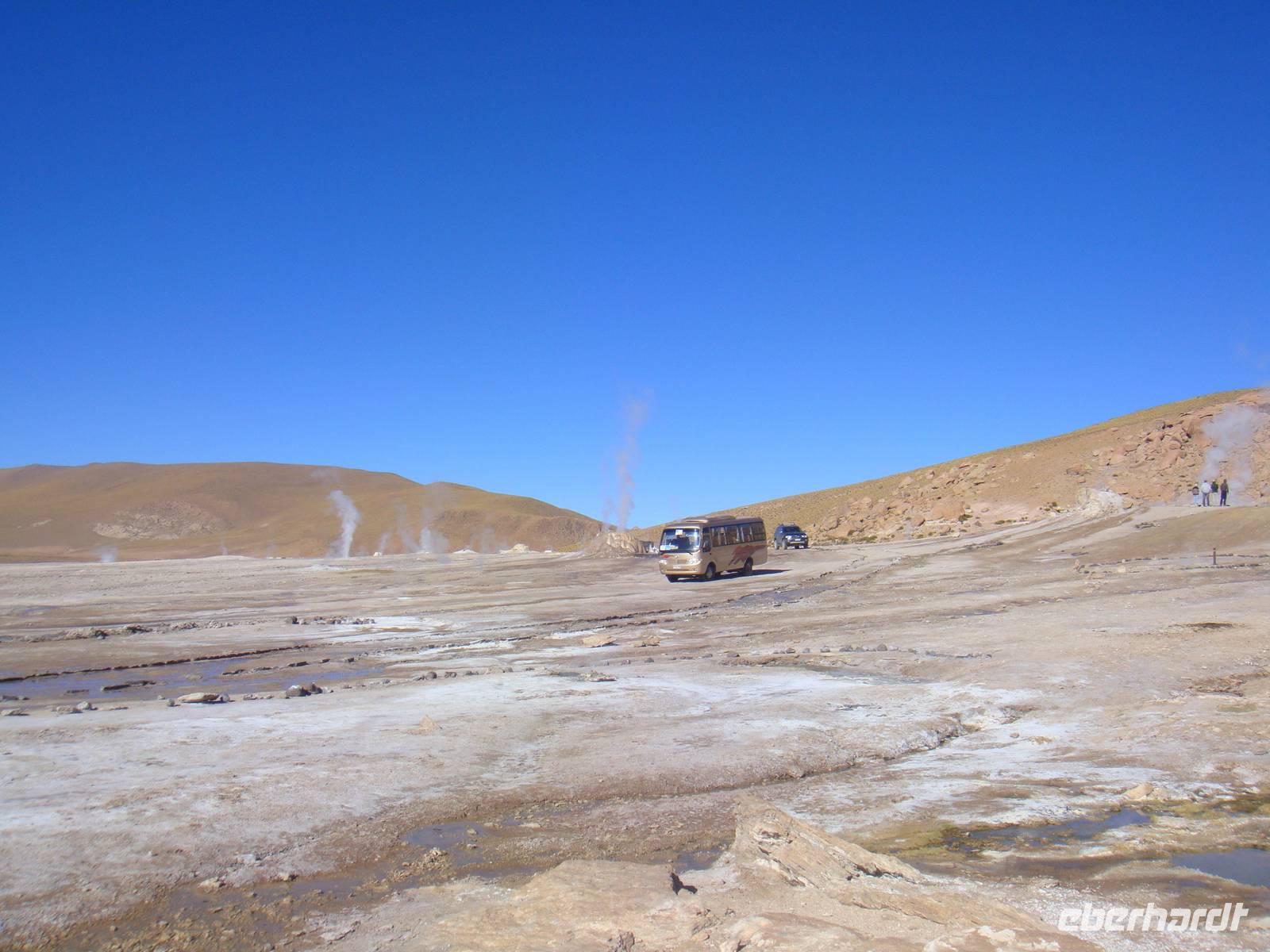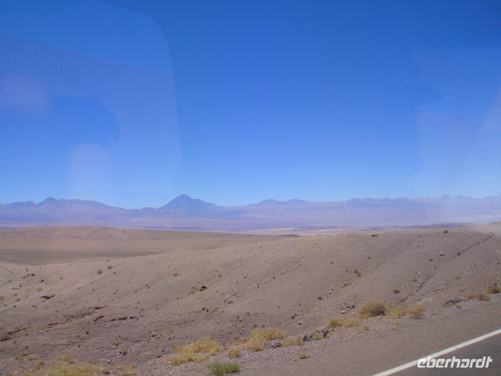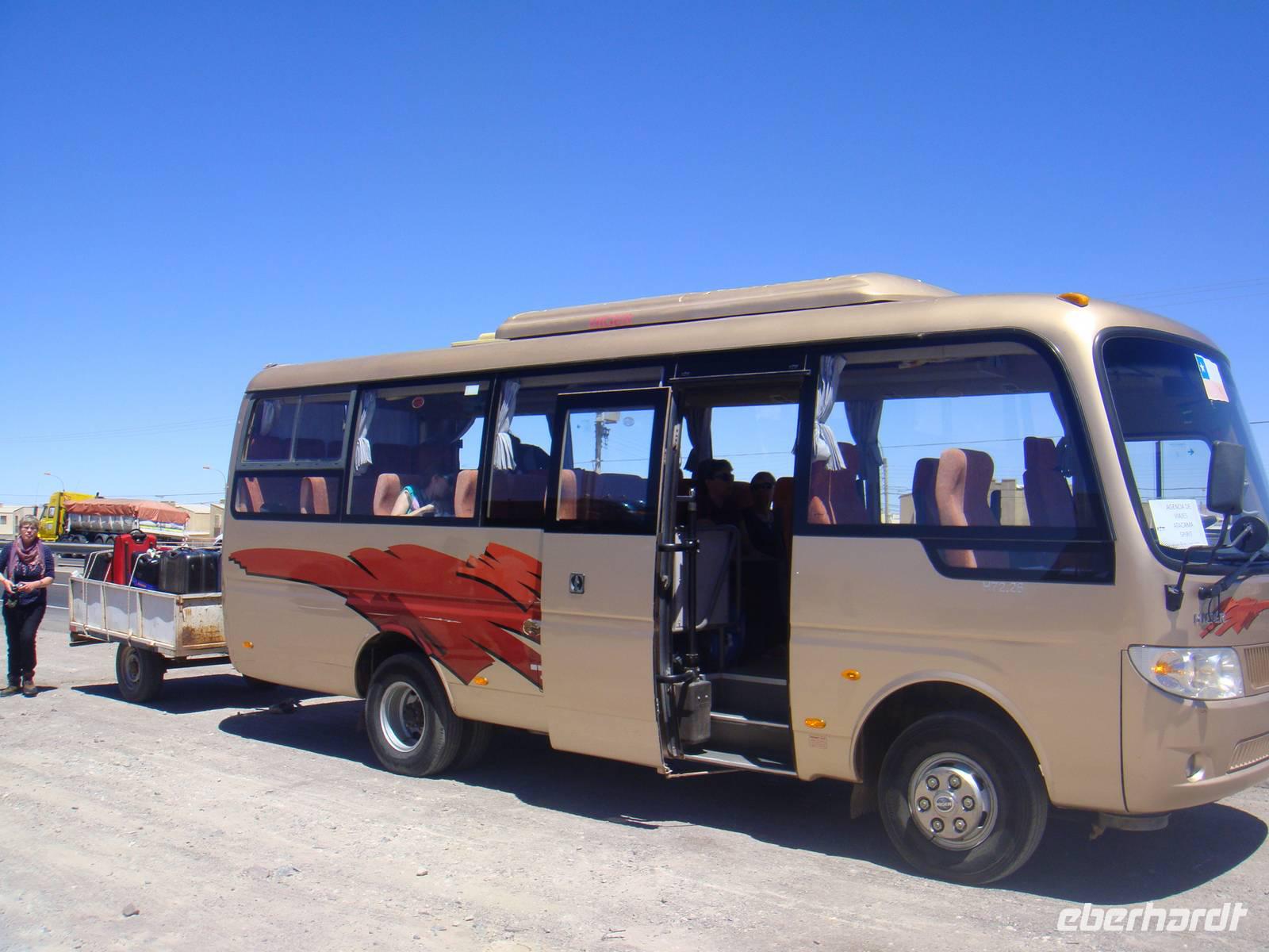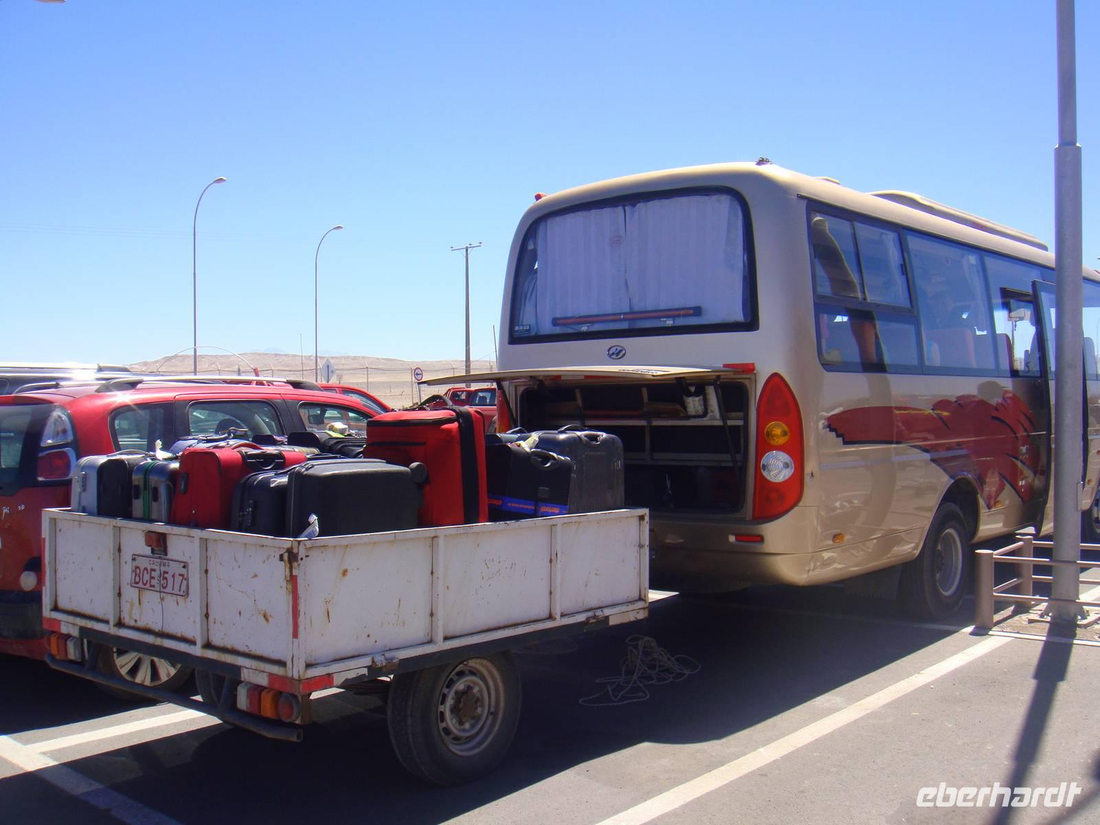 Mit einem Flieger der Lan Chile heben wir ab und nach 2 Stunden erreichen wir den Flughafen Calama. Kurzer Gepäckcheck und schon beladen wir den Anhänger unseres kleinen Busses für die nächsten Tage. Unser Fahrer bestückt den Bus mit einem riesigen Wasserbehälter, so haben wir immer Wasser auf Vorrat an Bord. Wir setzten unsere Fahrt fort und sind von der kargen Landschaft und deren Weite fasziniert.