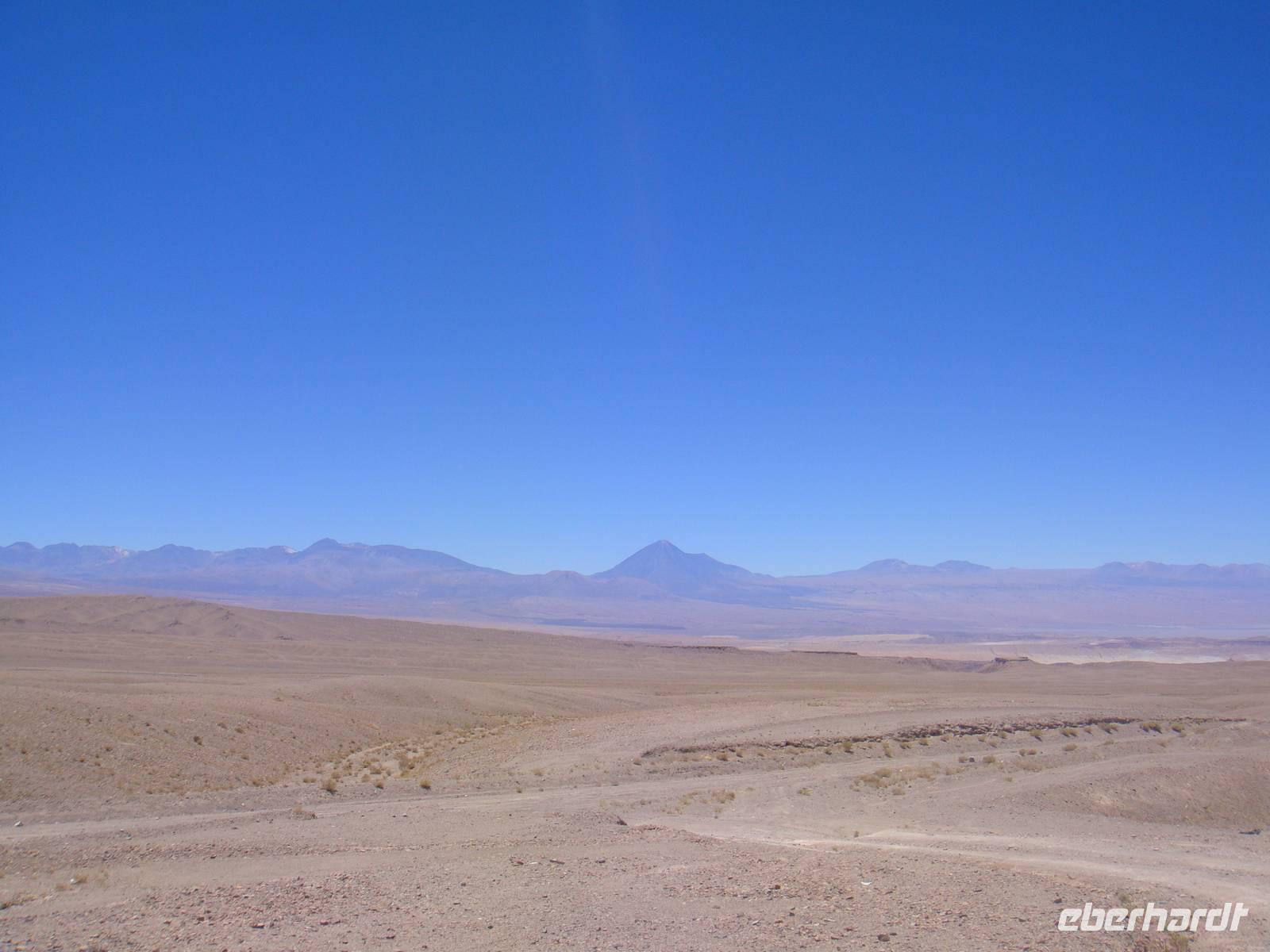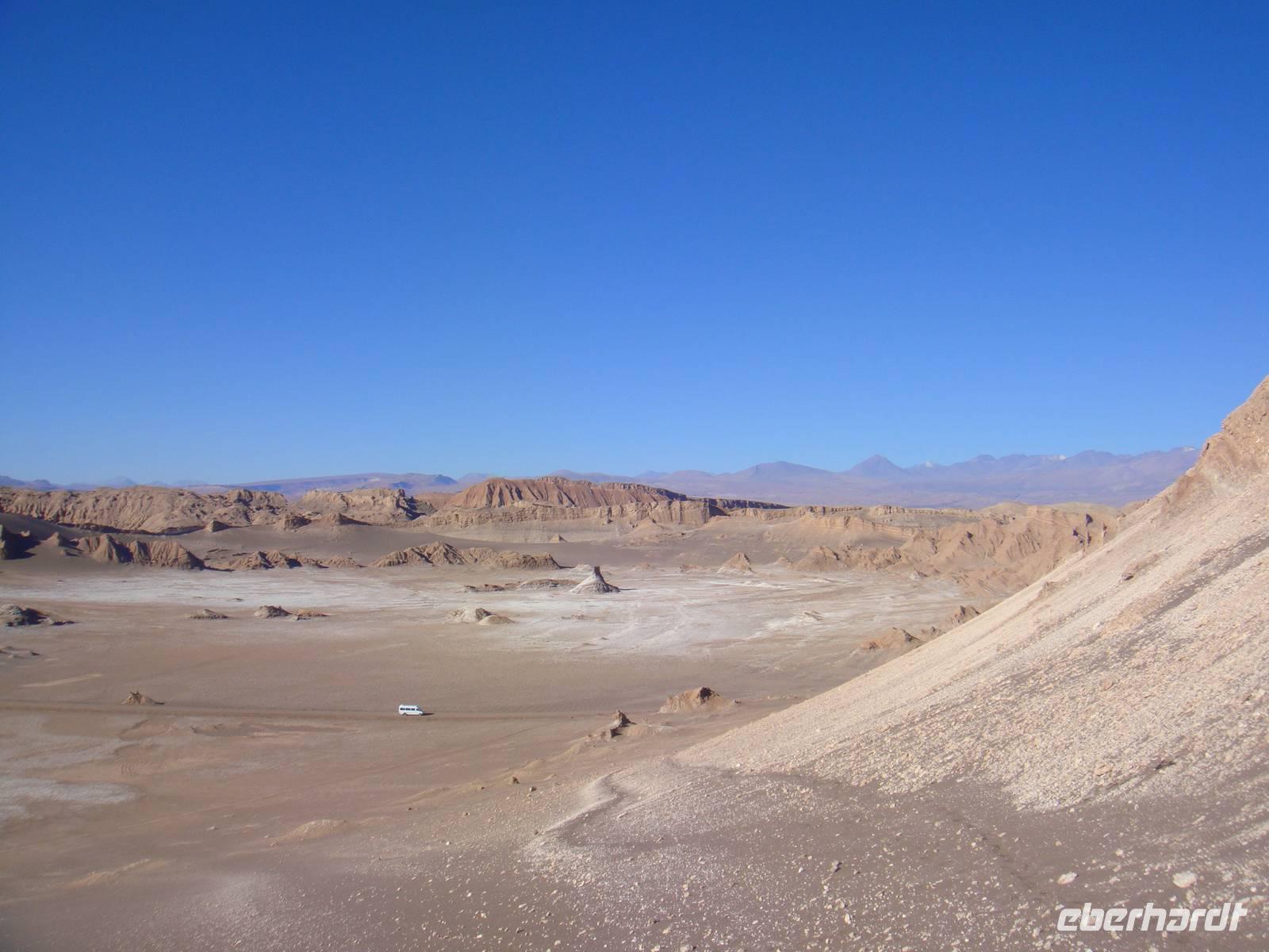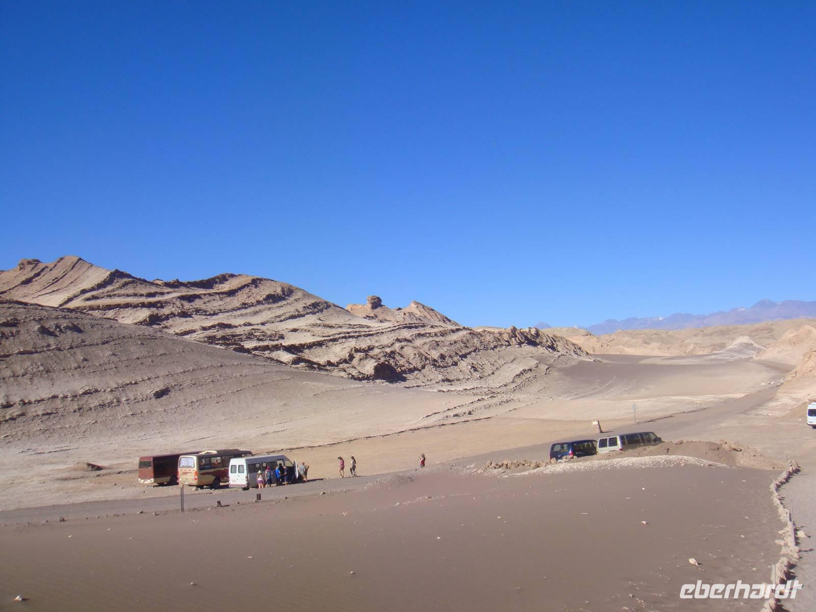 Mit einem Flieger der Lan Chile heben wir ab und nach 2 Stunden erreichen wir den Flughafen Calama. Kurzer Gepäckcheck und schon beladen wir den Anhänger unseres kleinen Busses für die nächsten Tage. Unser Fahrer bestückt den Bus mit einem riesigen Wasserbehälter, so haben wir immer Wasser auf Vorrat an Bord. Wir setzten unsere Fahrt fort und sind von der kargen Landschaft und deren Weite fasziniert.