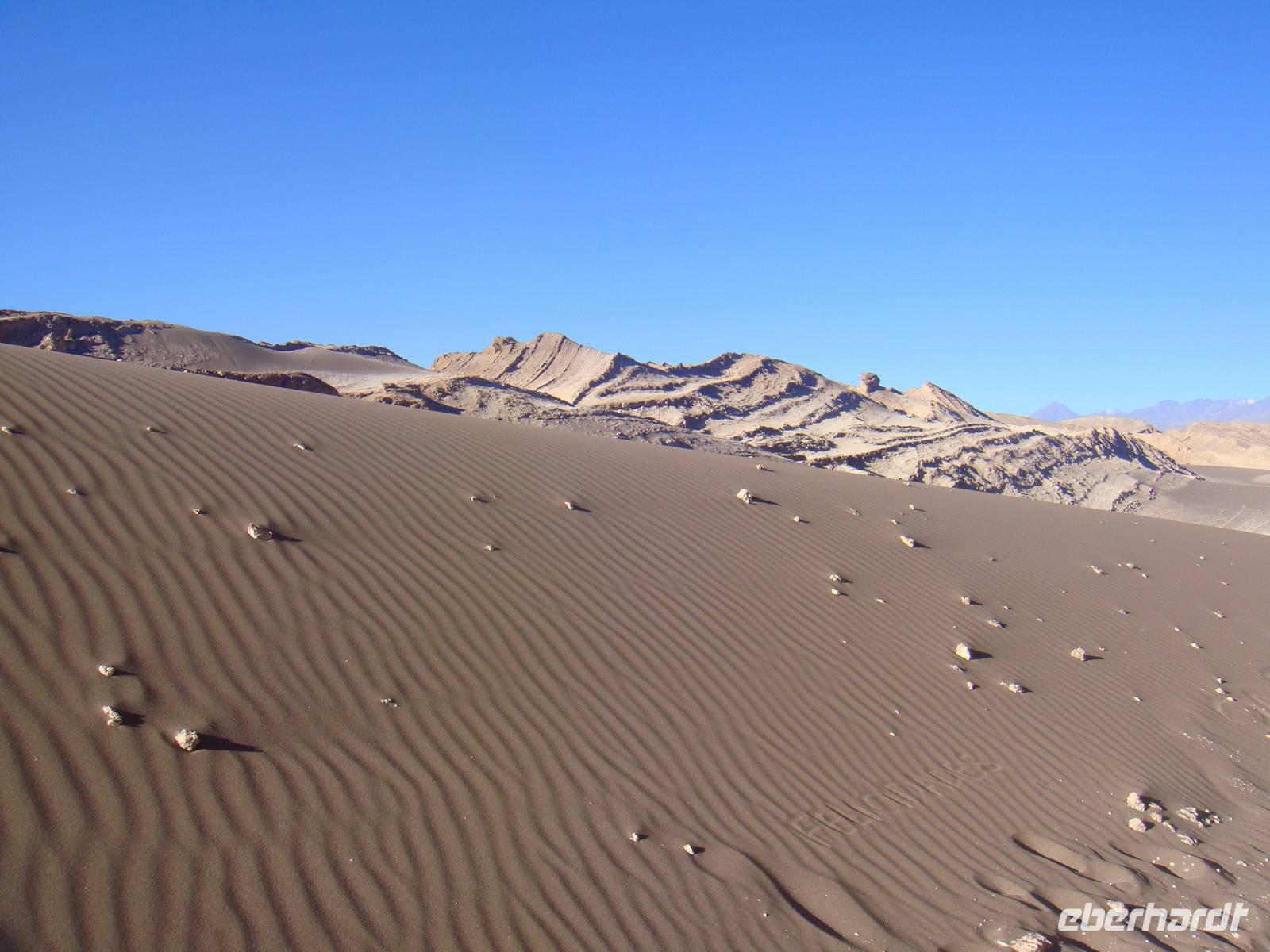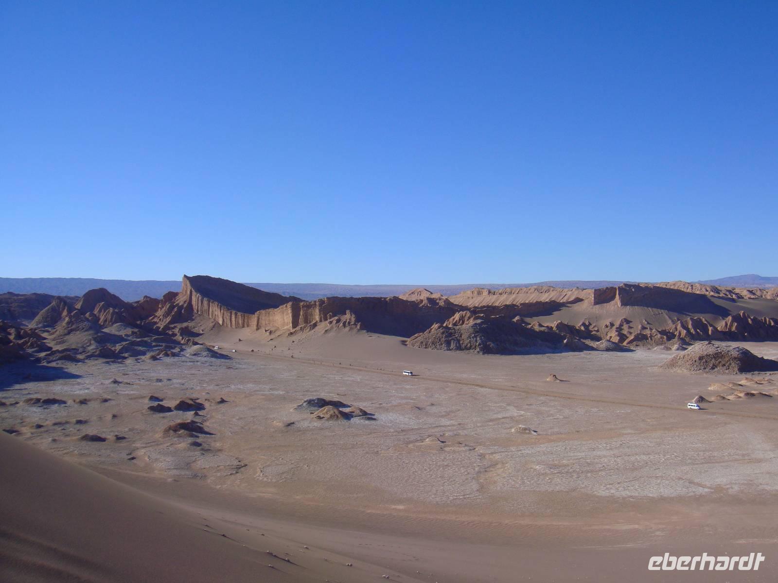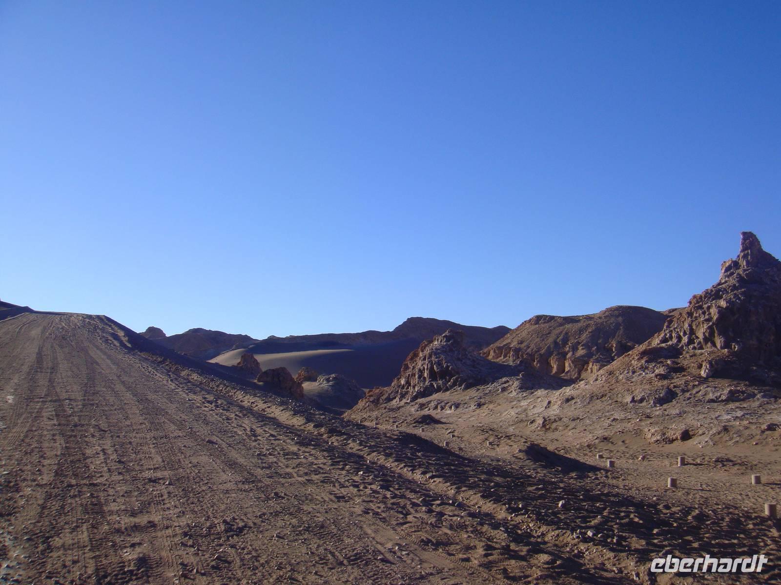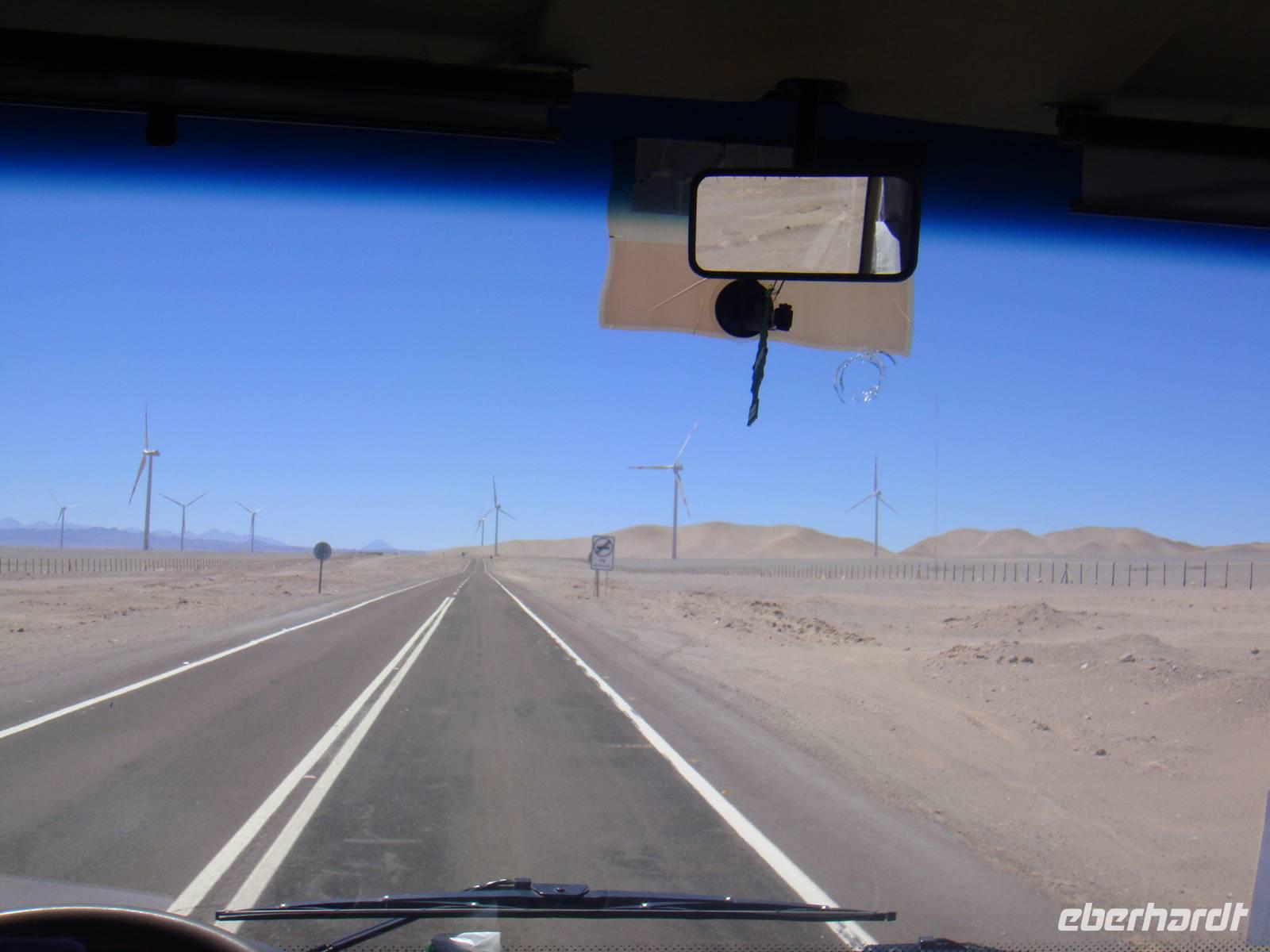 Mit einem Flieger der Lan Chile heben wir ab und nach 2 Stunden erreichen wir den Flughafen Calama. Kurzer Gepäckcheck und schon beladen wir den Anhänger unseres kleinen Busses für die nächsten Tage. Unser Fahrer bestückt den Bus mit einem riesigen Wasserbehälter, so haben wir immer Wasser auf Vorrat an Bord. Wir setzten unsere Fahrt fort und sind von der kargen Landschaft und deren Weite fasziniert.