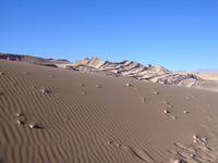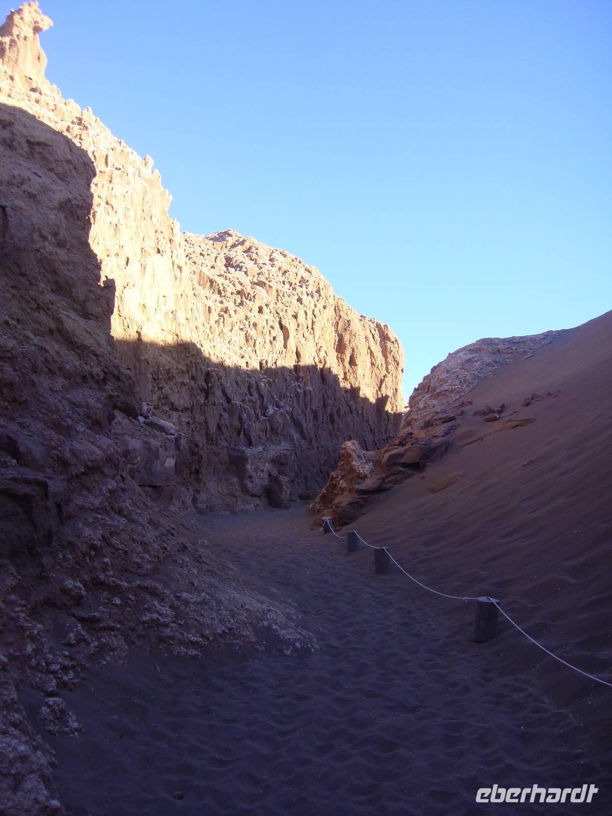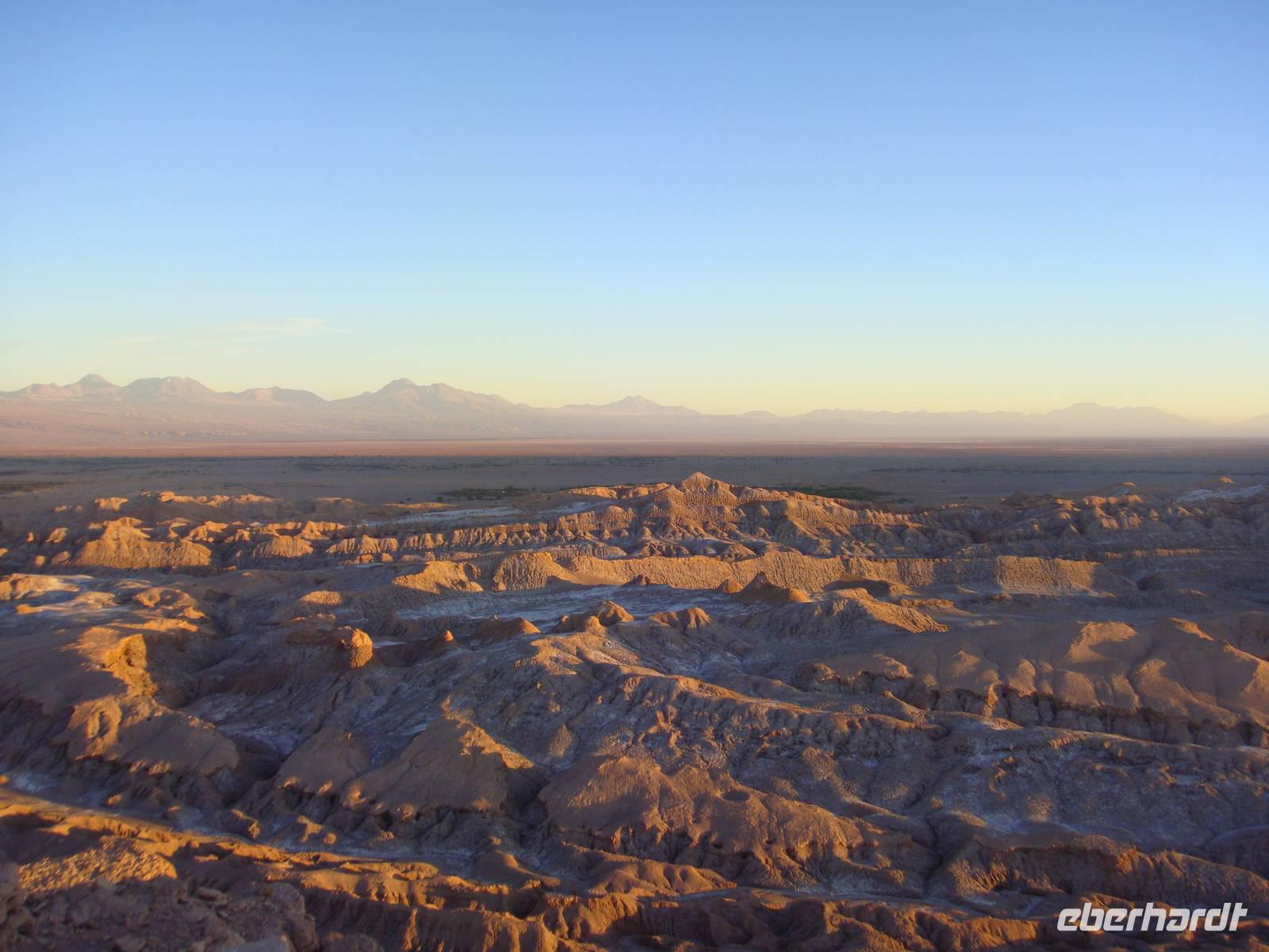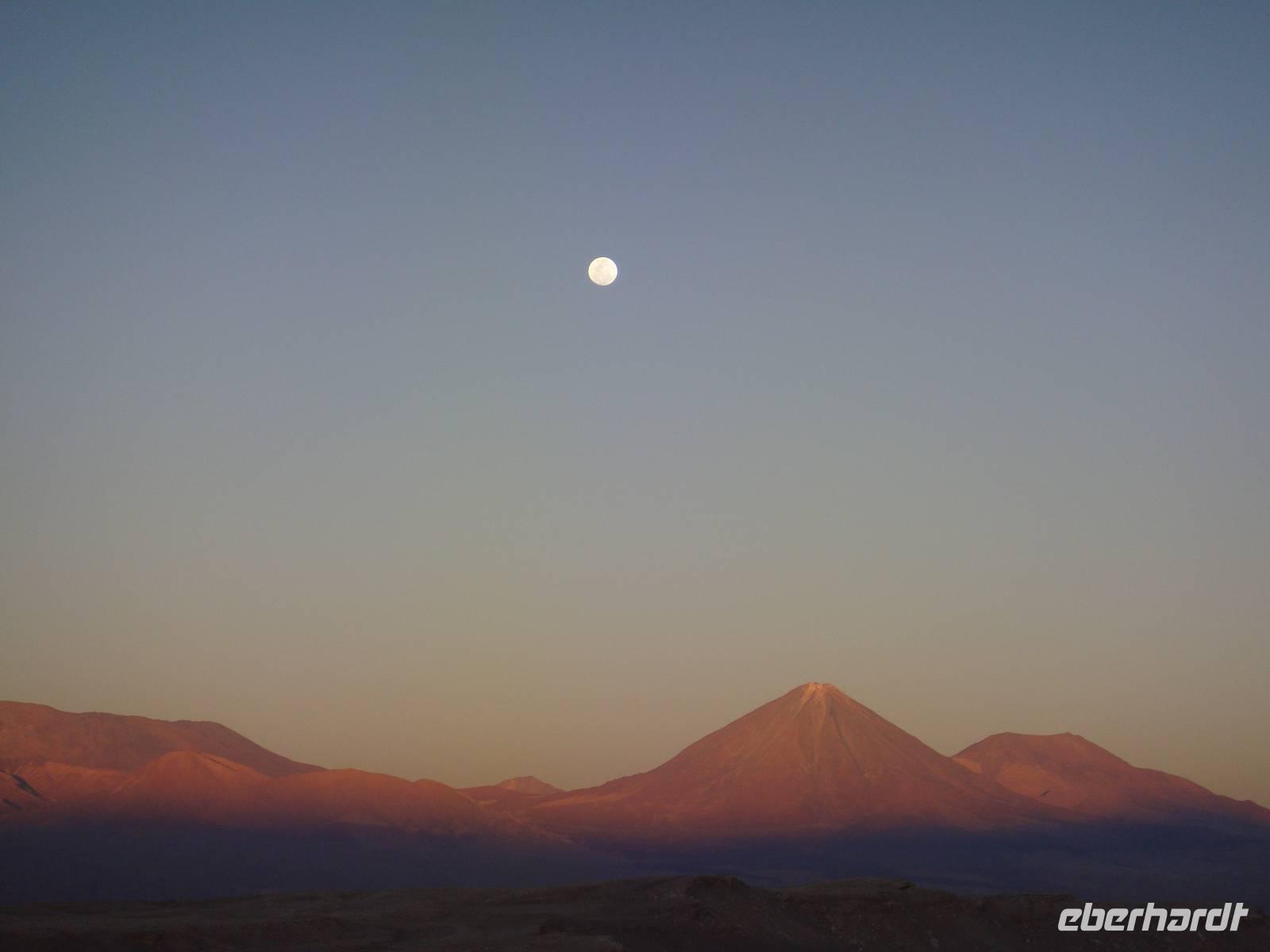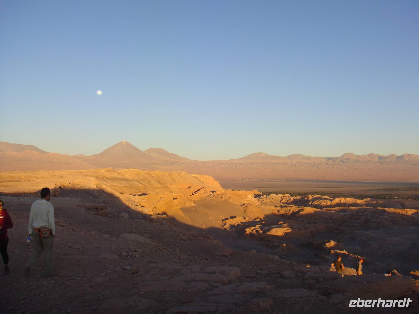Am Nachmittag treffen wir uns alle wieder um ins nahegelegene Mondtal aufzubrechen. Bhavito zeigt uns voller Begeisterung verschiedene sehenswerte Felsen, ging mit uns auf Sanddünen und unternahm einen Spaziergang durch eine Schlucht, bei der er uns in einem stillen Moment zeigt, dass es in der Wüste niemals ganz still ist. Schließlich erreichen wir rechtzeitig zum Sonnenuntergang auf die Aussichtsanhöhe über dem Mondtal . Als die Sonne untergeht bestaunen wir das fantastische Farbenspiel in der die gegenüberliegenden Berge der Anden eintauchen. Wir genießen diesen wunderbaren Moment und genehmigen uns dazu ein Gläschen Pisco Sour, naschen Oliven und kleine Belegte Brote, welche uns Bhavitos Kollegen liebevoll aufbereitet haben.